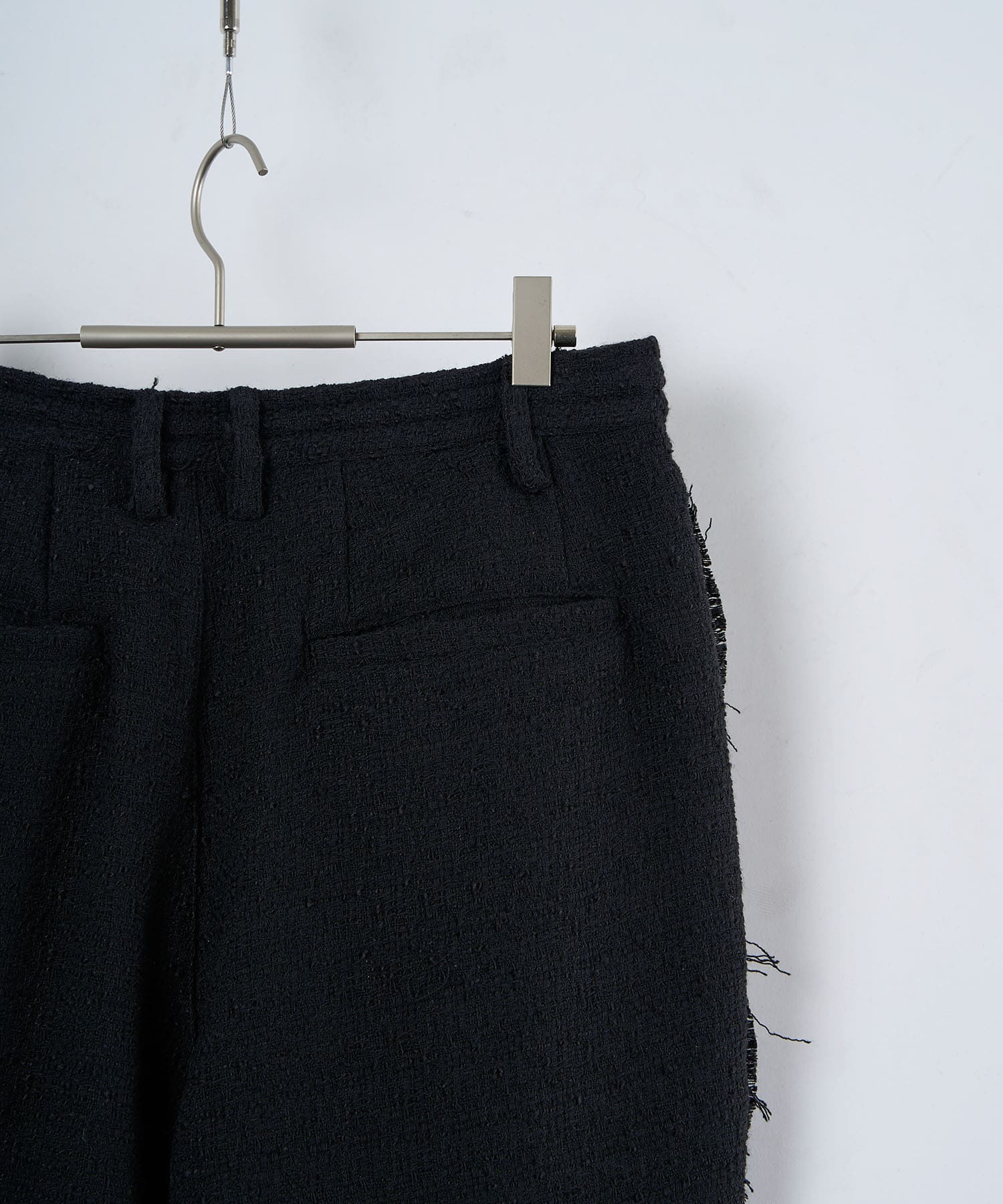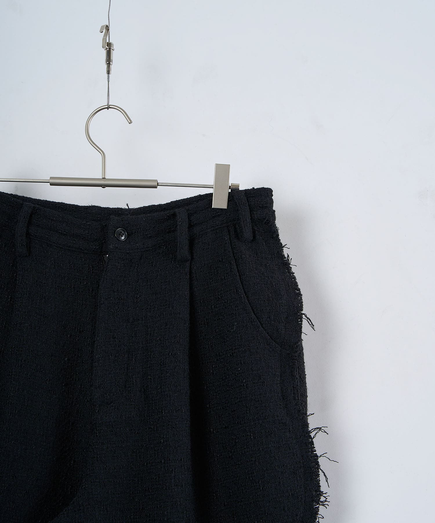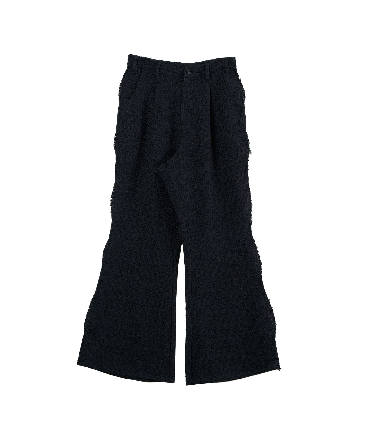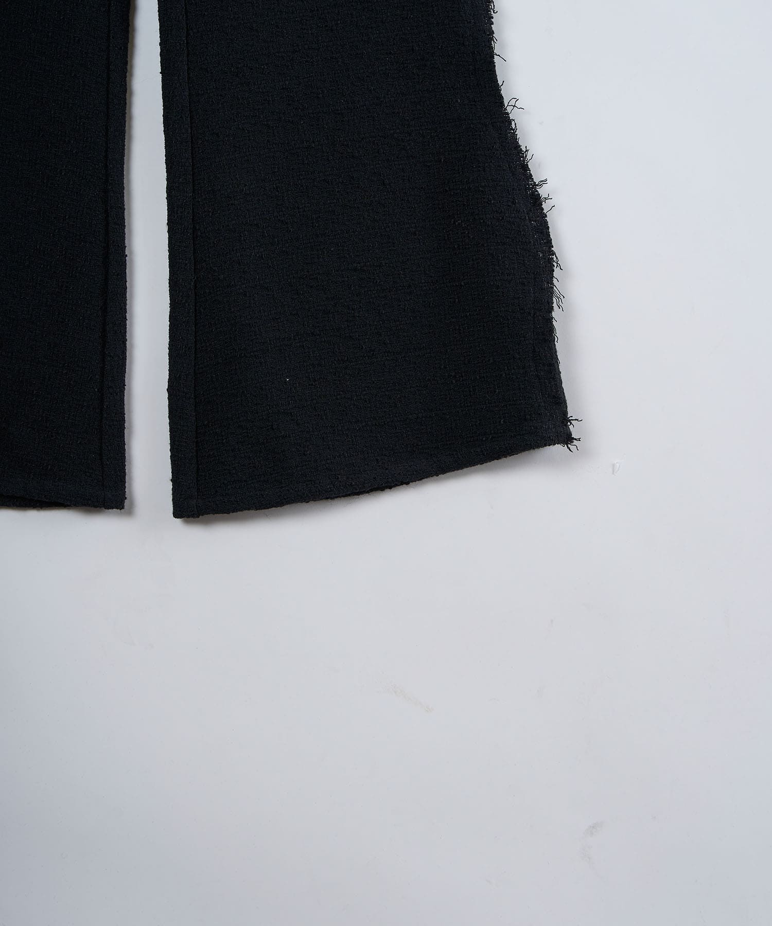 アクリル×ウール×ポリエステルのイタリアンツイードを使用したアイビーラインツイードパンツ。セミマットな質感で上品な生地をあえてカットオフにすることで、ドレッシーになり過ぎず着回しの効くアイテムに仕上げております。