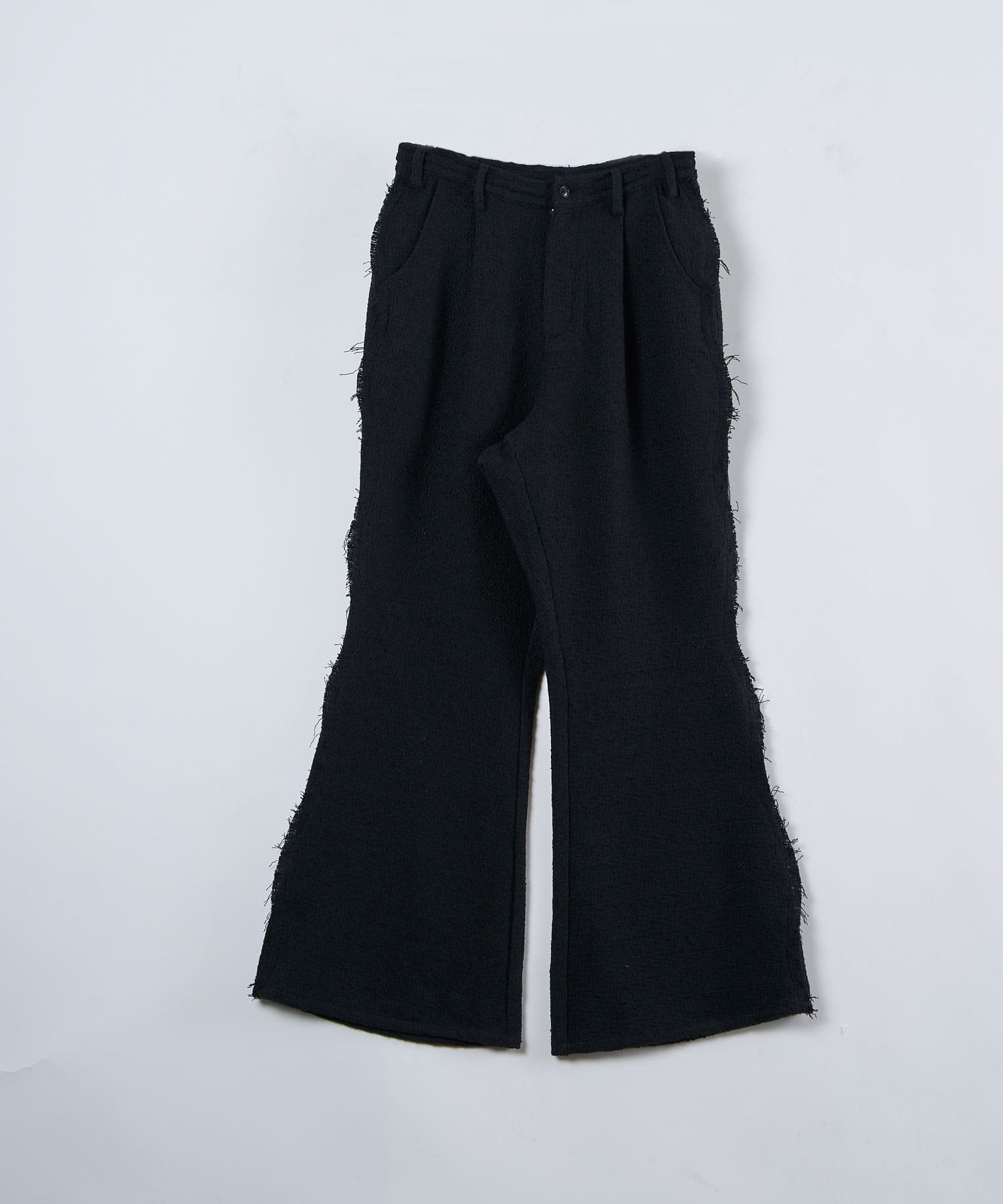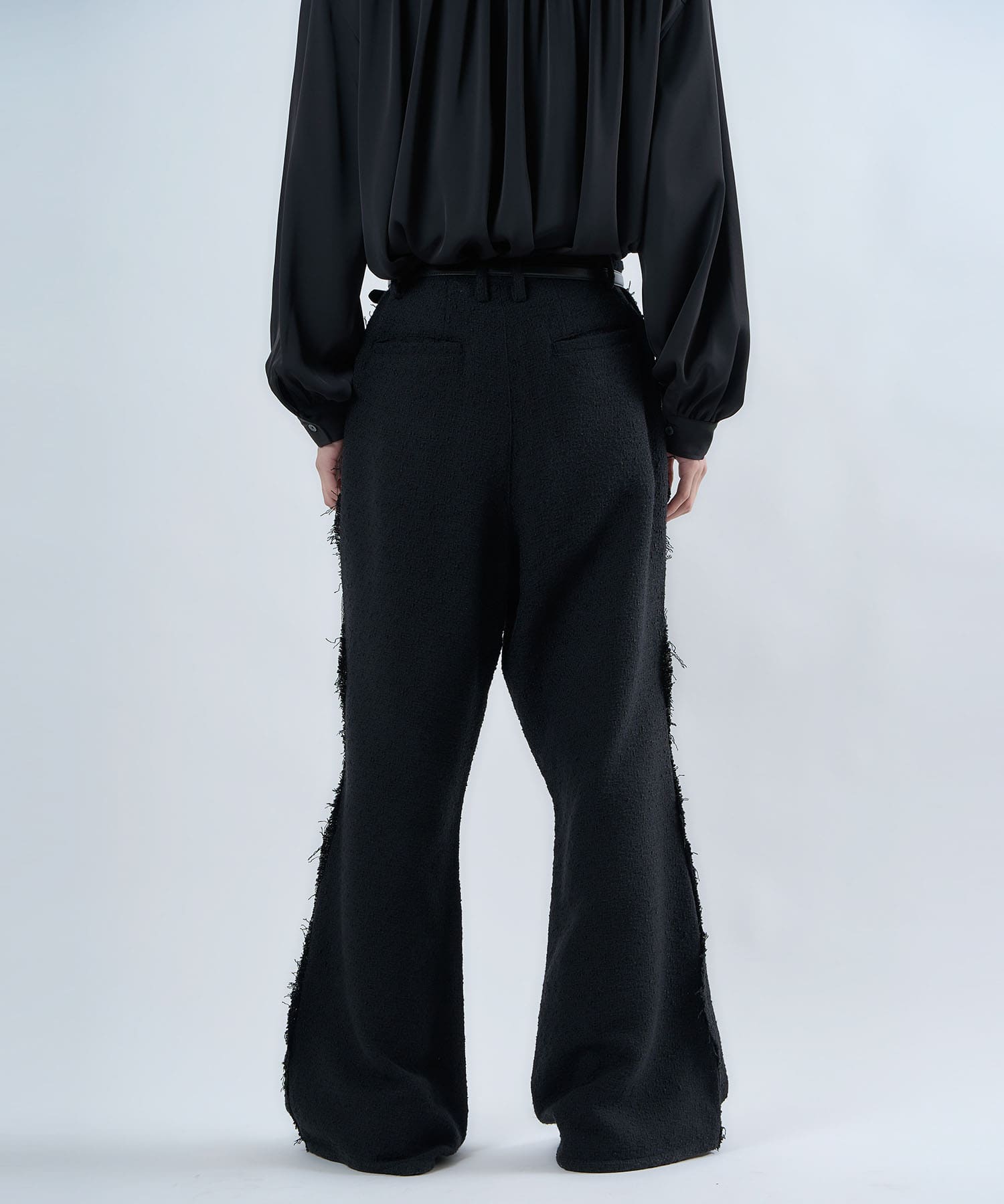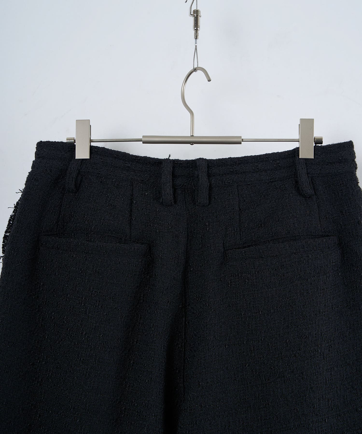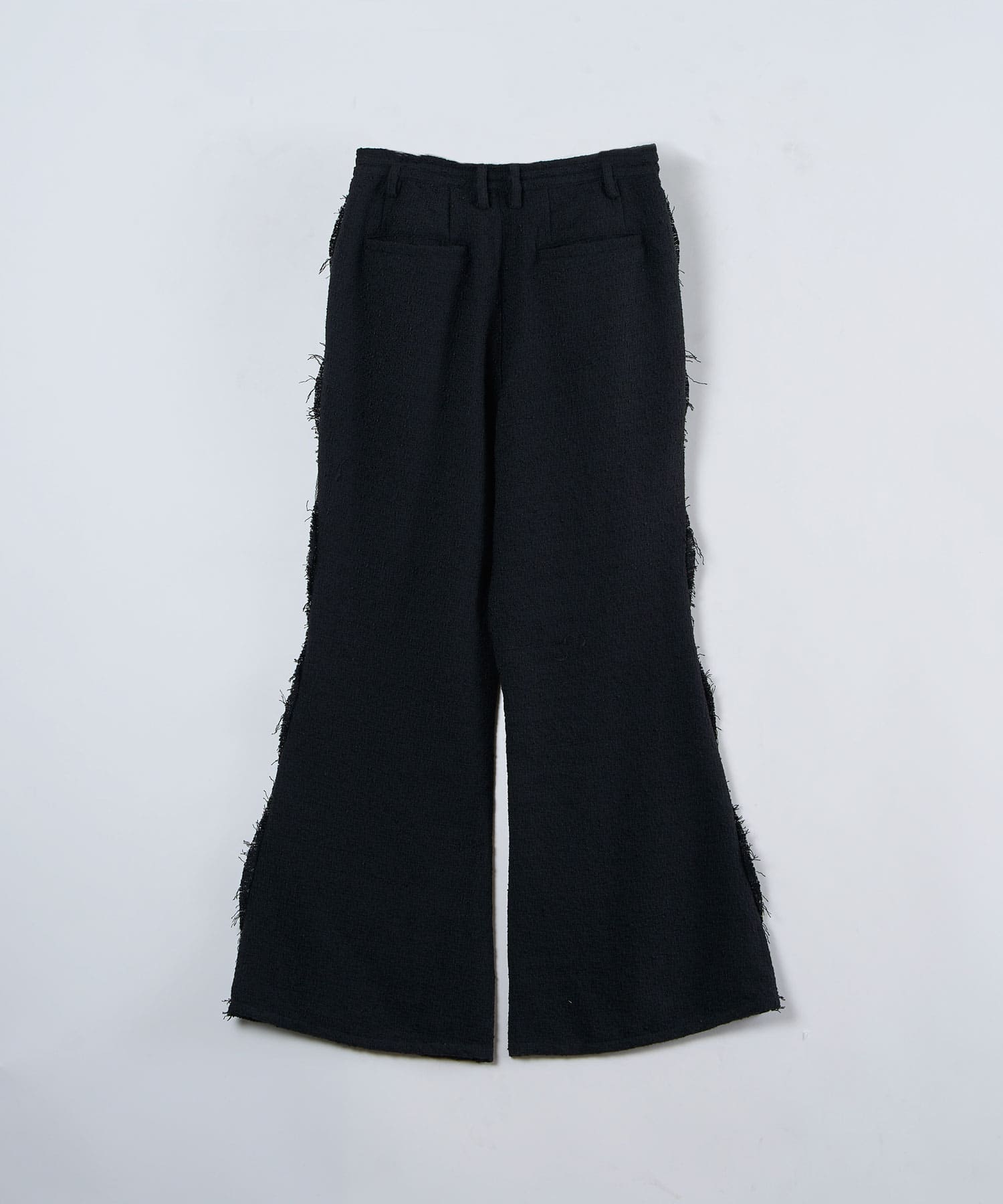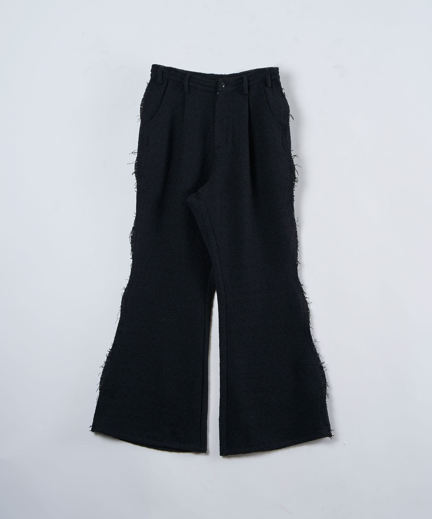 アクリル×ウール×ポリエステルのイタリアンツイードを使用したアイビーラインツイードパンツ。セミマットな質感で上品な生地をあえてカットオフにすることで、ドレッシーになり過ぎず着回しの効くアイテムに仕上げております。