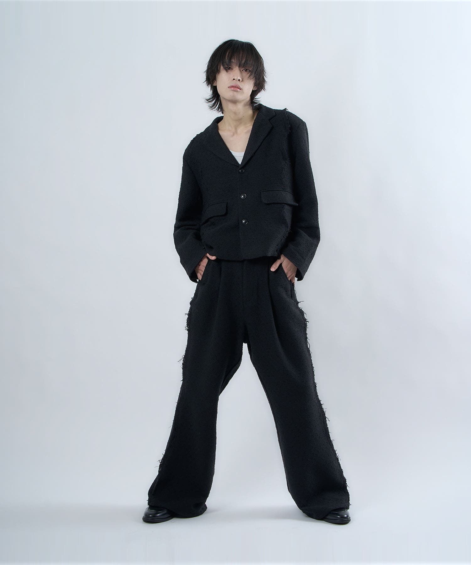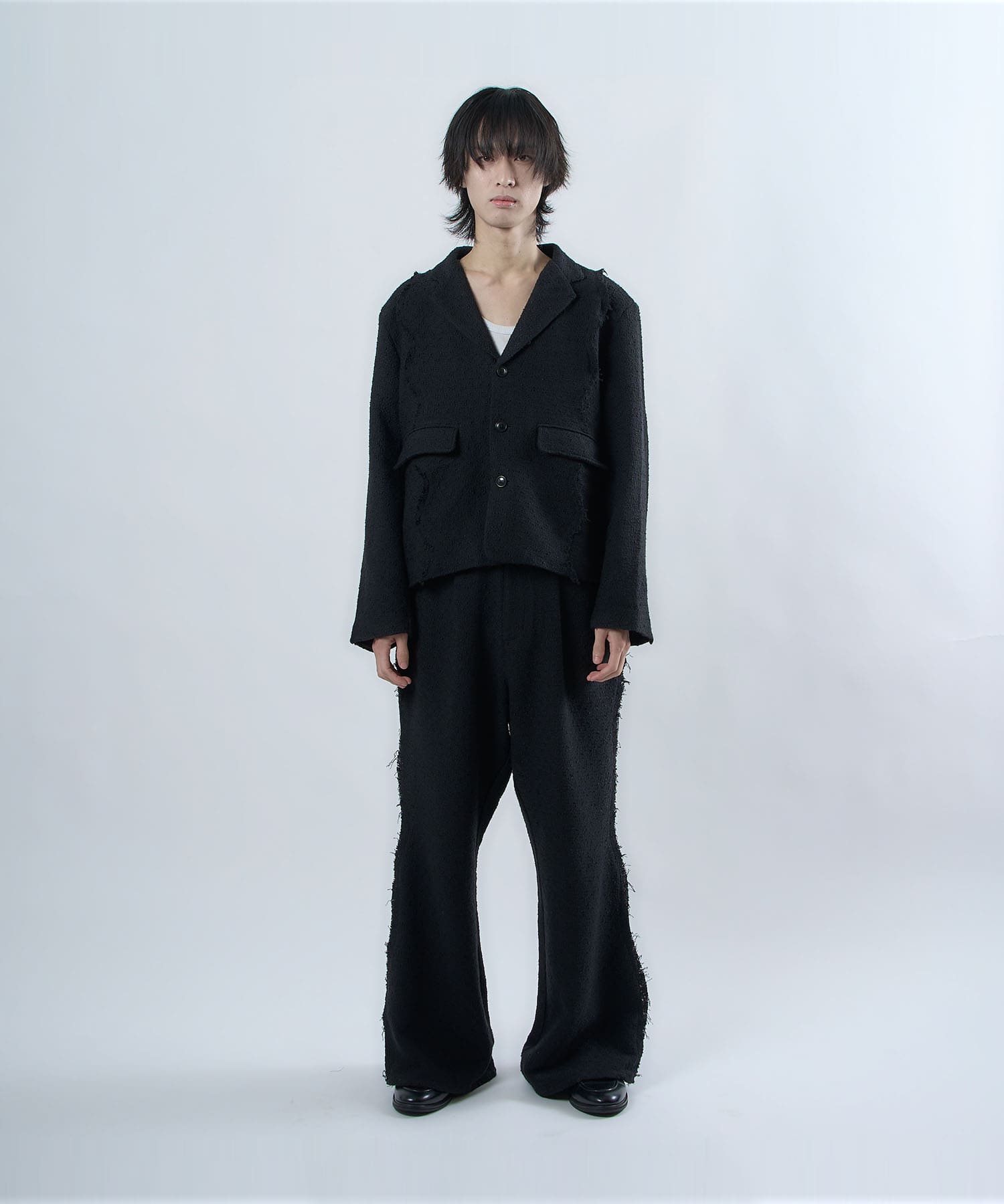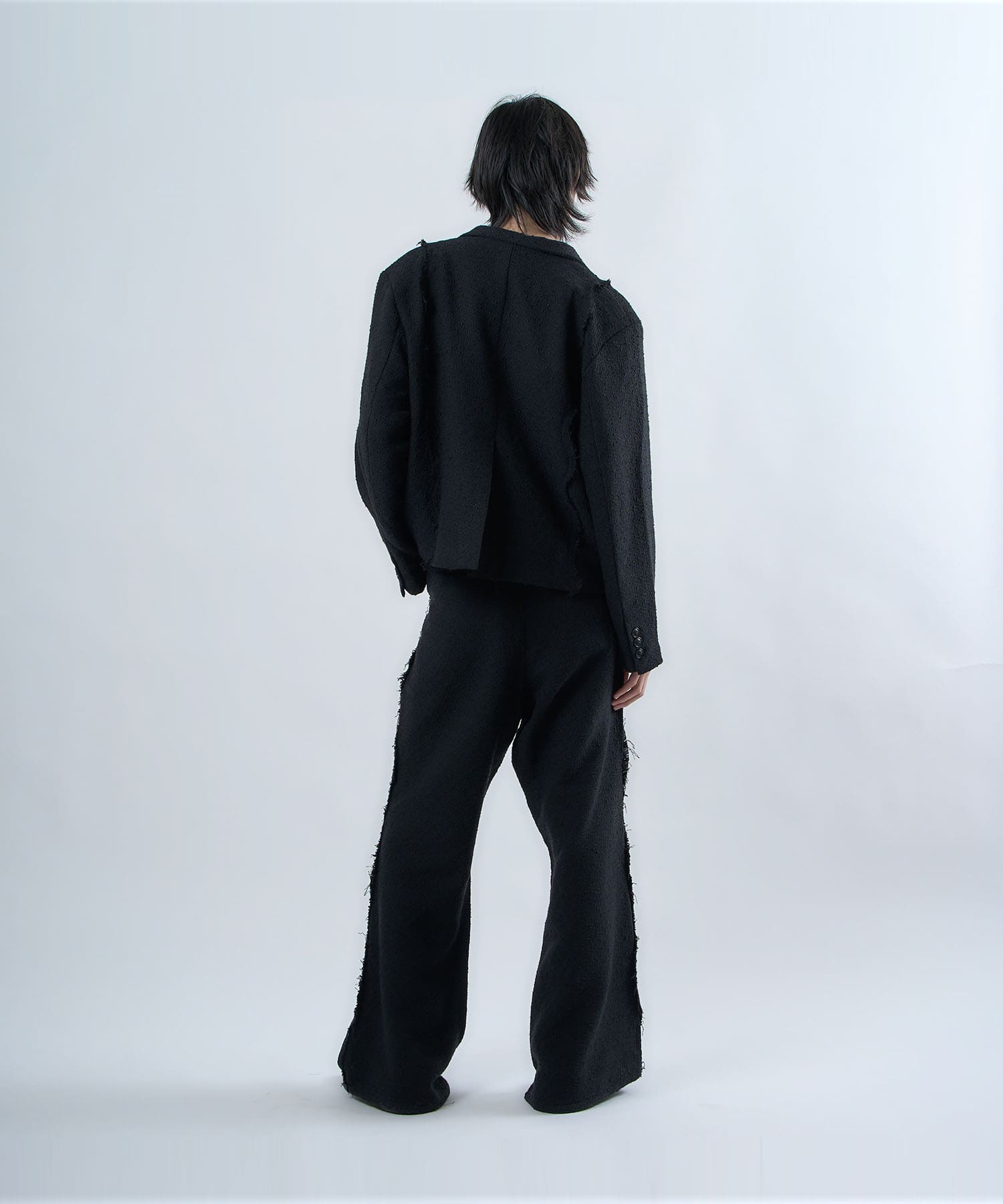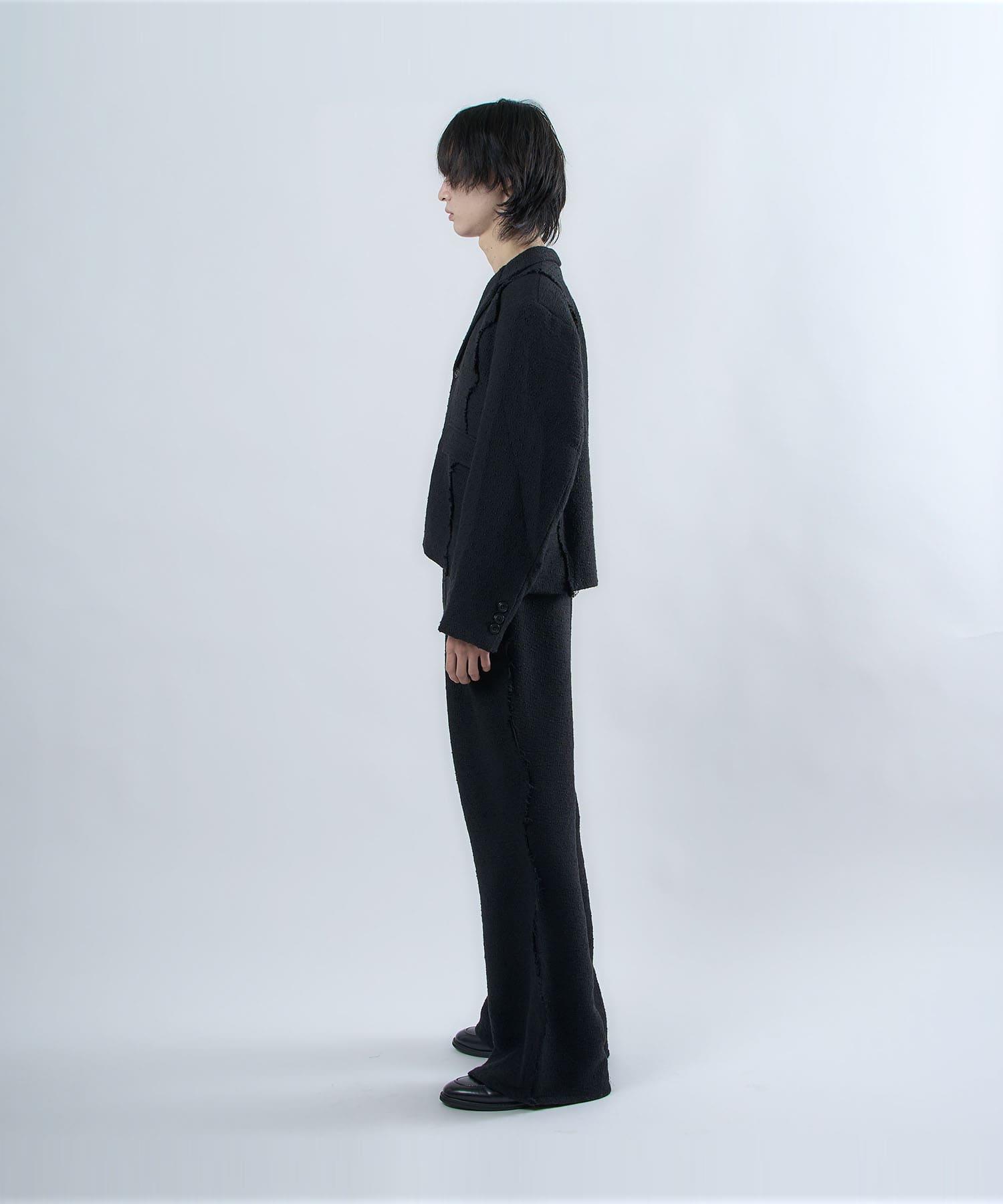 アクリル×ウール×ポリエステルのイタリアンツイードを使用したアイビーラインツイードパンツ。セミマットな質感で上品な生地をあえてカットオフにすることで、ドレッシーになり過ぎず着回しの効くアイテムに仕上げております。