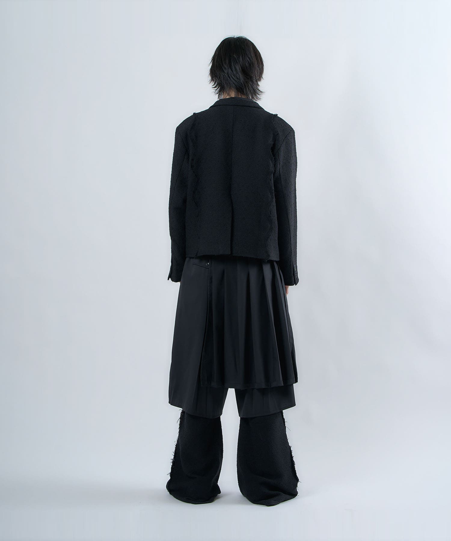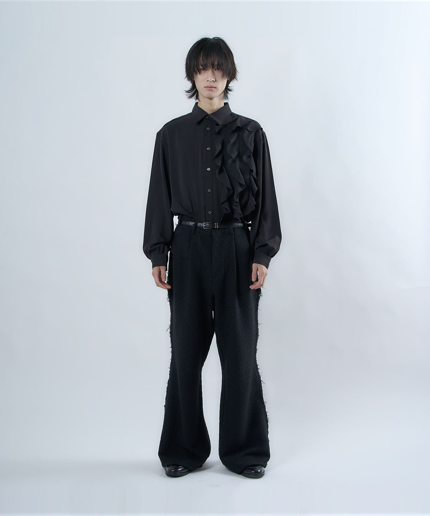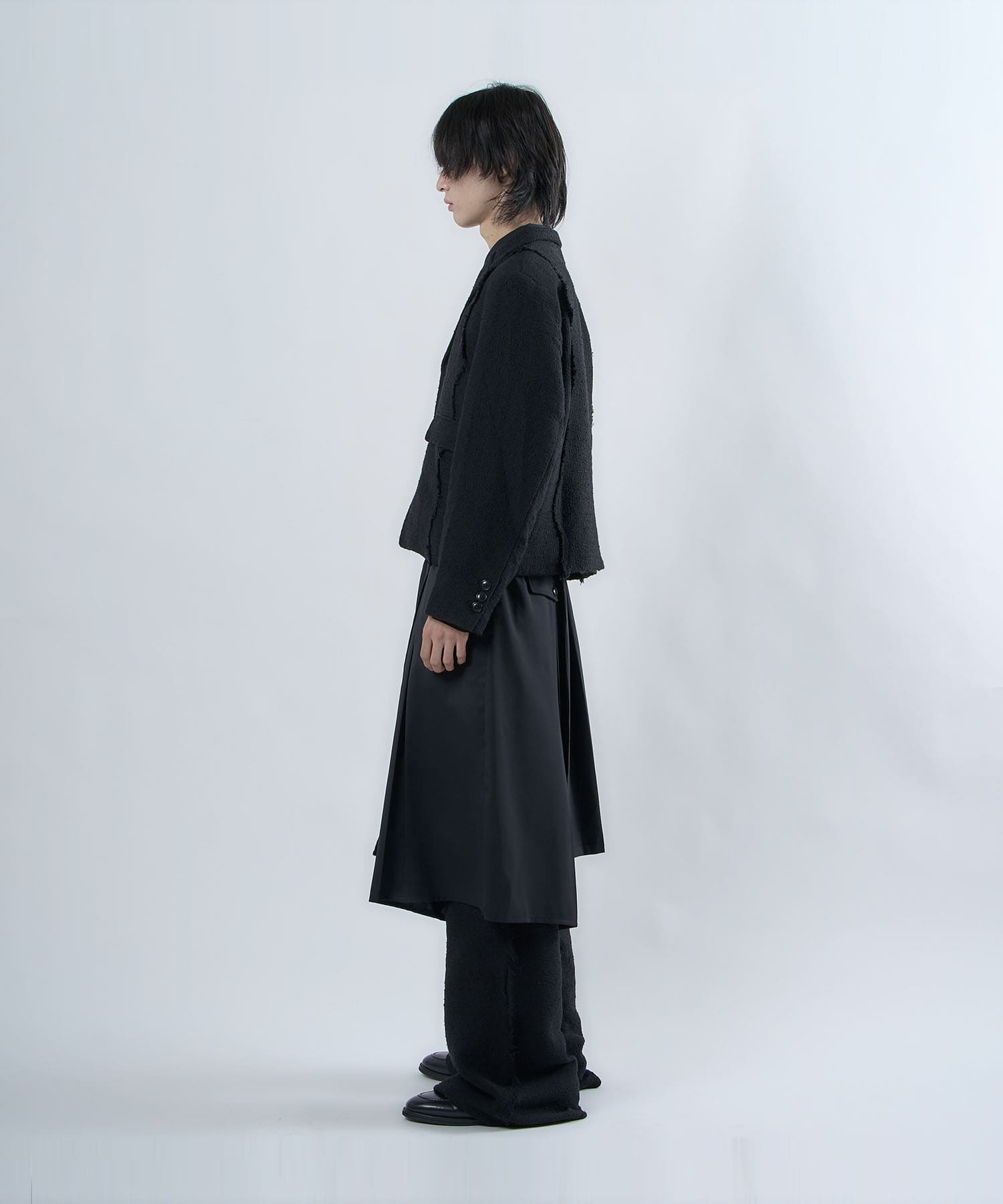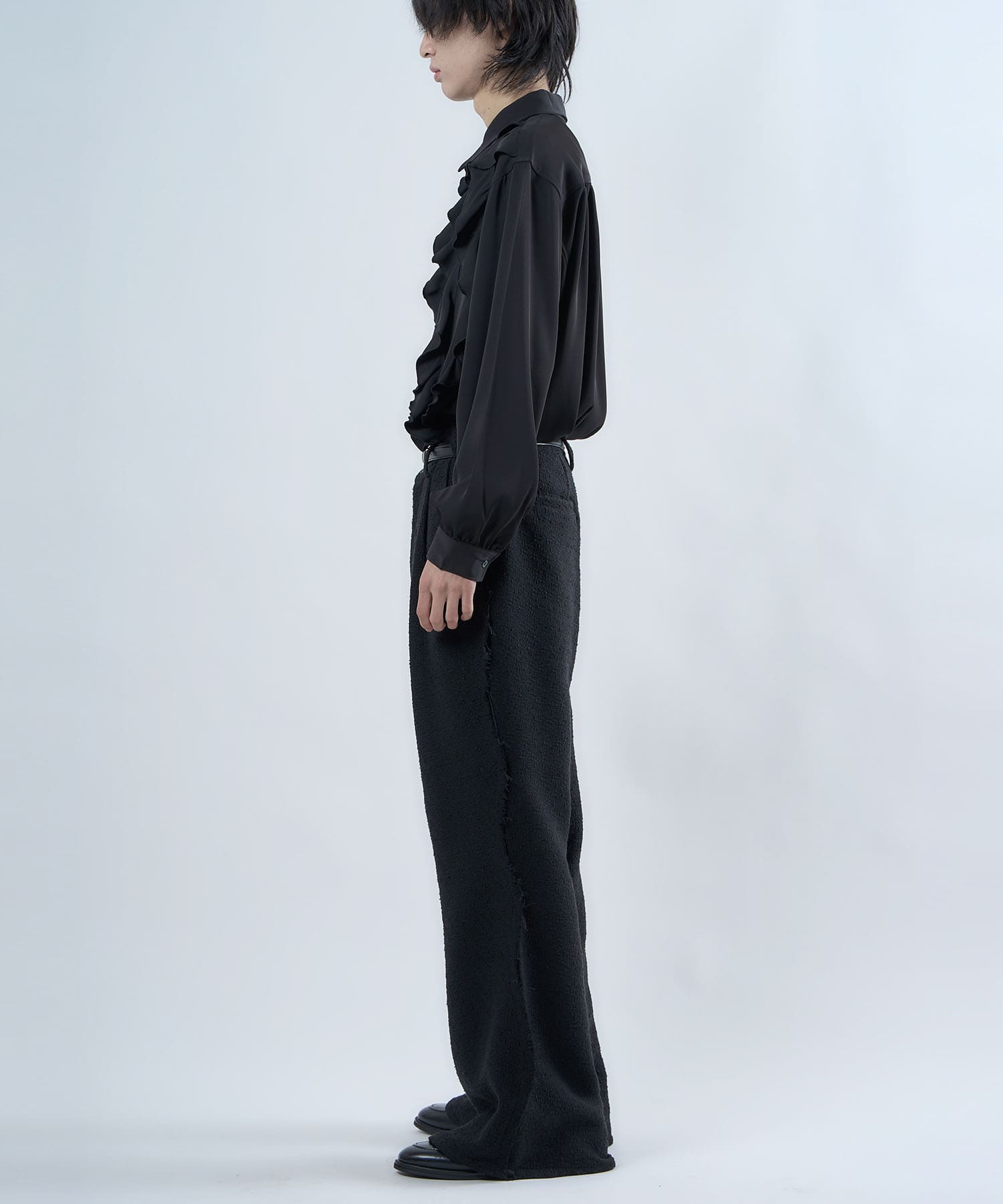 The semi-matt texture and elegant fabric is cut off to create an item that is easy to wear without becoming too dressy.The item's name, “Ivy Line,” is inspired by vine plants, and the image of plants trailing through is expressed in the transition line.The semi-flared silhouette is finished so that the silhouette does not collapse even when the fabric is piled up around the legs.