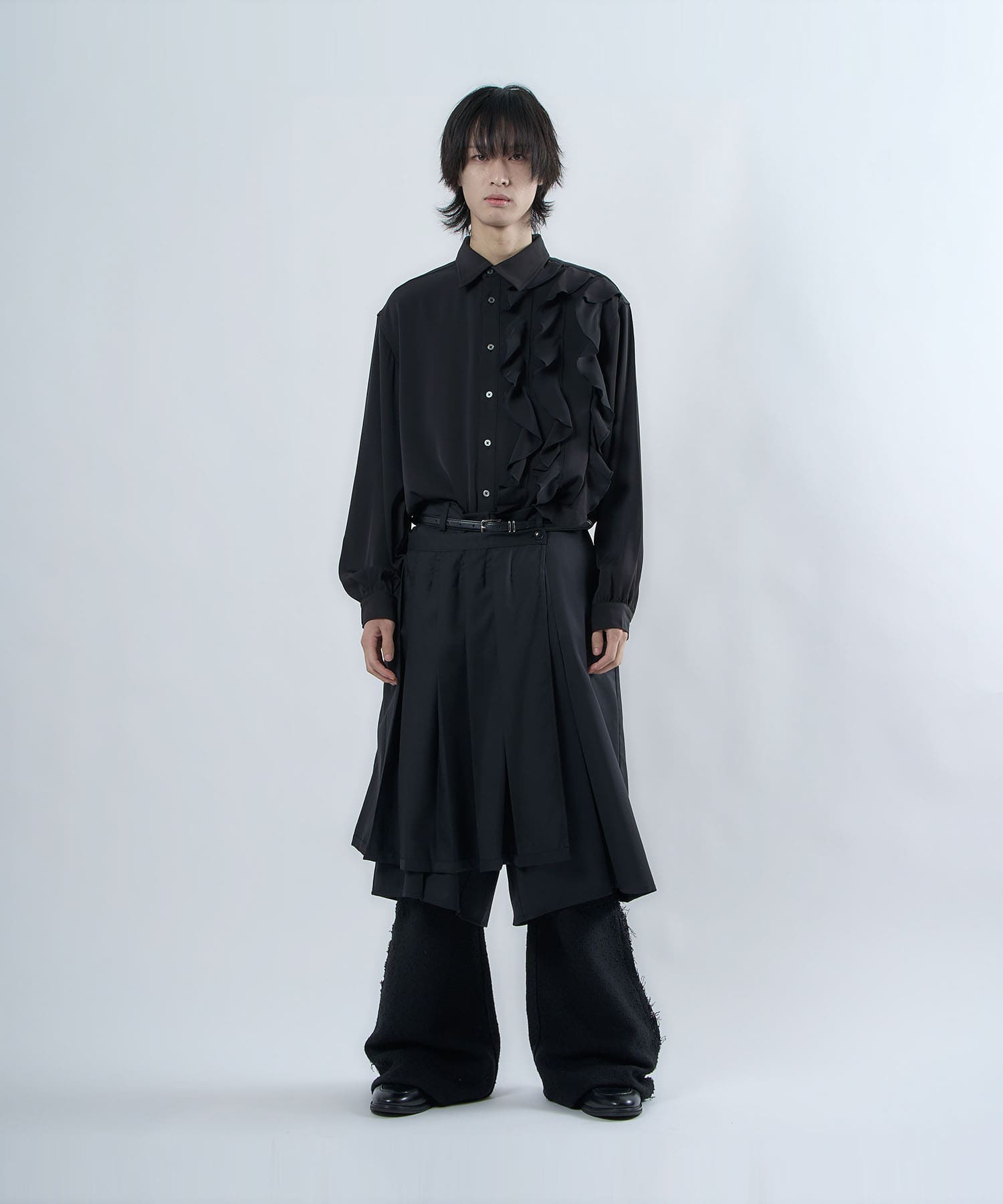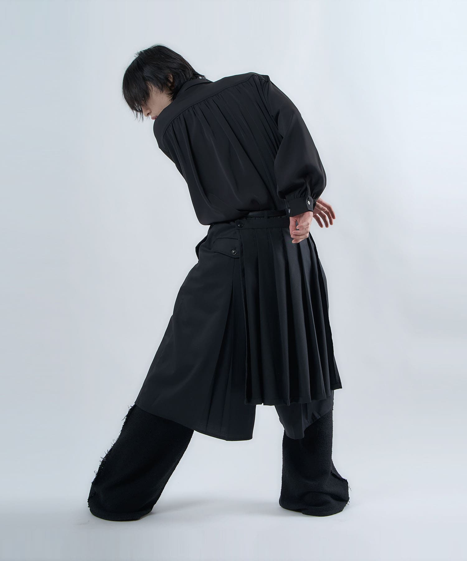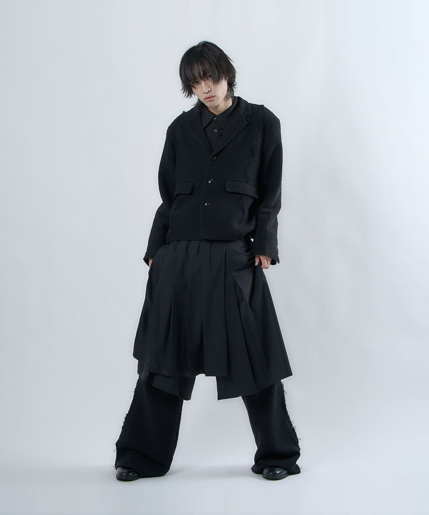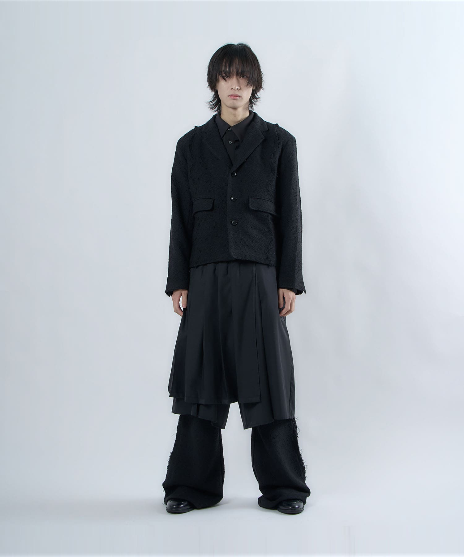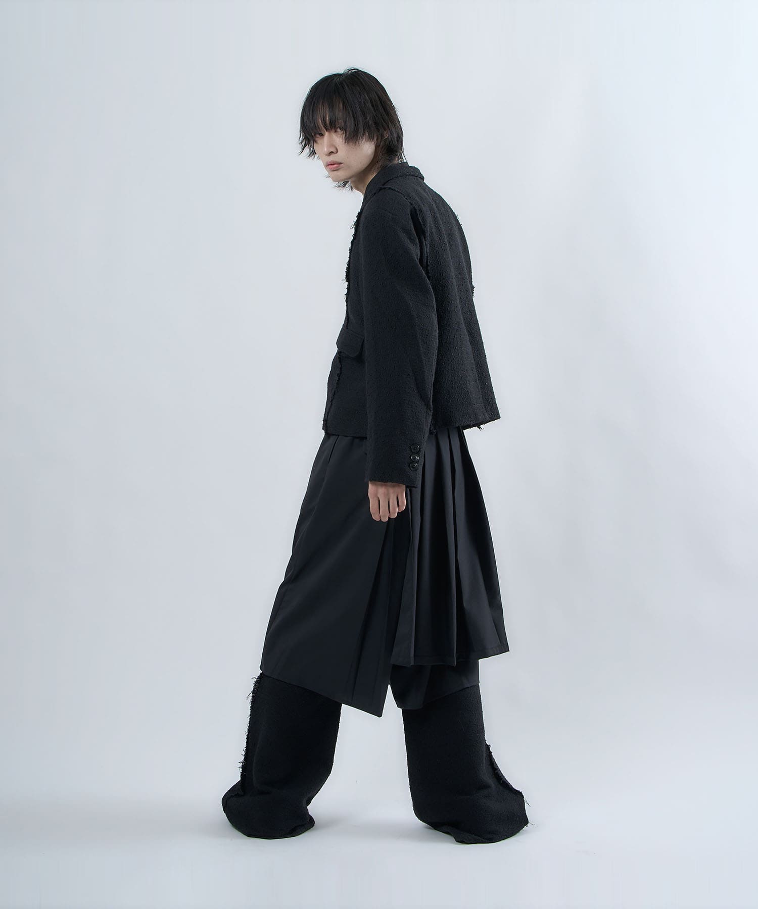 The semi-matt texture and elegant fabric is cut off to create an item that is easy to wear without becoming too dressy.The item's name, “Ivy Line,” is inspired by vine plants, and the image of plants trailing through is expressed in the transition line.The semi-flared silhouette is finished so that the silhouette does not collapse even when the fabric is piled up around the legs.