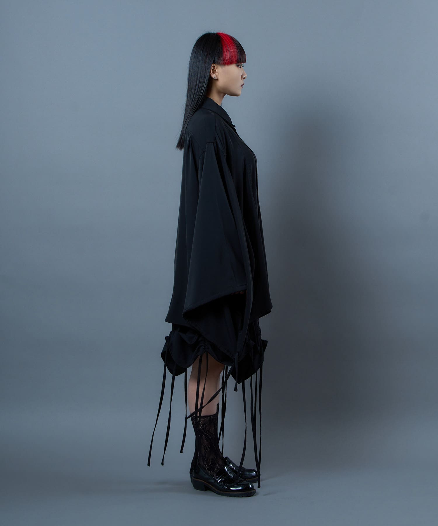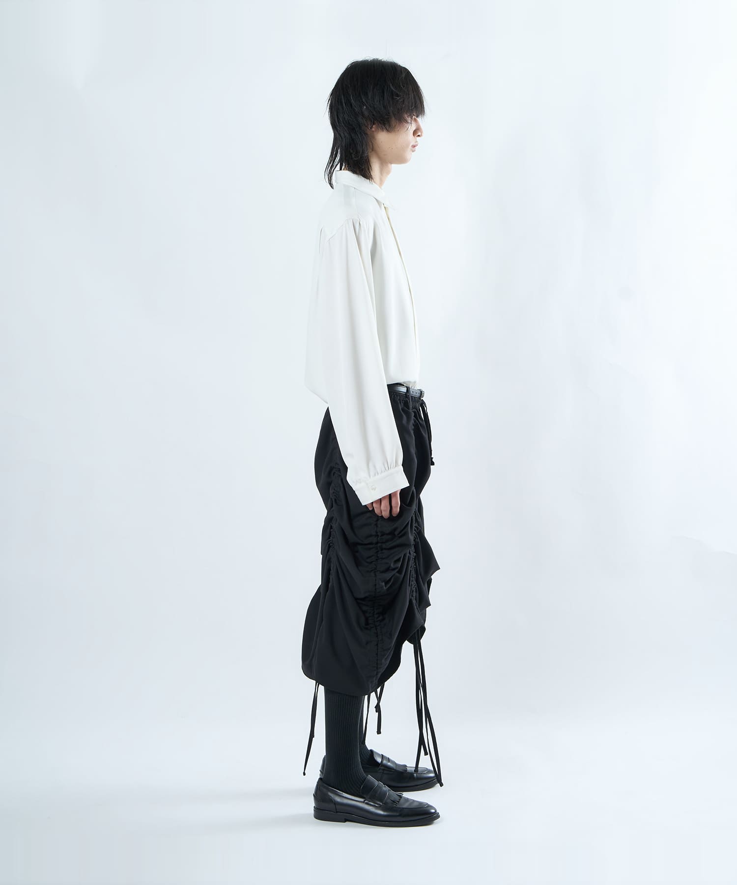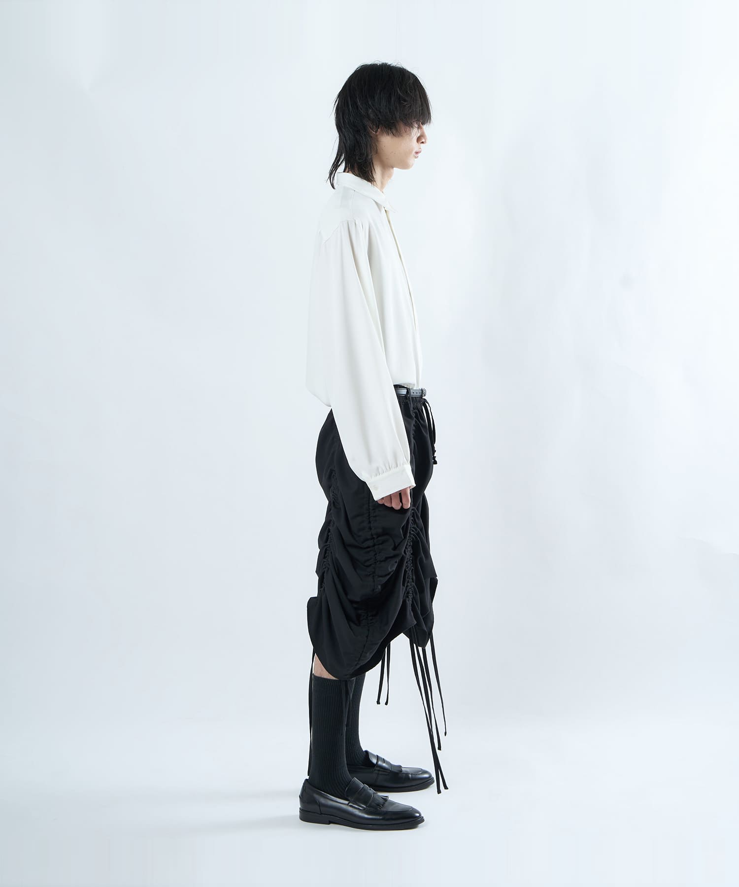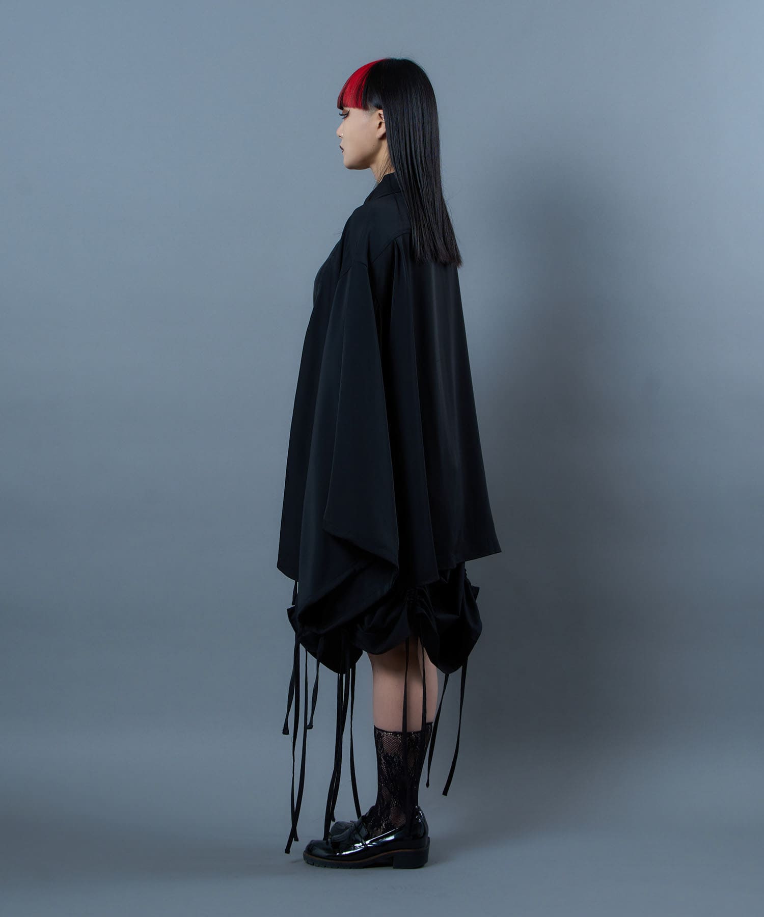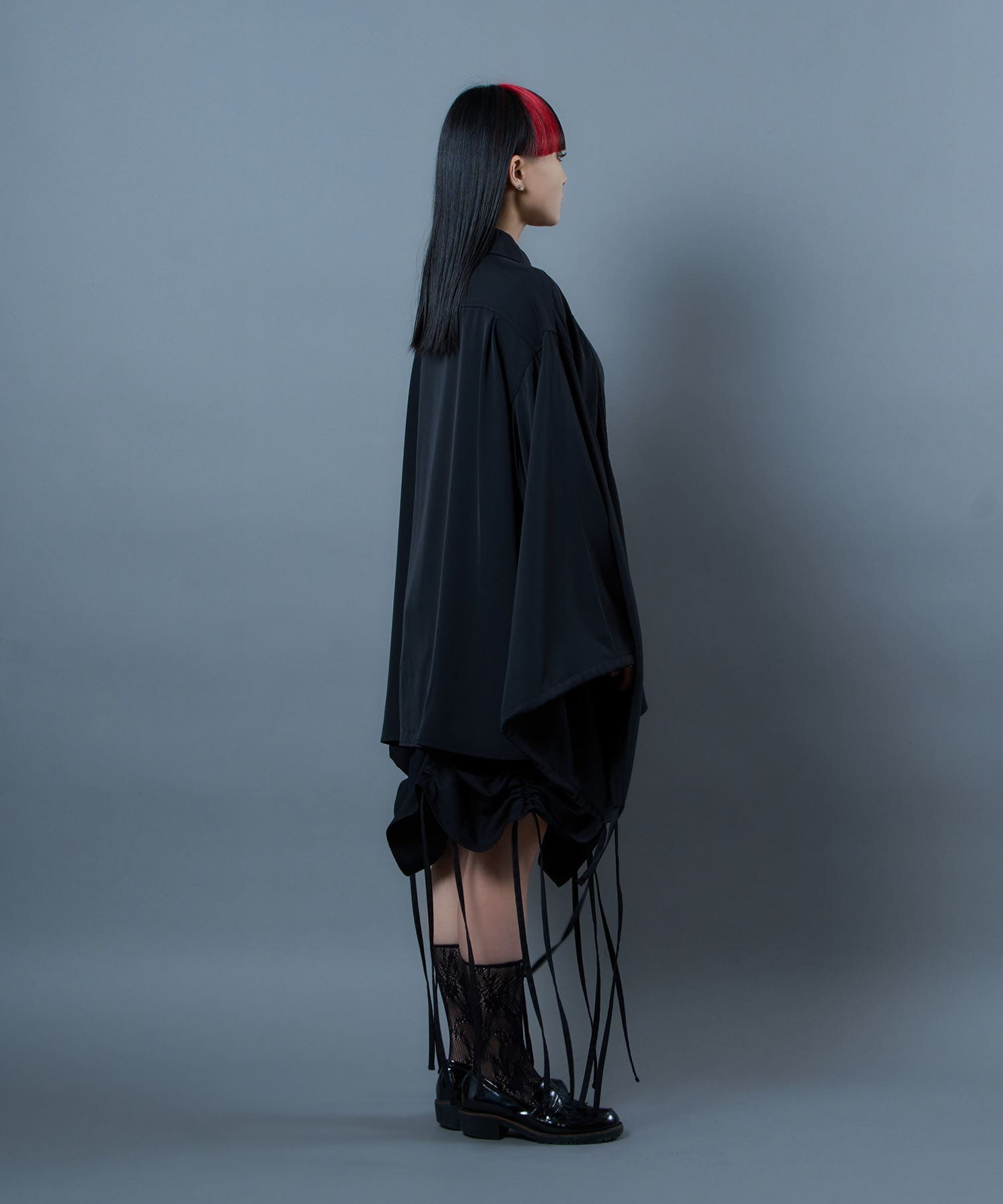 紐を結んだ時のドレープが生地との相性が良くモードな印象に。単体でも使用でき、パンツとのレイヤードもおススメです。