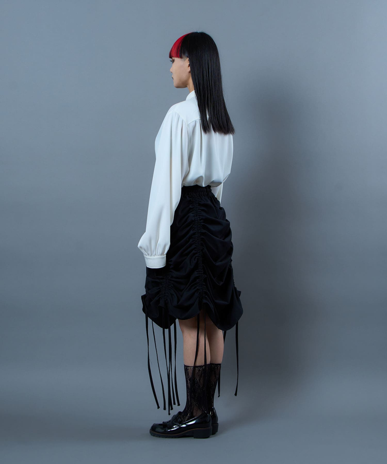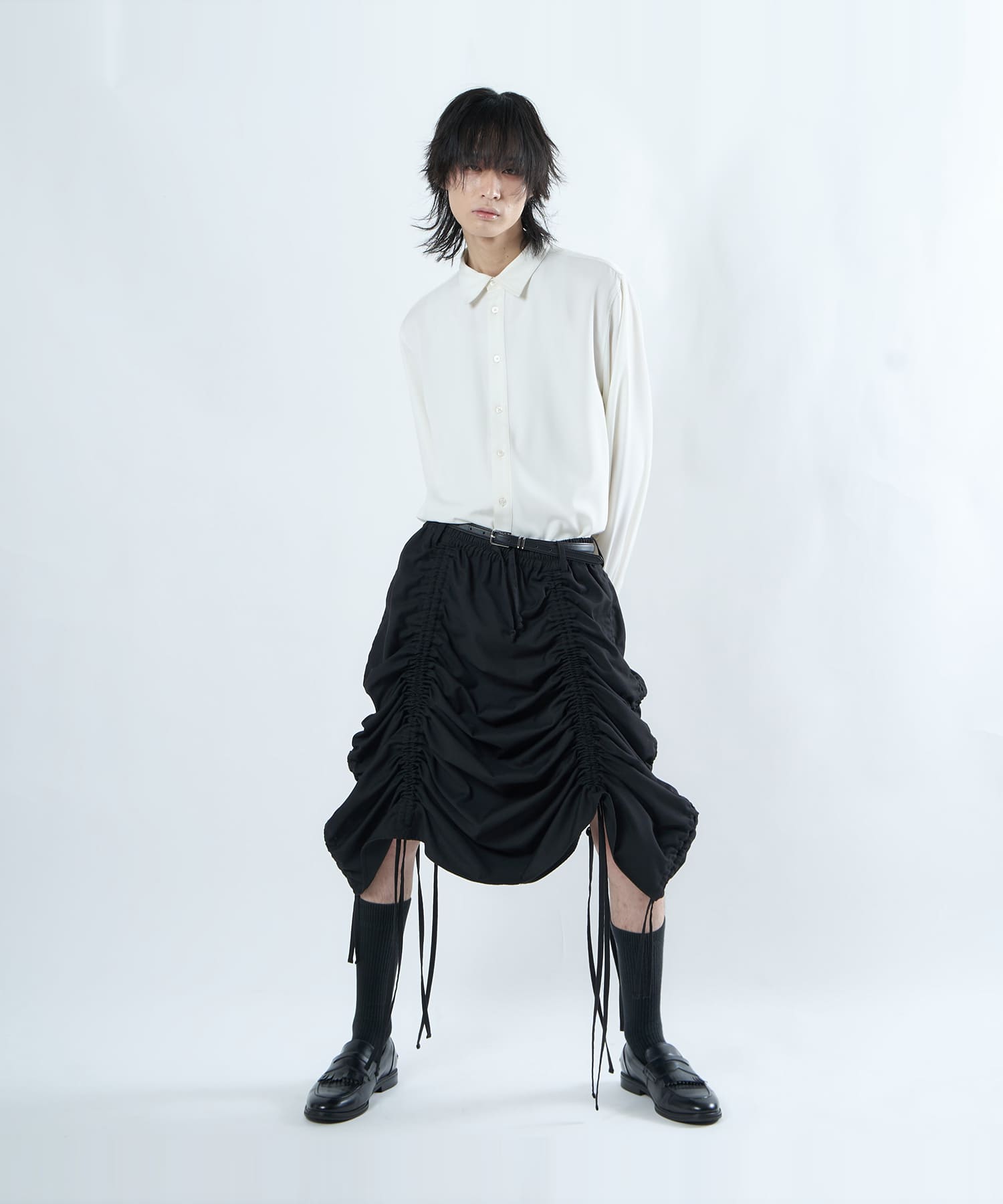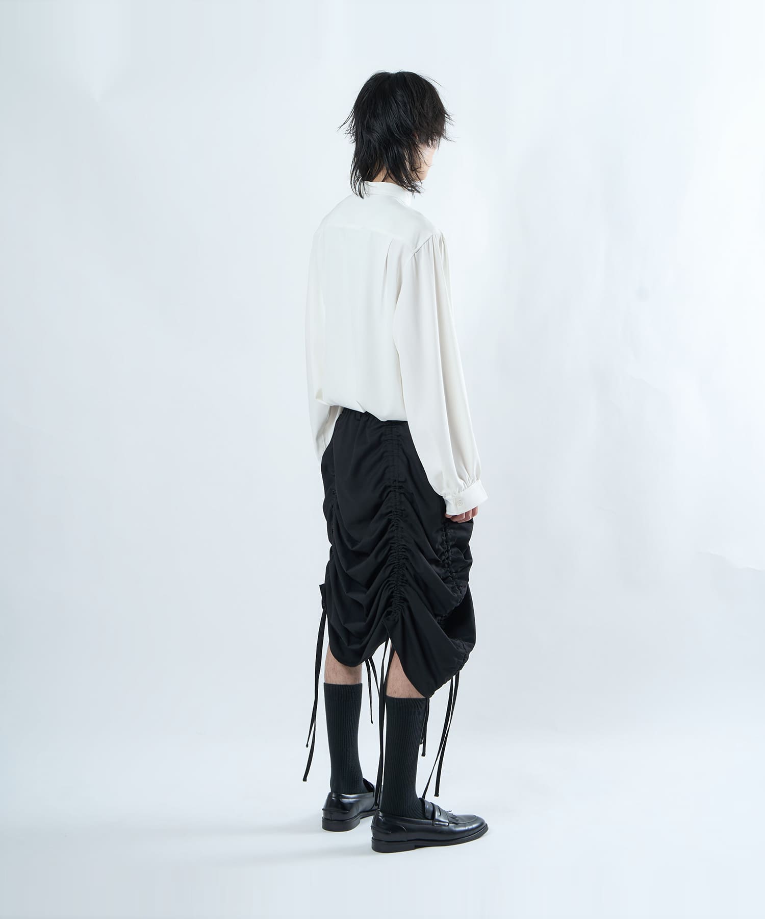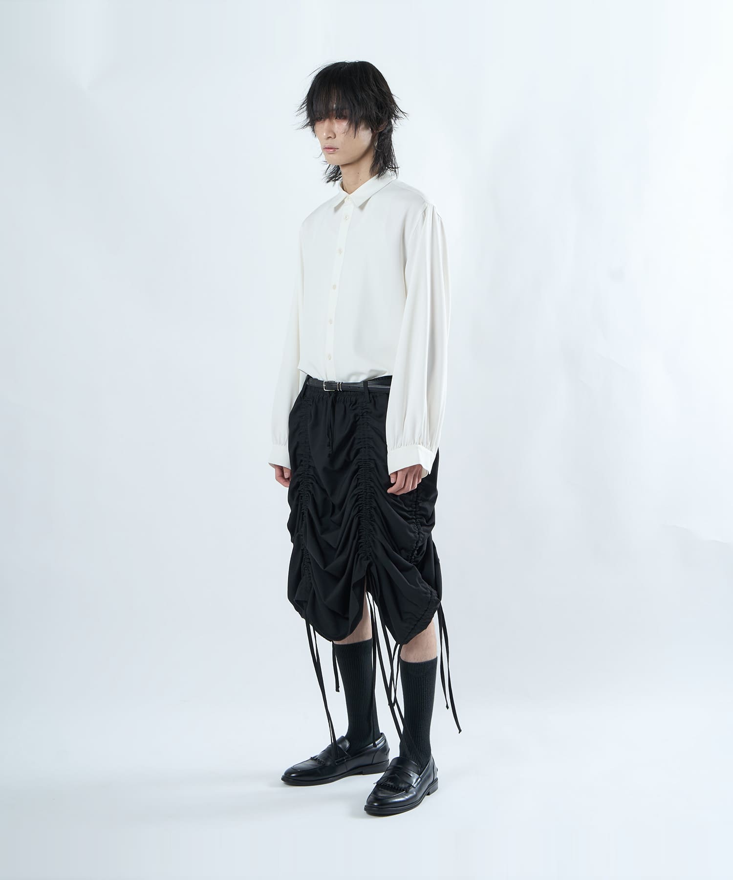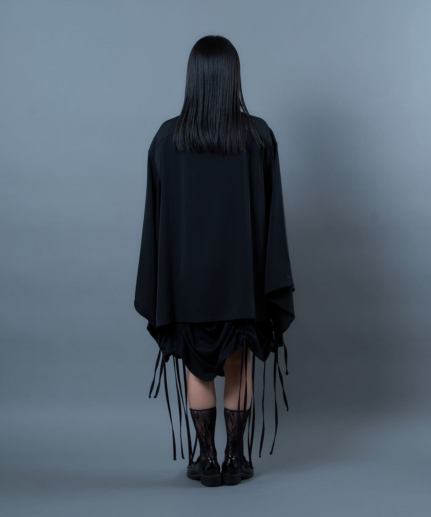 紐を結んだ時のドレープが生地との相性が良くモードな印象に。単体でも使用でき、パンツとのレイヤードもおススメです。