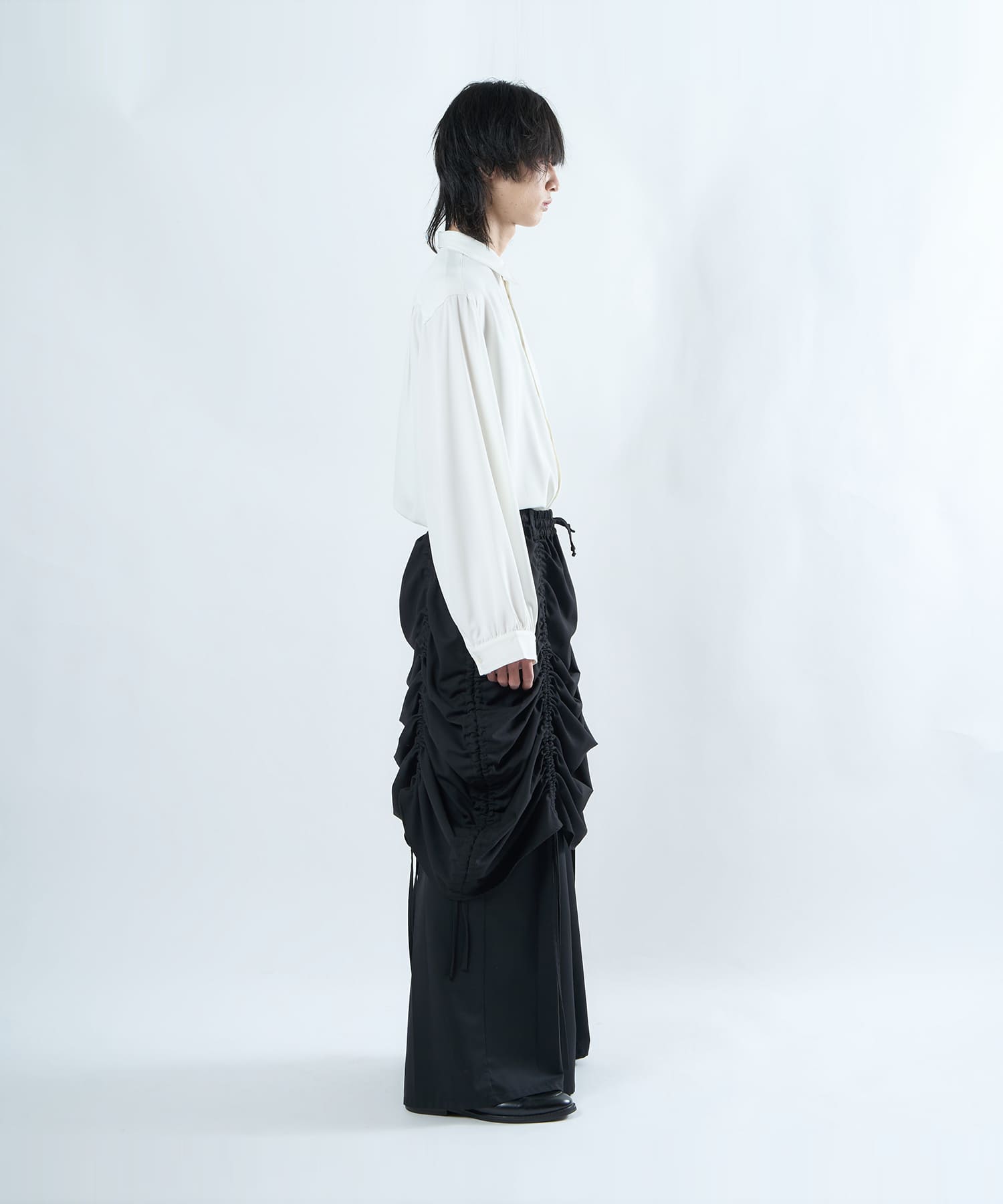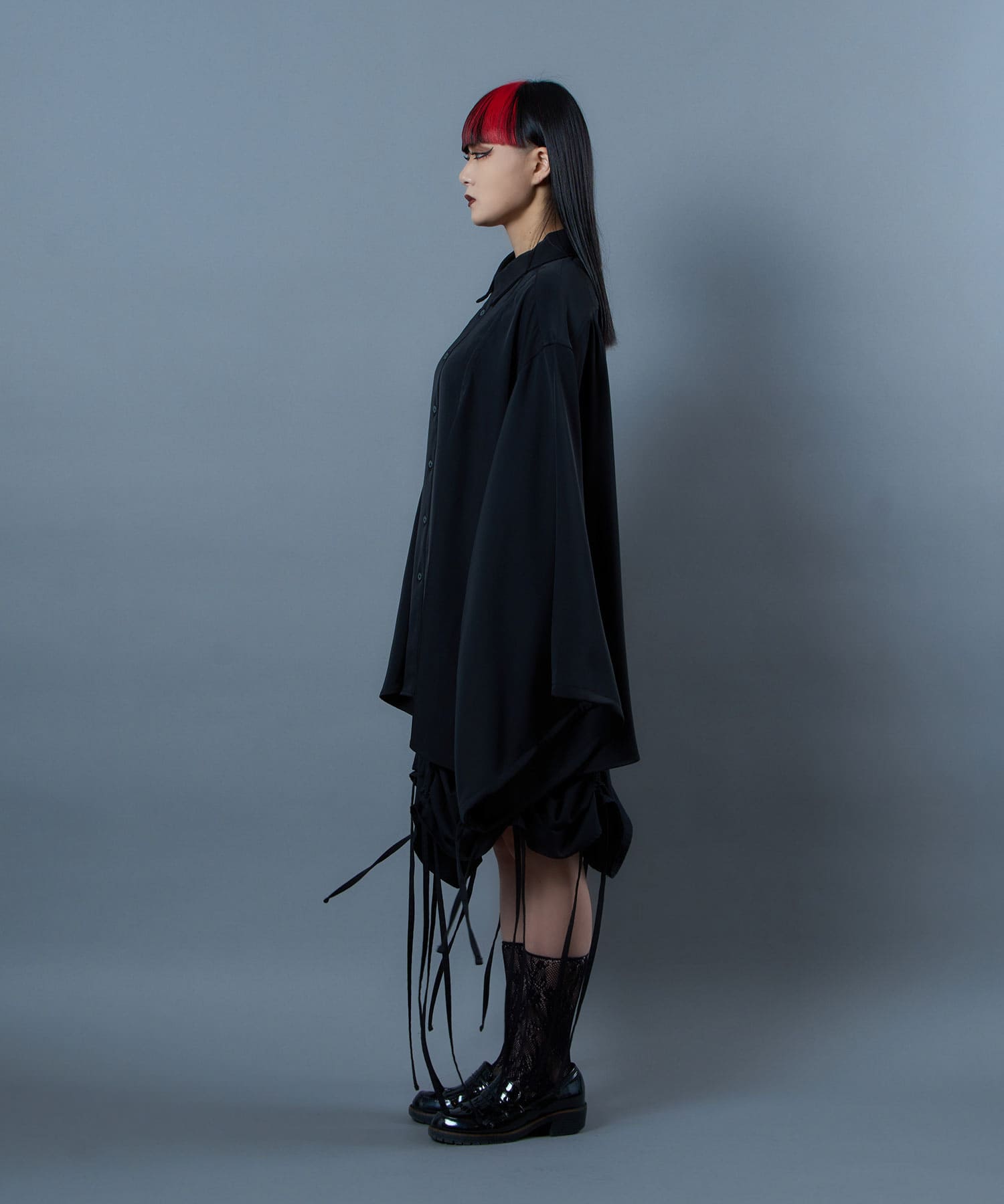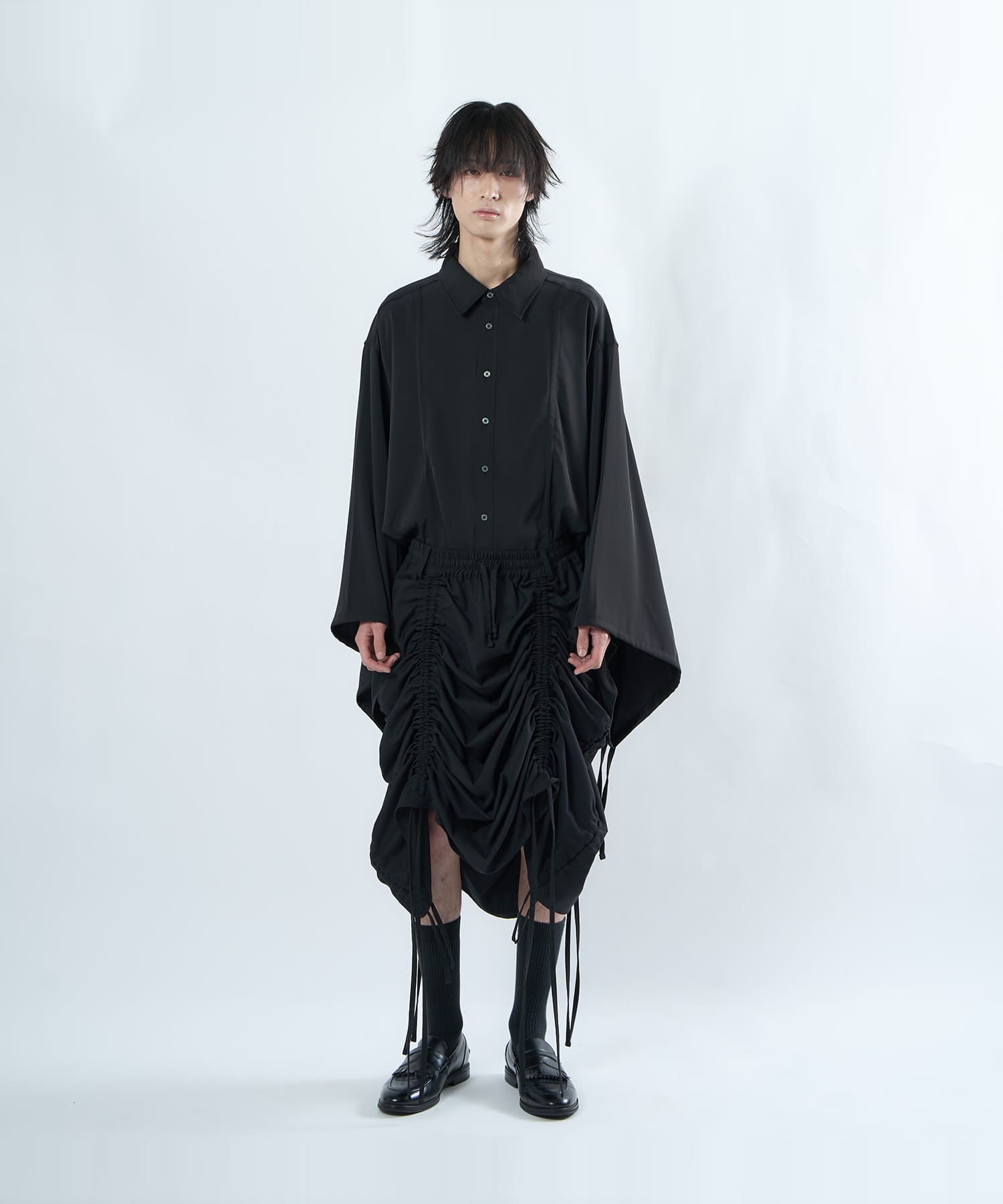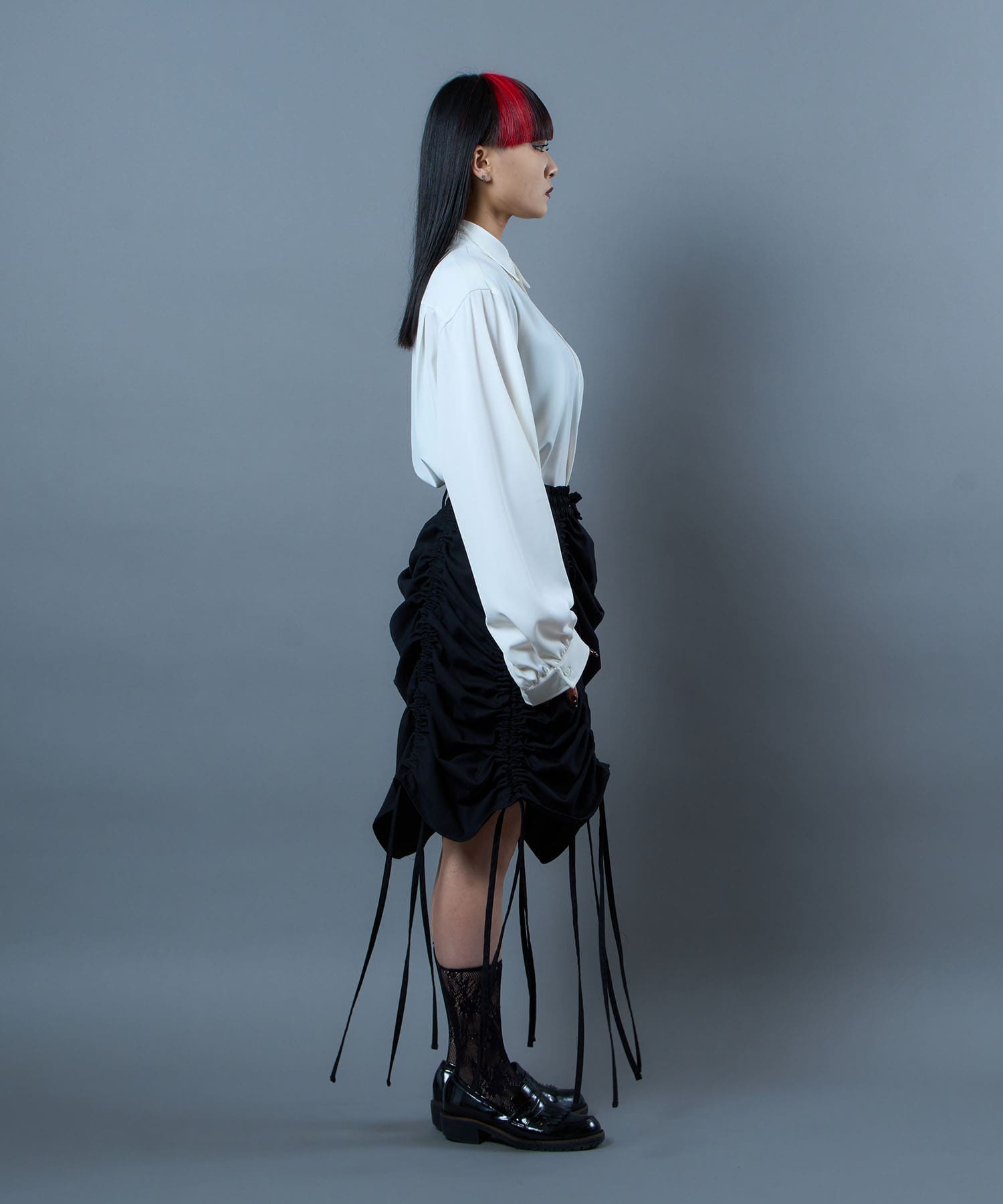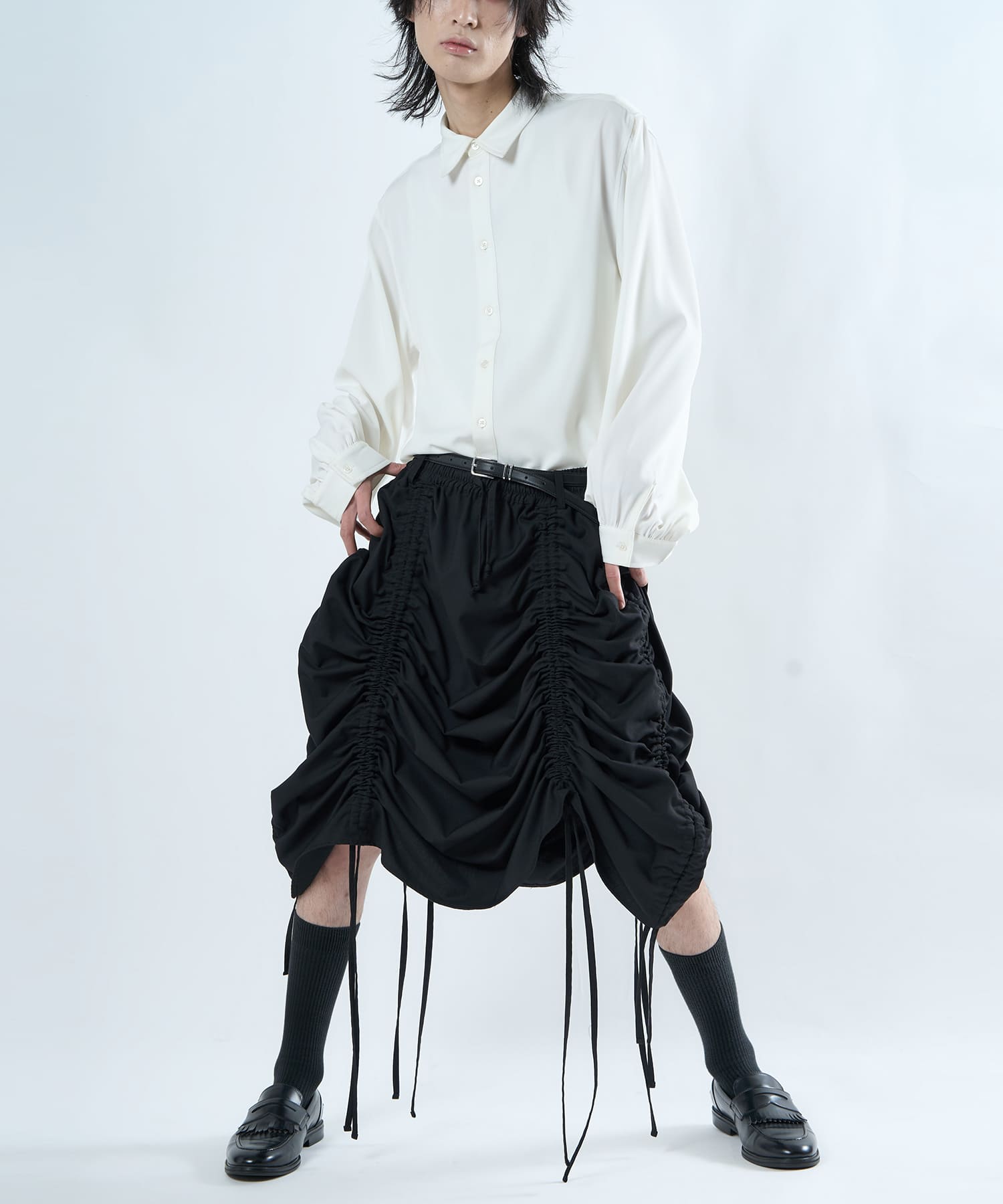 紐を結んだ時のドレープが生地との相性が良くモードな印象に。単体でも使用でき、パンツとのレイヤードもおススメです。