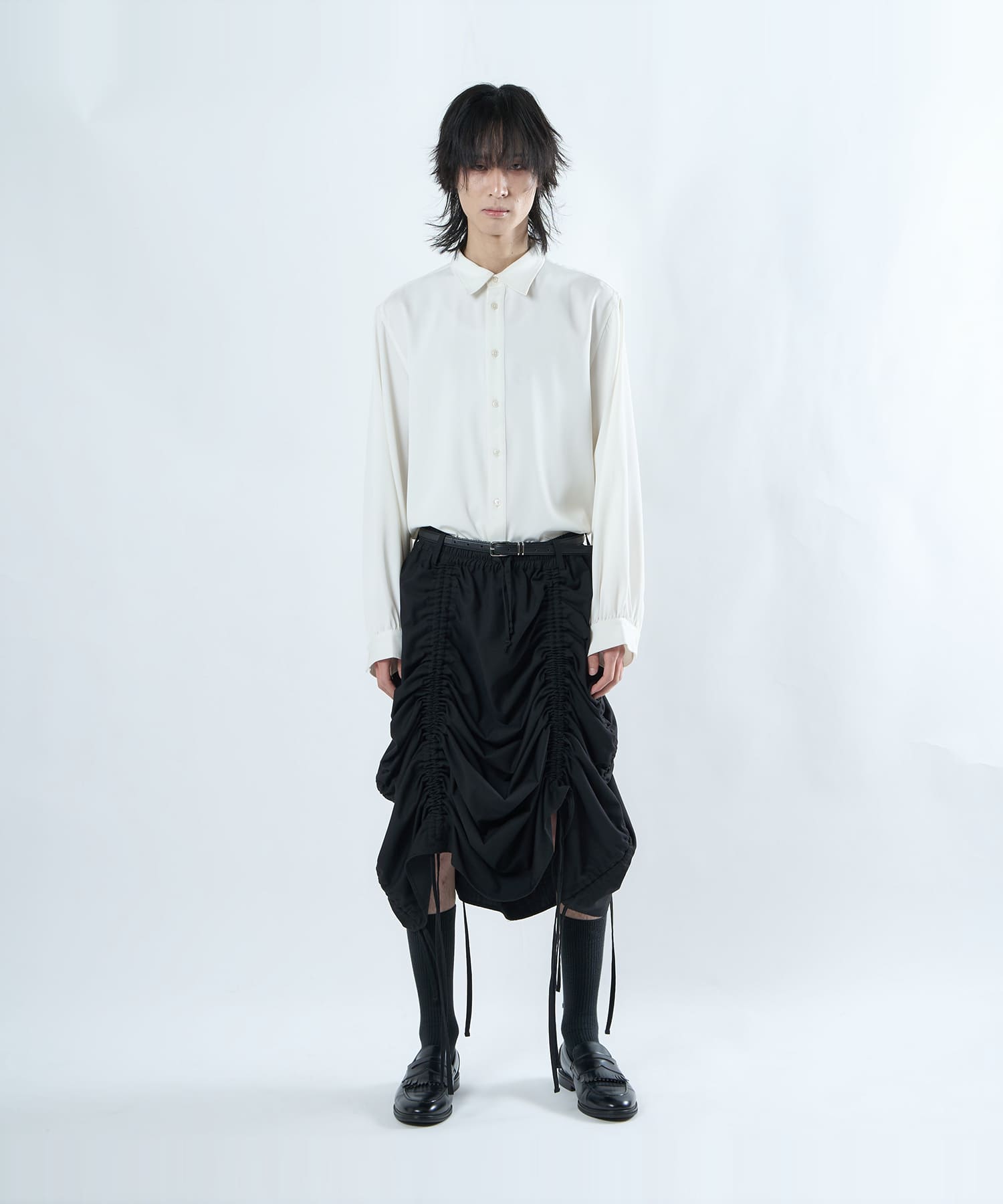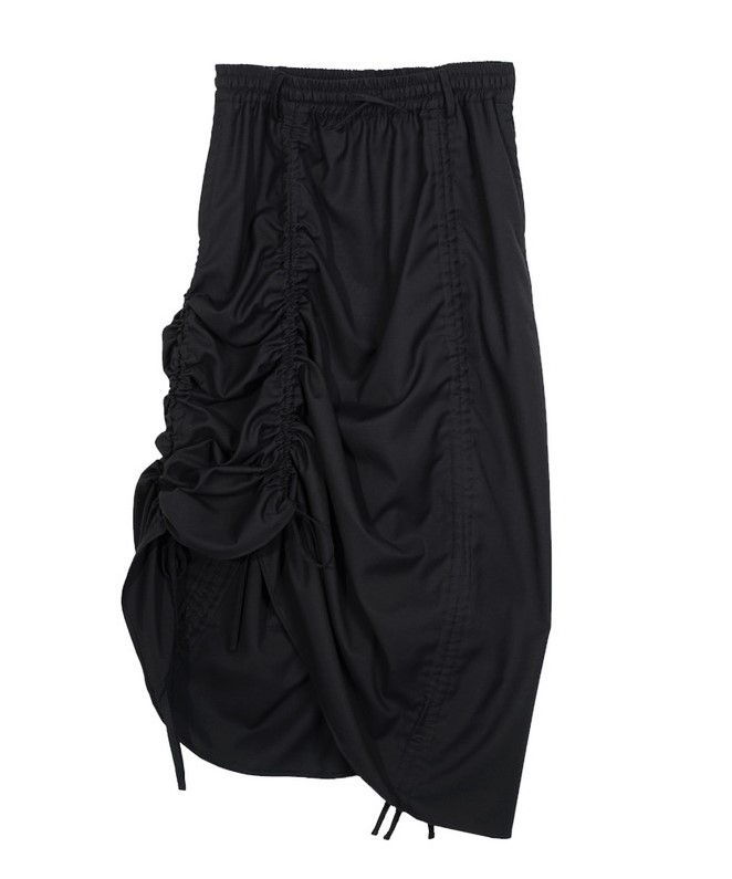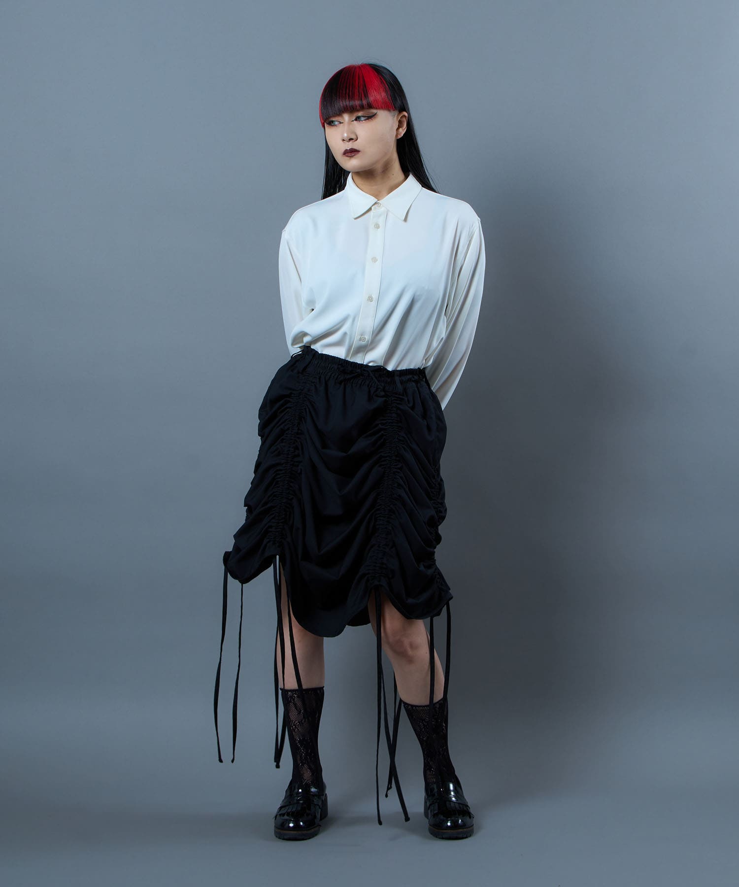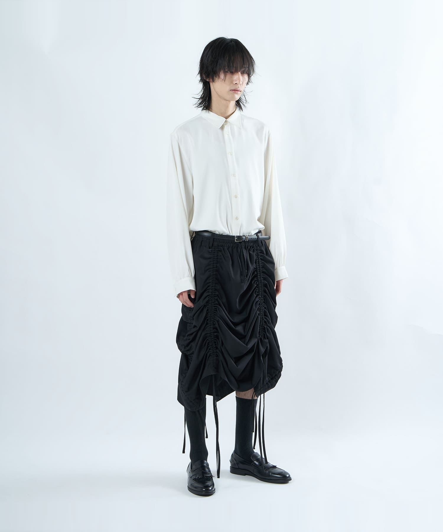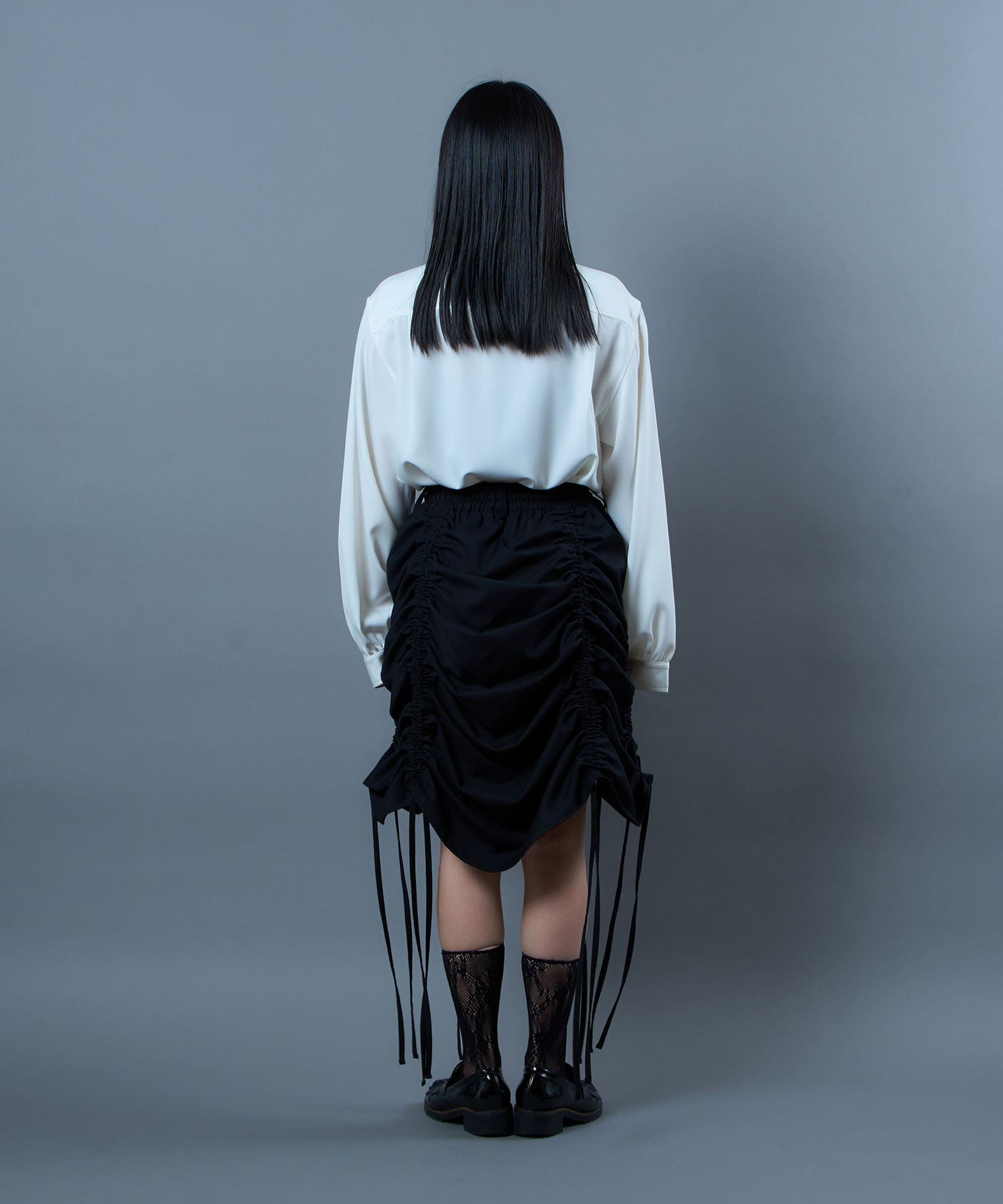 紐を結んだ時のドレープが生地との相性が良くモードな印象に。単体でも使用でき、パンツとのレイヤードもおススメです。