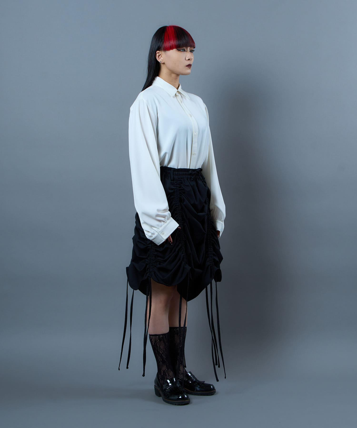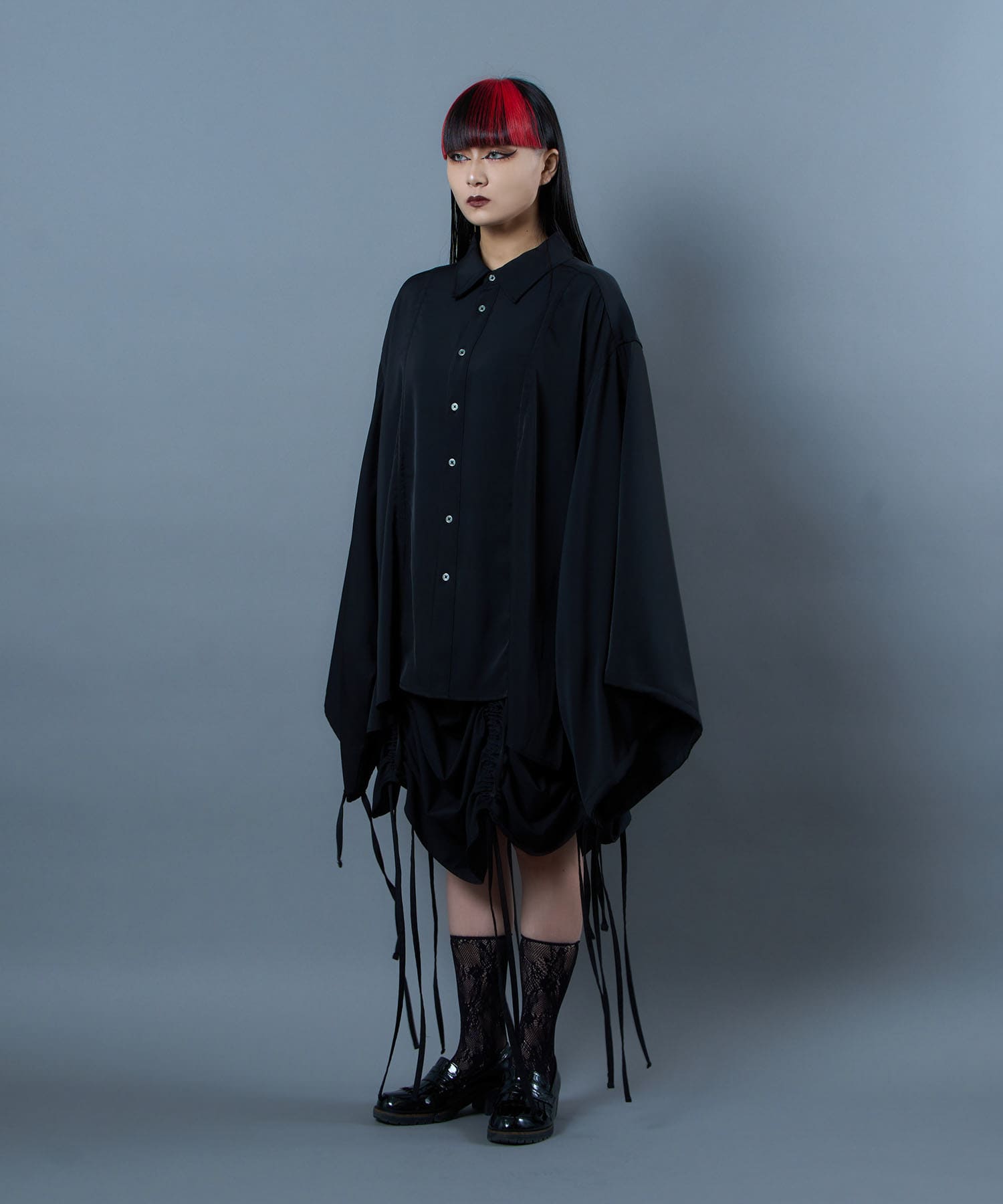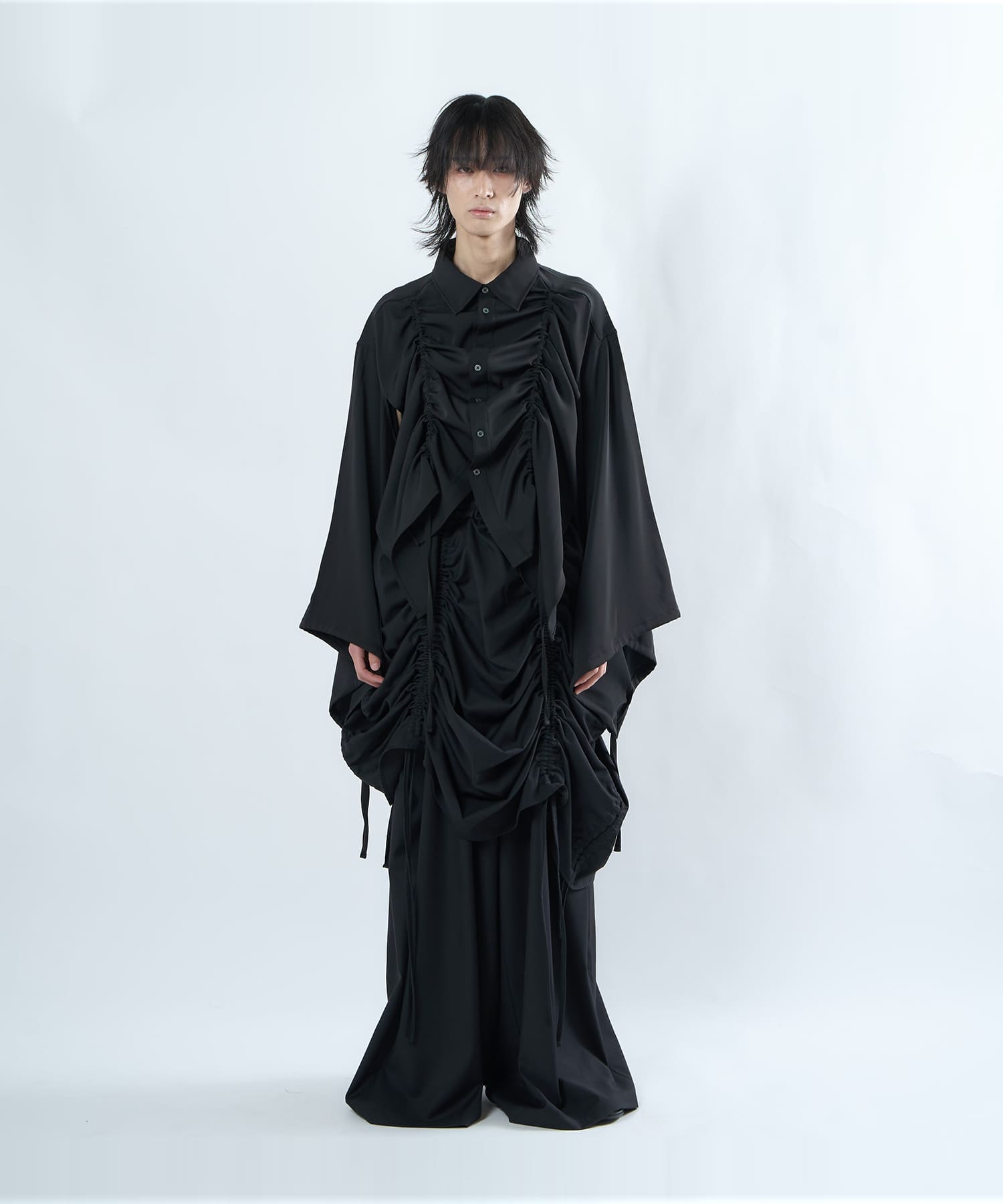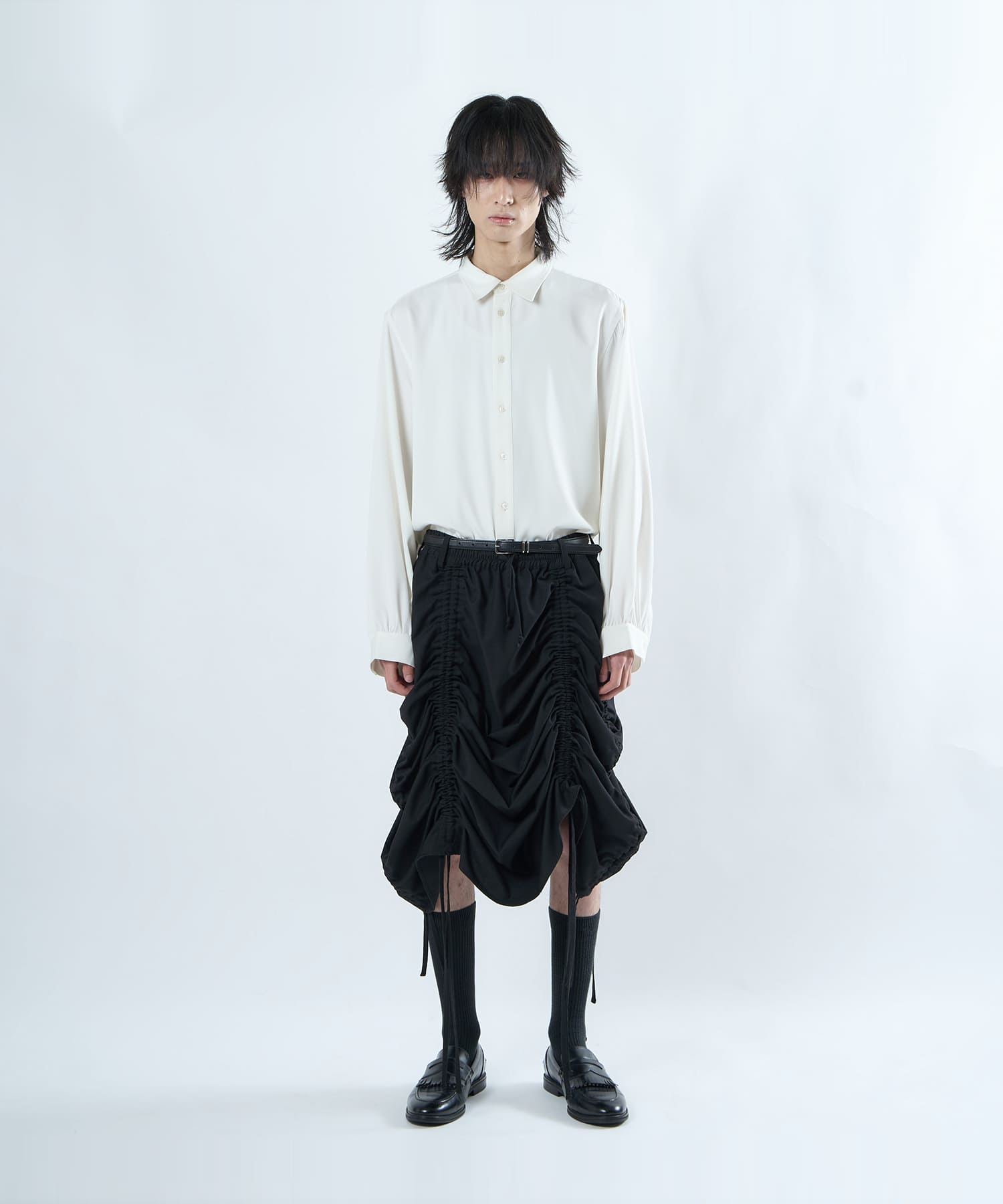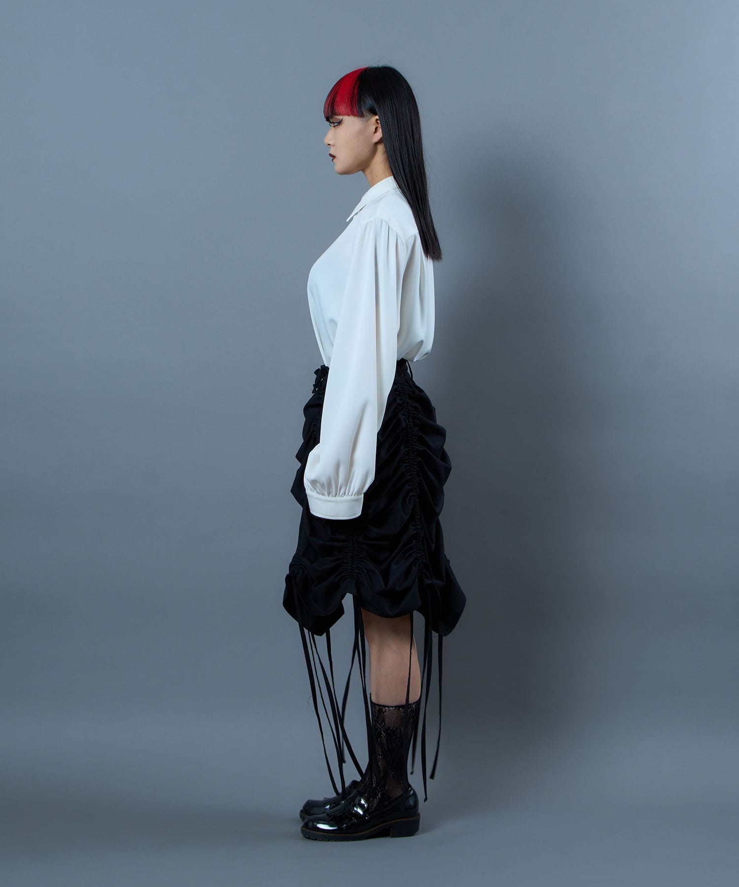 紐を結んだ時のドレープが生地との相性が良くモードな印象に。単体でも使用でき、パンツとのレイヤードもおススメです。