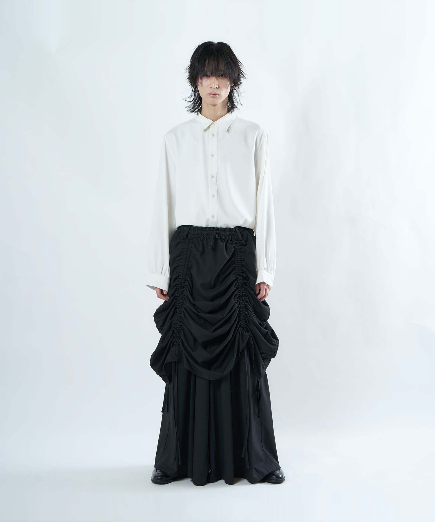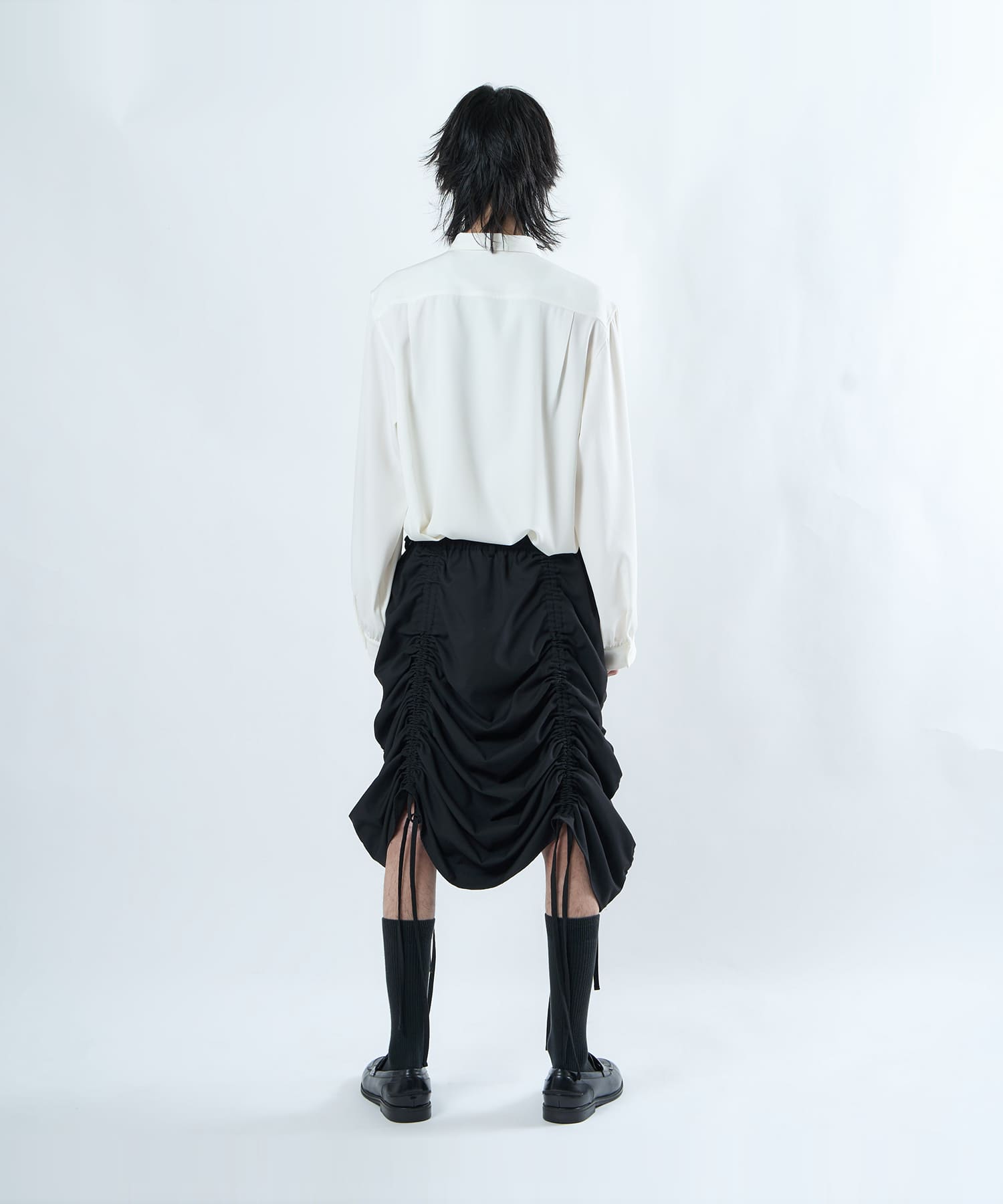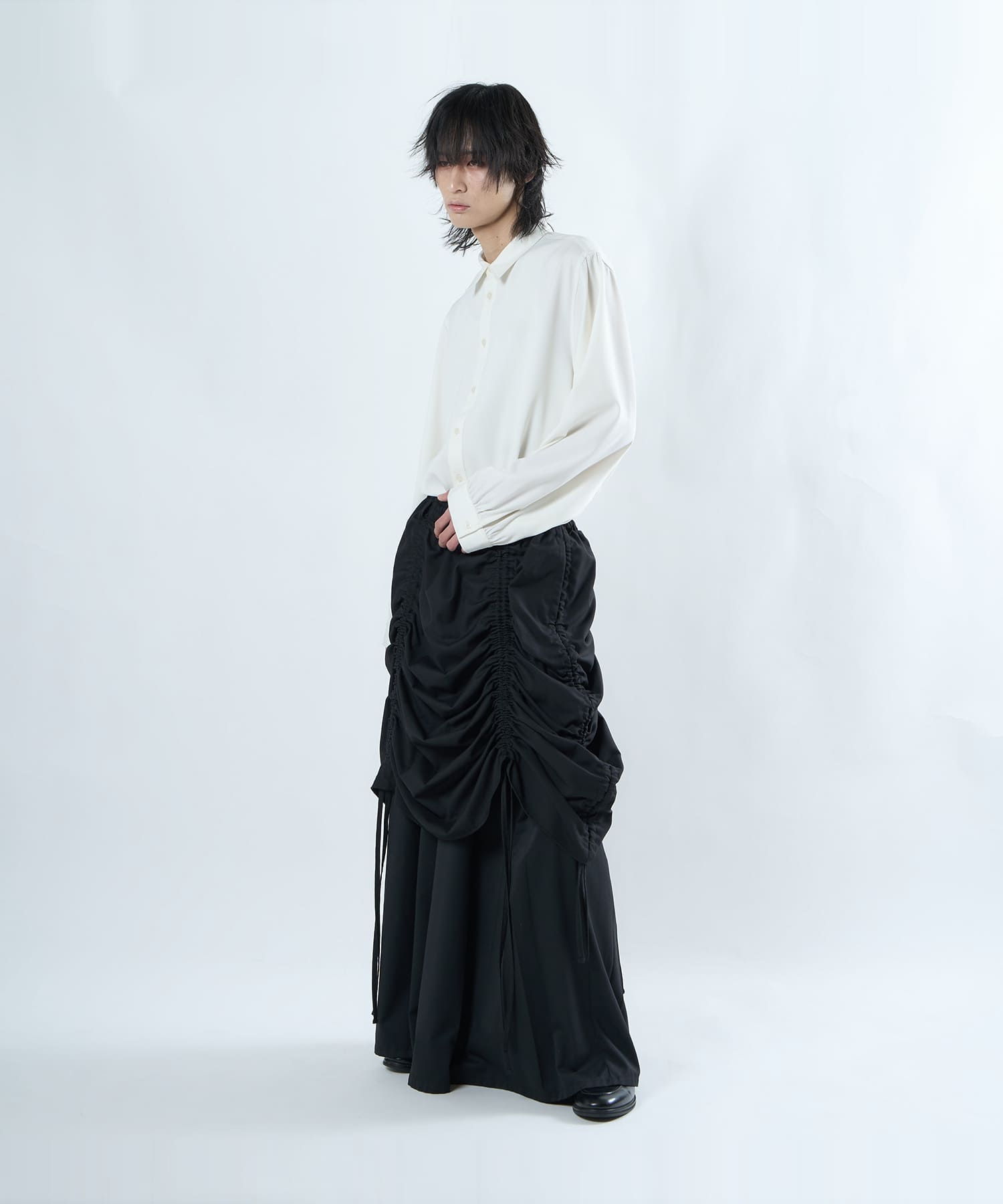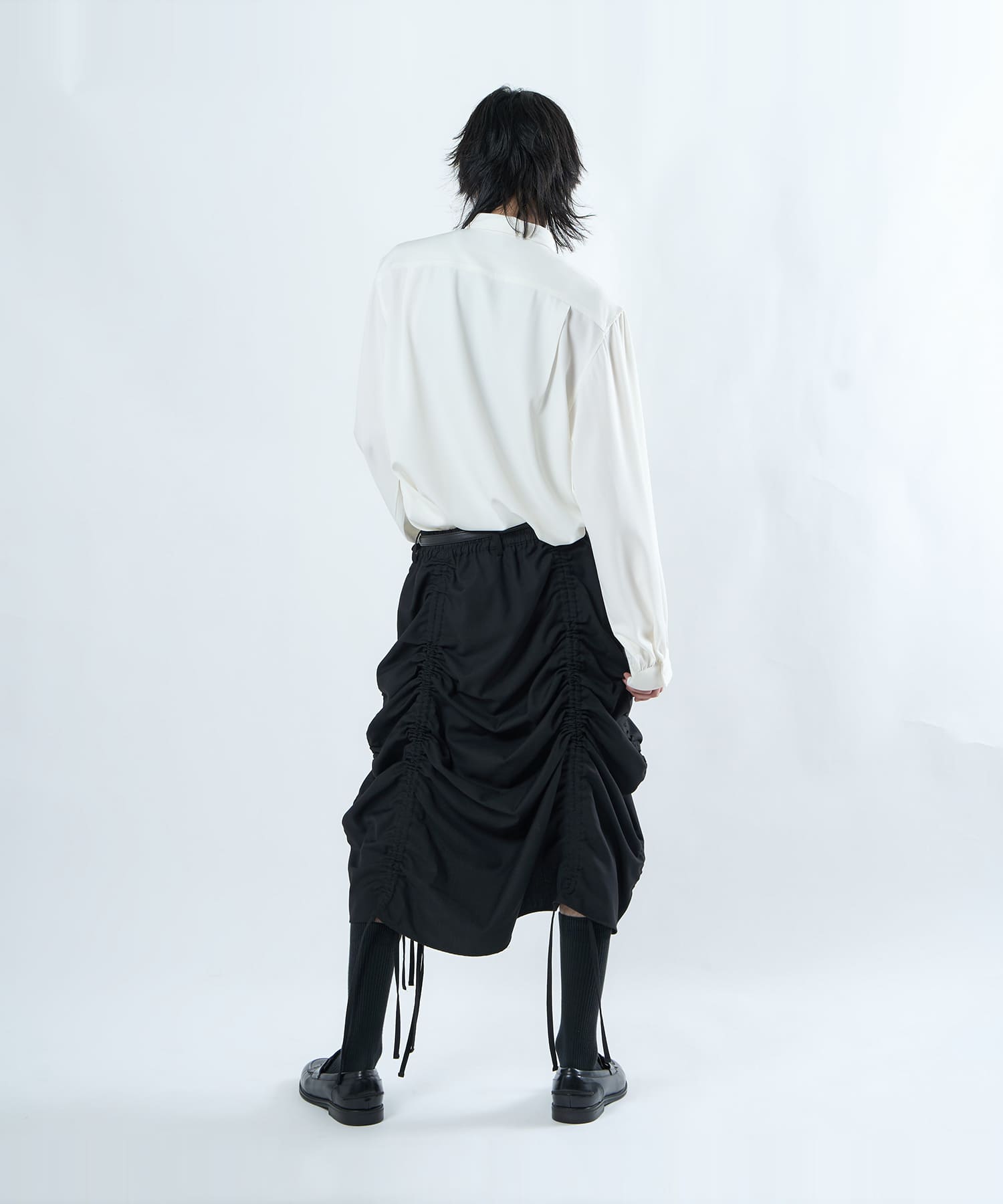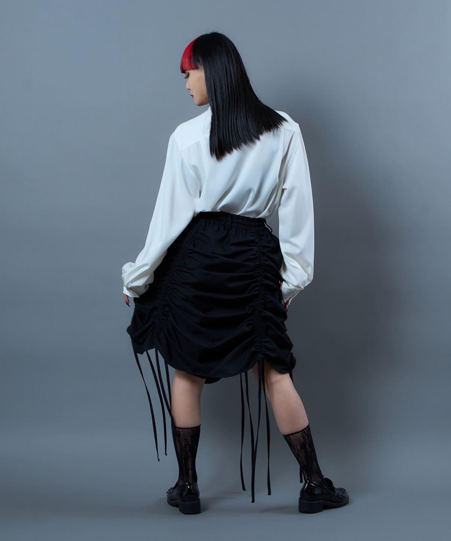 紐を結んだ時のドレープが生地との相性が良くモードな印象に。単体でも使用でき、パンツとのレイヤードもおススメです。