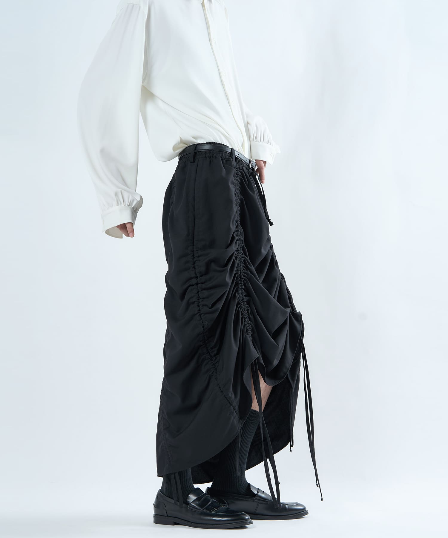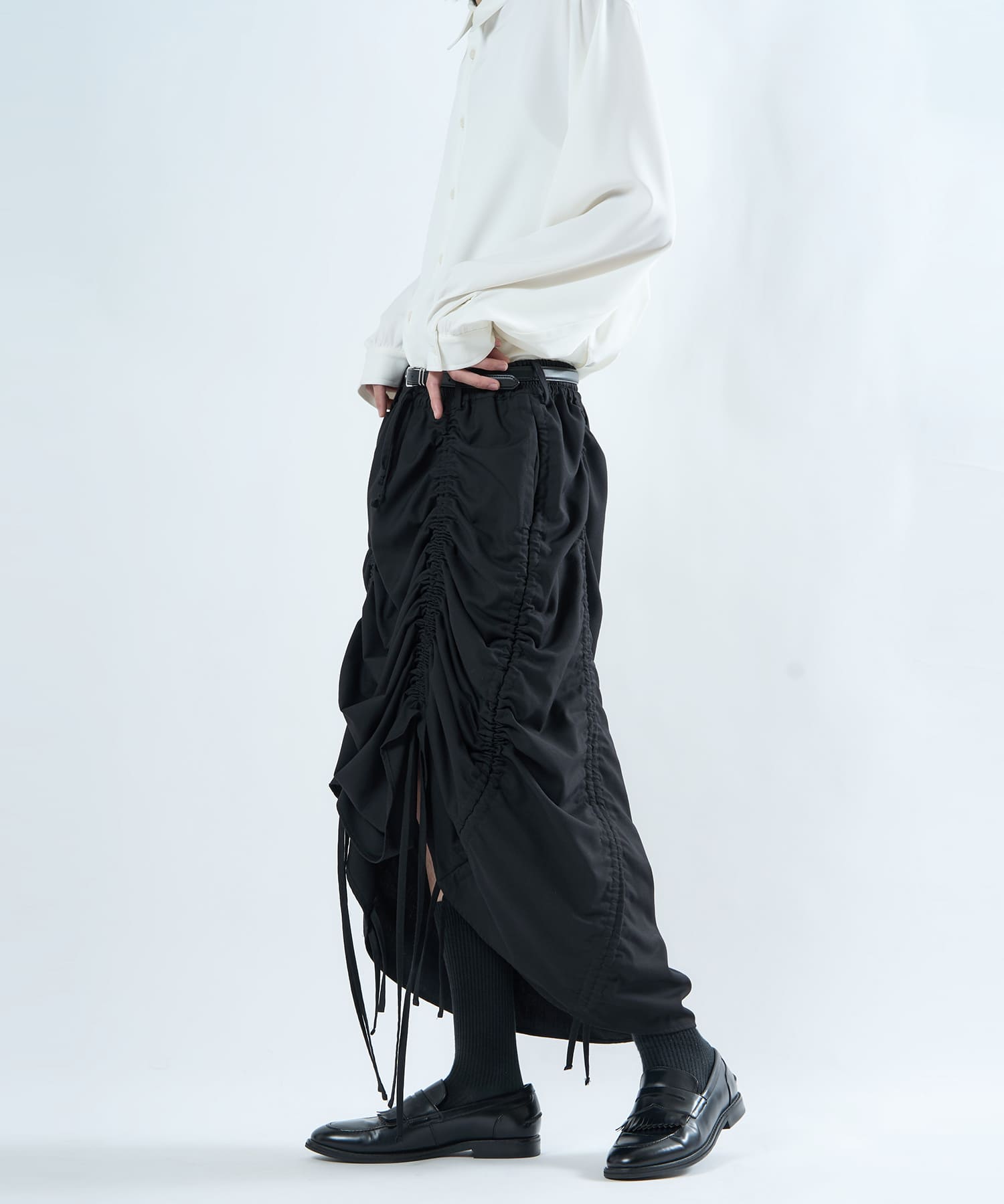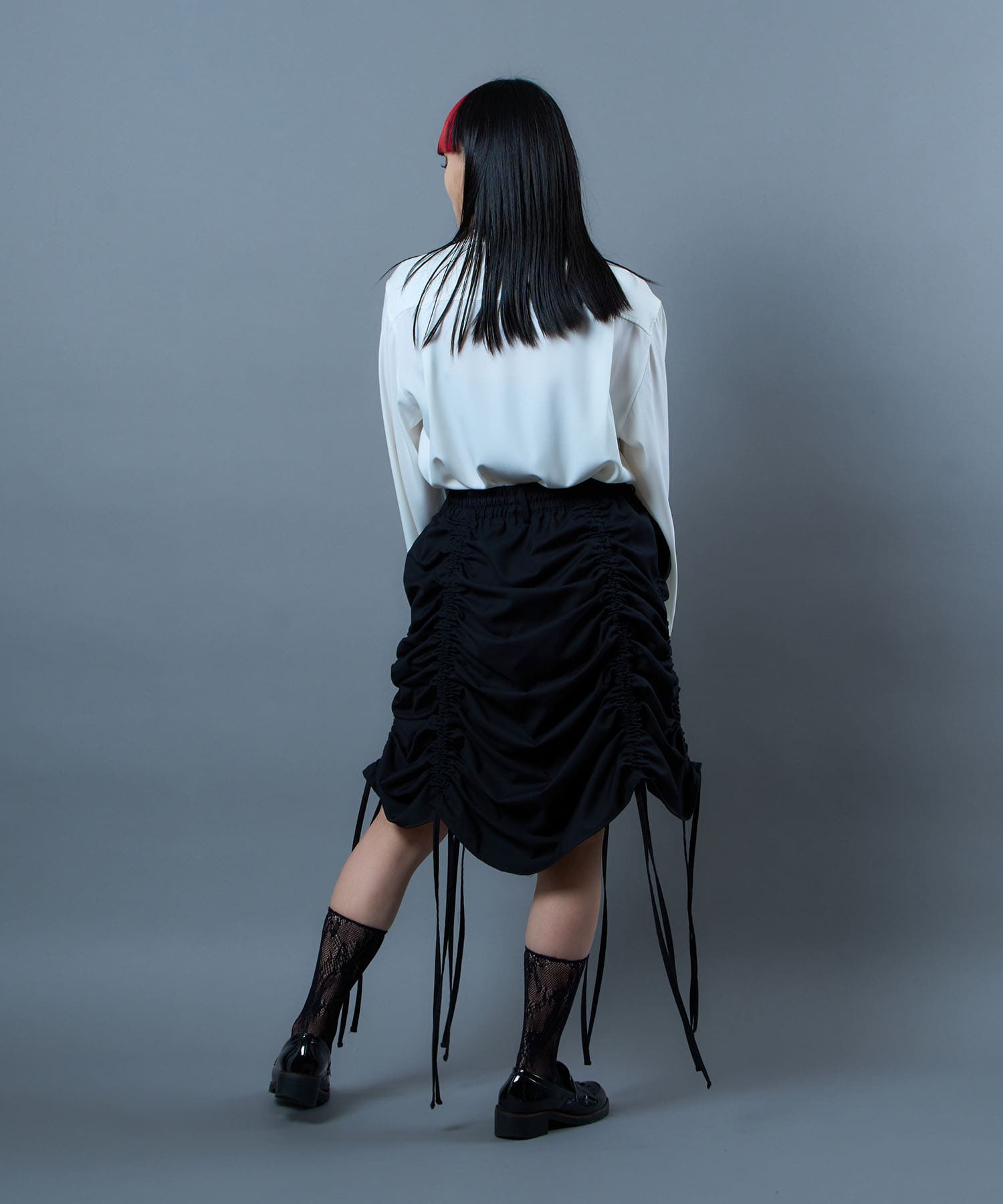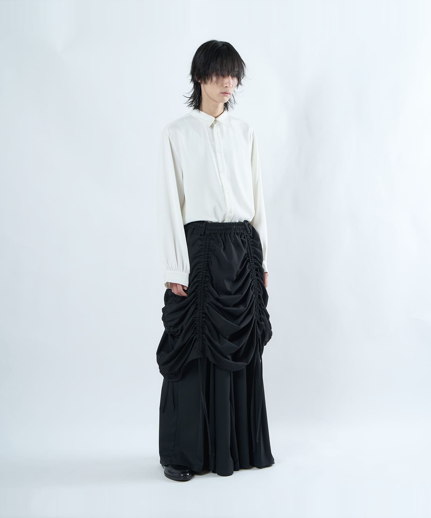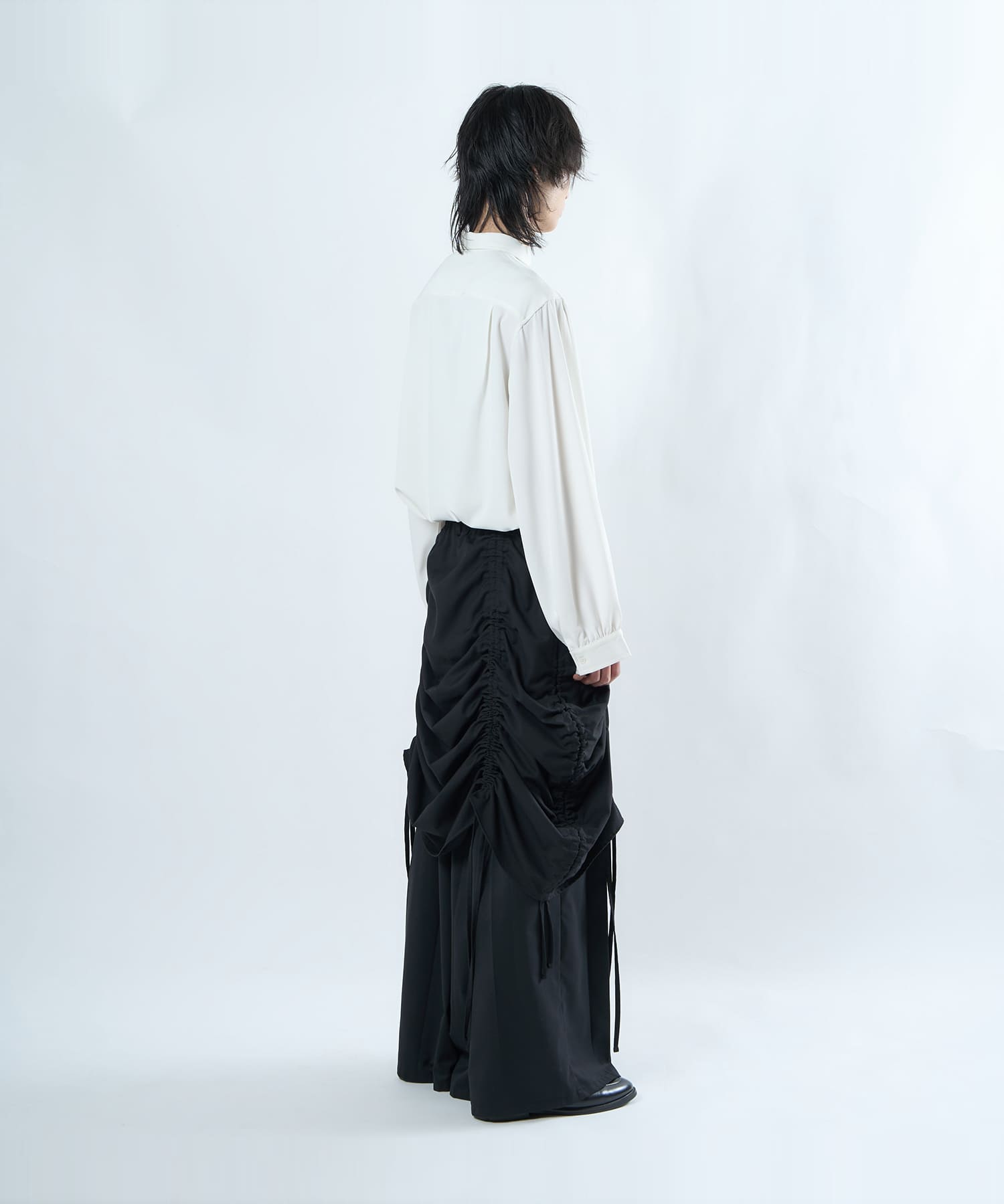 紐を結んだ時のドレープが生地との相性が良くモードな印象に。単体でも使用でき、パンツとのレイヤードもおススメです。