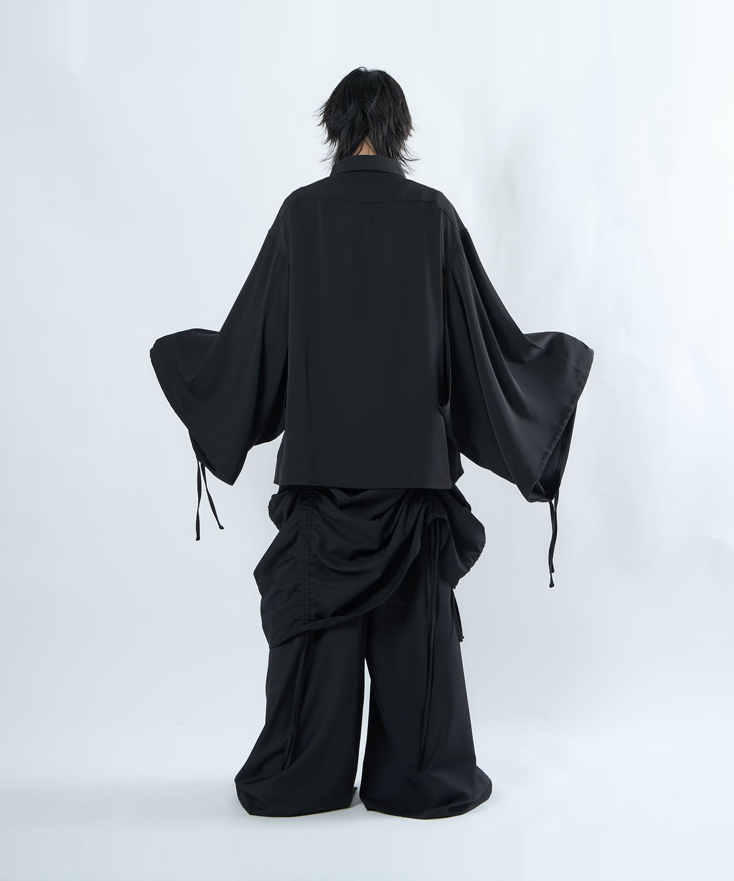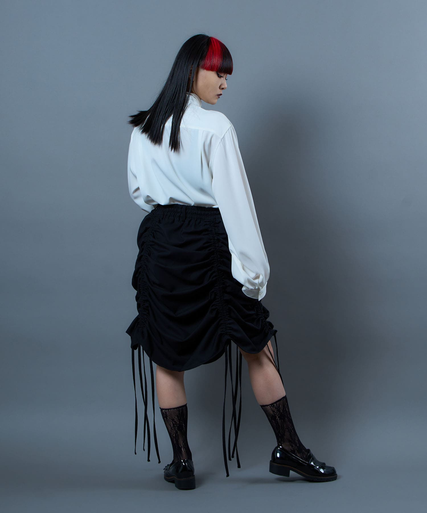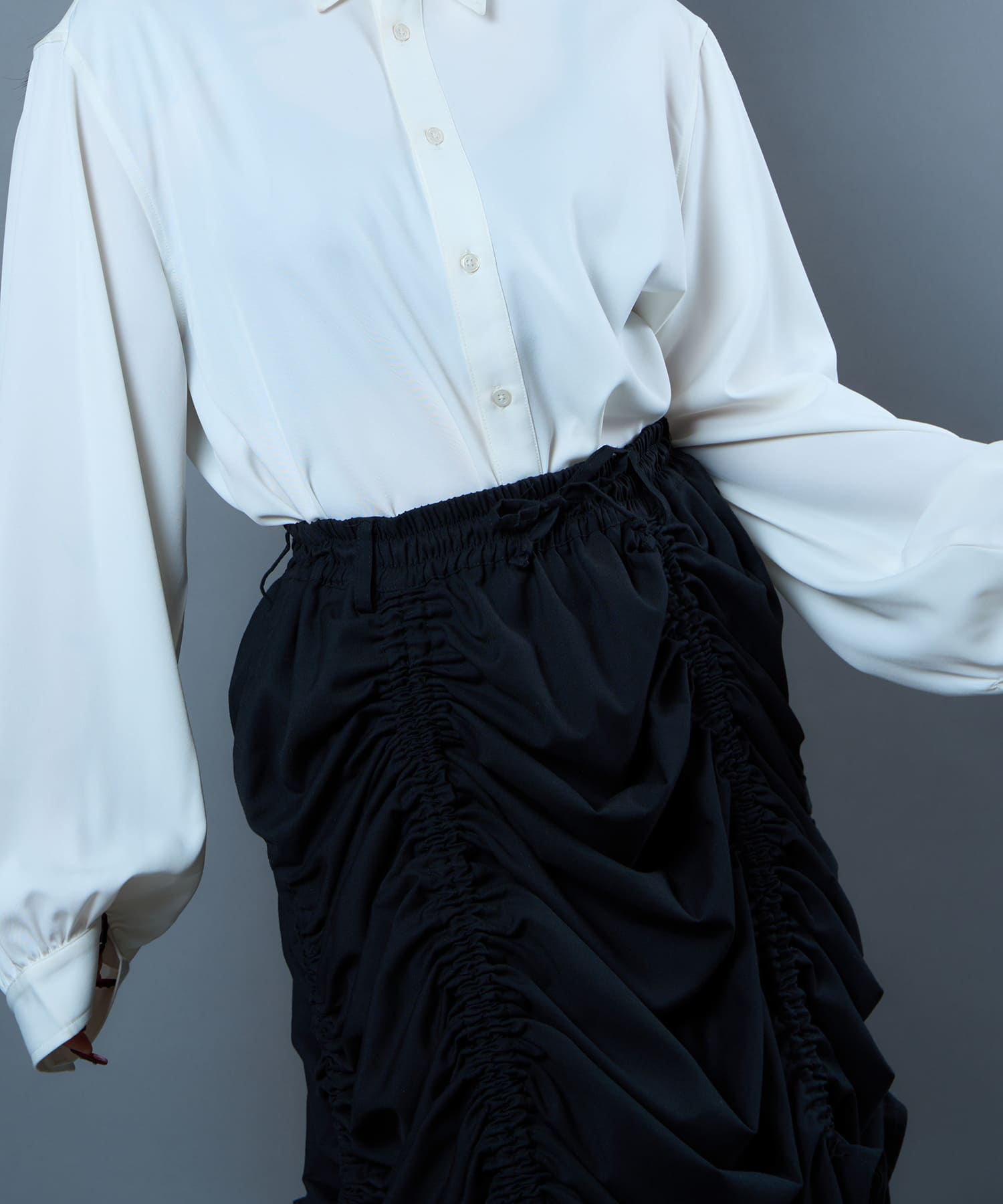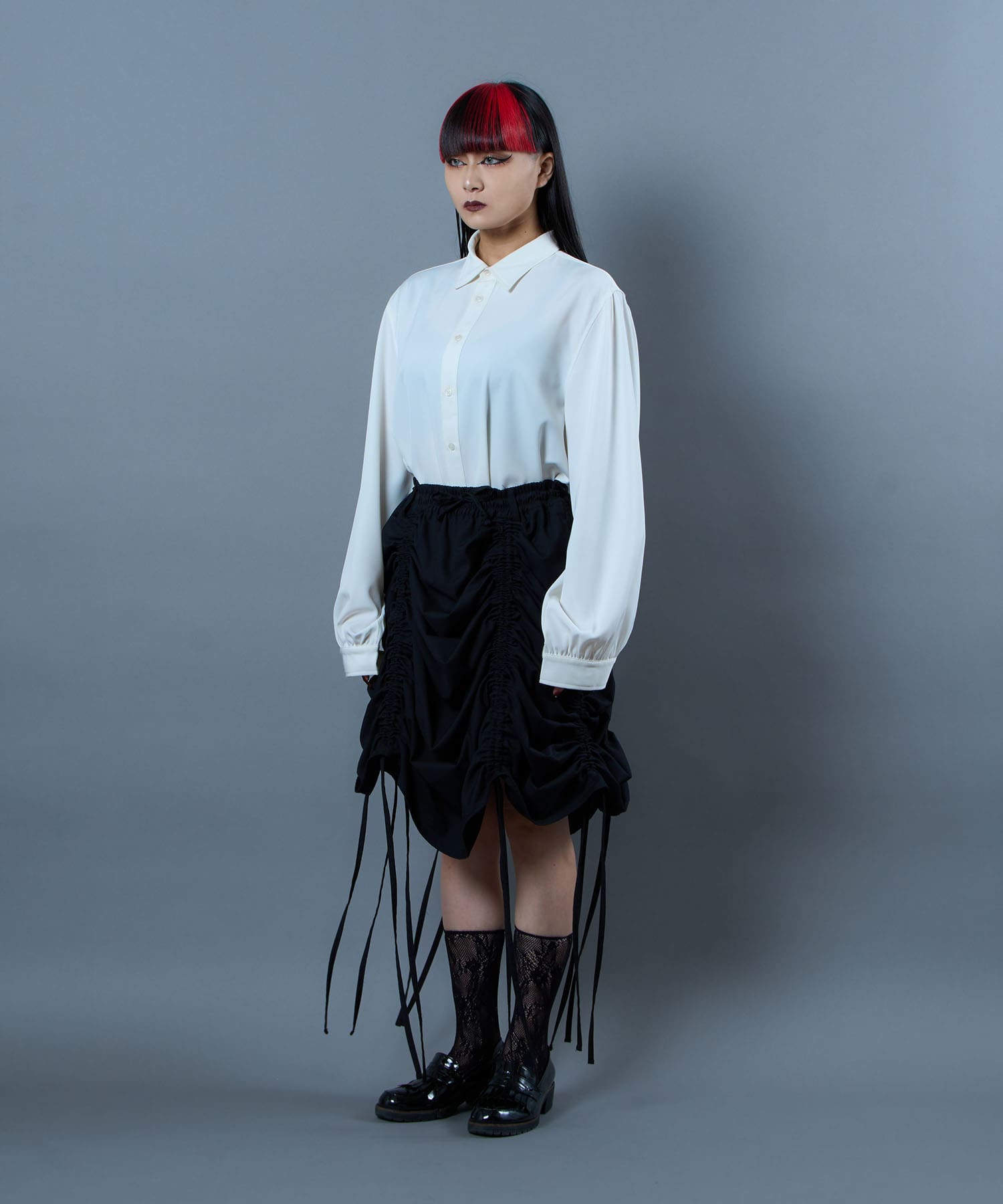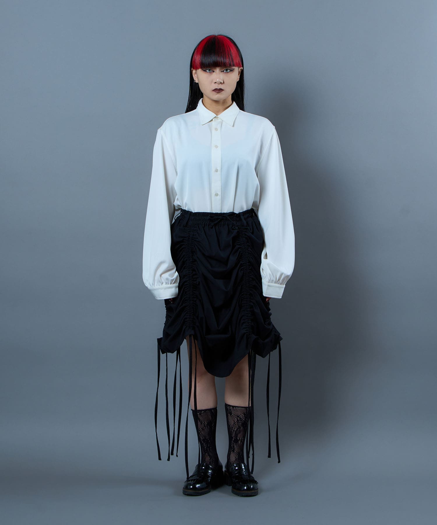 紐を結んだ時のドレープが生地との相性が良くモードな印象に。単体でも使用でき、パンツとのレイヤードもおススメです。