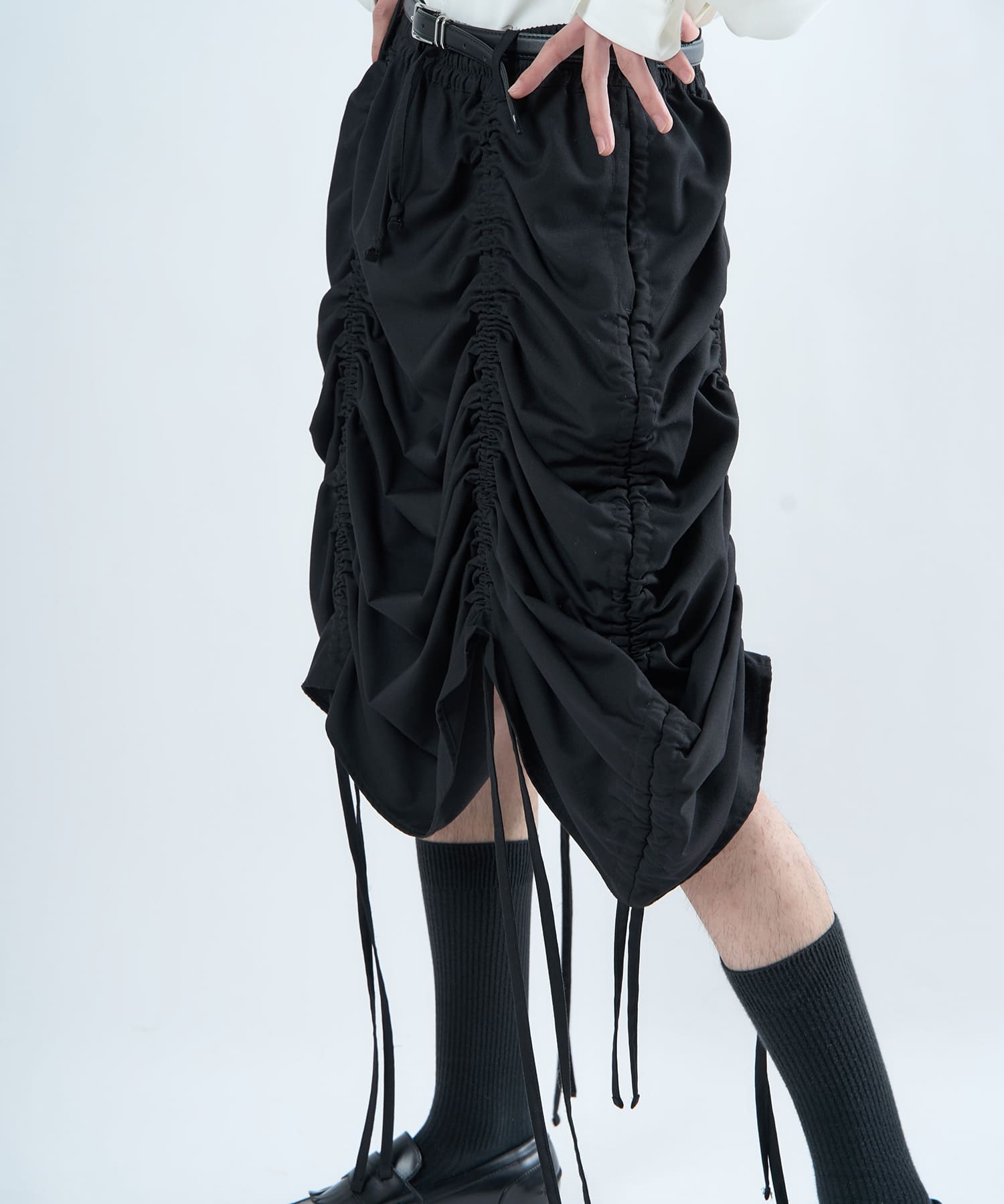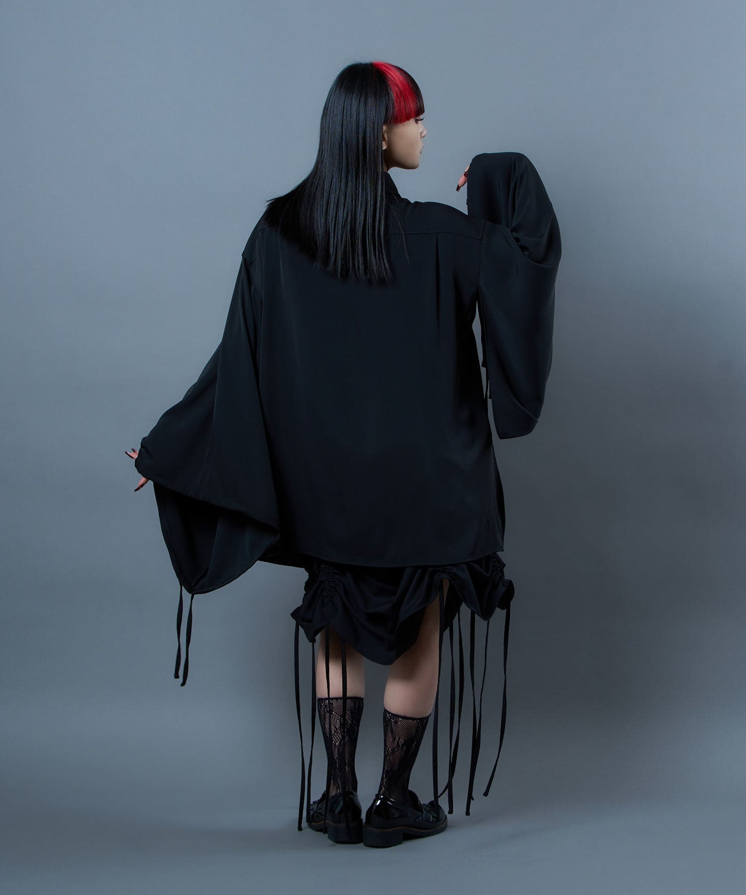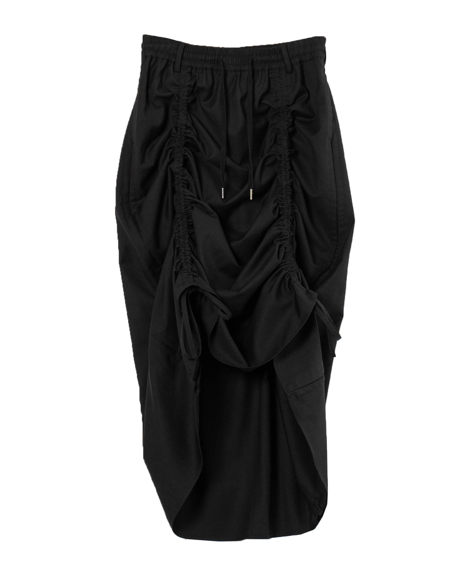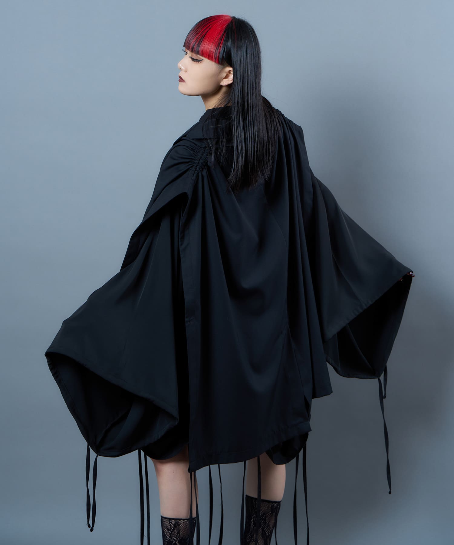 紐を結んだ時のドレープが生地との相性が良くモードな印象に。単体でも使用でき、パンツとのレイヤードもおススメです。
