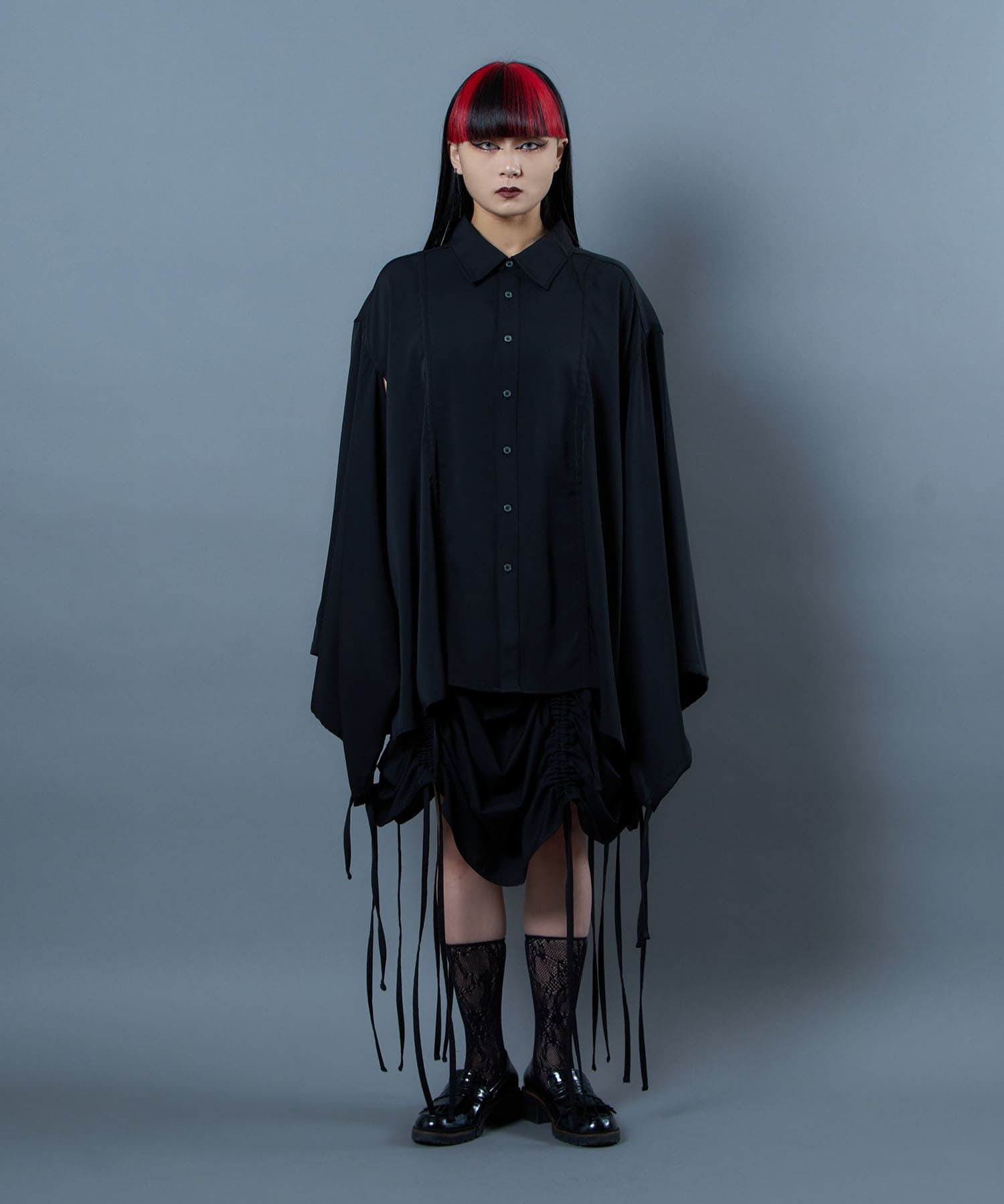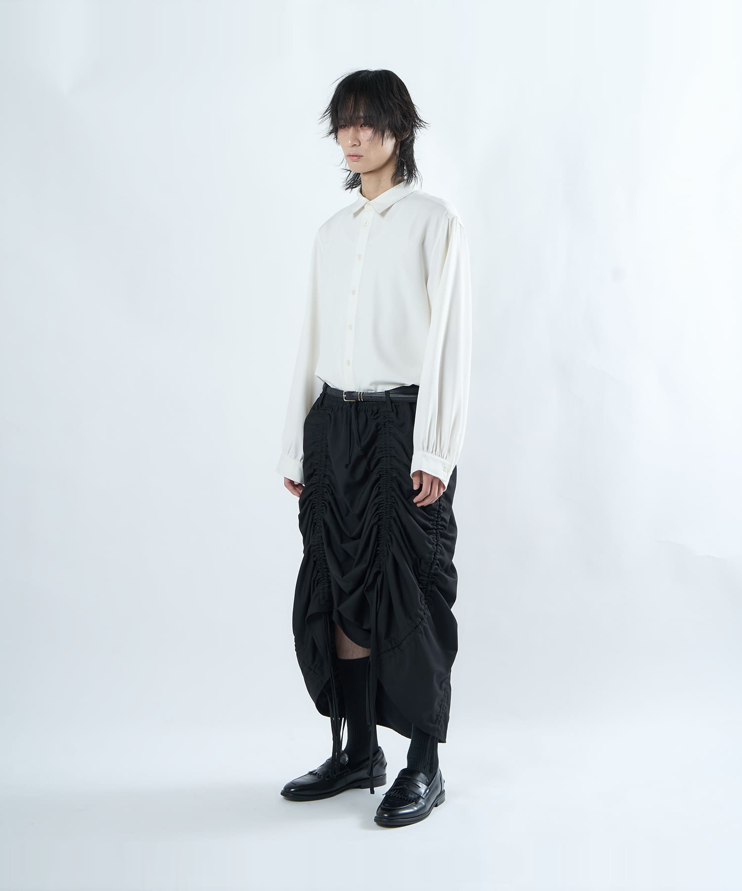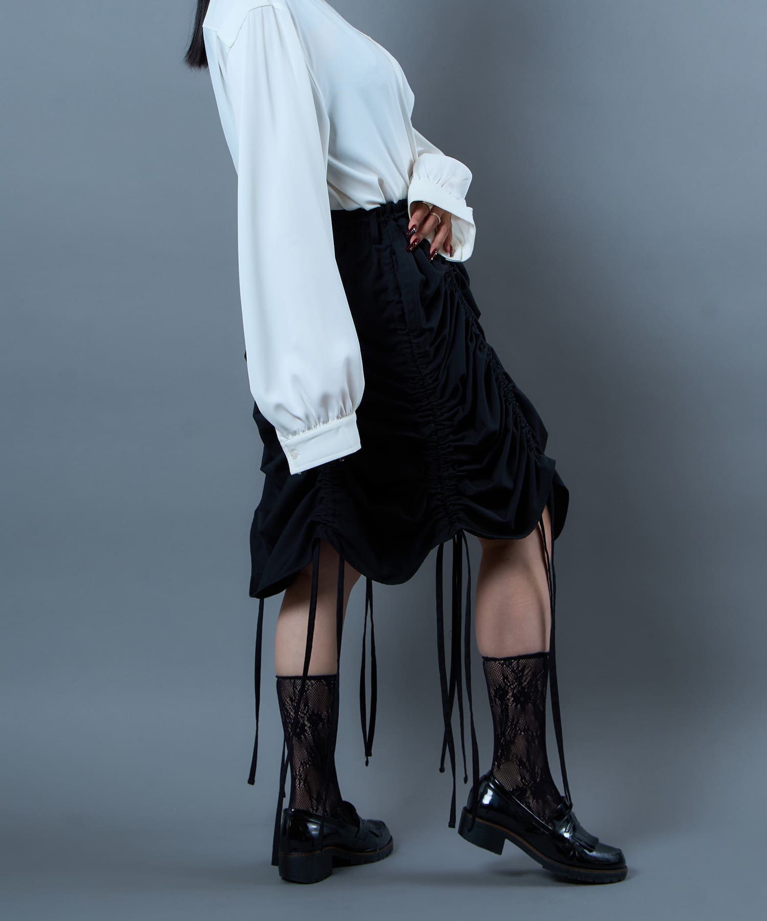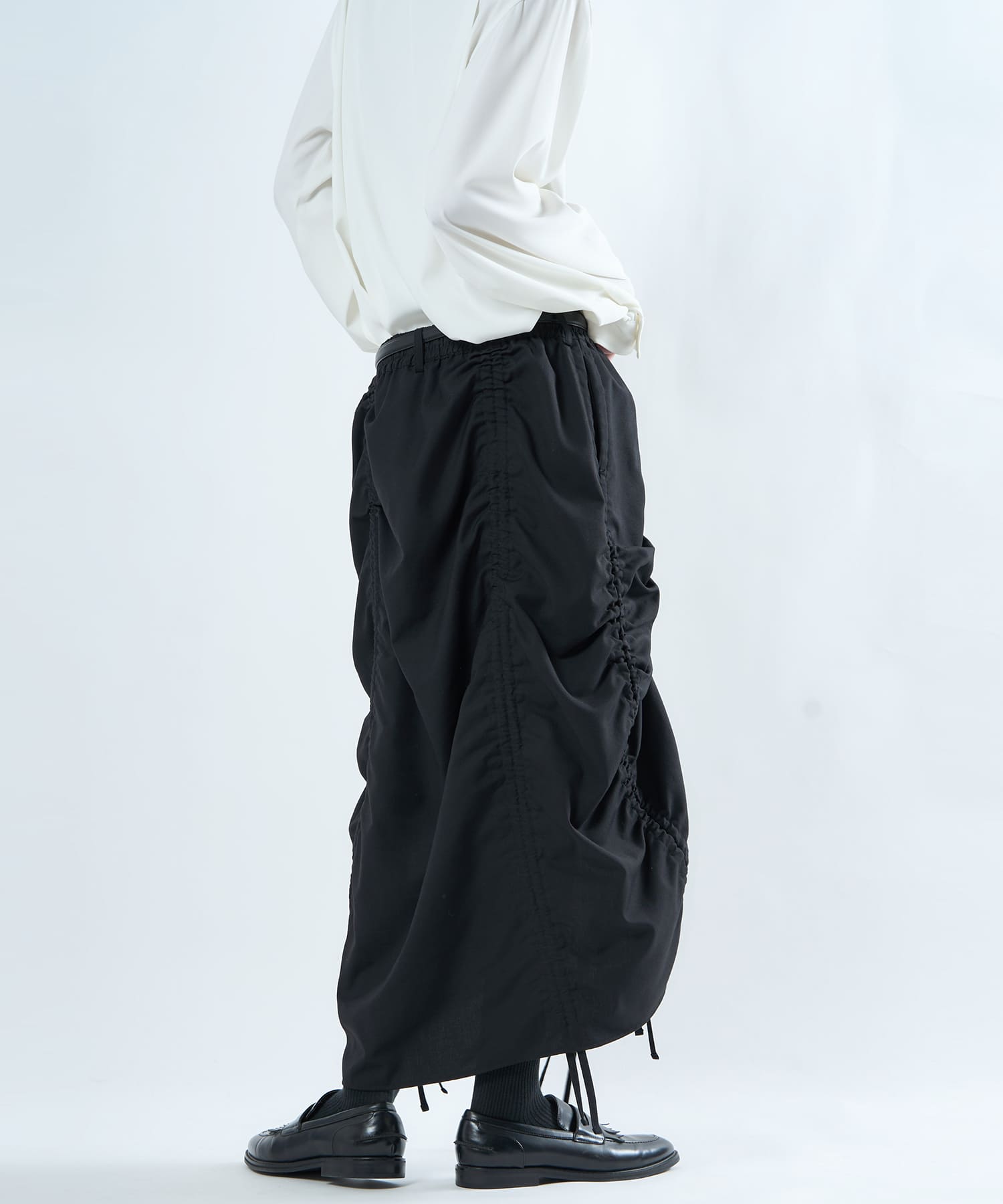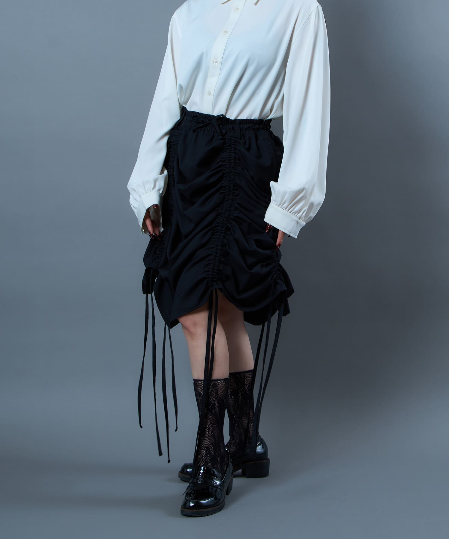 紐を結んだ時のドレープが生地との相性が良くモードな印象に。単体でも使用でき、パンツとのレイヤードもおススメです。