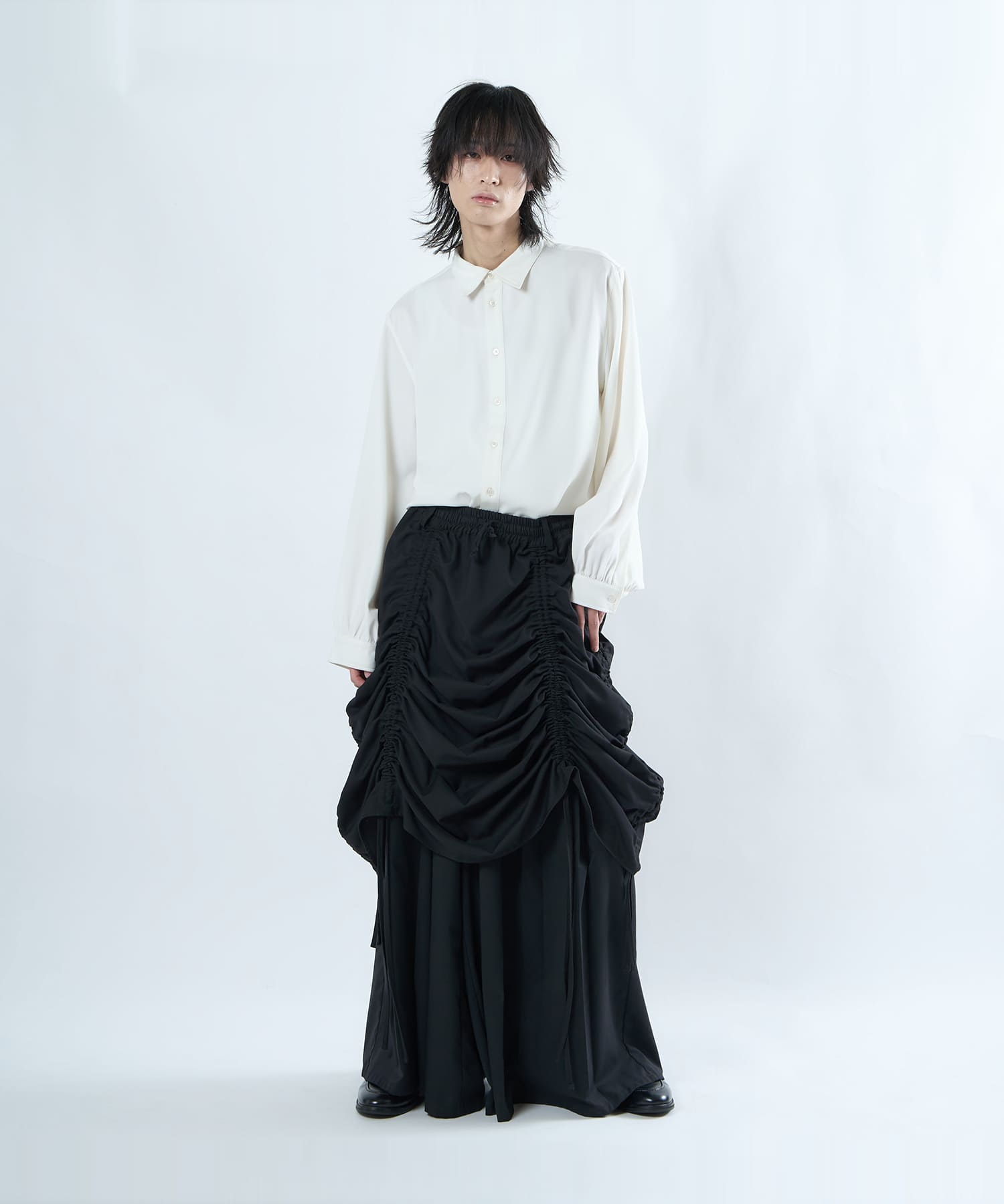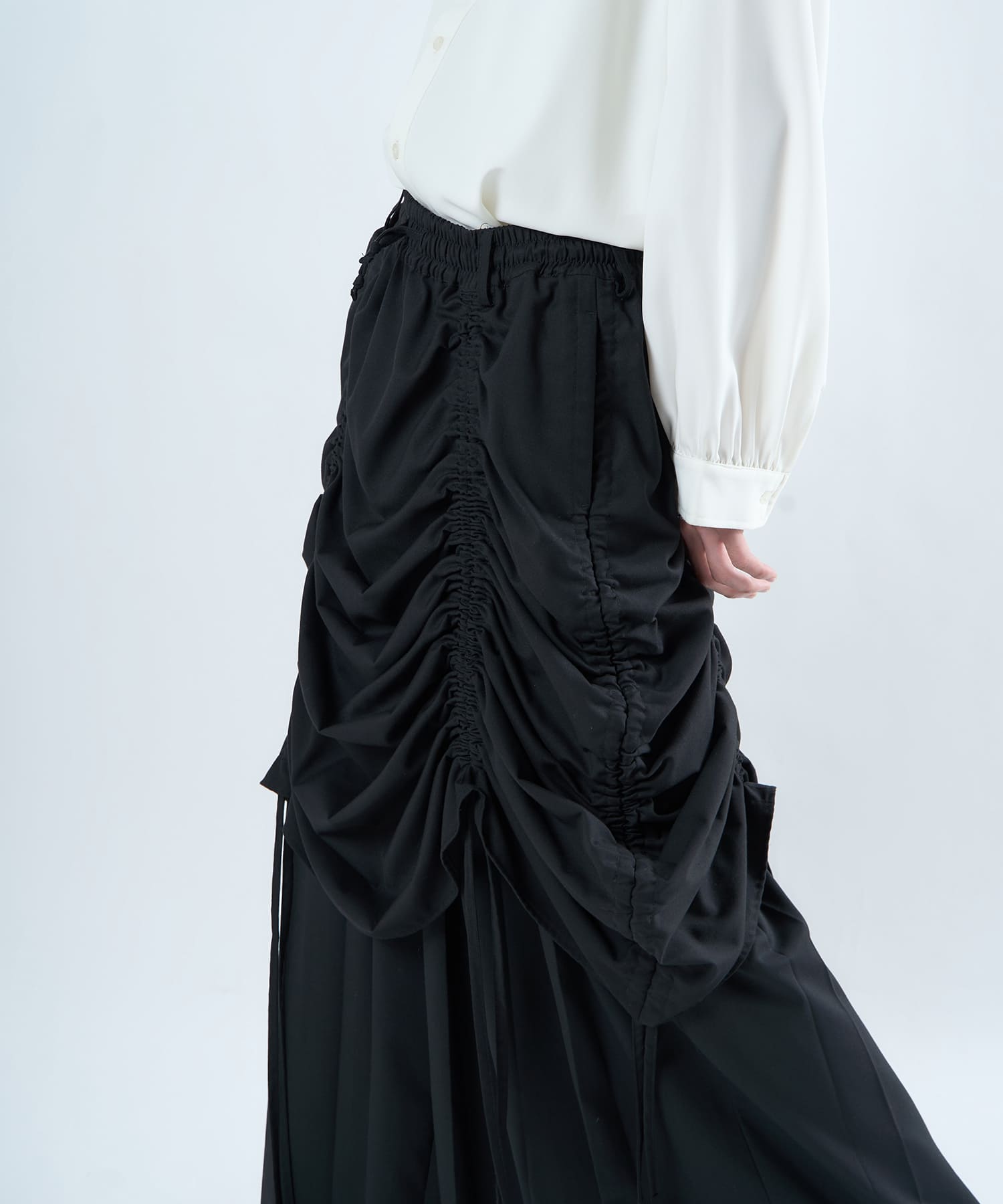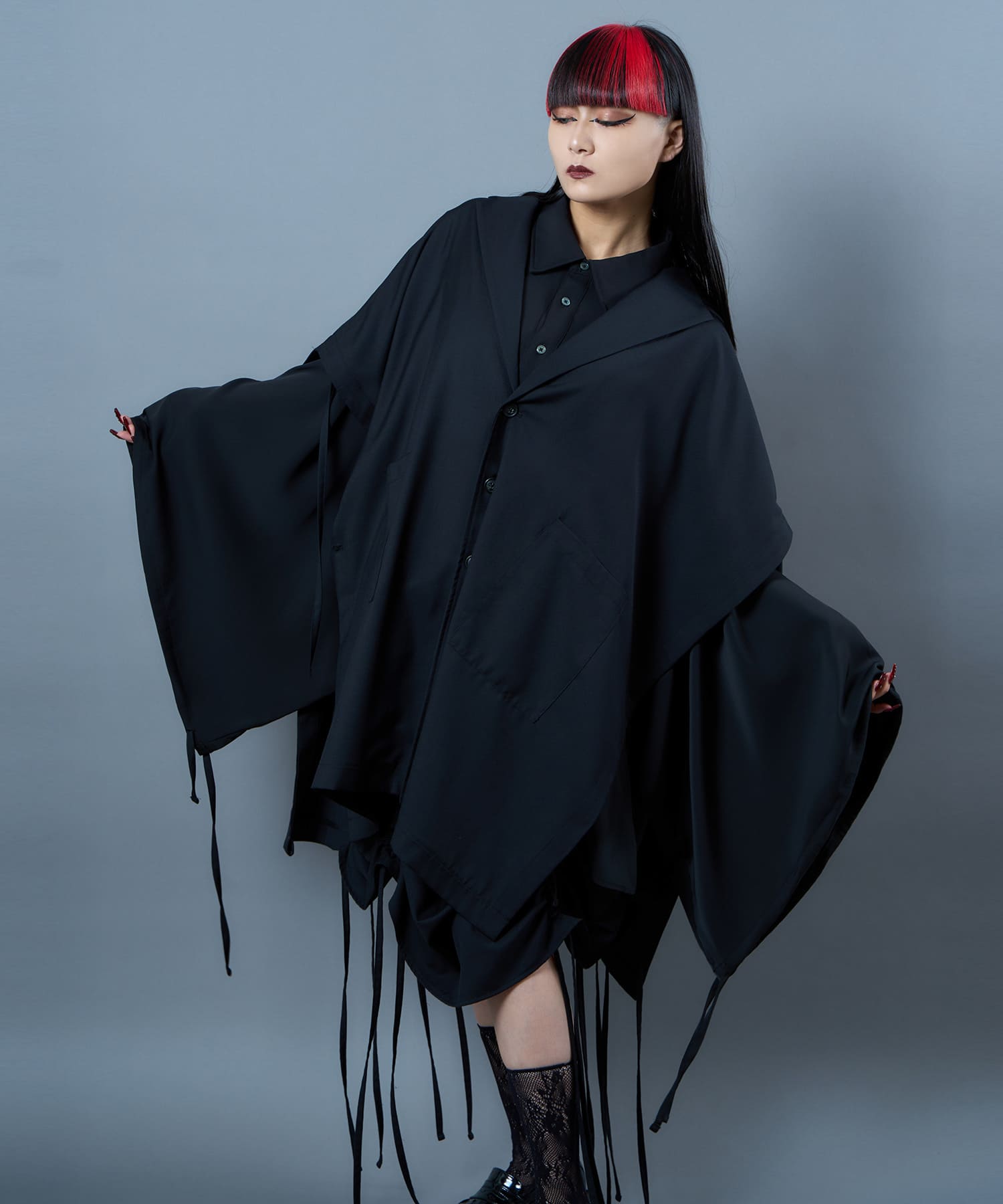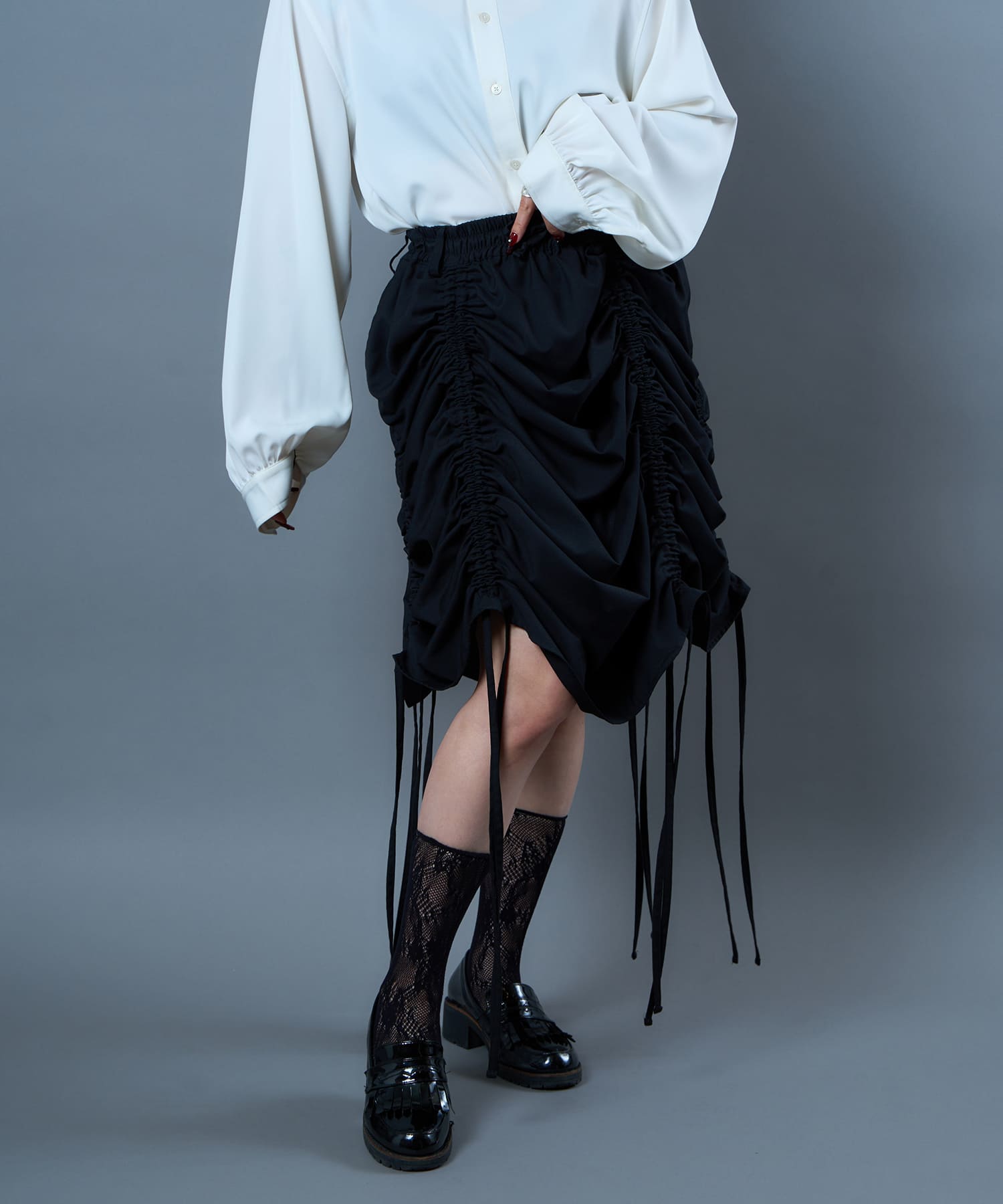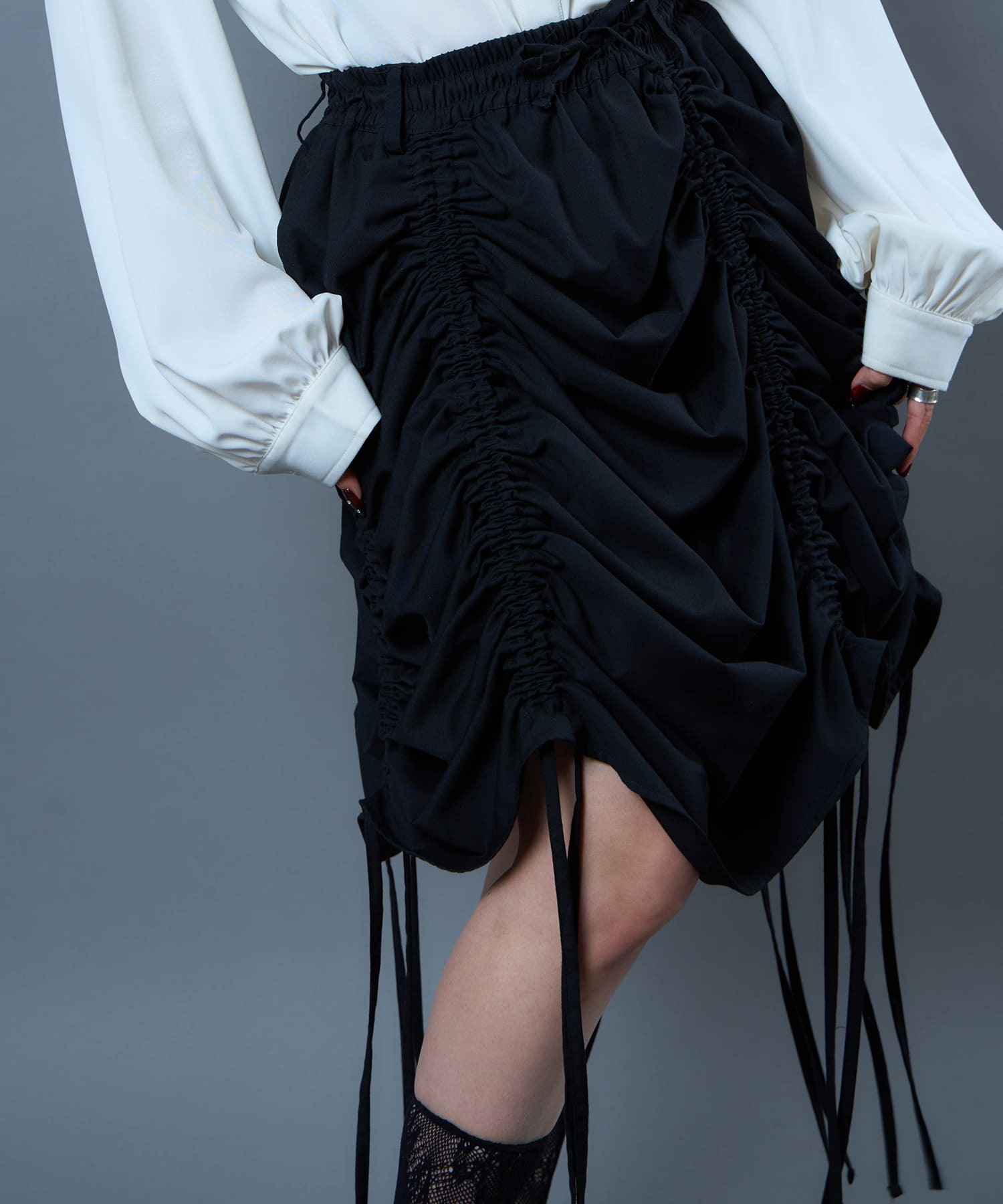 紐を結んだ時のドレープが生地との相性が良くモードな印象に。単体でも使用でき、パンツとのレイヤードもおススメです。