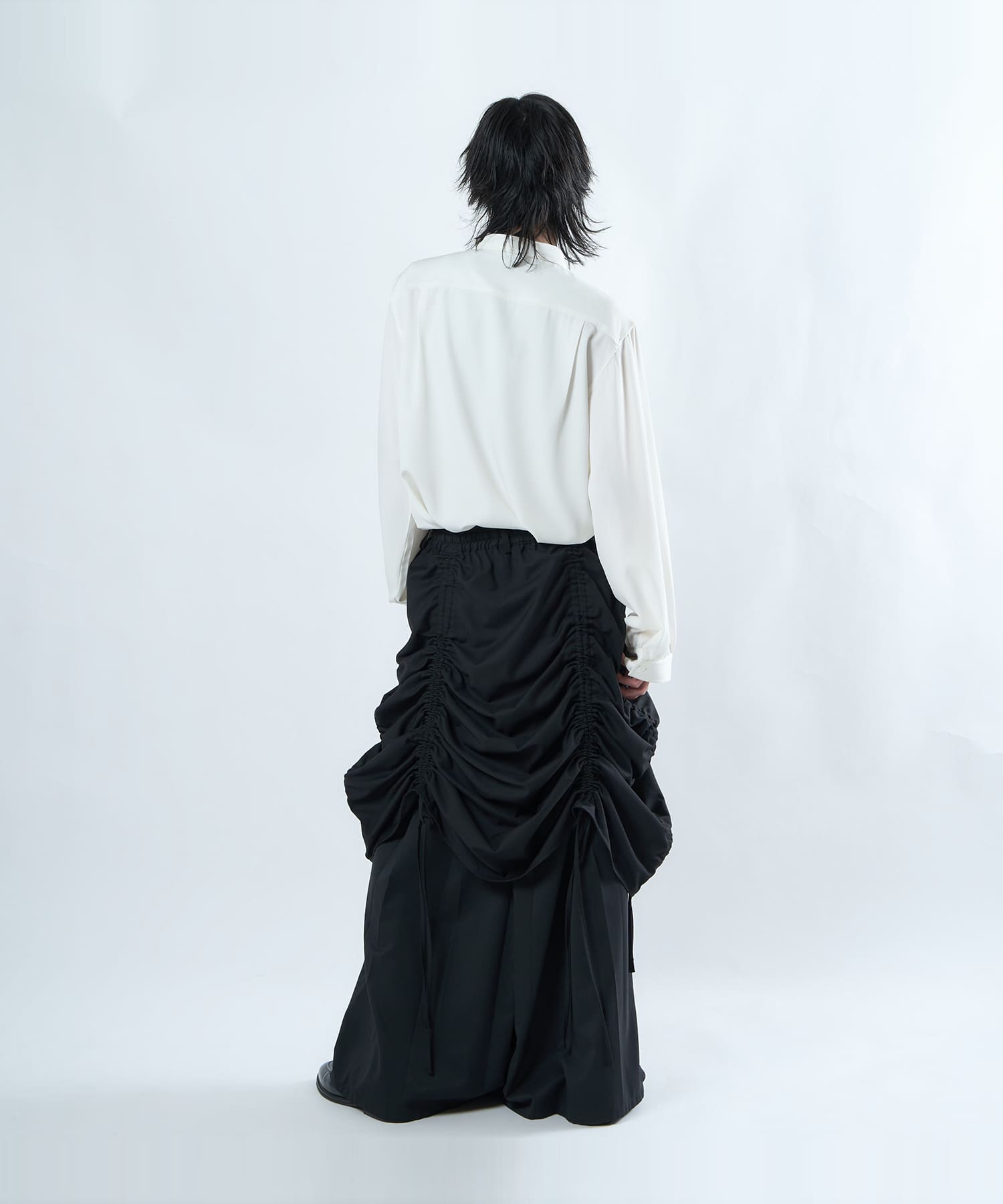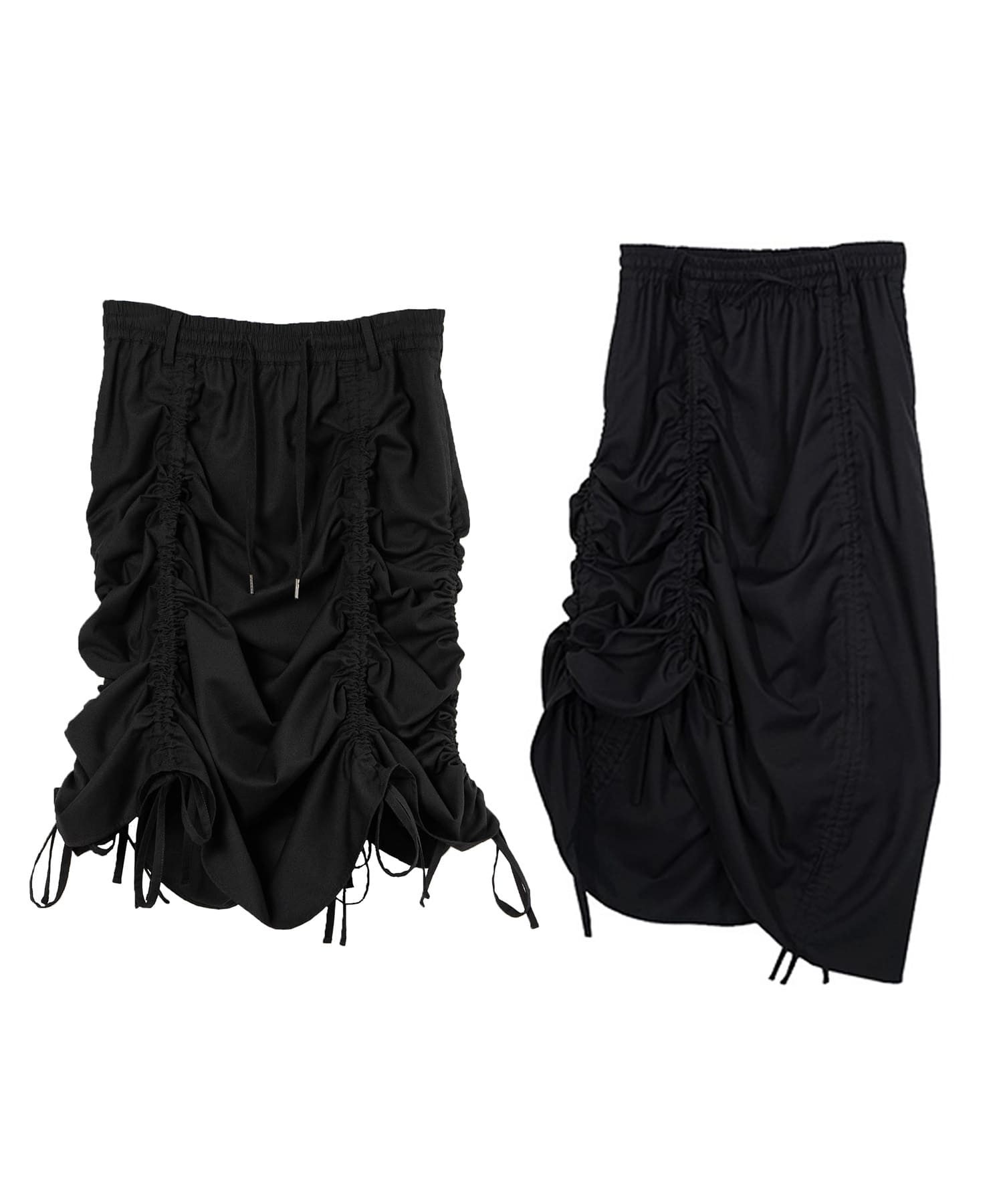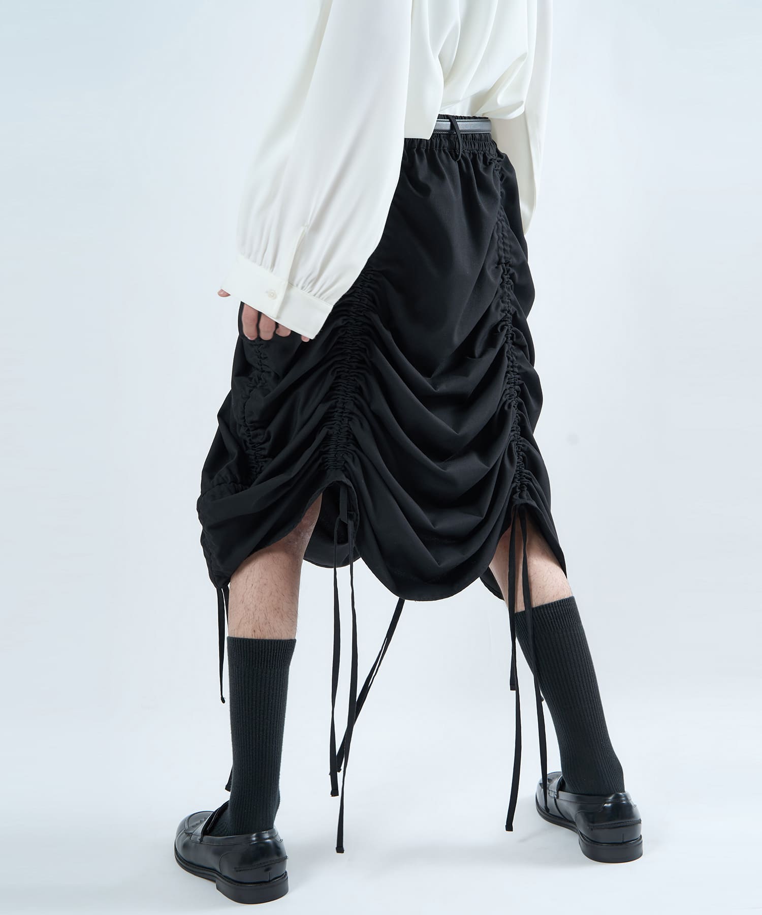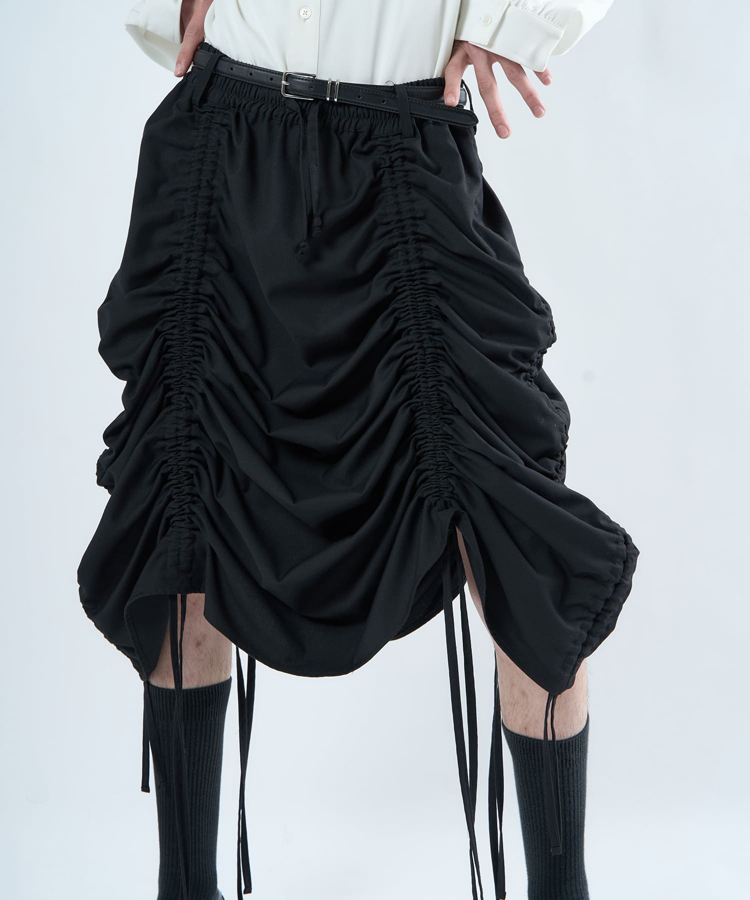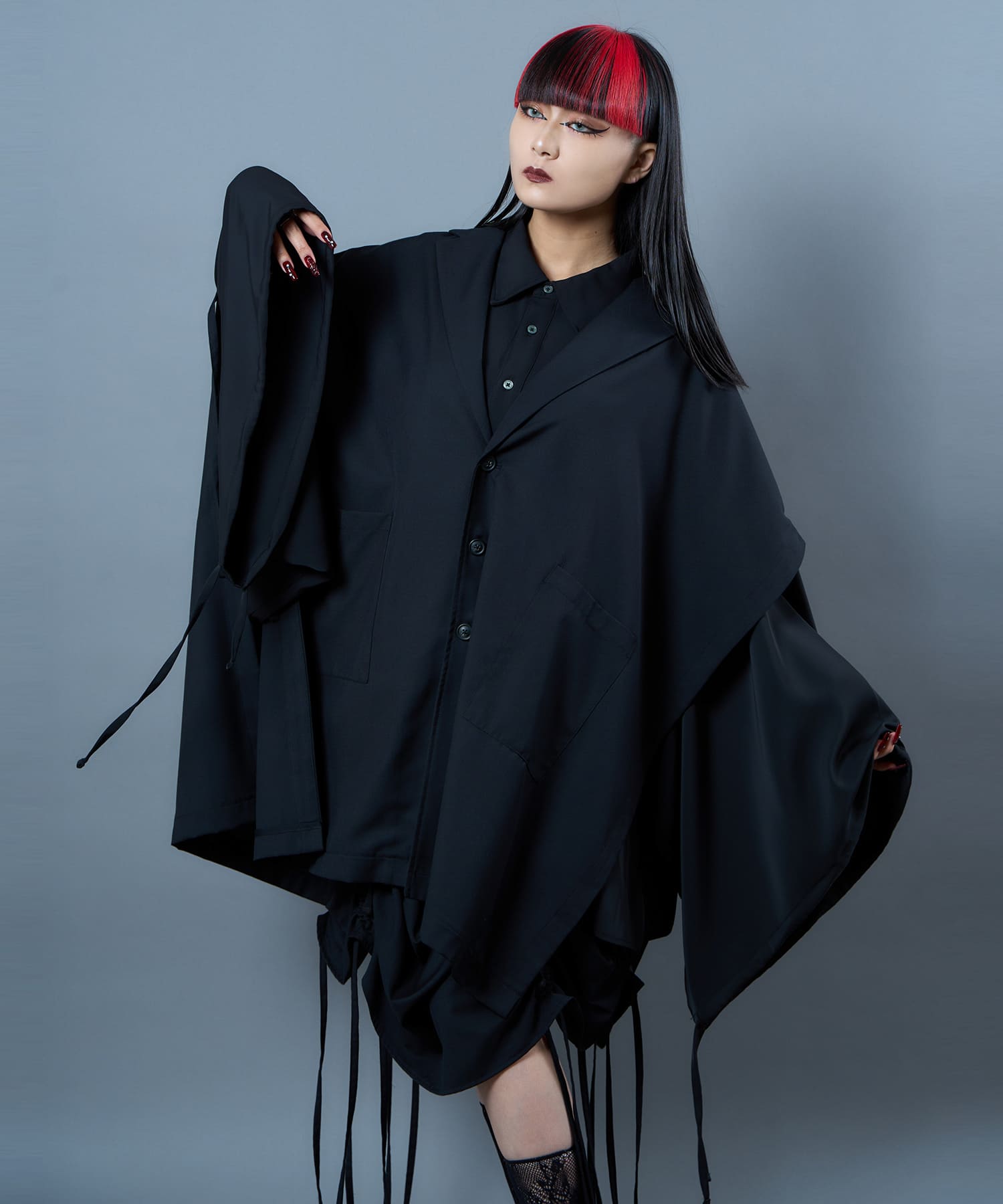 紐を結んだ時のドレープが生地との相性が良くモードな印象に。単体でも使用でき、パンツとのレイヤードもおススメです。