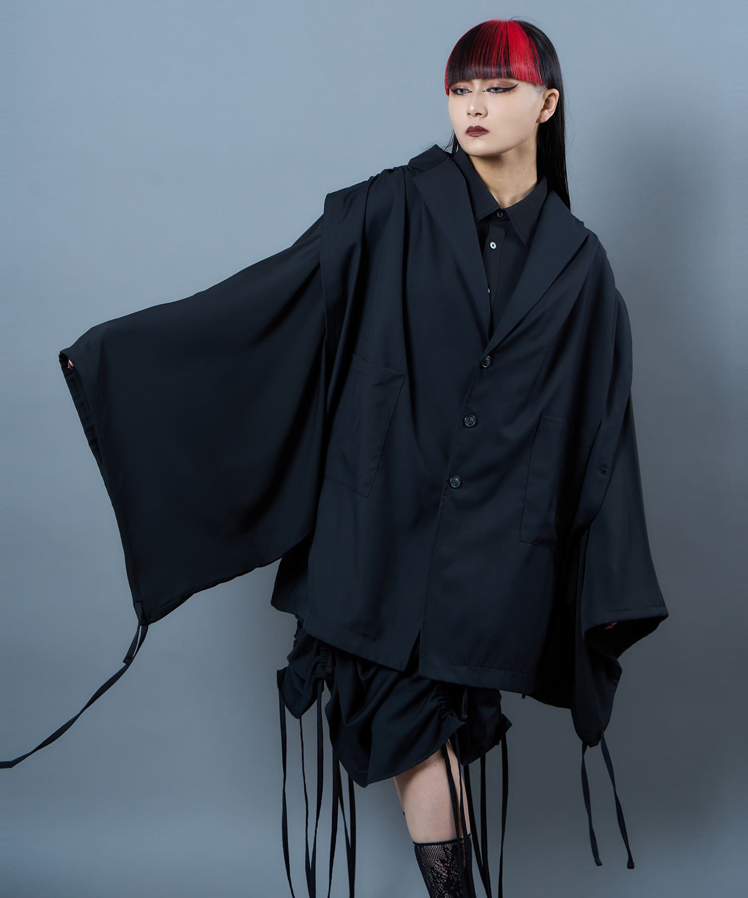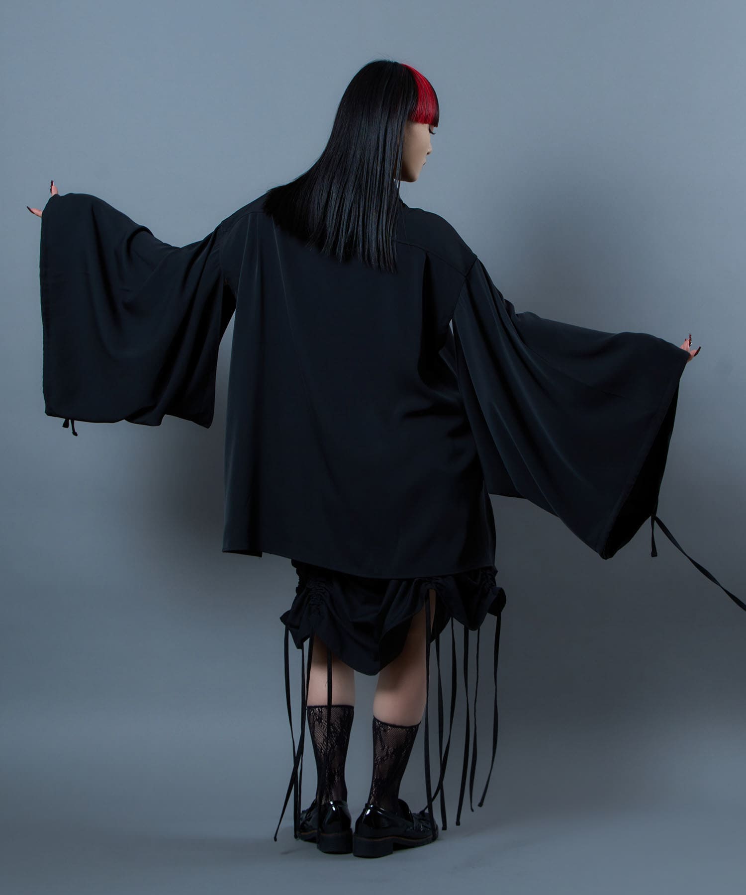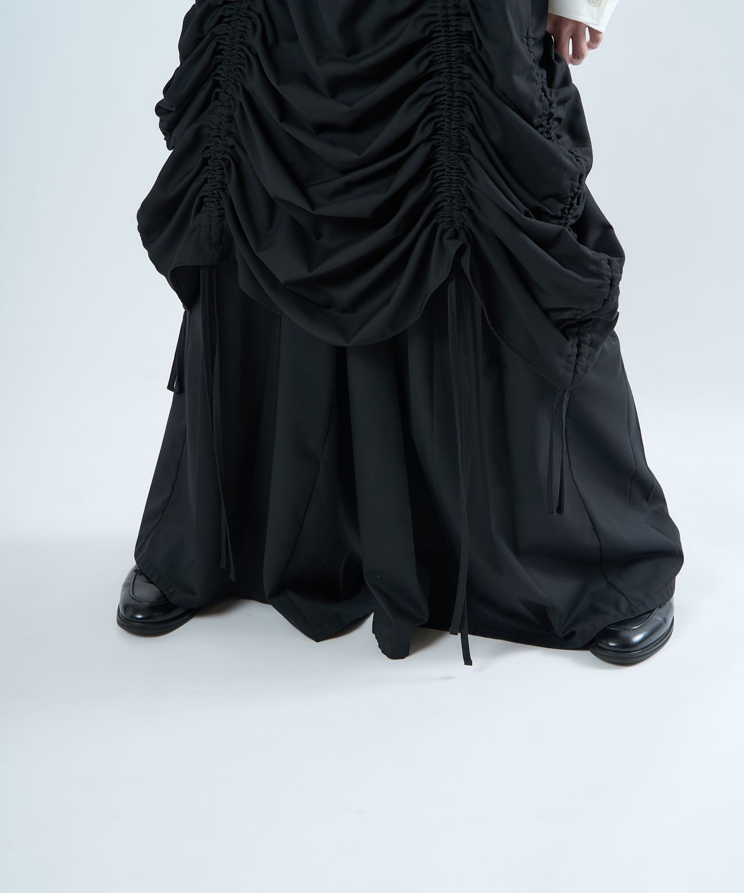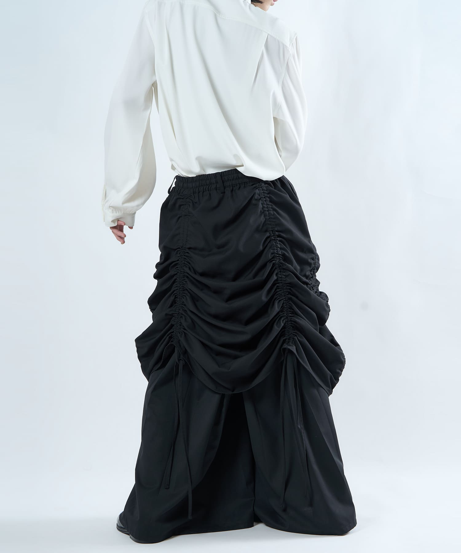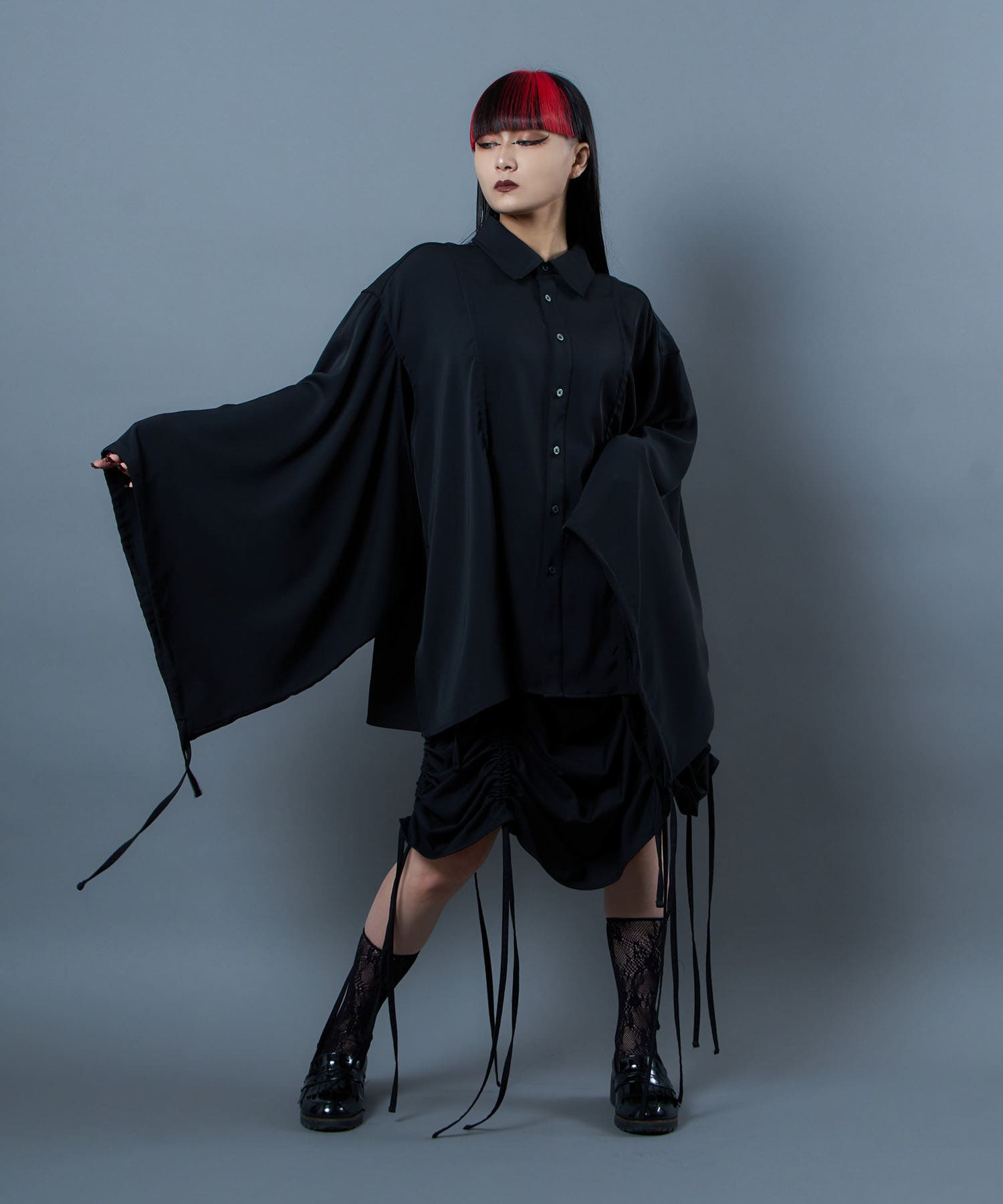 紐を結んだ時のドレープが生地との相性が良くモードな印象に。単体でも使用でき、パンツとのレイヤードもおススメです。