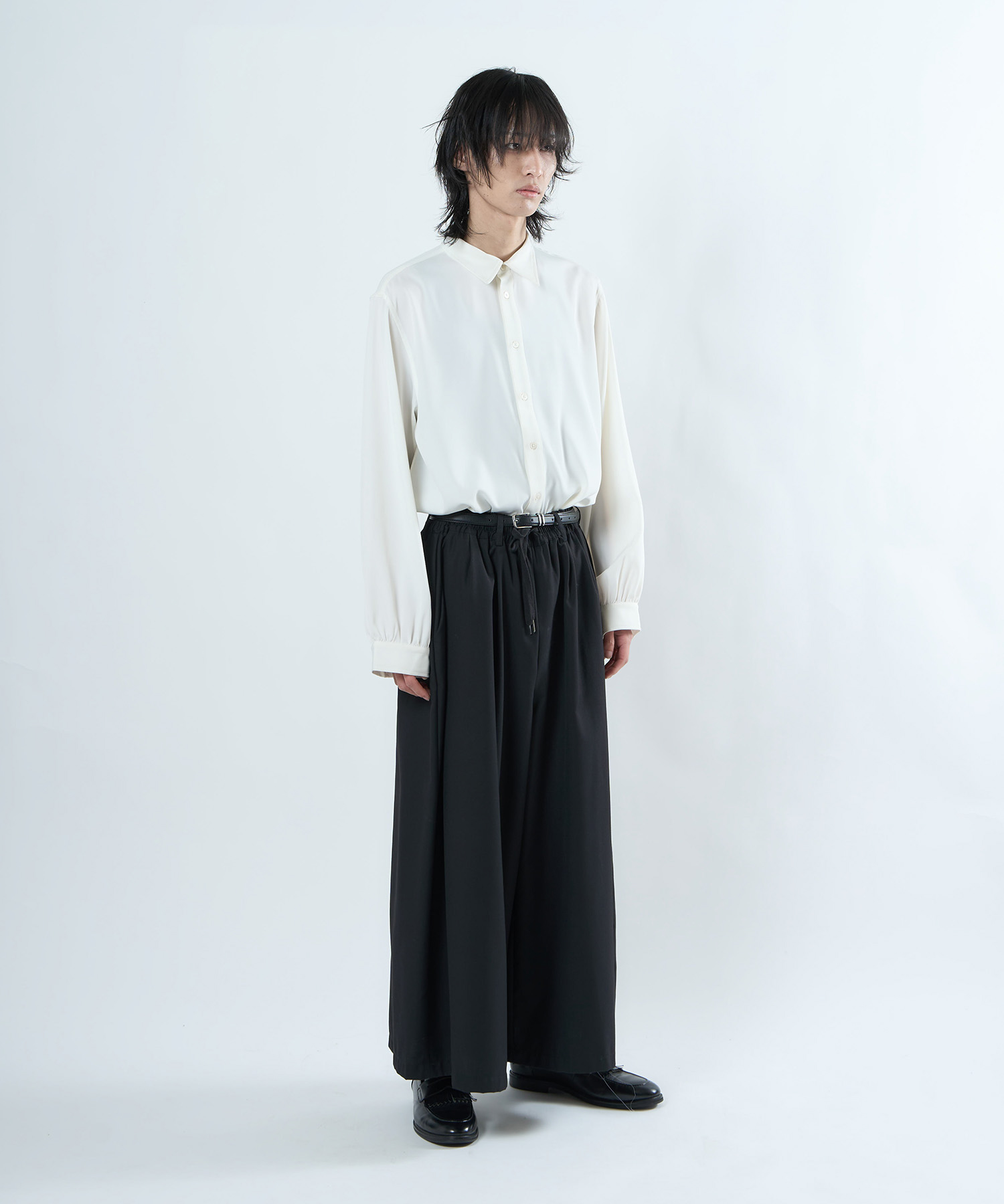 Inspired by the traditional Japanese Hakama, these pants fuse “mode” fashion with a more casual everyday style.Crafted from fine-count yarn, the fabric has a distinctive luster and soft drape.Pair them with our kimono shirt to enjoy a modern take on traditional Japanese fashion that fits seamlessly into daily wear.