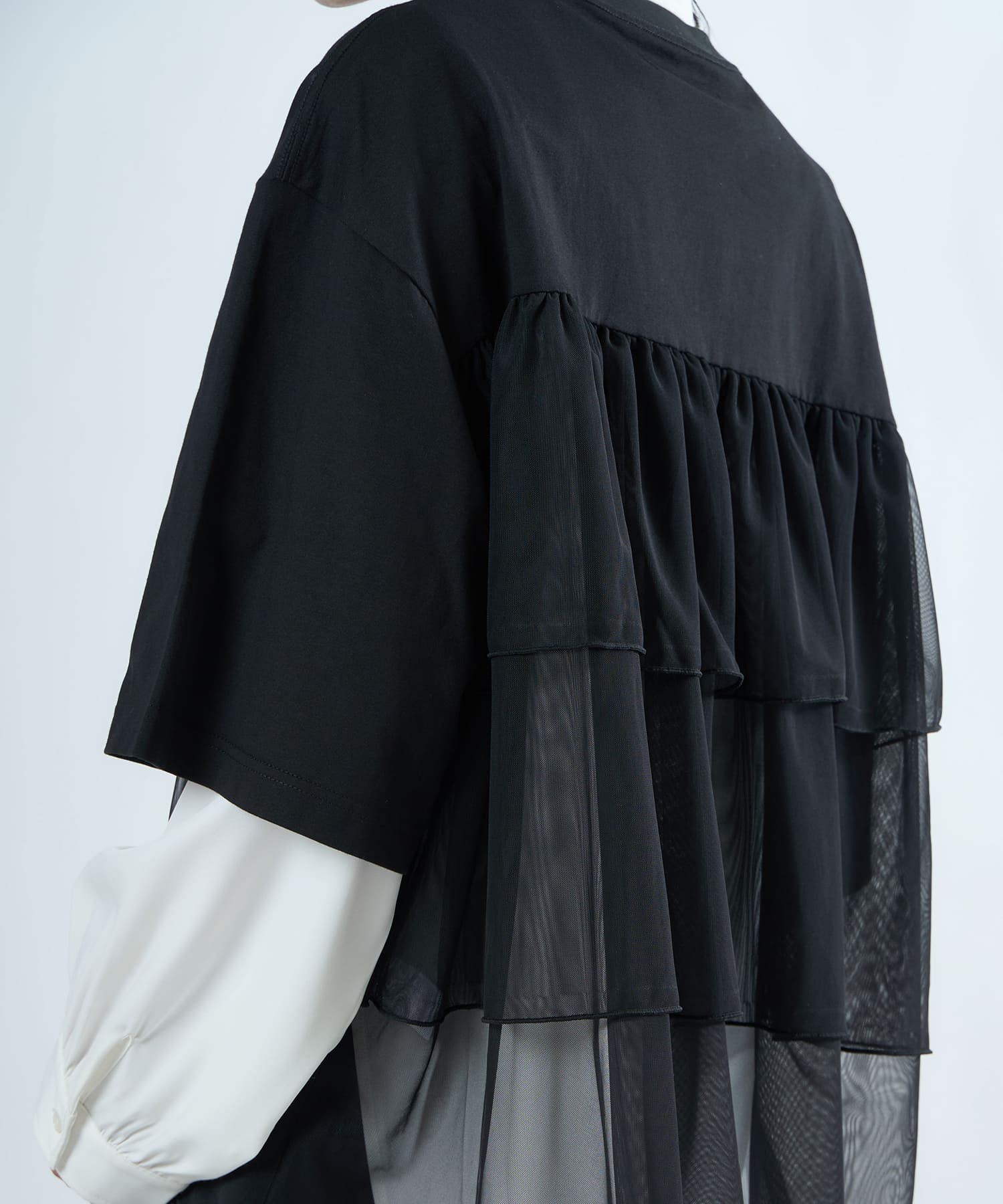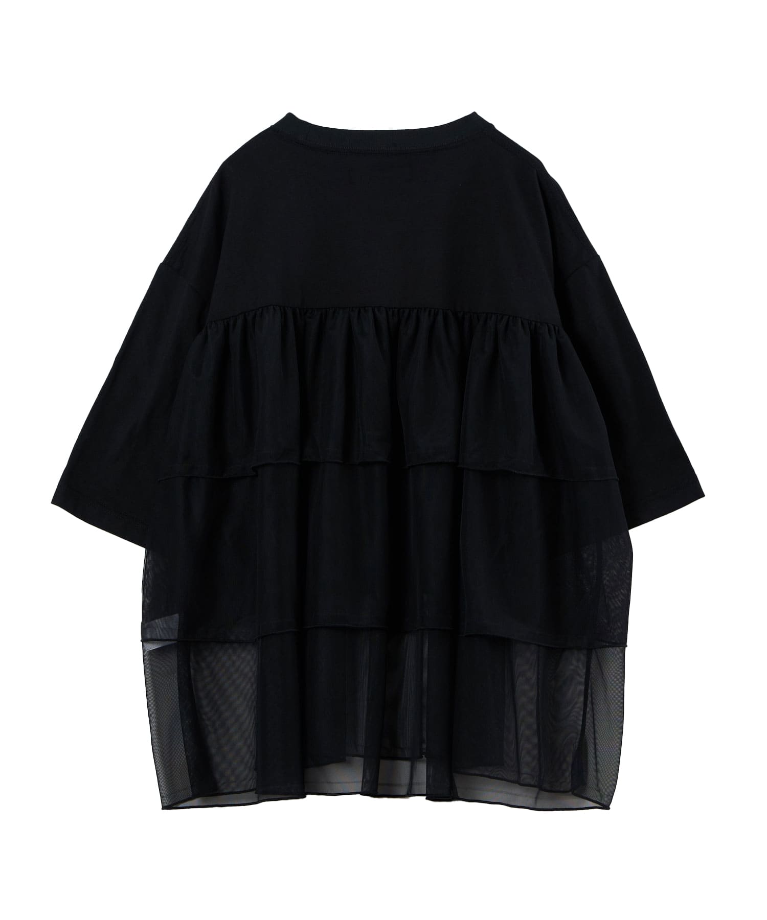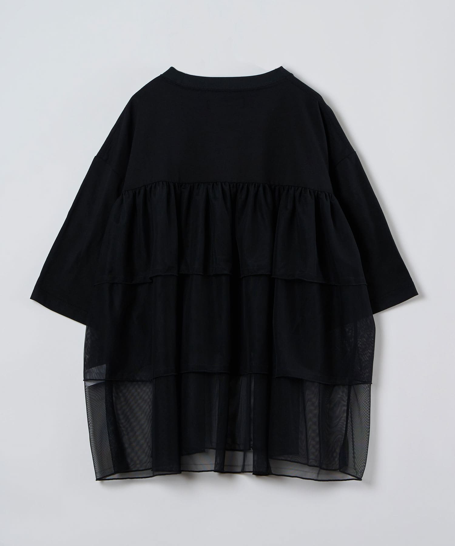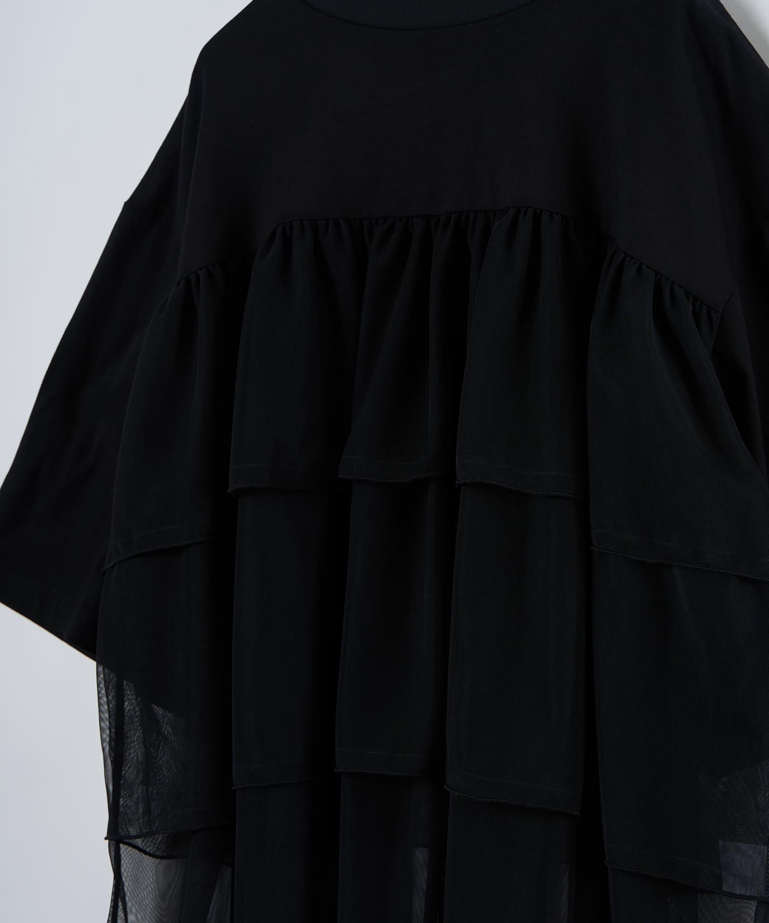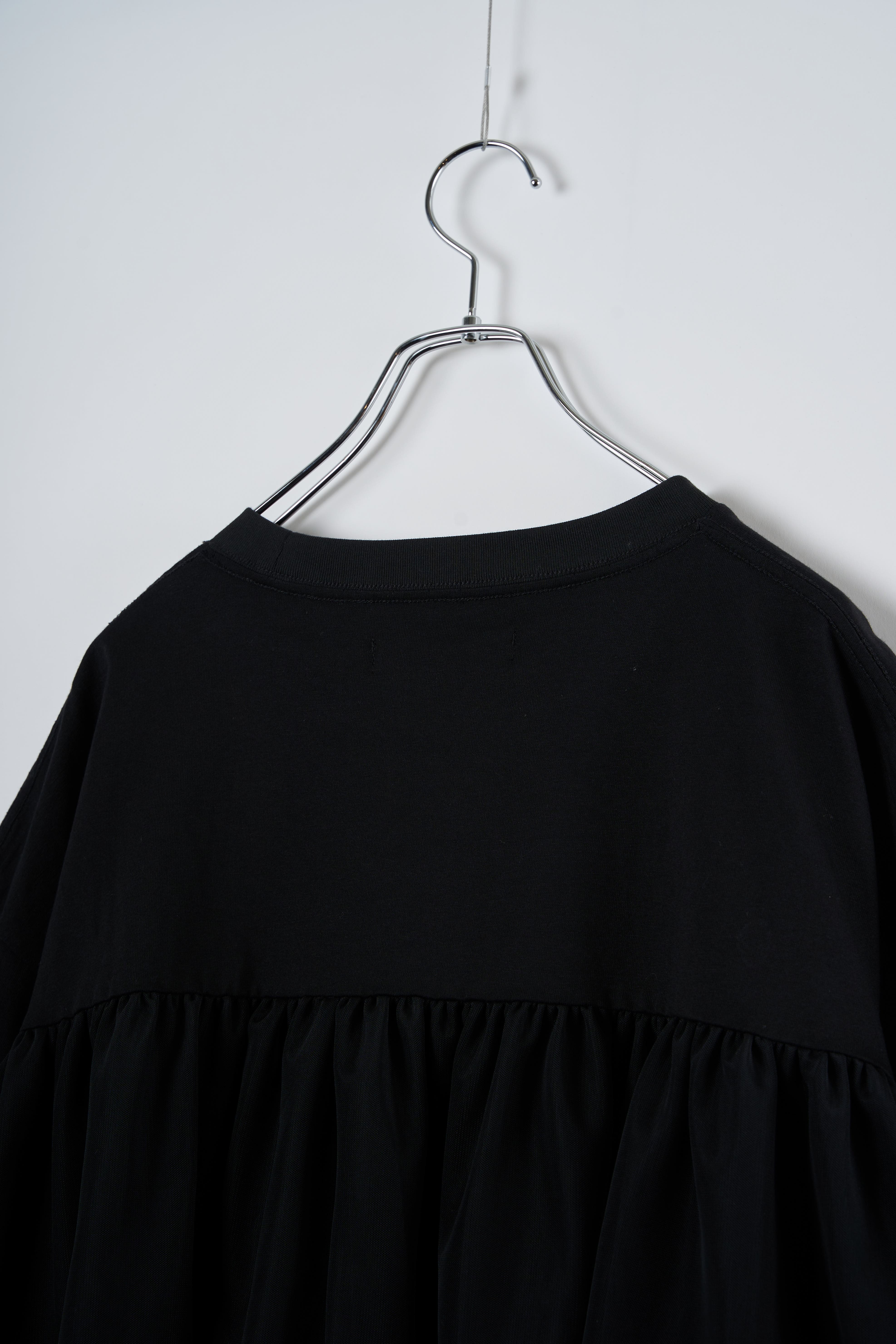 This tulle design tee combines comfortable cotton and soft tulle material, with the tulle starting around the bust and tiered to create volume and glamour. The tulle part is sheer, but it is loose-fitting. It can be worn layered with an inner layer.