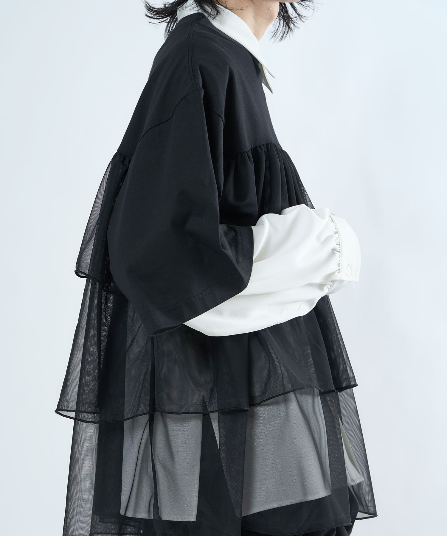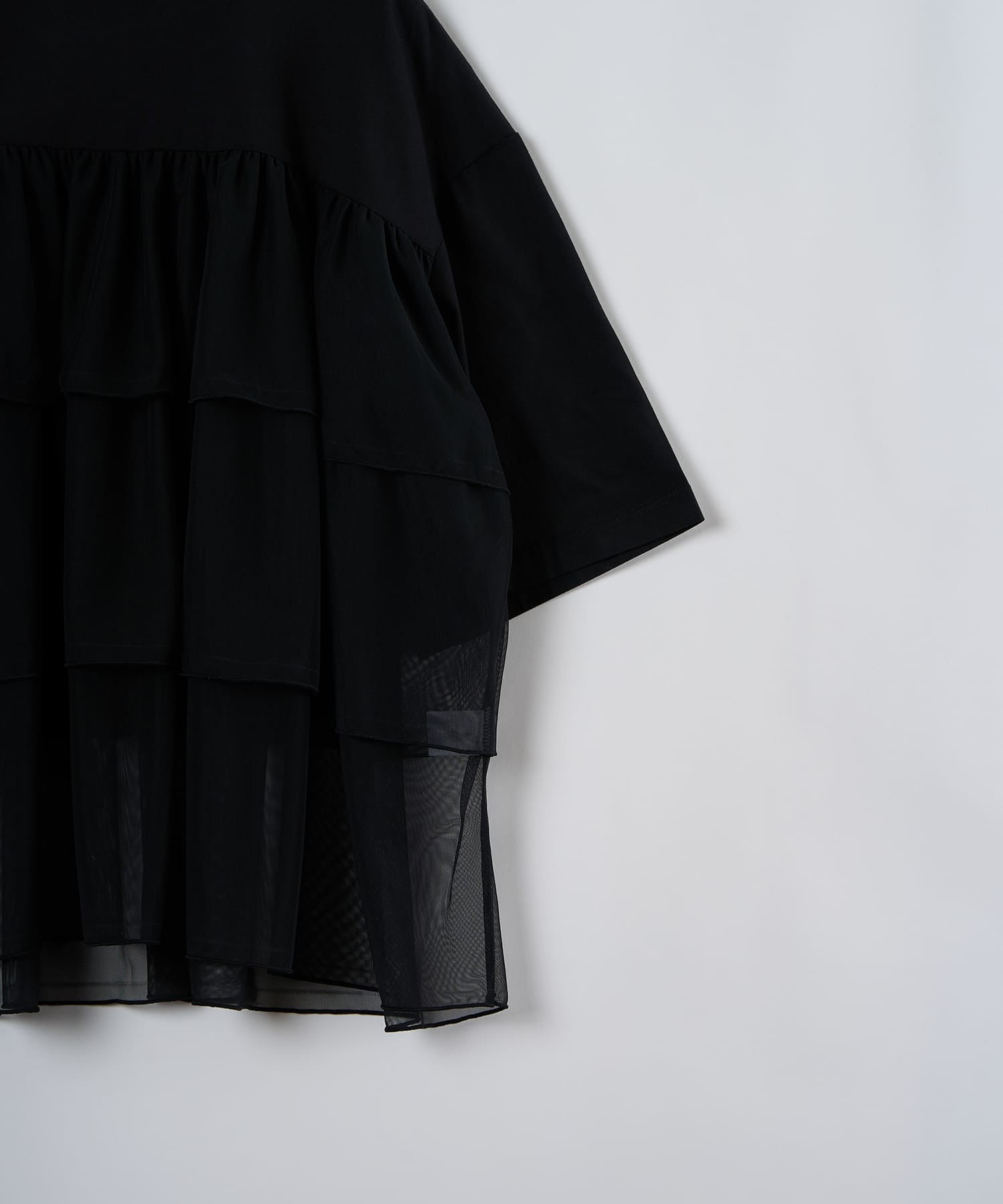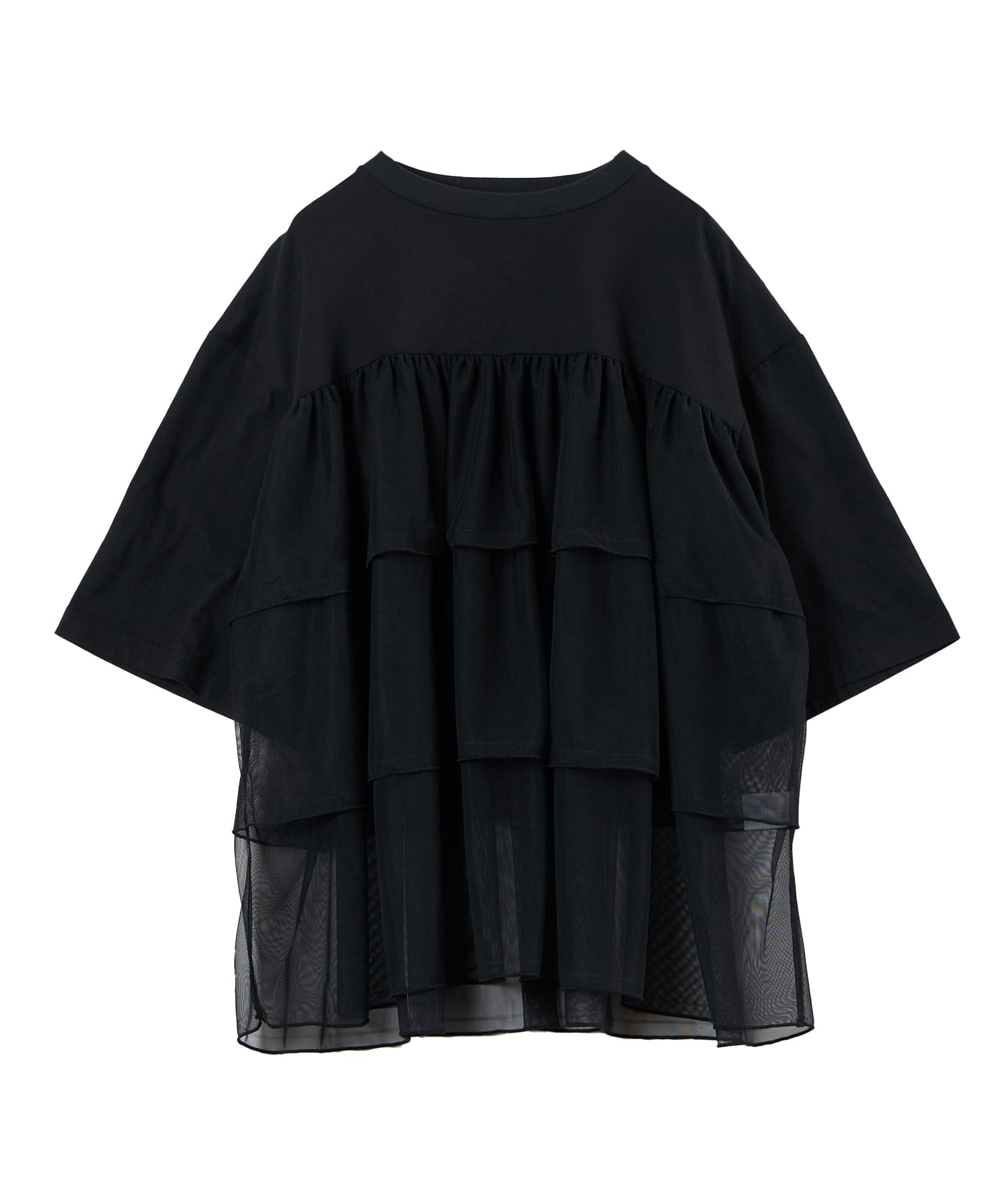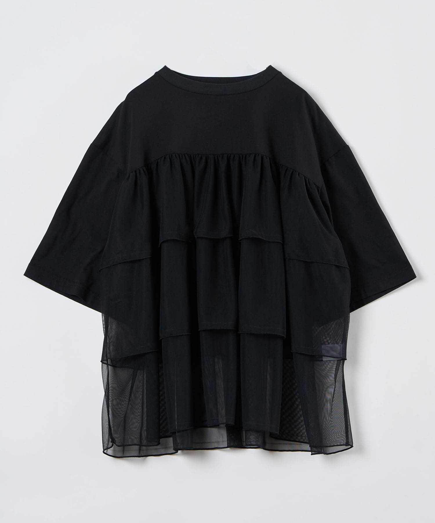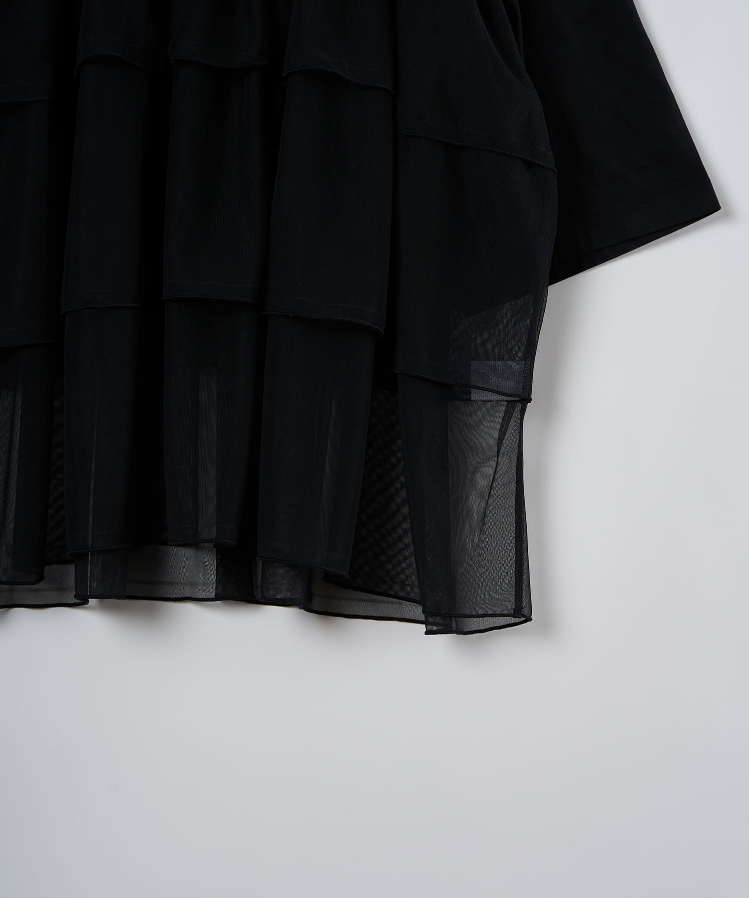 This tulle design tee combines comfortable cotton and soft tulle material, with the tulle starting around the bust and tiered to create volume and glamour. The tulle part is sheer, but it is loose-fitting. It can be worn layered with an inner layer.