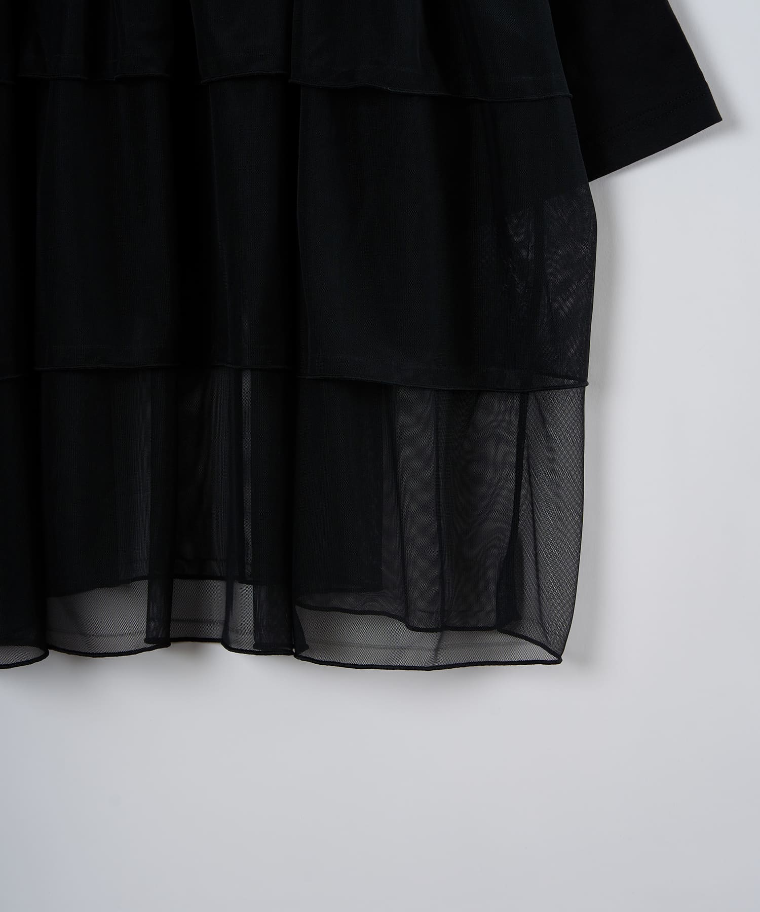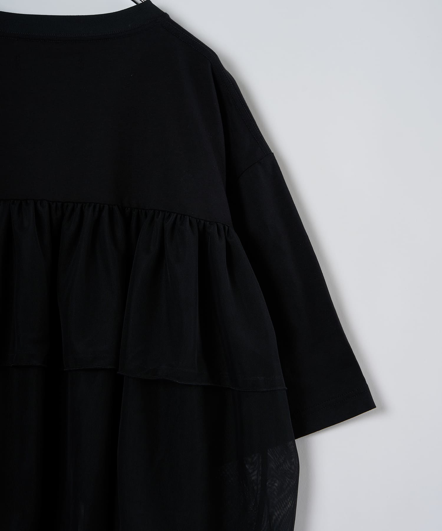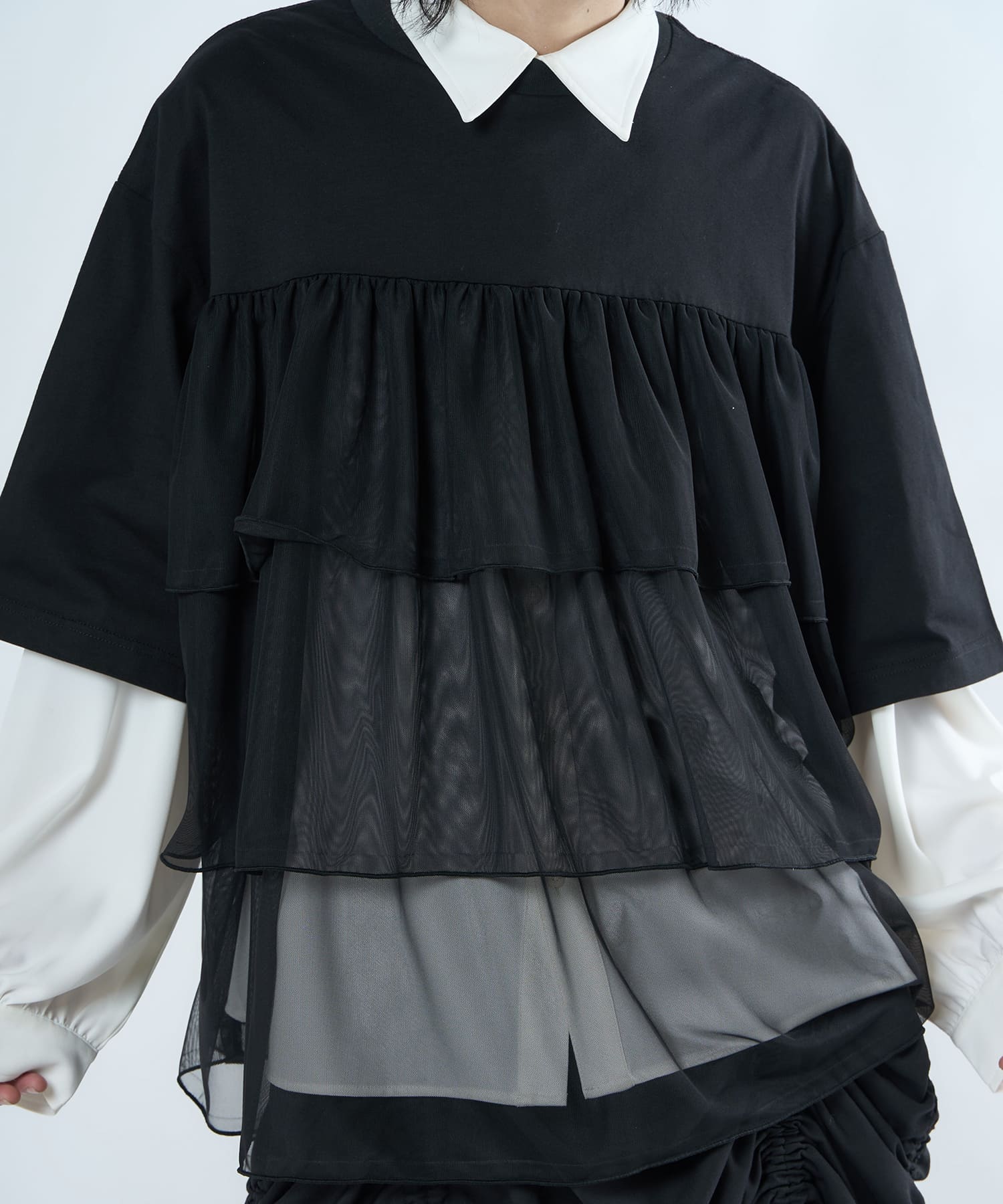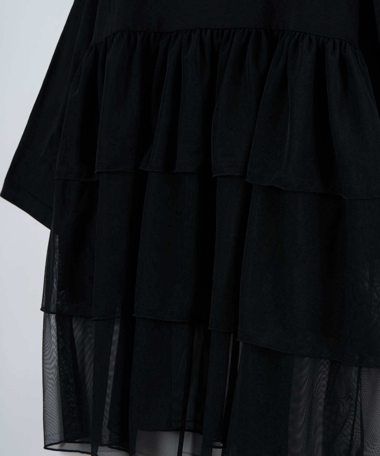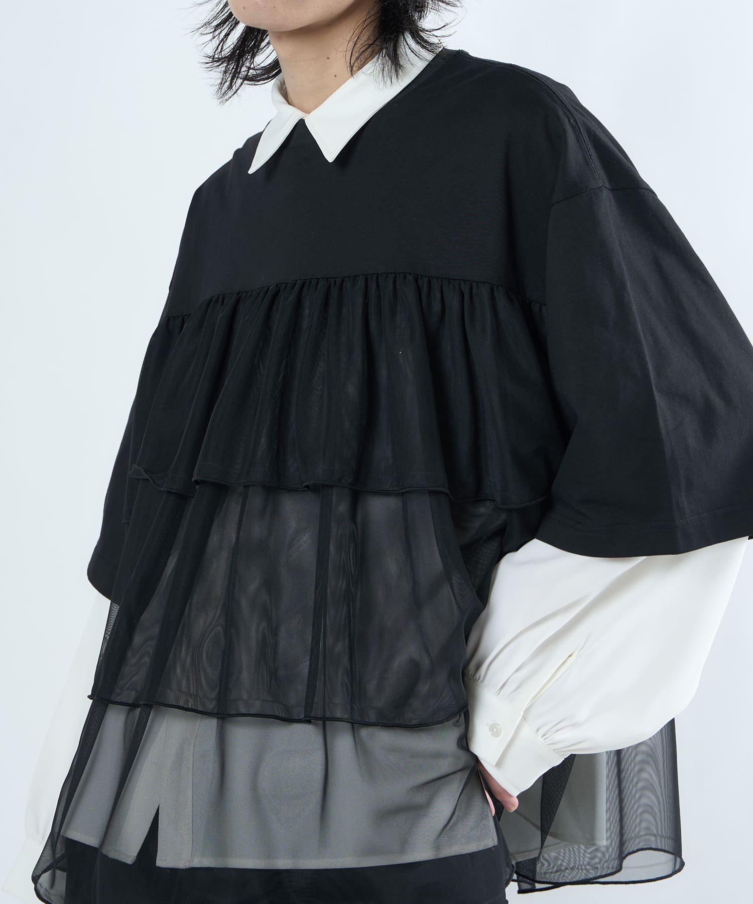 This tulle design tee combines comfortable cotton and soft tulle material, with the tulle starting around the bust and tiered to create volume and glamour. The tulle part is sheer, but it is loose-fitting. It can be worn layered with an inner layer.