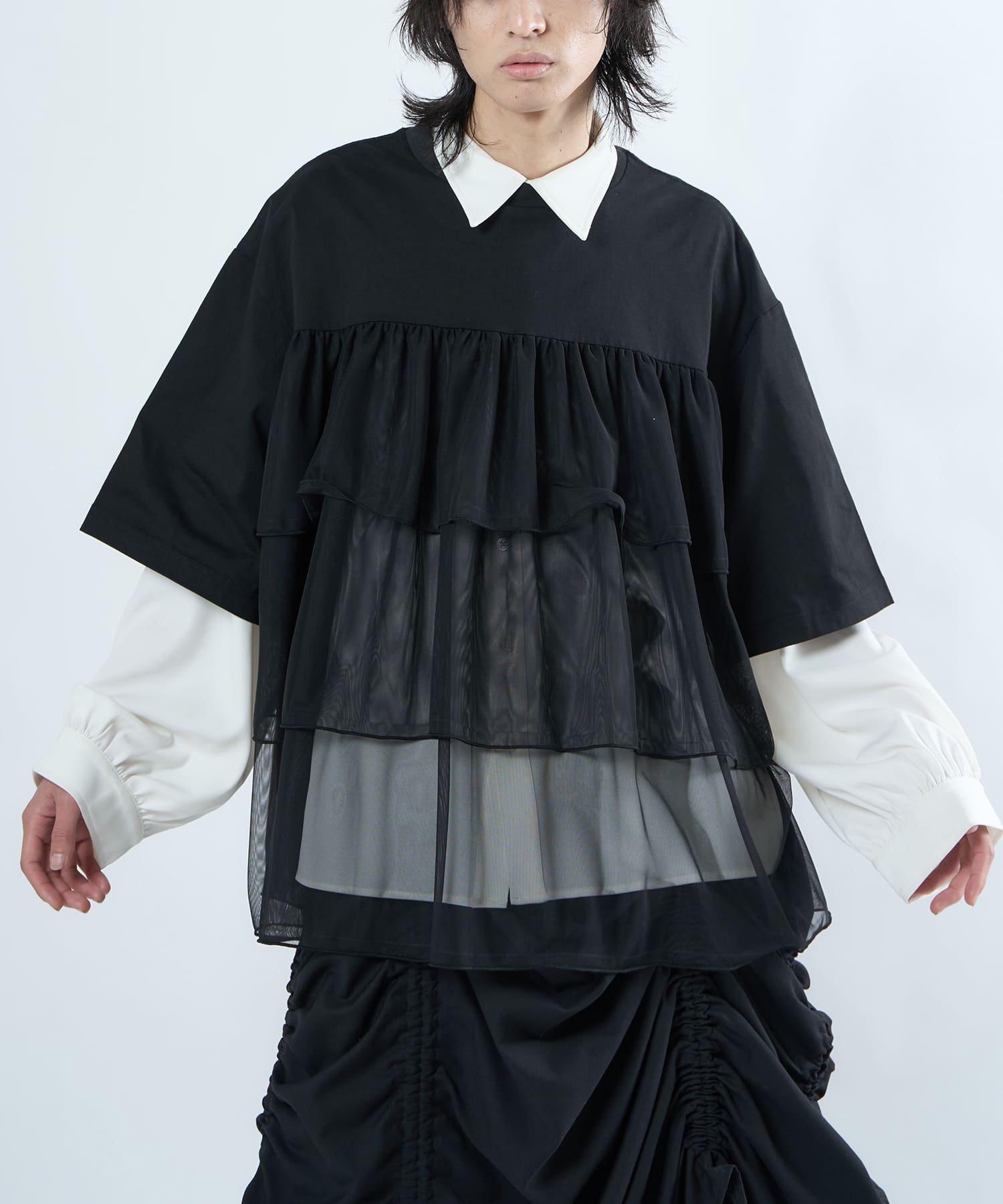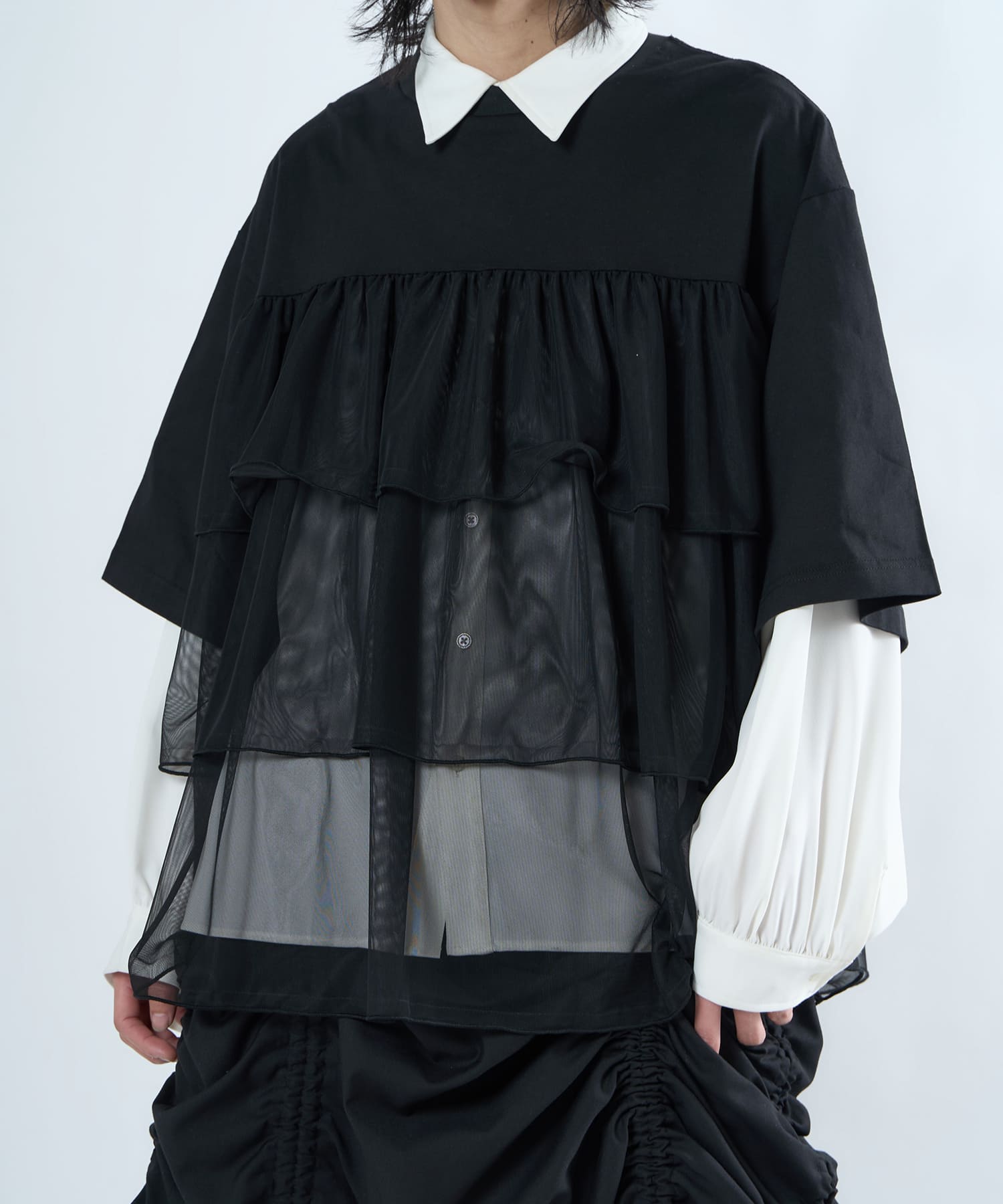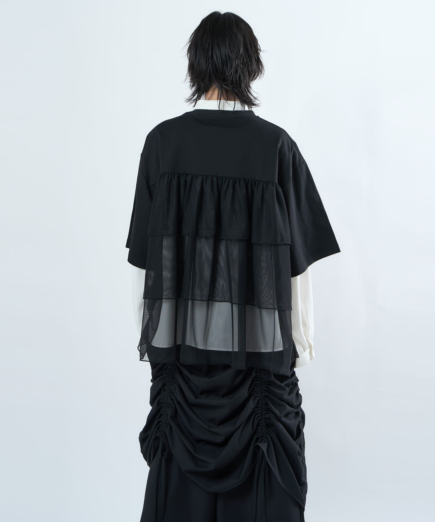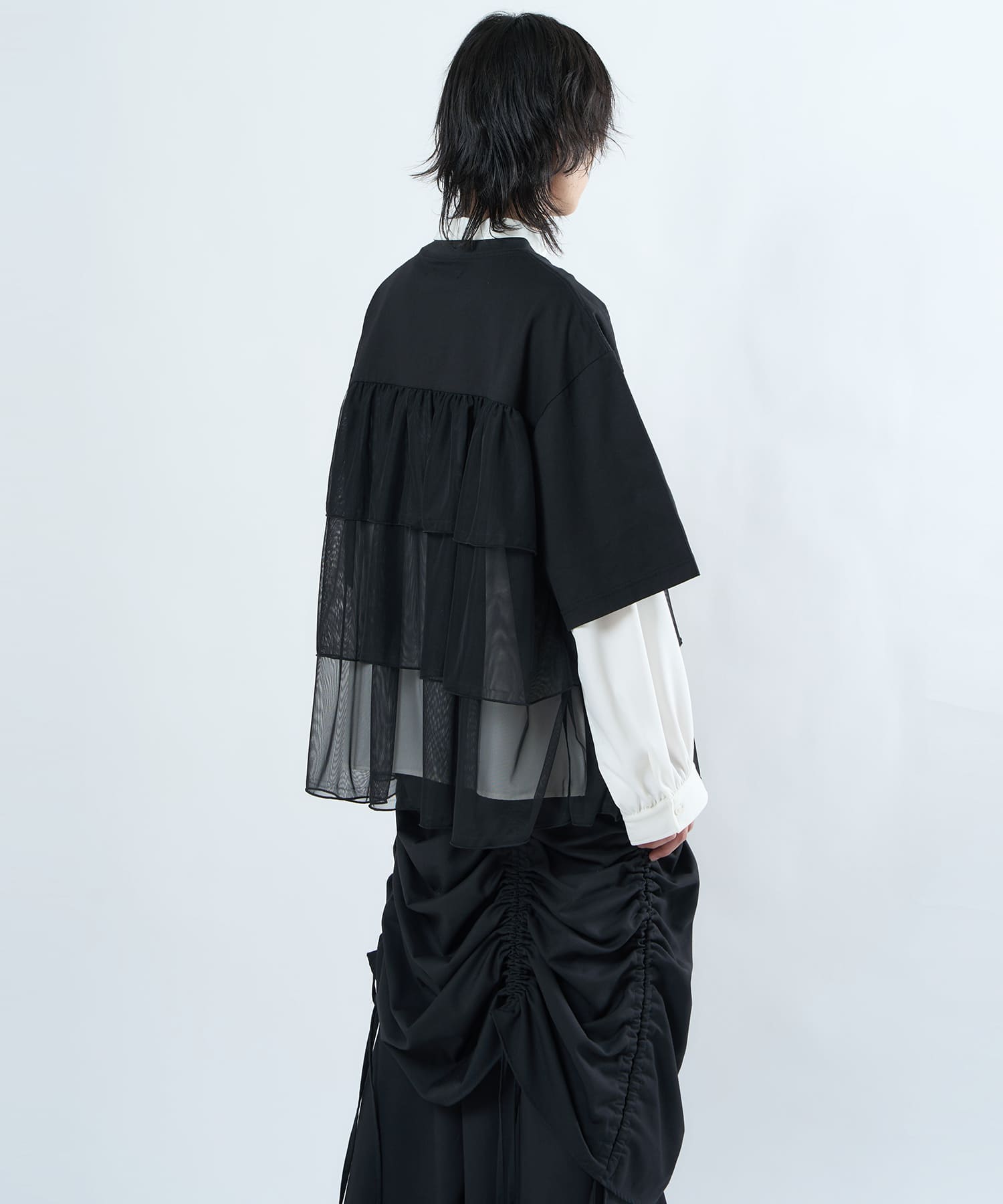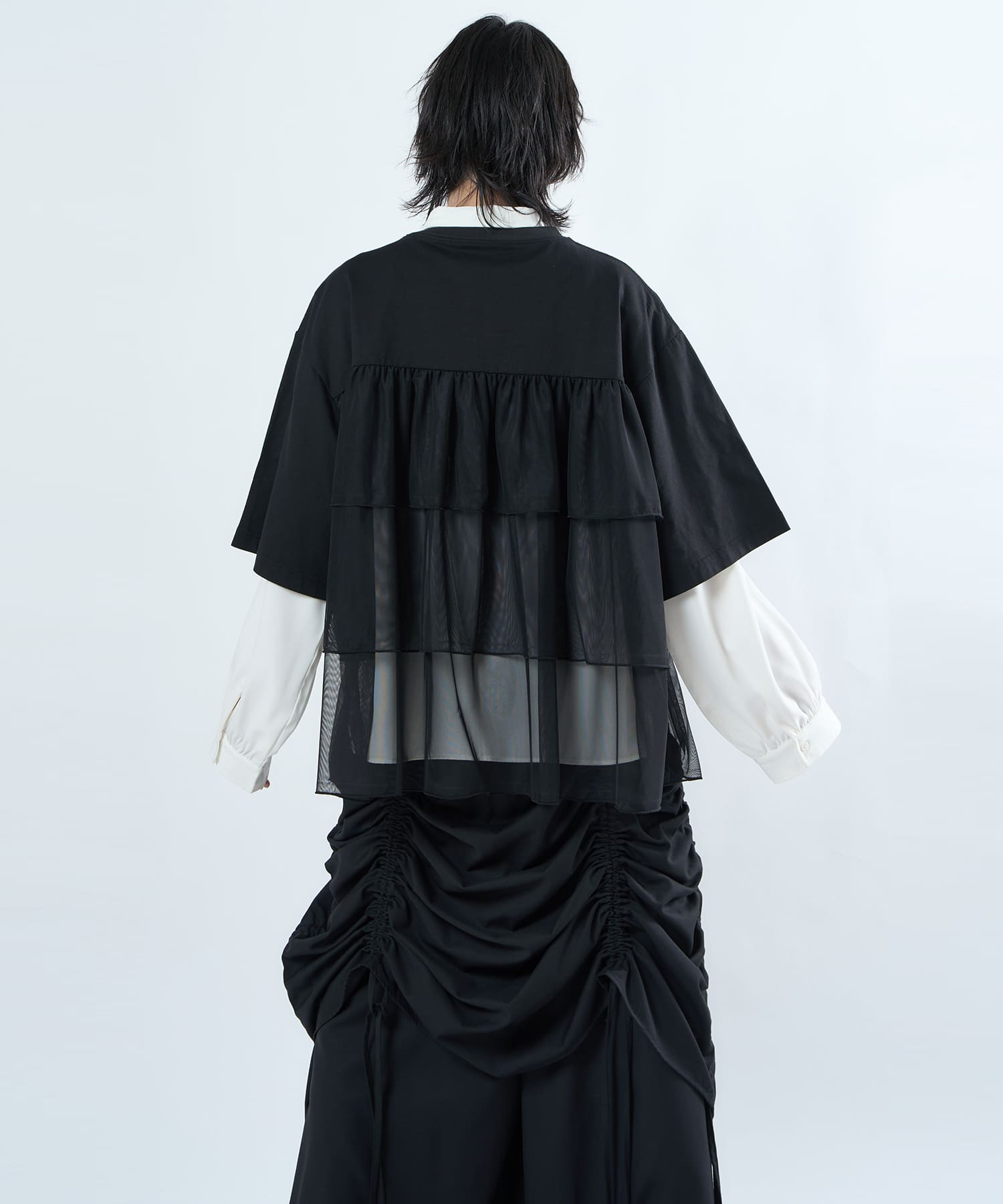 This tulle design tee combines comfortable cotton and soft tulle material, with the tulle starting around the bust and tiered to create volume and glamour. The tulle part is sheer, but it is loose-fitting. It can be worn layered with an inner layer.