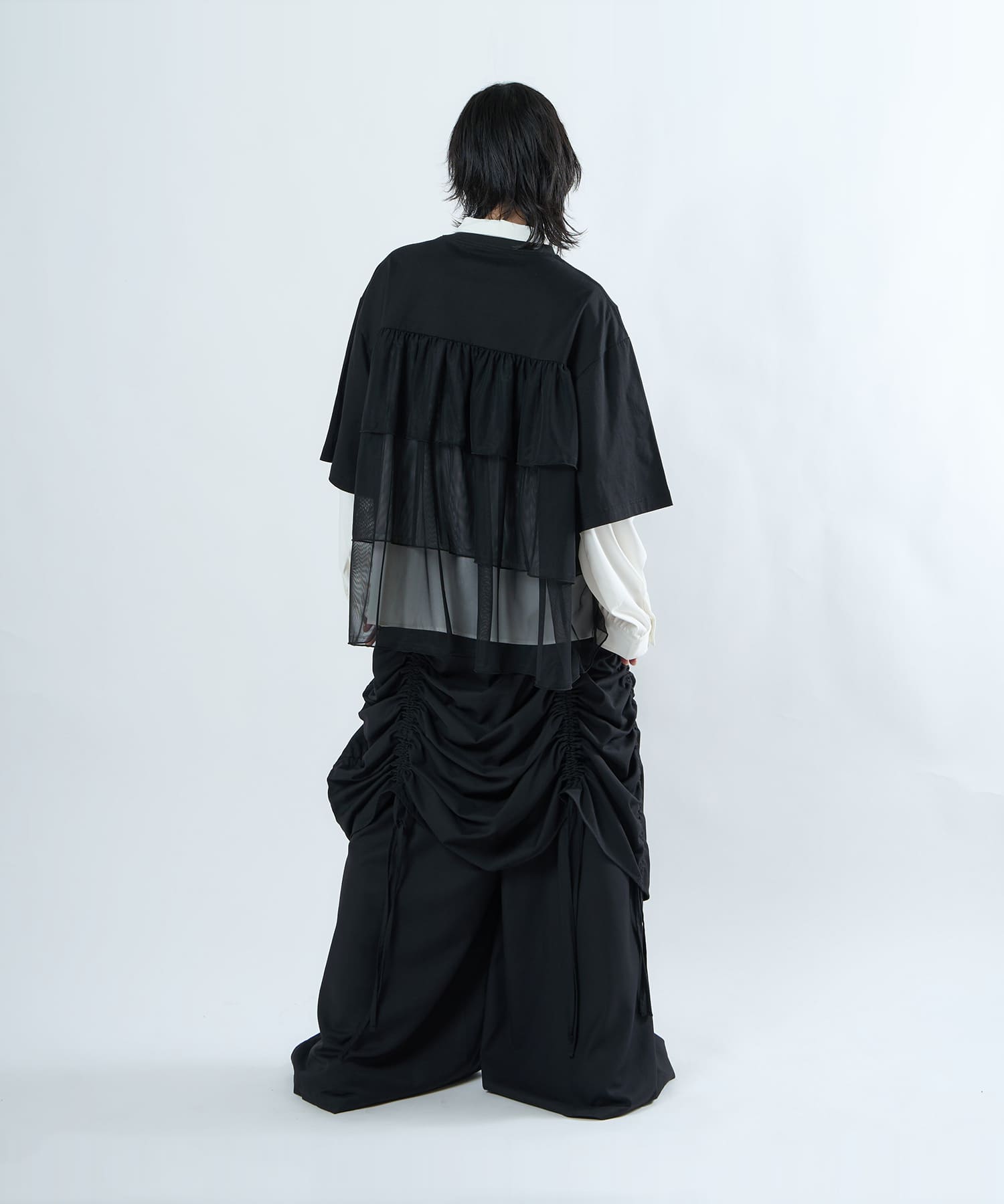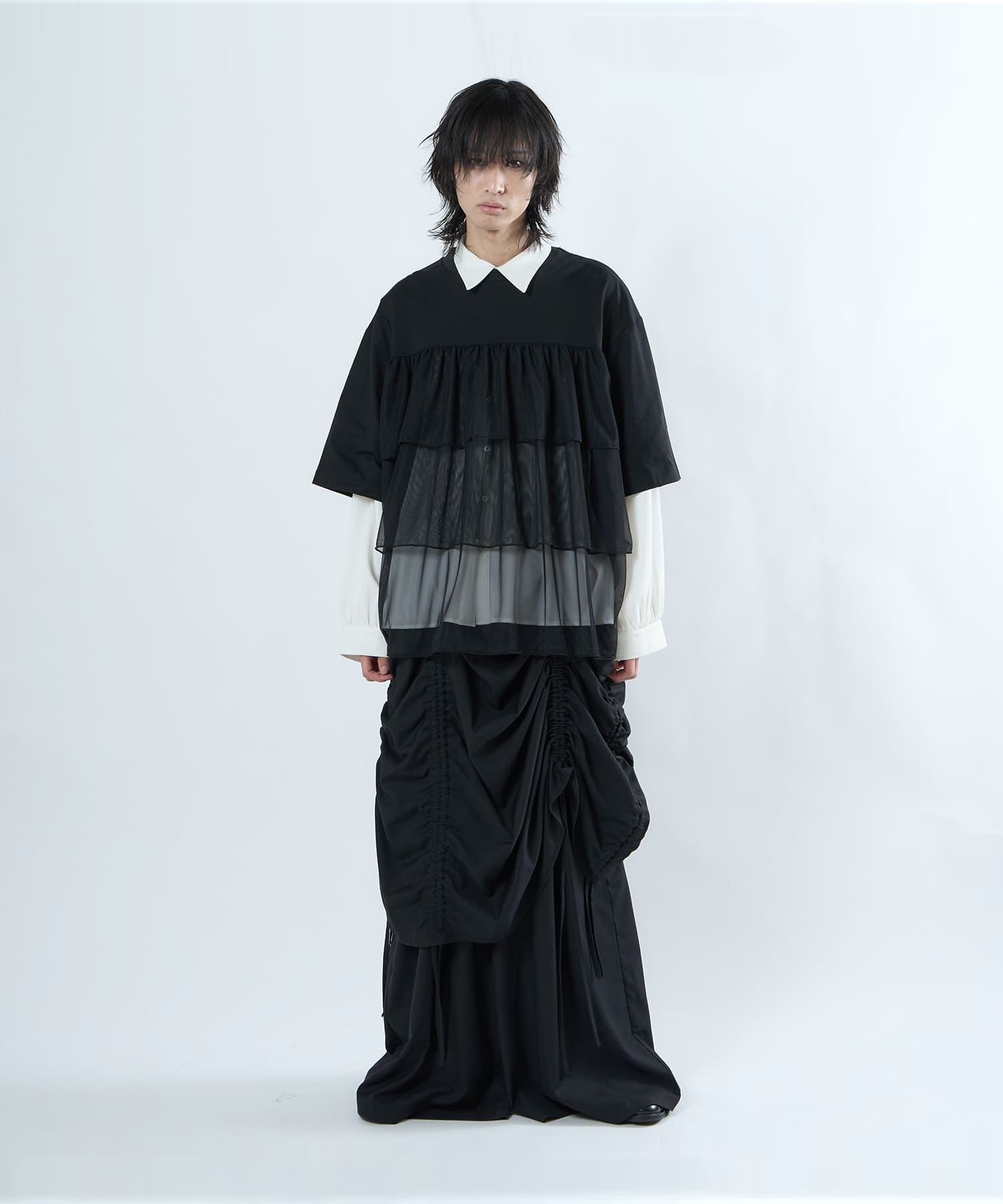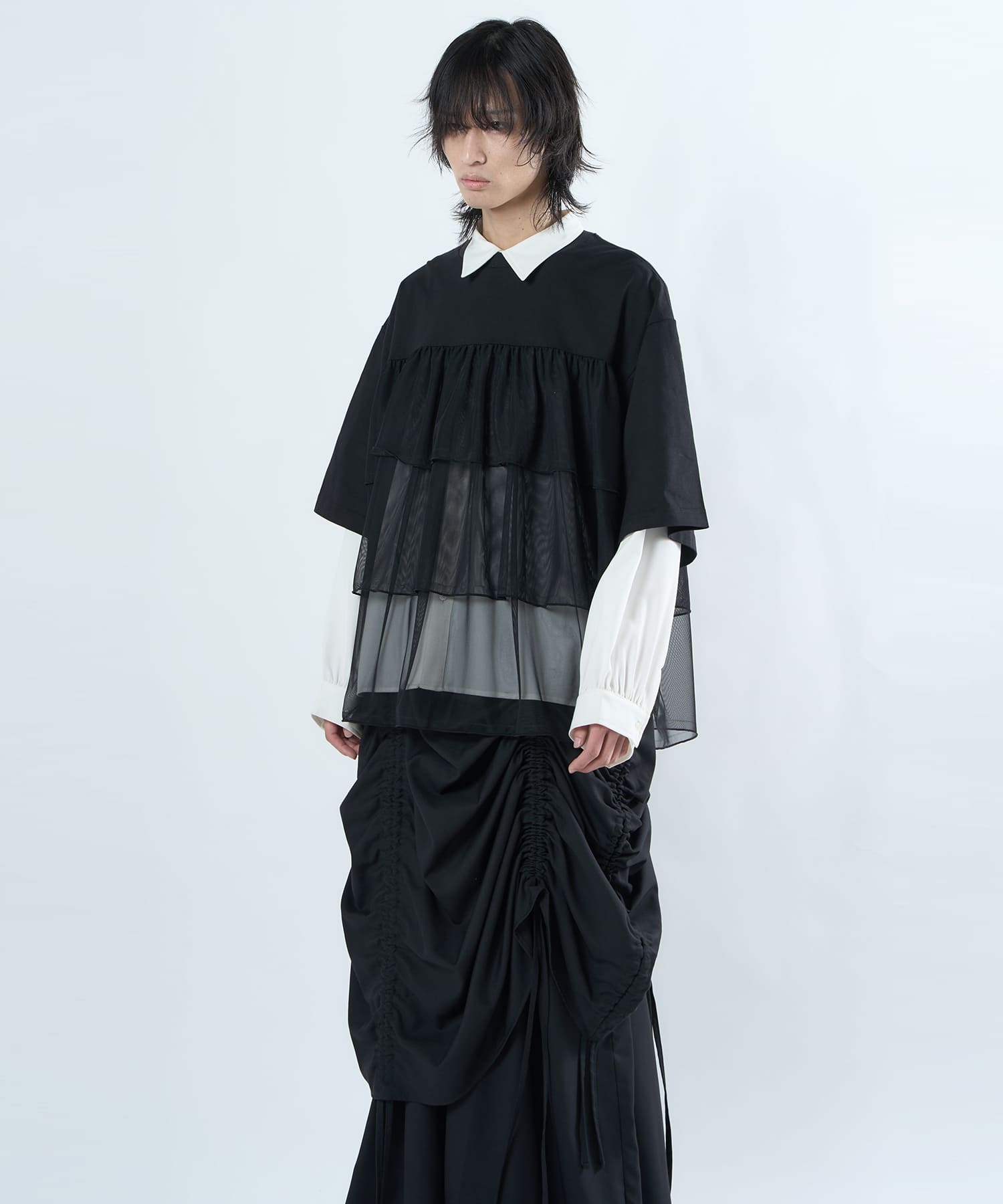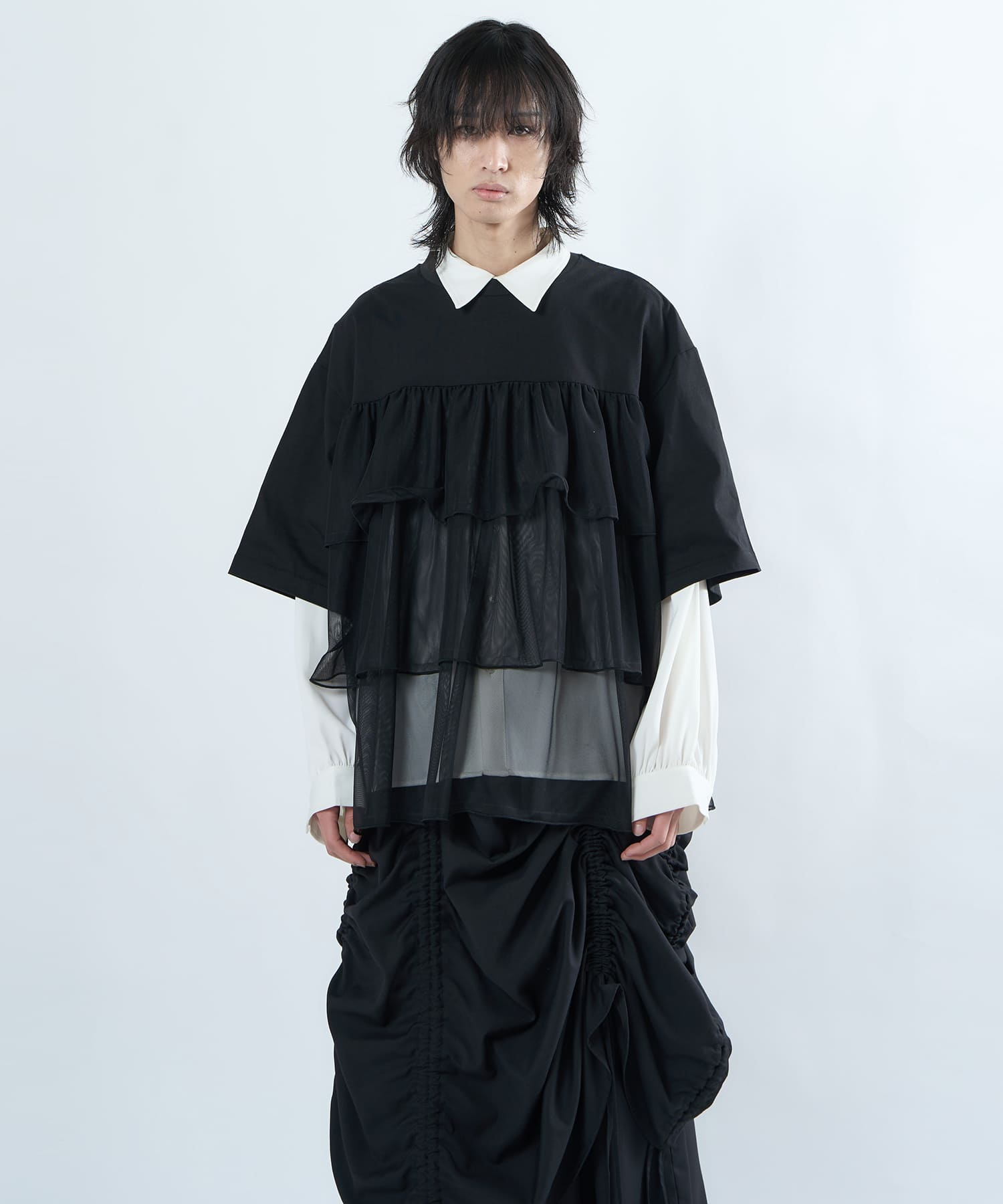 This tulle design tee combines comfortable cotton and soft tulle material, with the tulle starting around the bust and tiered to create volume and glamour. The tulle part is sheer, but it is loose-fitting. It can be worn layered with an inner layer.