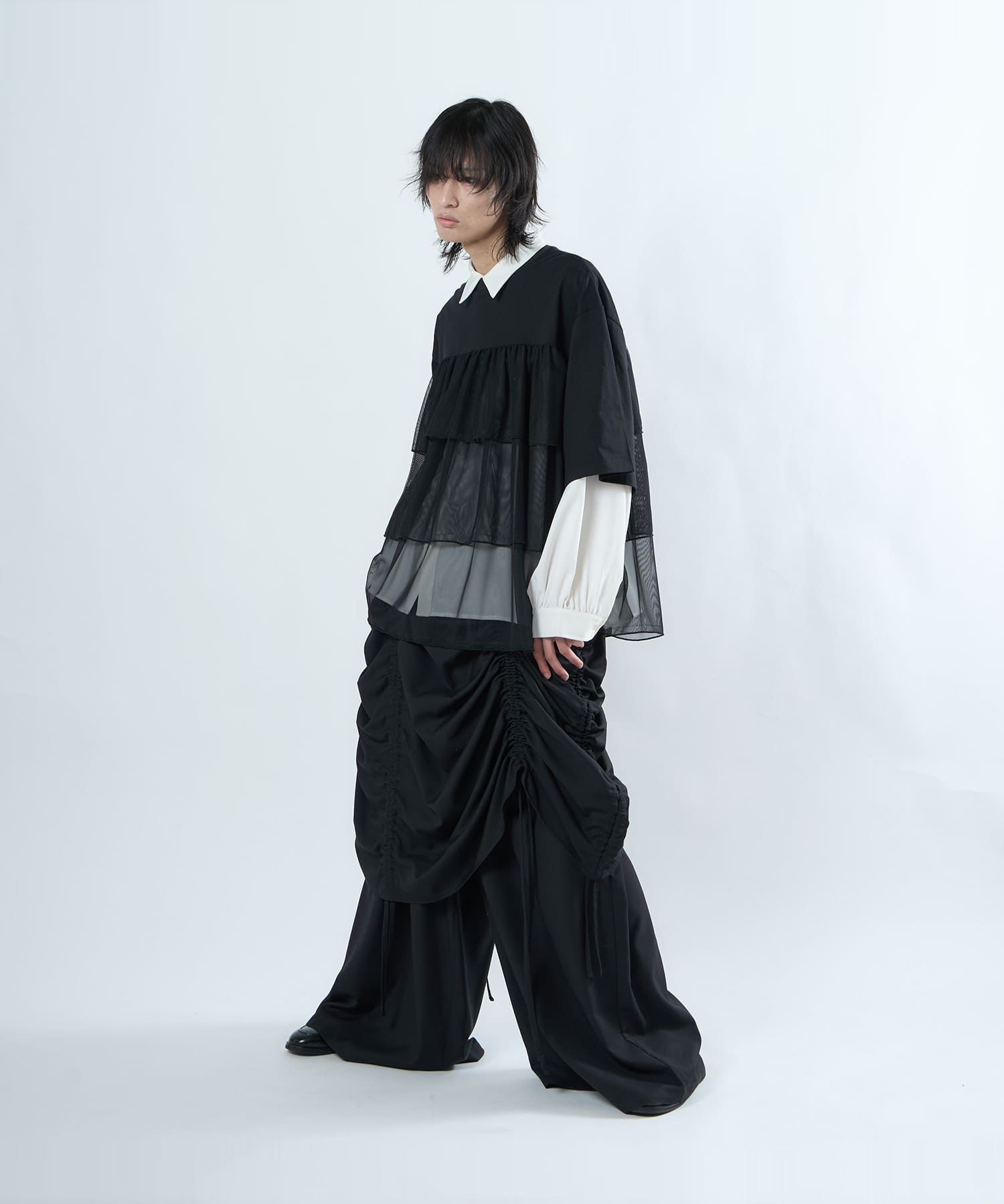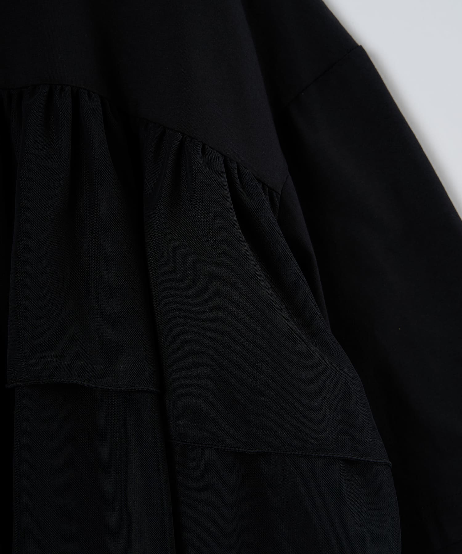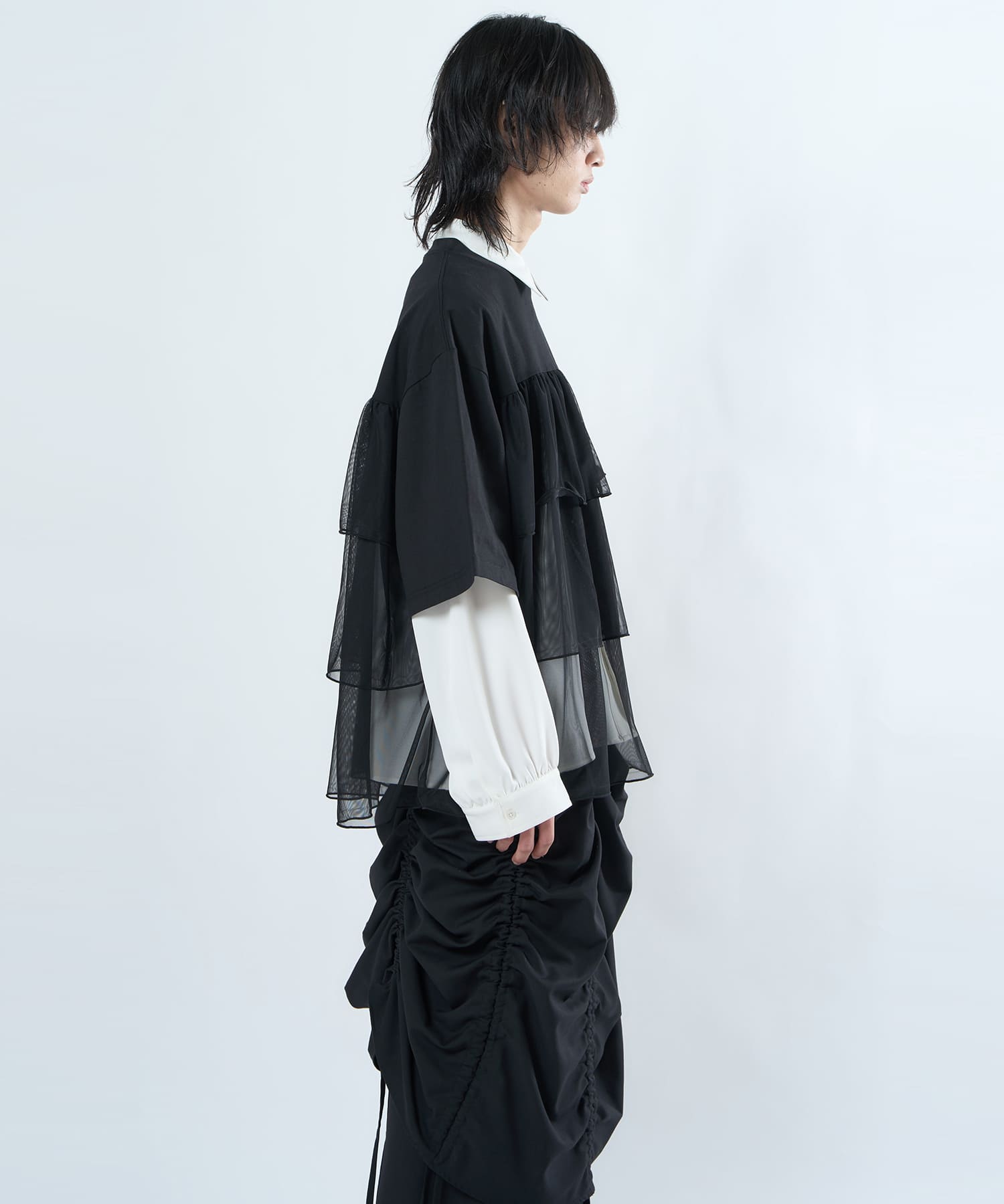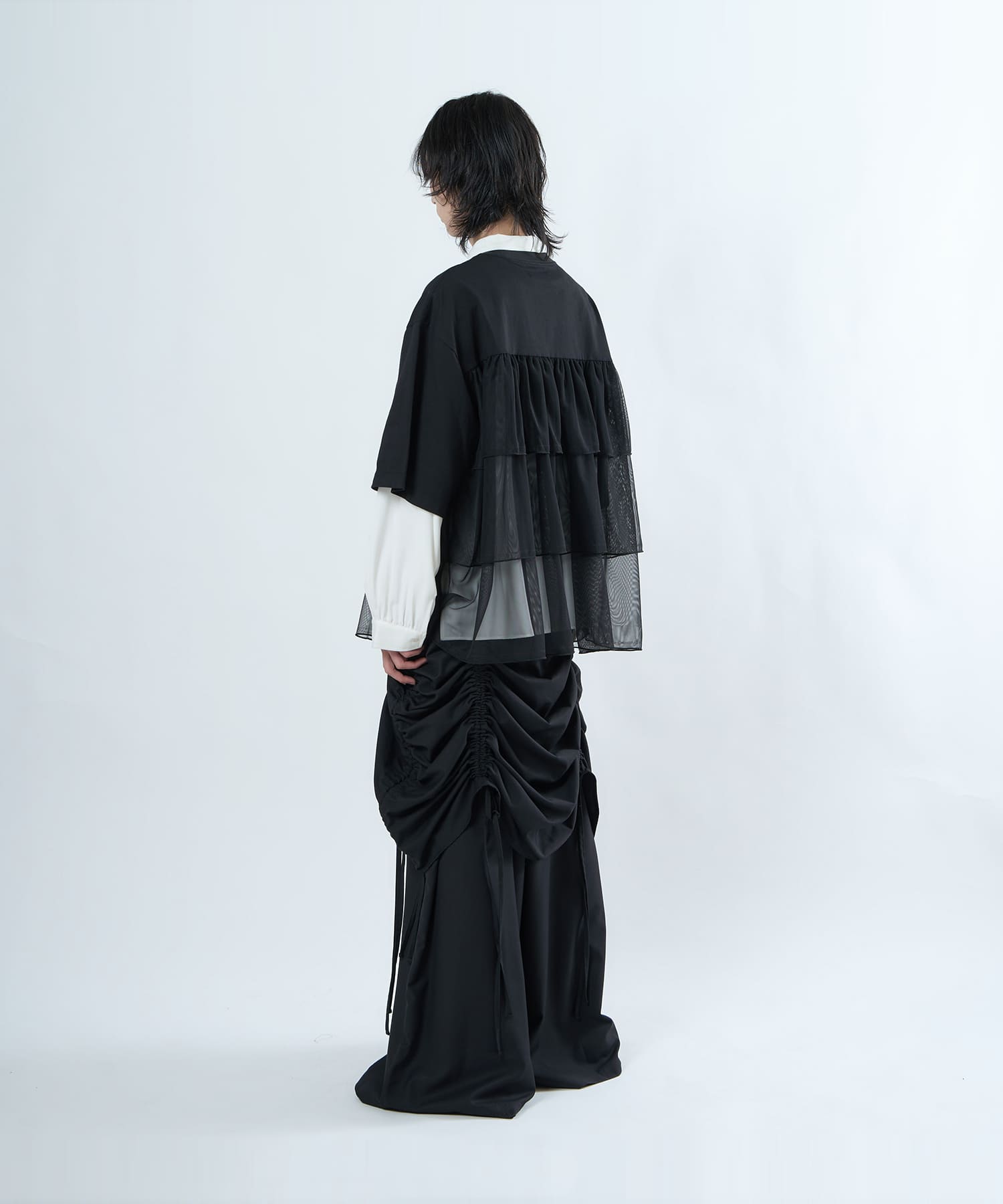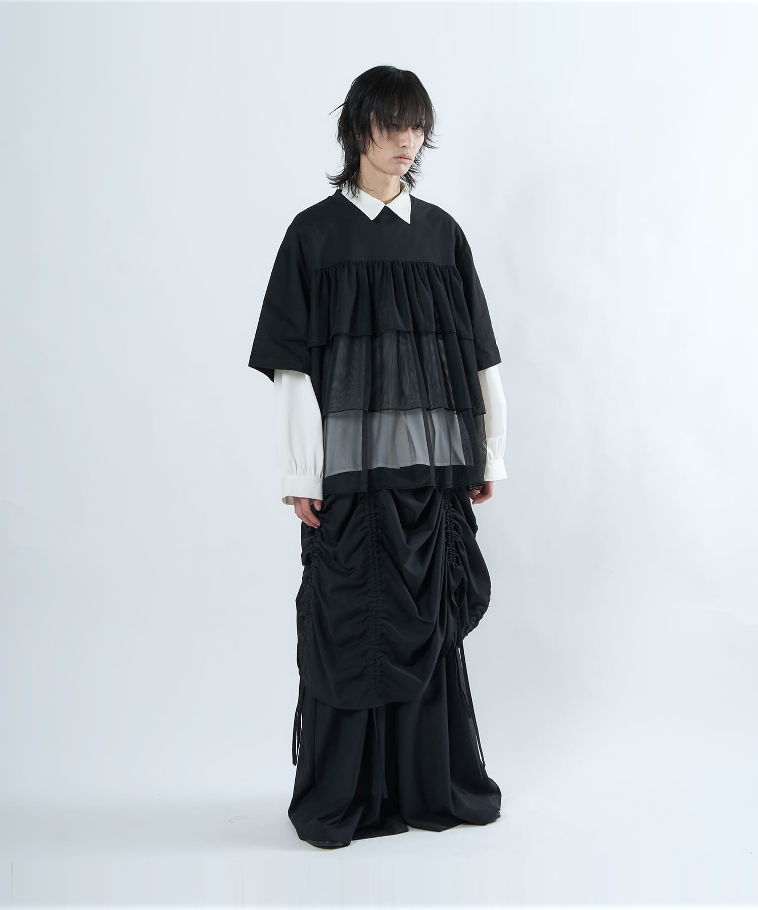 This tulle design tee combines comfortable cotton and soft tulle material, with the tulle starting around the bust and tiered to create volume and glamour. The tulle part is sheer, but it is loose-fitting. It can be worn layered with an inner layer.