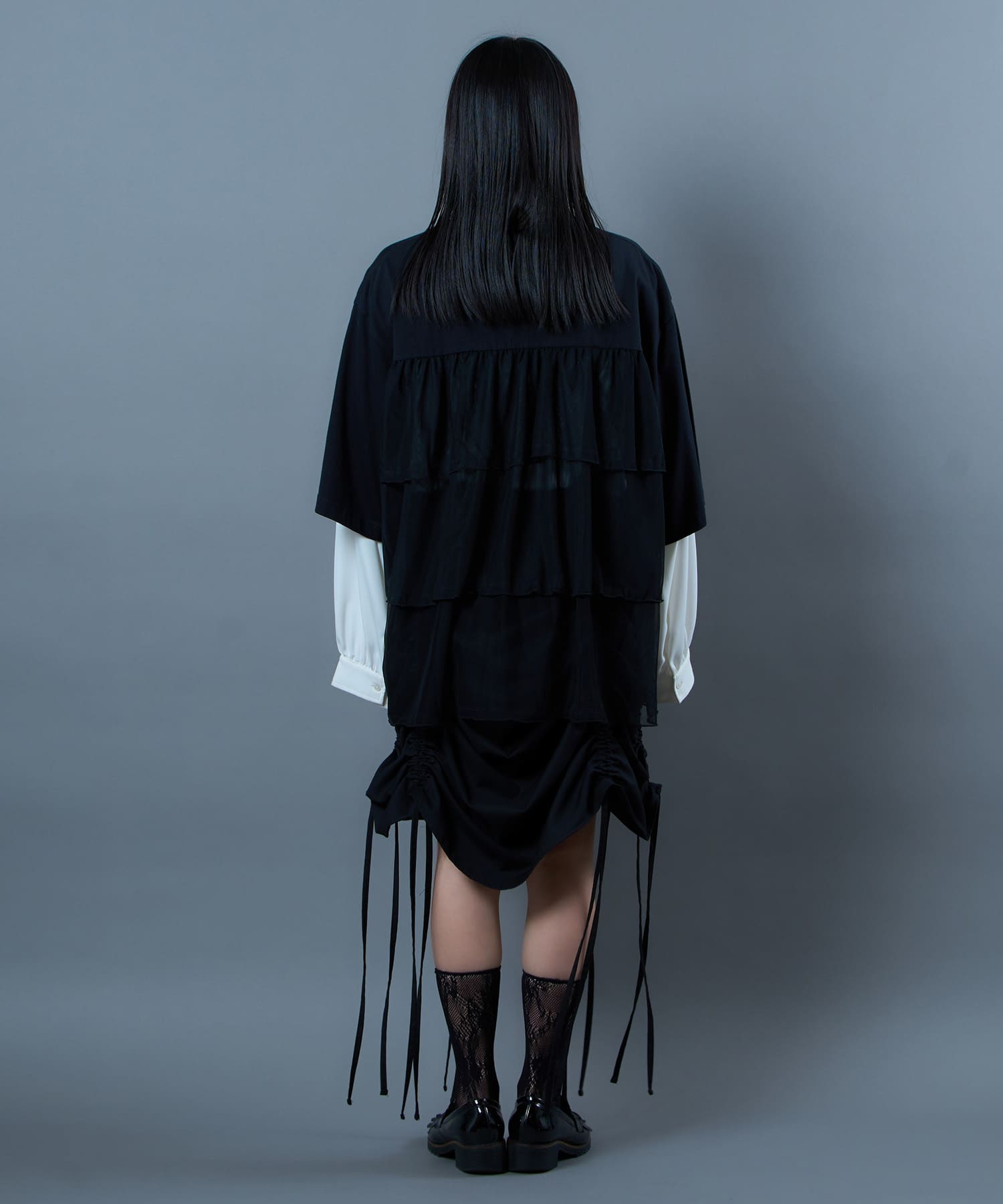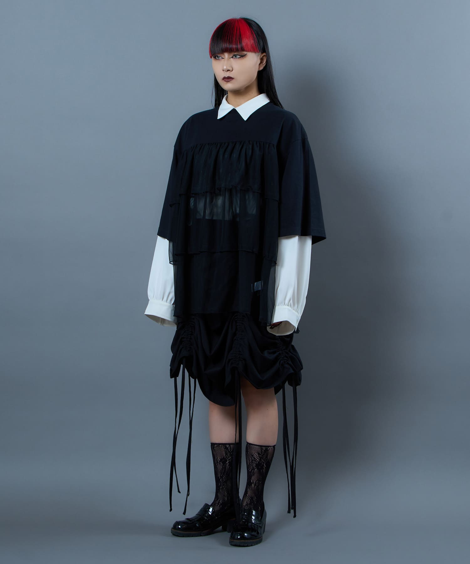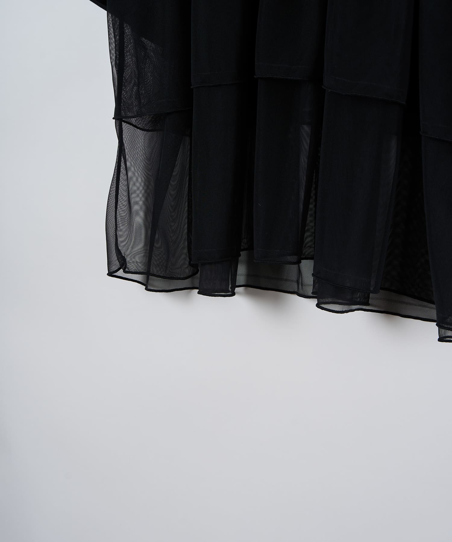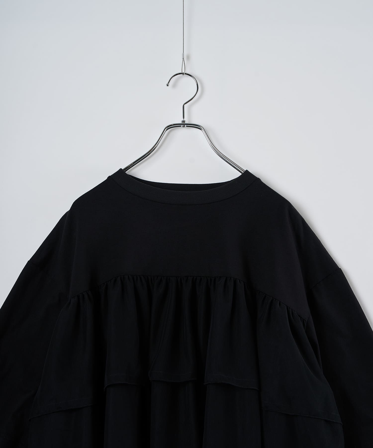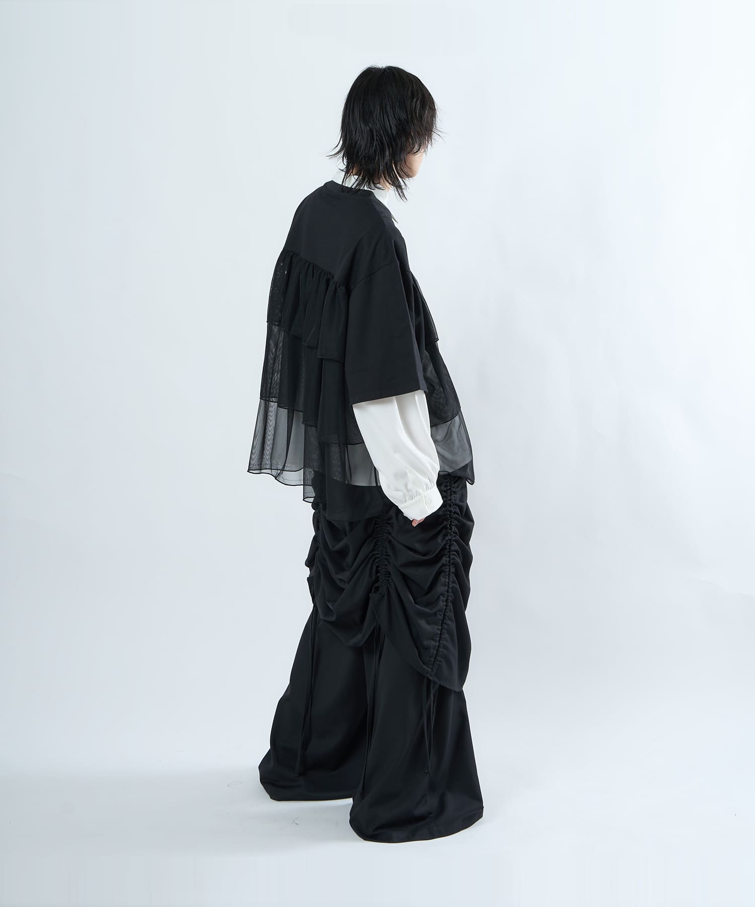 This tulle design tee combines comfortable cotton and soft tulle material, with the tulle starting around the bust and tiered to create volume and glamour. The tulle part is sheer, but it is loose-fitting. It can be worn layered with an inner layer.