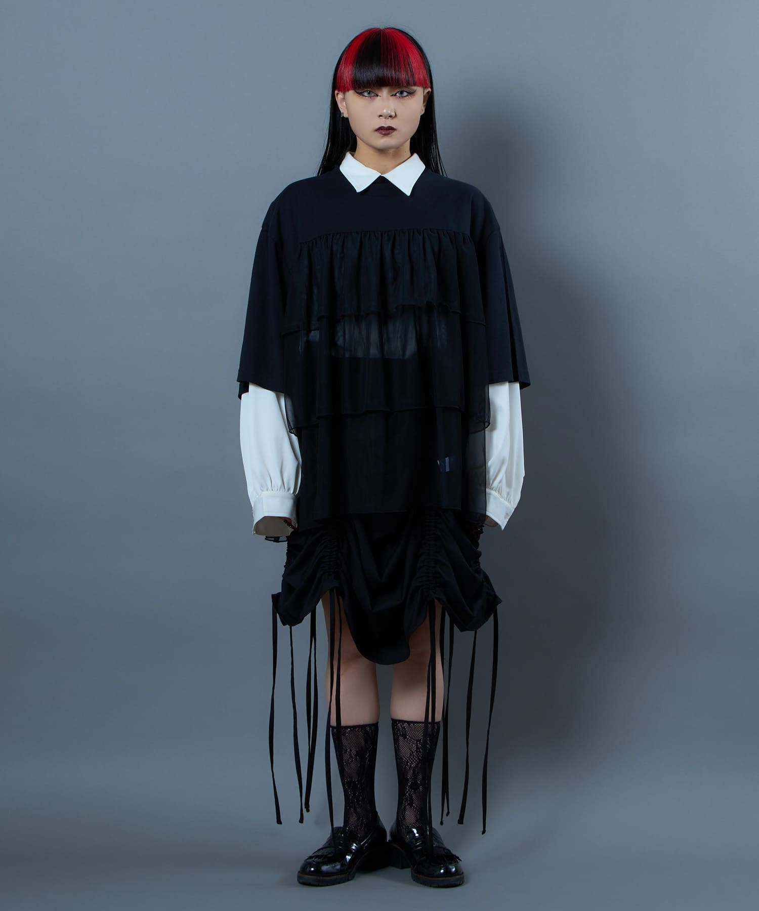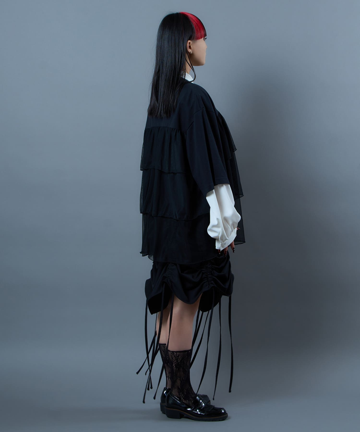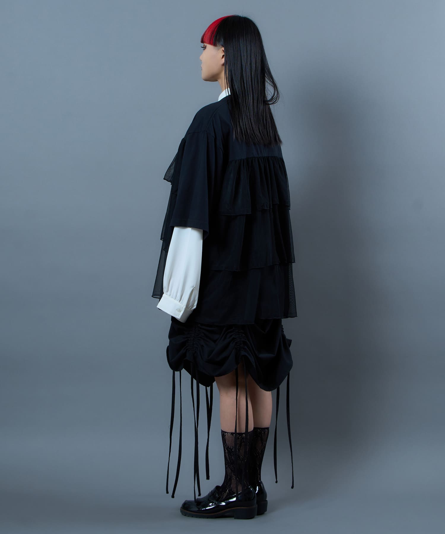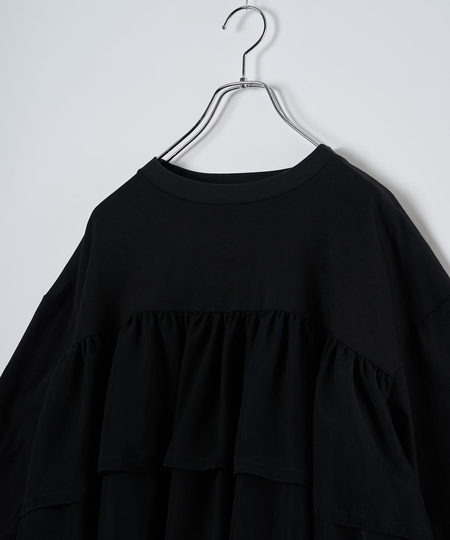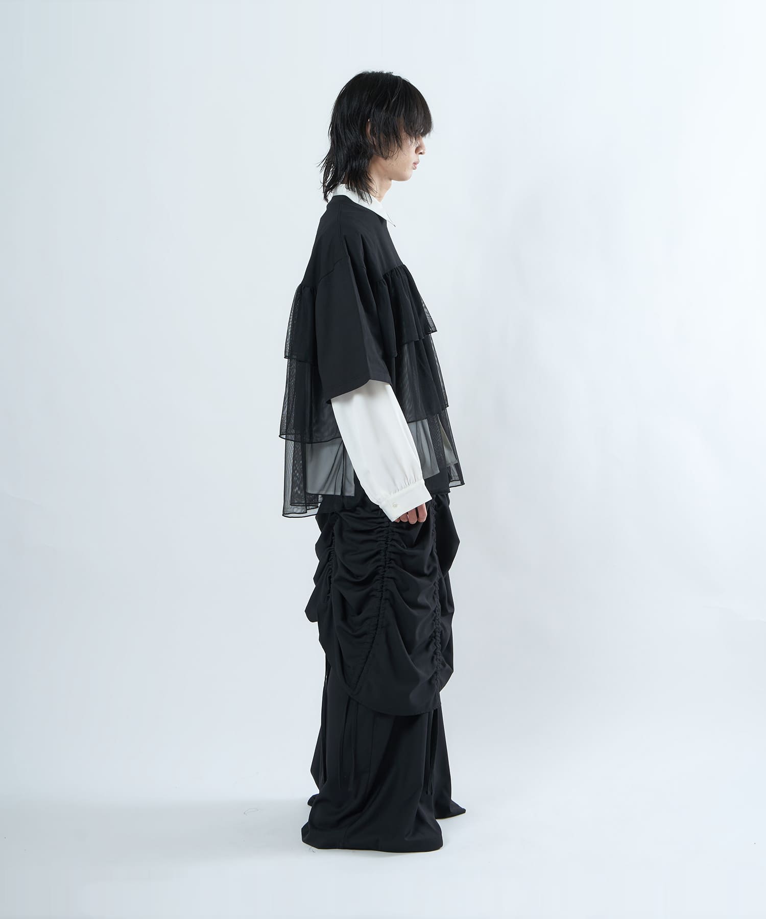 This tulle design tee combines comfortable cotton and soft tulle material, with the tulle starting around the bust and tiered to create volume and glamour. The tulle part is sheer, but it is loose-fitting. It can be worn layered with an inner layer.