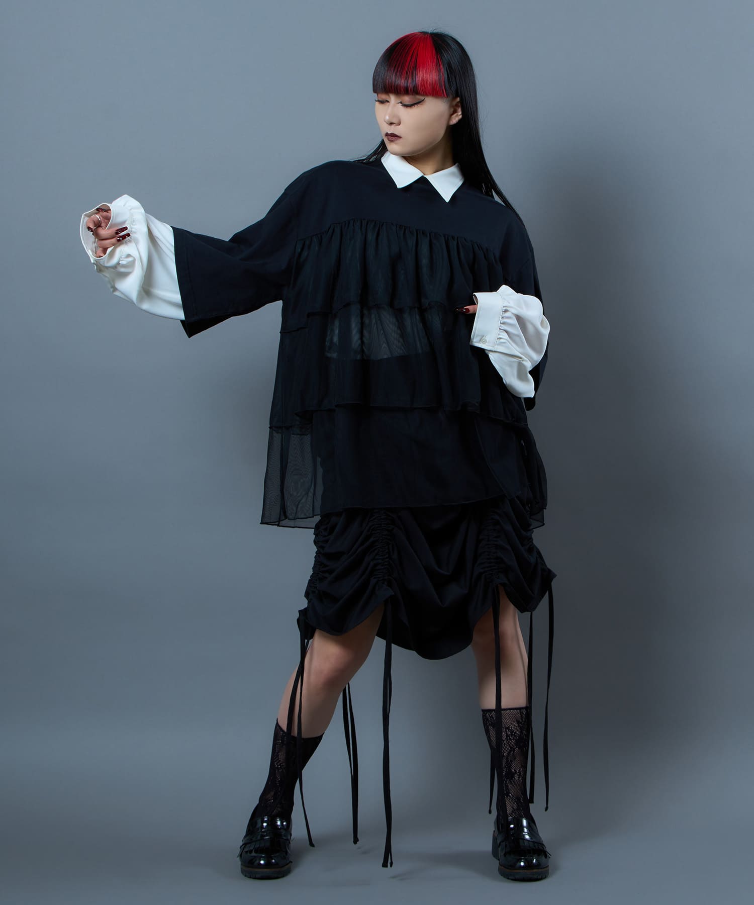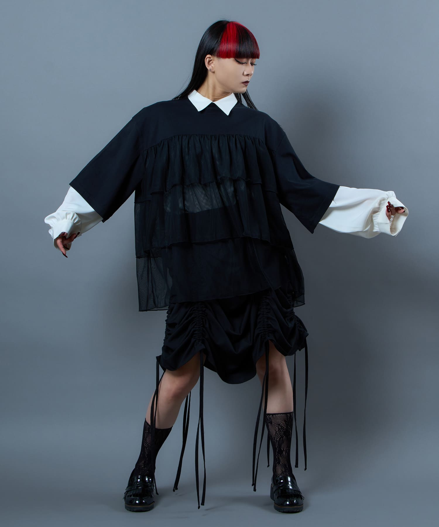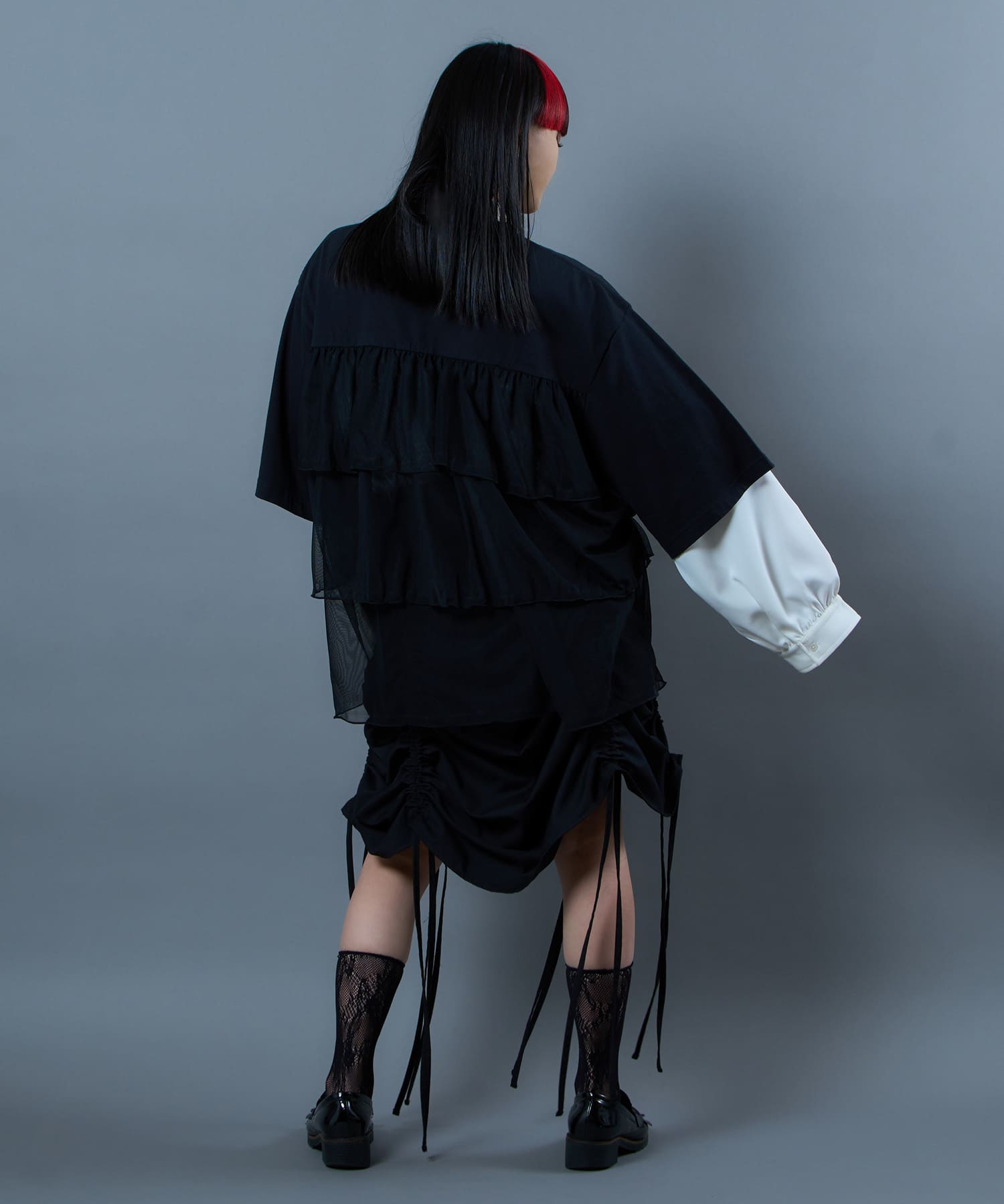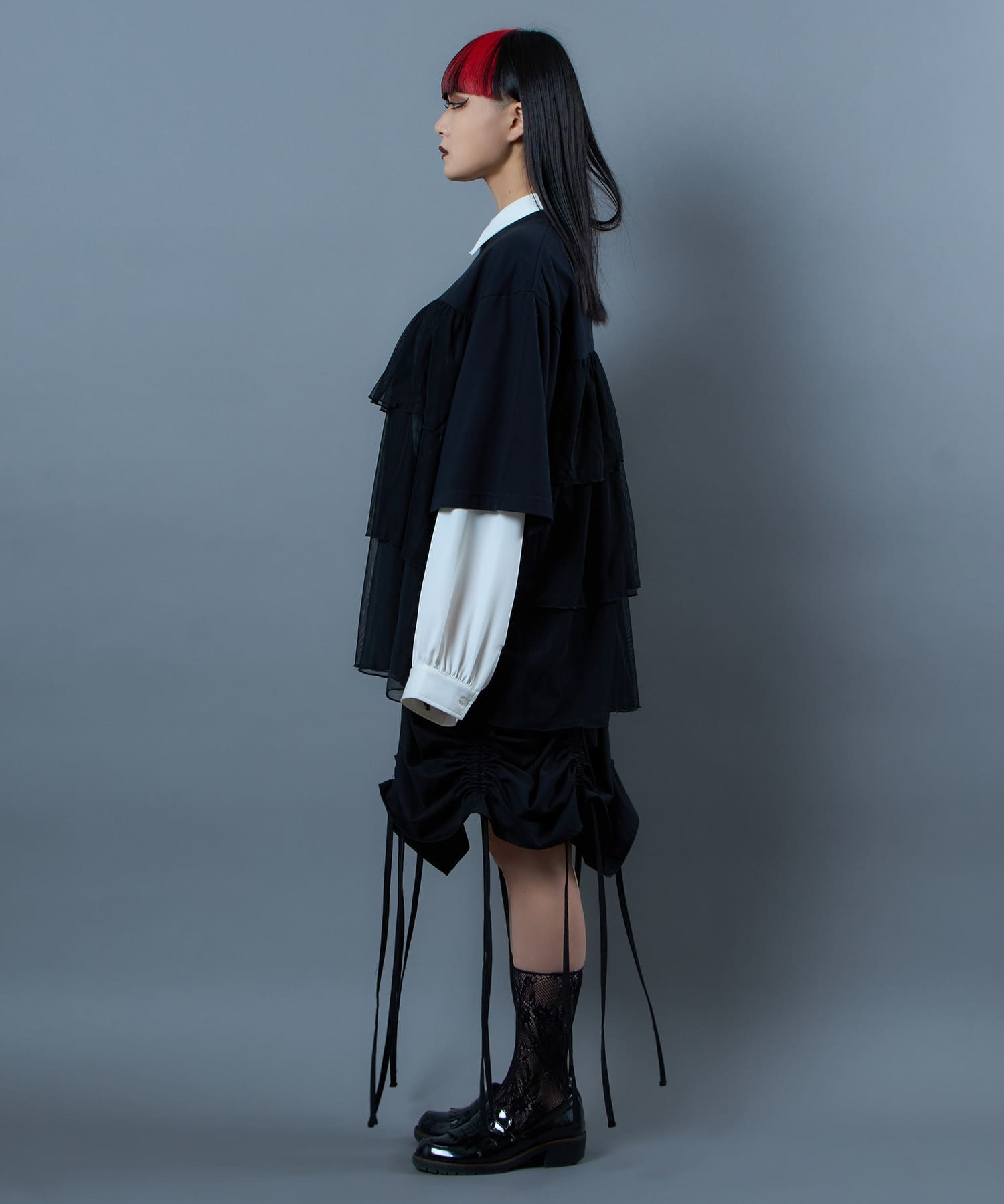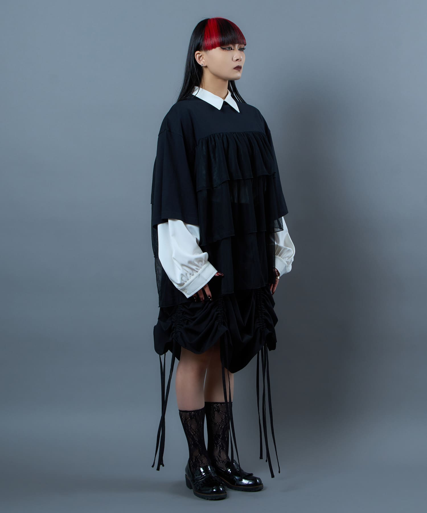 This tulle design tee combines comfortable cotton and soft tulle material, with the tulle starting around the bust and tiered to create volume and glamour. The tulle part is sheer, but it is loose-fitting. It can be worn layered with an inner layer.