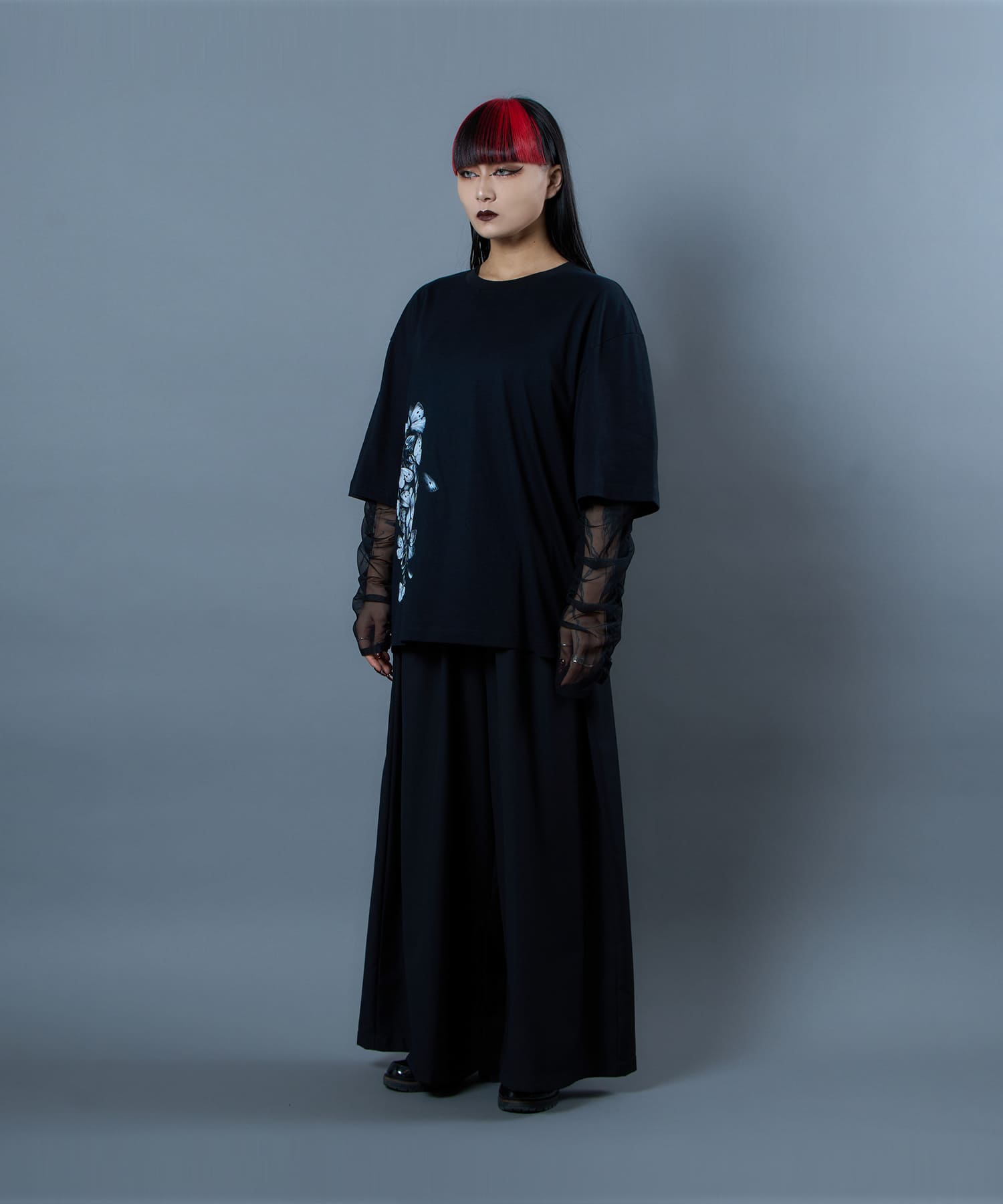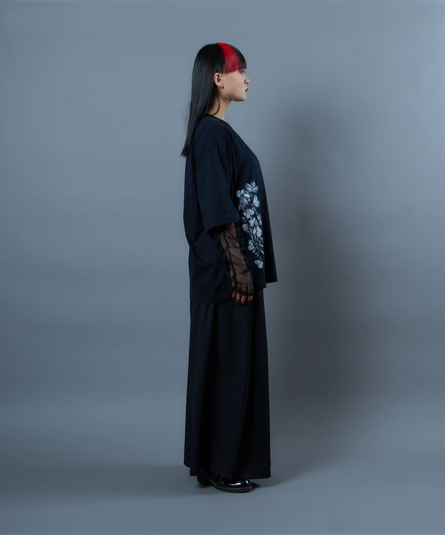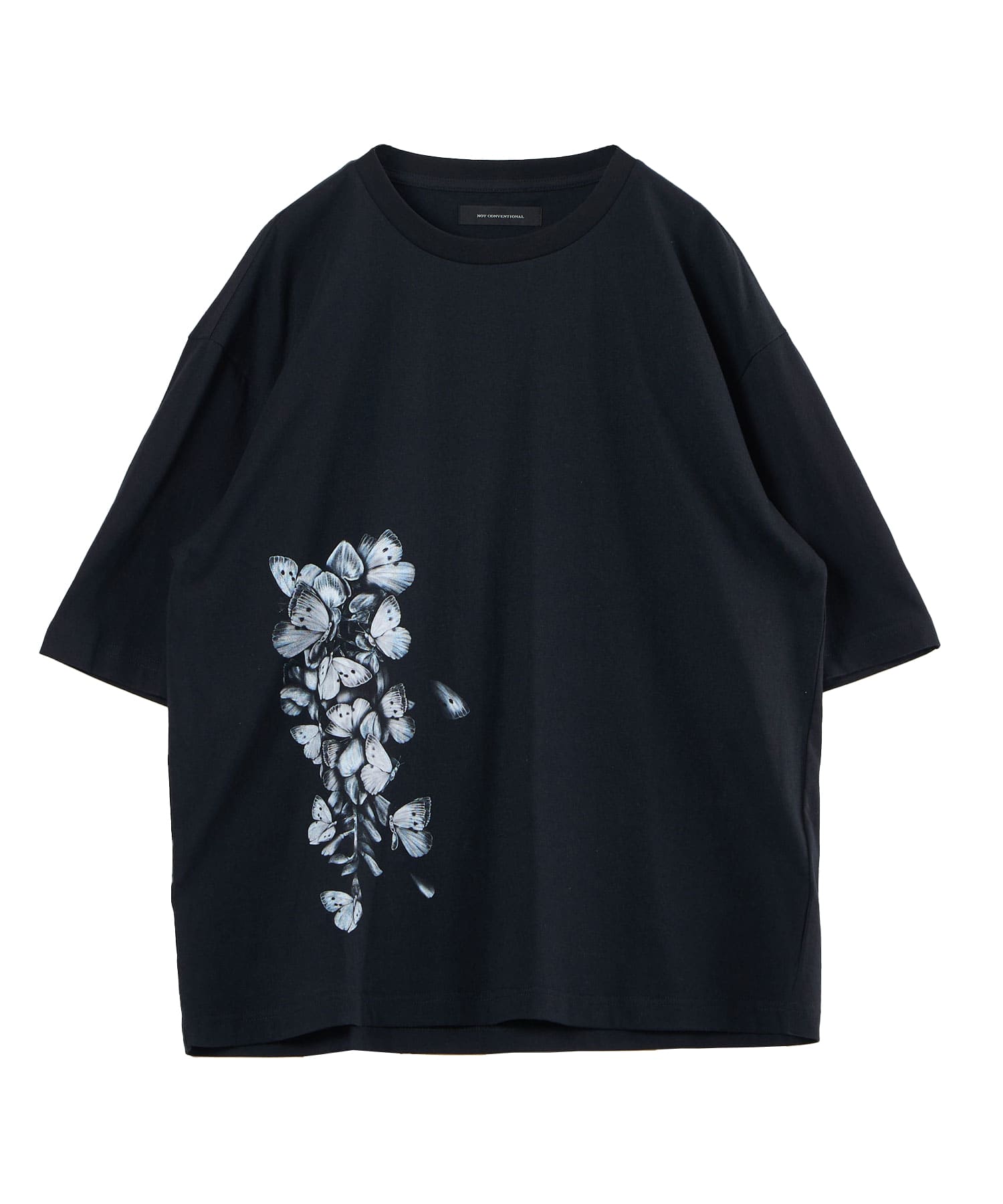 ゆったりとしたサイズ感と柔らかく肌触りの良い素材を使用した蝶々藤TEE。コットン100%の天然素材を使用しておりイージーケアなアイテムとなっております。藤と蝶をモチーフに仕上げられたグラフィックは、儚げな美を表現しつつも、どこか奇妙さを感じられる仕上がりです。裾に施された大判プリントが目を引く一枚で、単体でもレイヤードでもお楽しみいただけるアイテムとなっております。