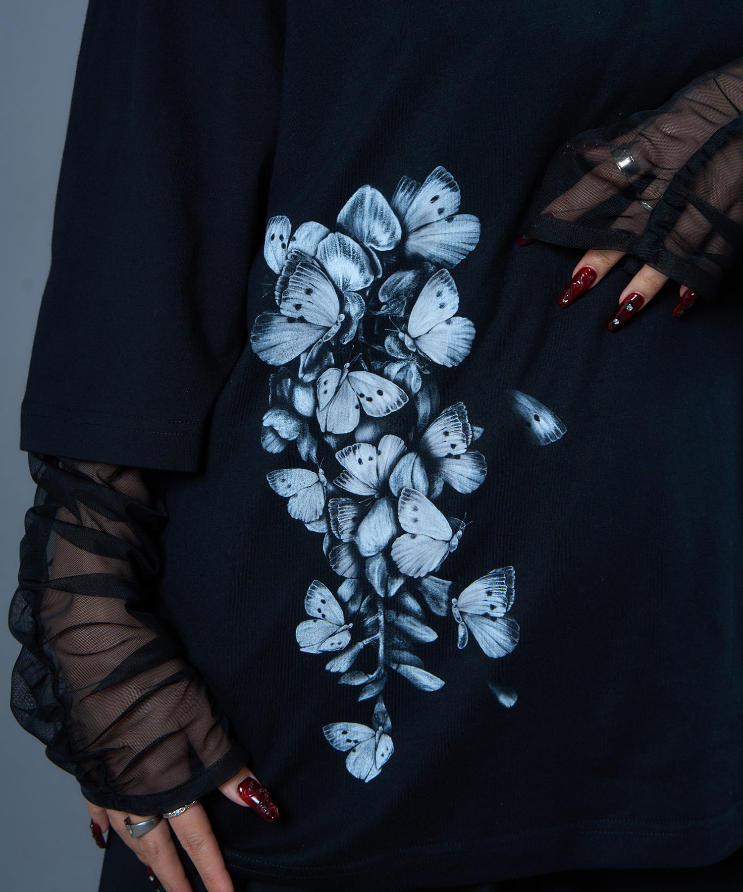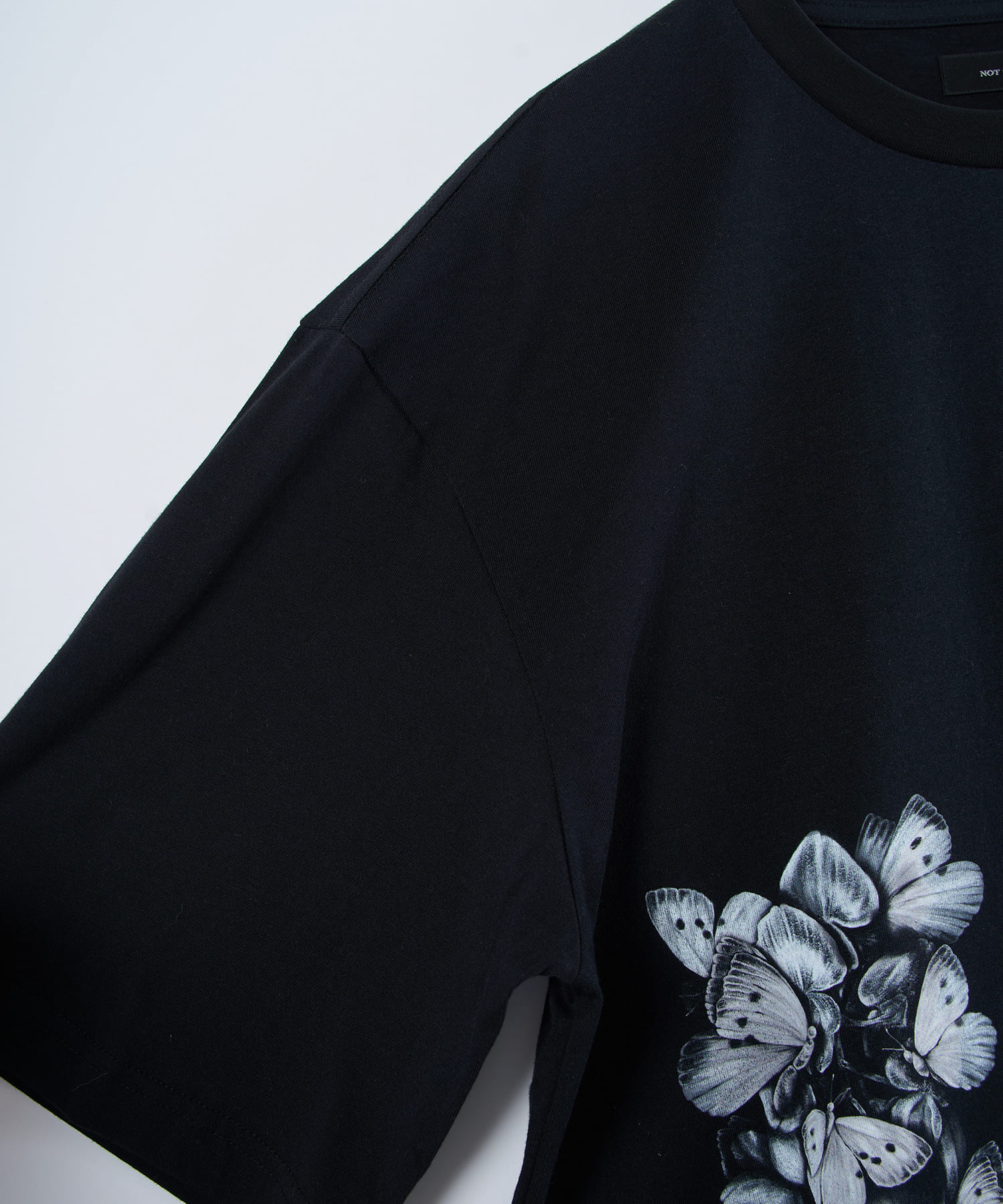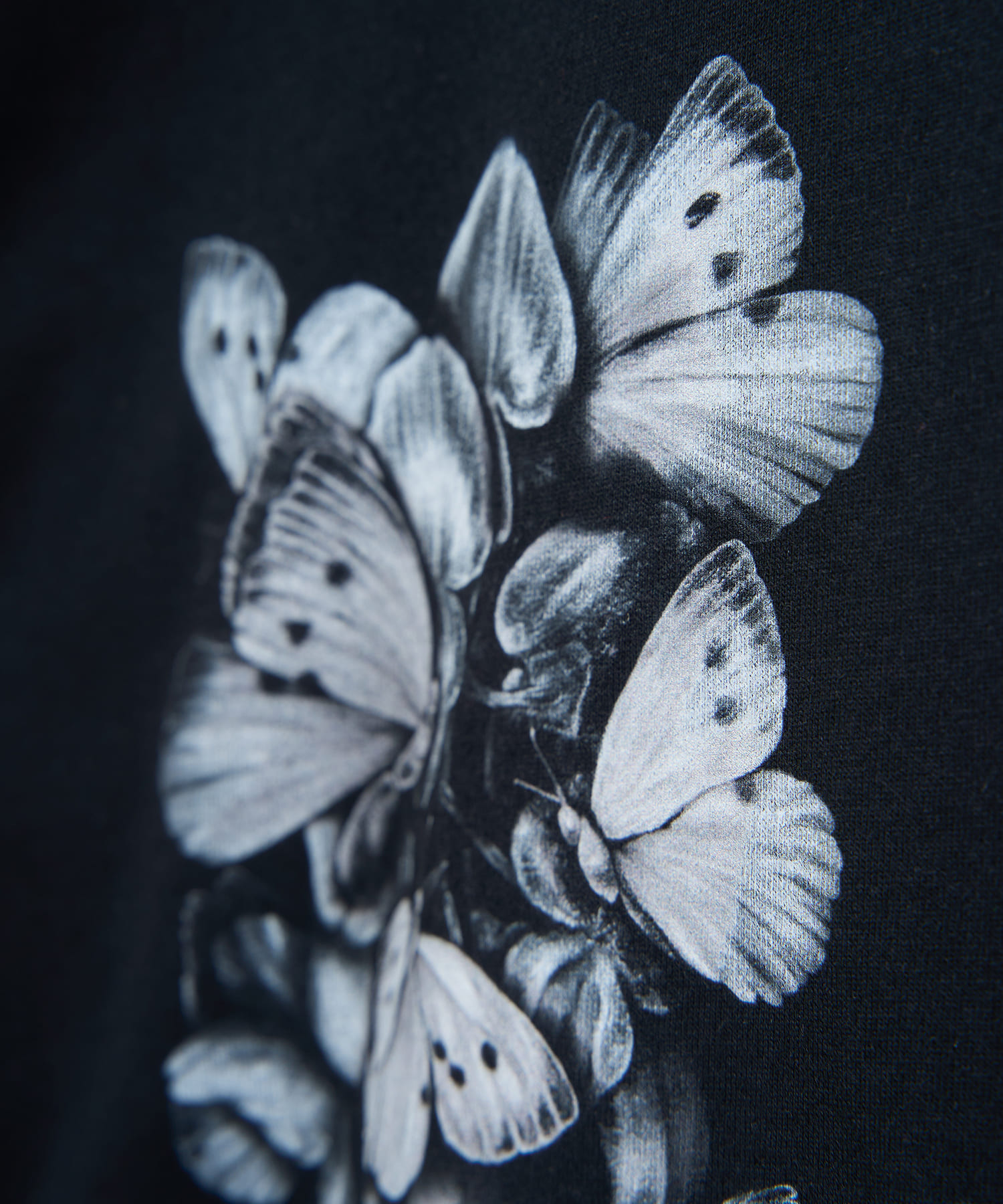 The Butterfly Wisteria Tee is generously sized and made of soft and comfortable material, and is an easy-care item made of 100% natural cotton. The graphic motif of wisteria and butterflies expresses ephemeral beauty, but at the same time, it has a sense of strangeness. The large print on the hem of this eye-catching piece can be worn alone or layered.