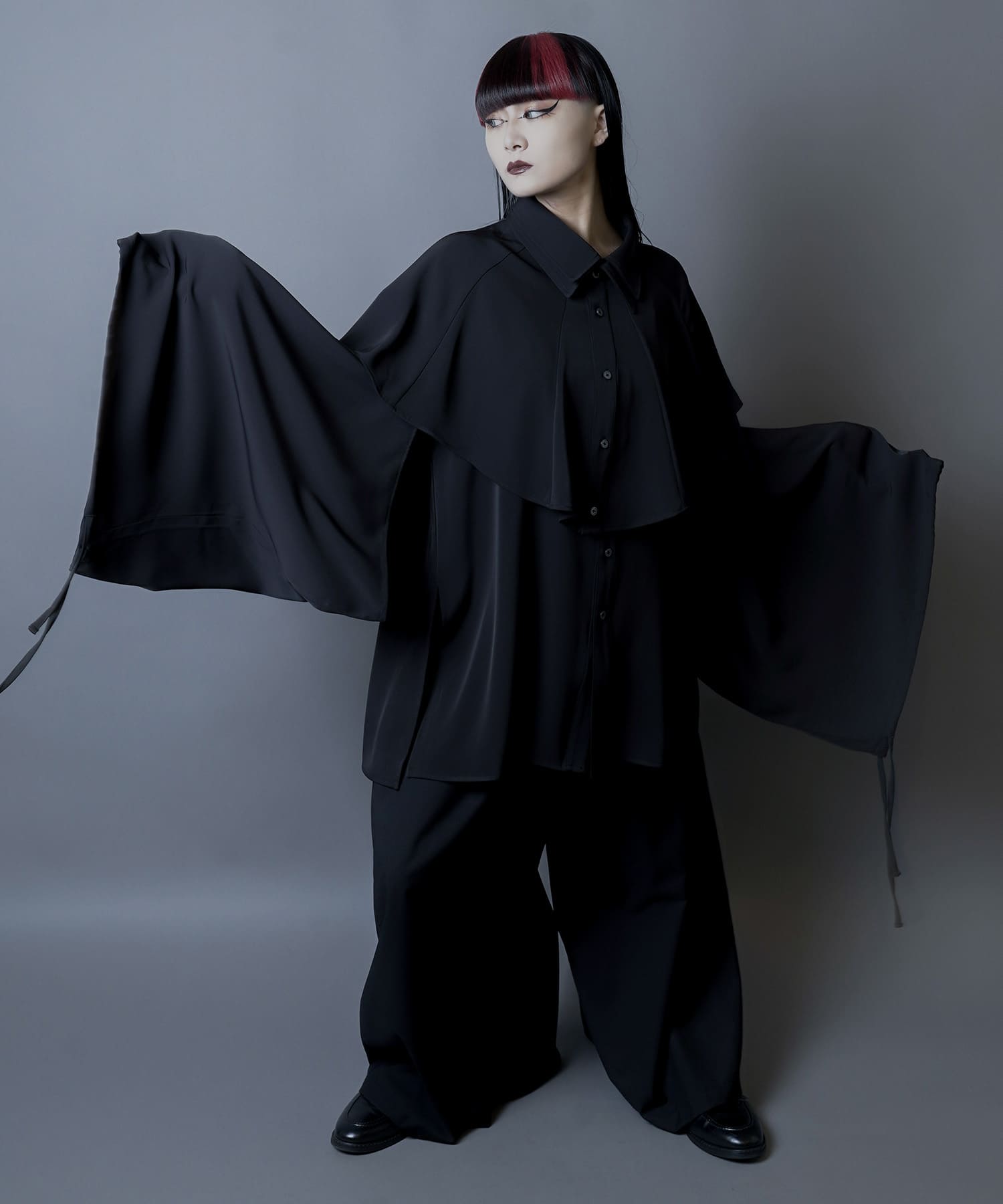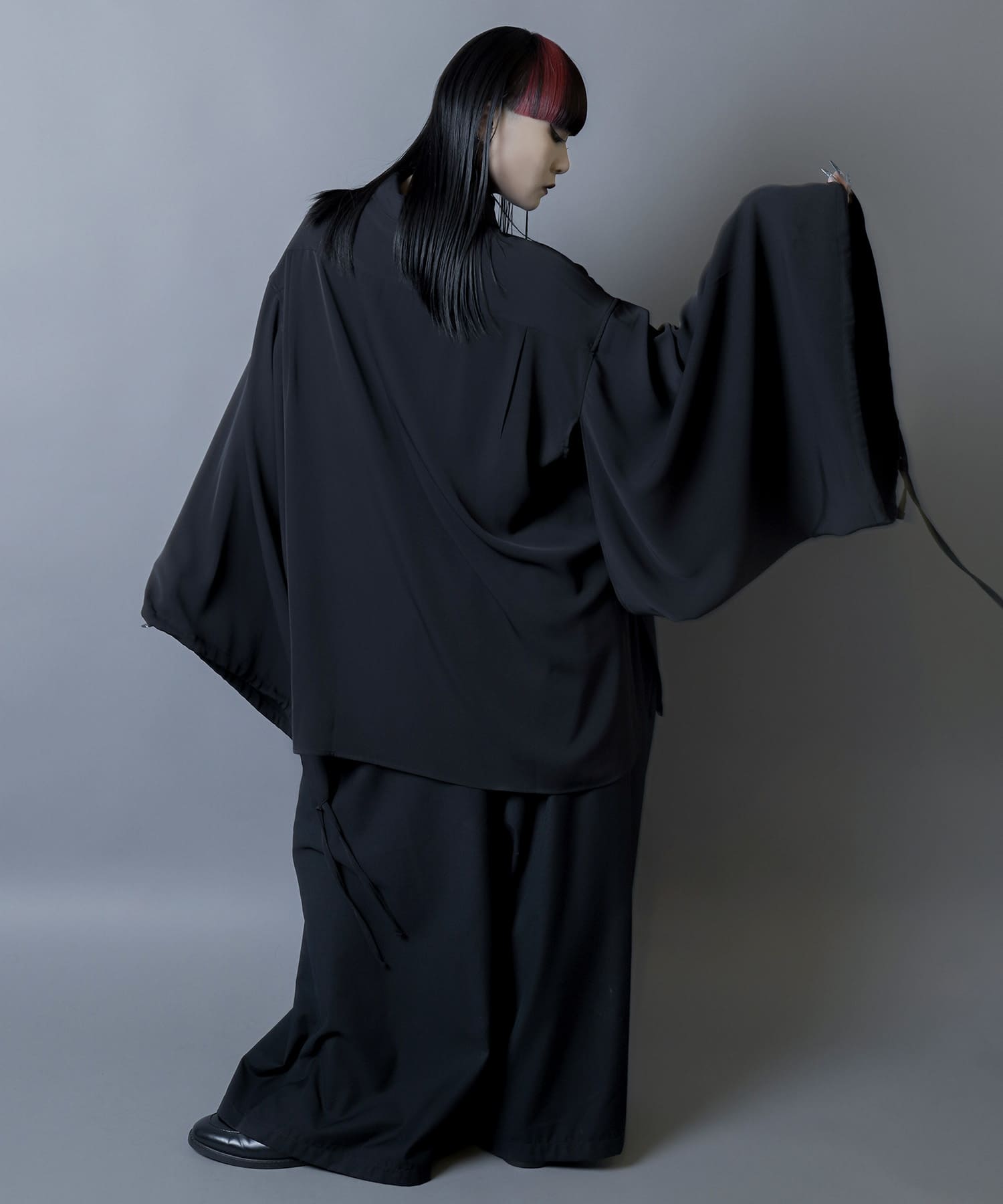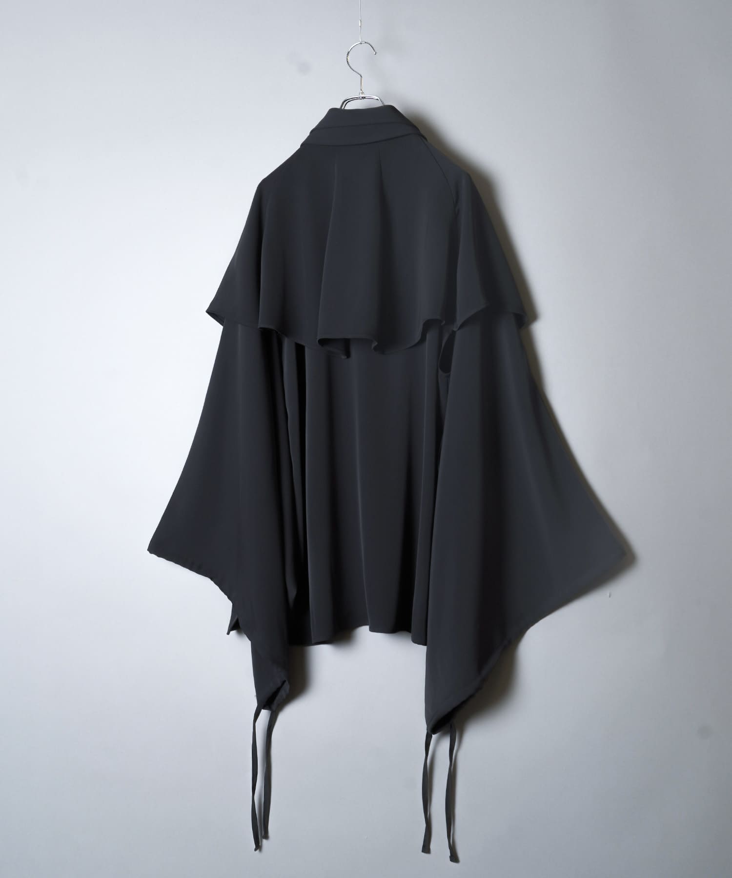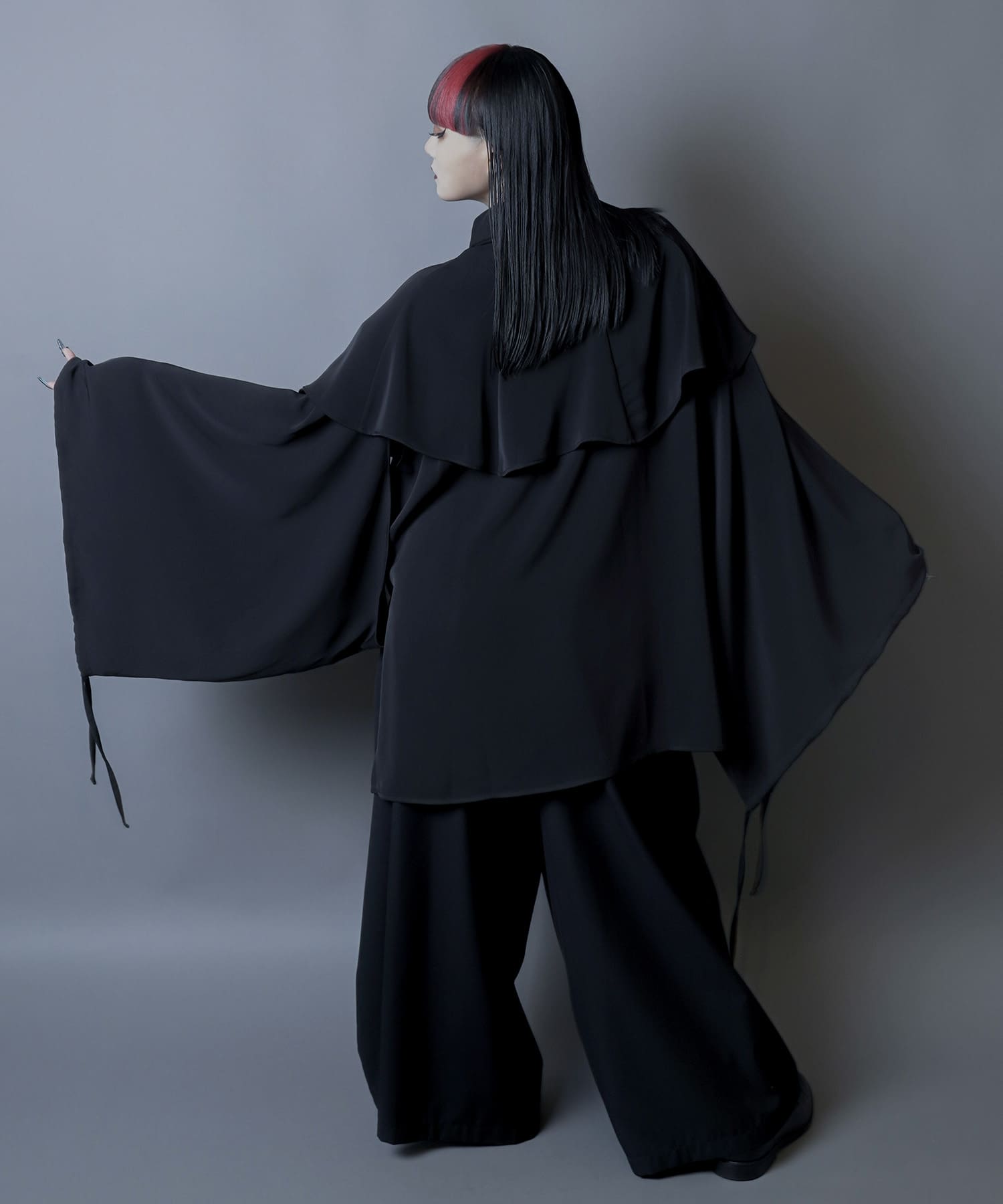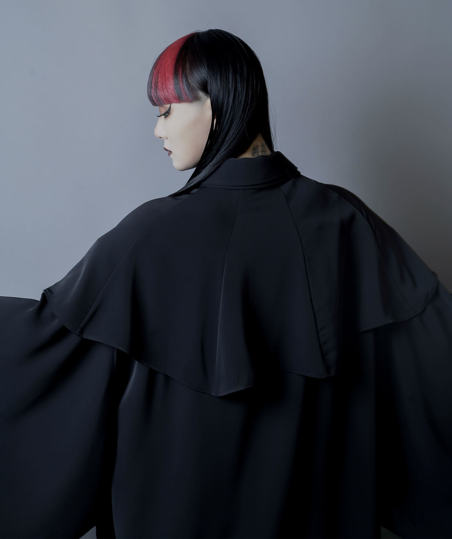 Umbrella cape kimono shirt made of NOT's original satin fabric. It is made of a thick satin fabric that is pleasant to the touch and has a sheen and drape. This season, it has been updated with a detachable cape, transforming it into a kimono shirt unlike any other. The cape is designed to resemble an umbrella, and while it is made of a symbiotic fabric with the body, it has a different appearance depending on the angle. This is a unisex item. The cuffs can be transformed by threading a string through the cuffs, and this piece allows you to enjoy both the straight lines of a kimono and the round baroon silhouette.