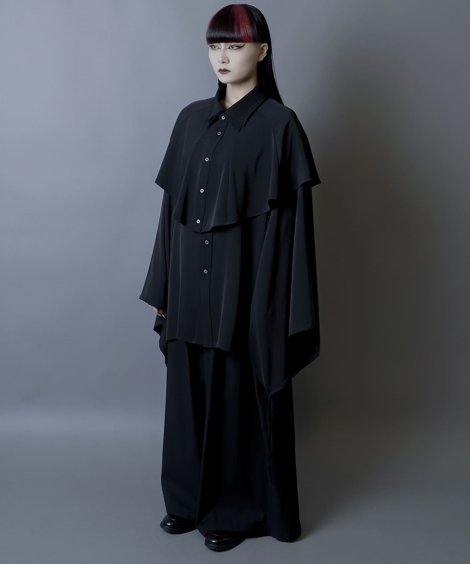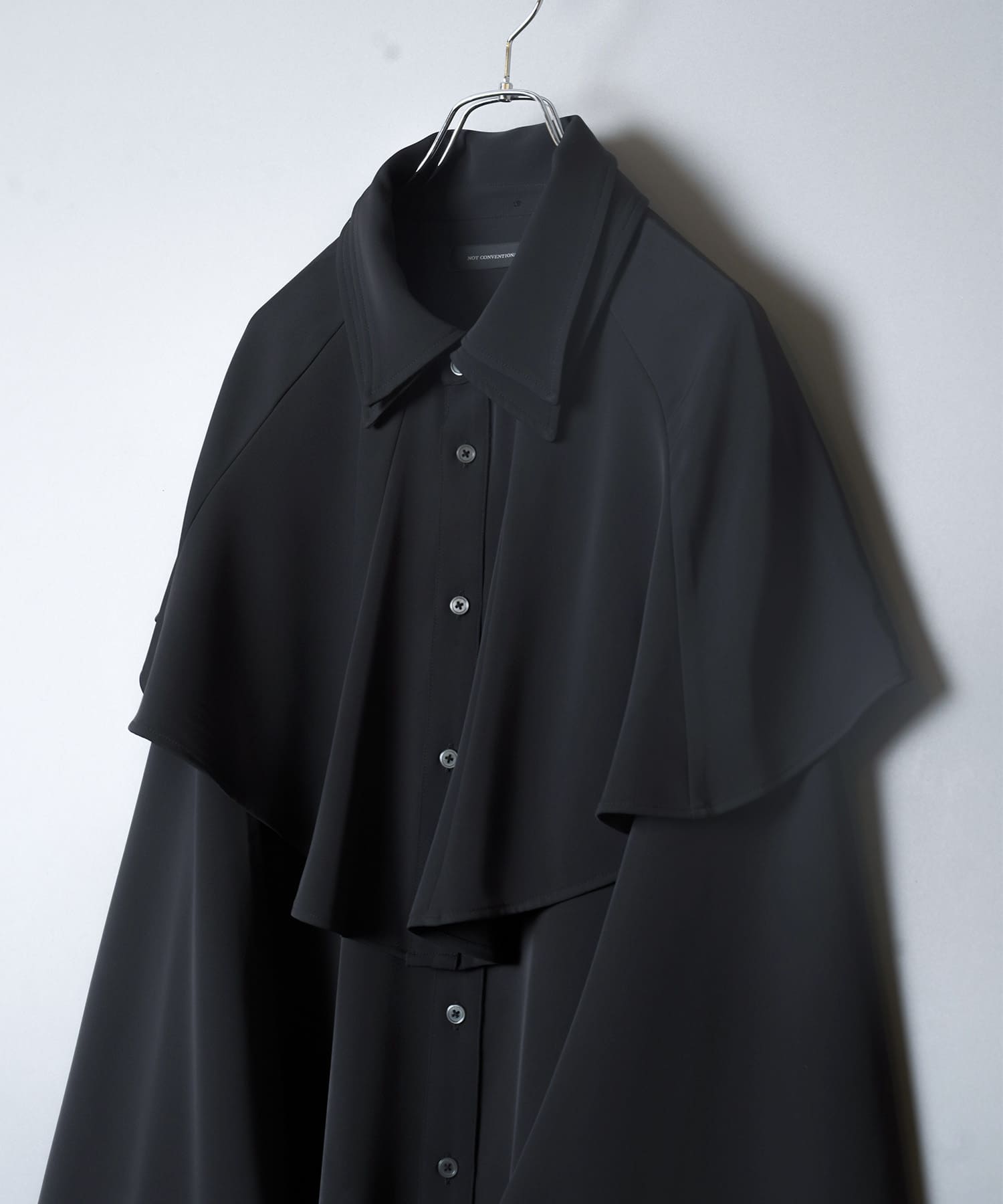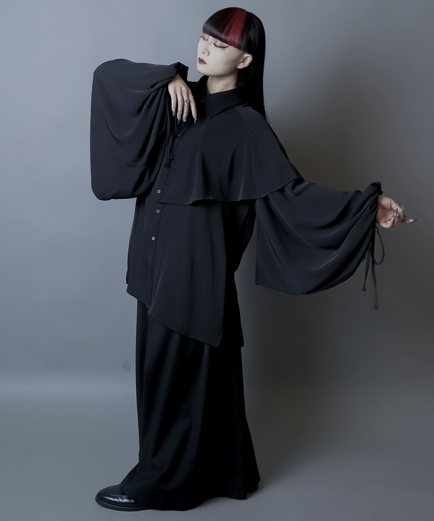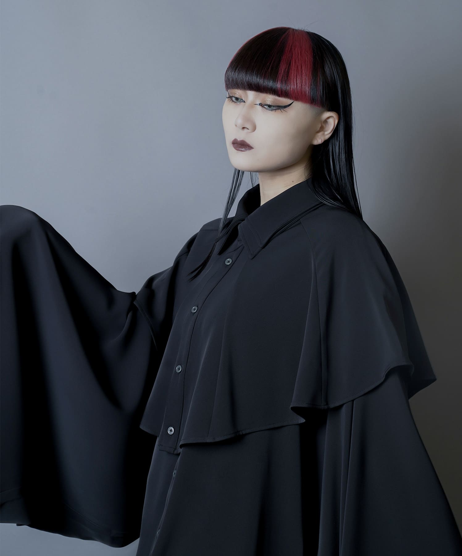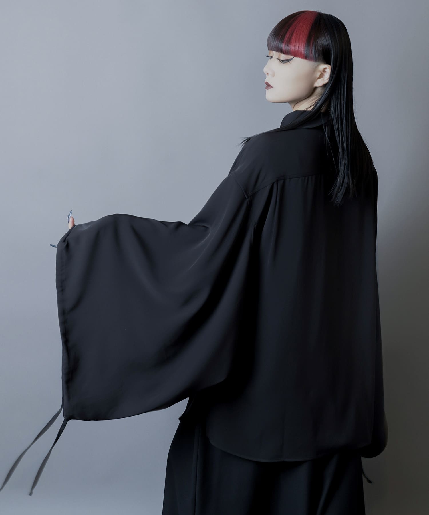 Umbrella cape kimono shirt made of NOT's original satin fabric. It is made of a thick satin fabric that is pleasant to the touch and has a sheen and drape. This season, it has been updated with a detachable cape, transforming it into a kimono shirt unlike any other. The cape is designed to resemble an umbrella, and while it is made of a symbiotic fabric with the body, it has a different appearance depending on the angle. This is a unisex item. The cuffs can be transformed by threading a string through the cuffs, and this piece allows you to enjoy both the straight lines of a kimono and the round baroon silhouette.