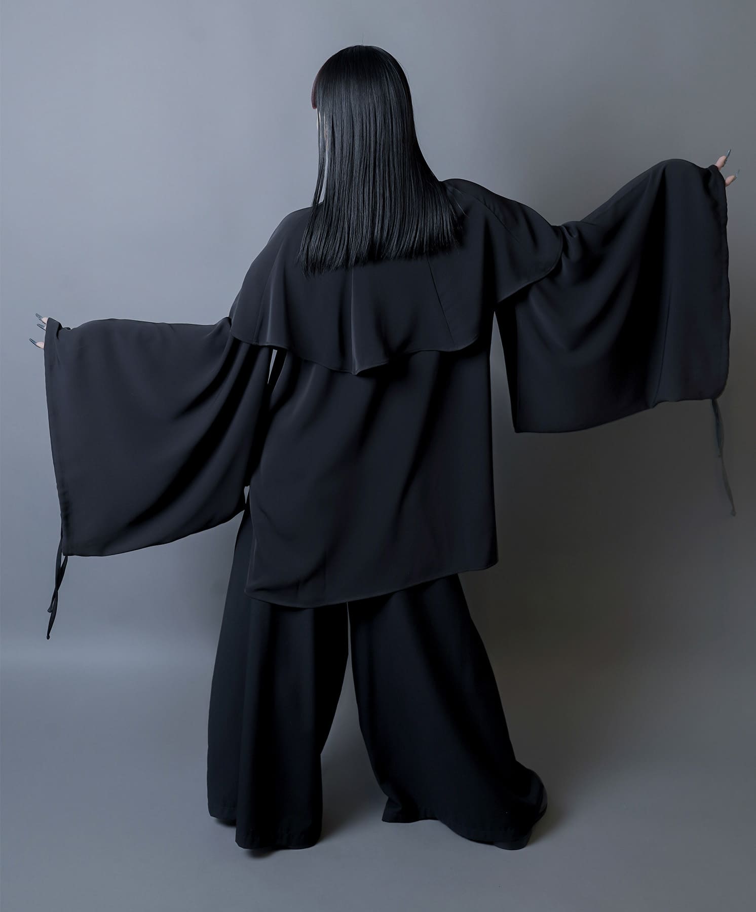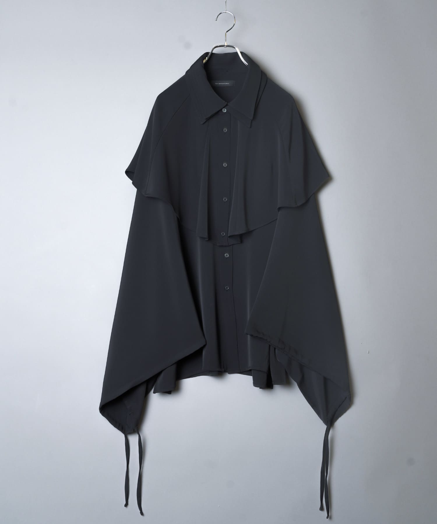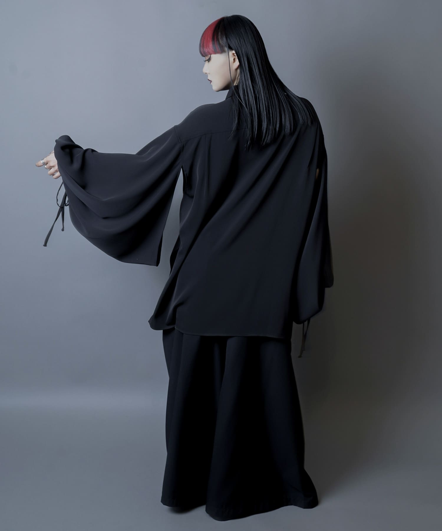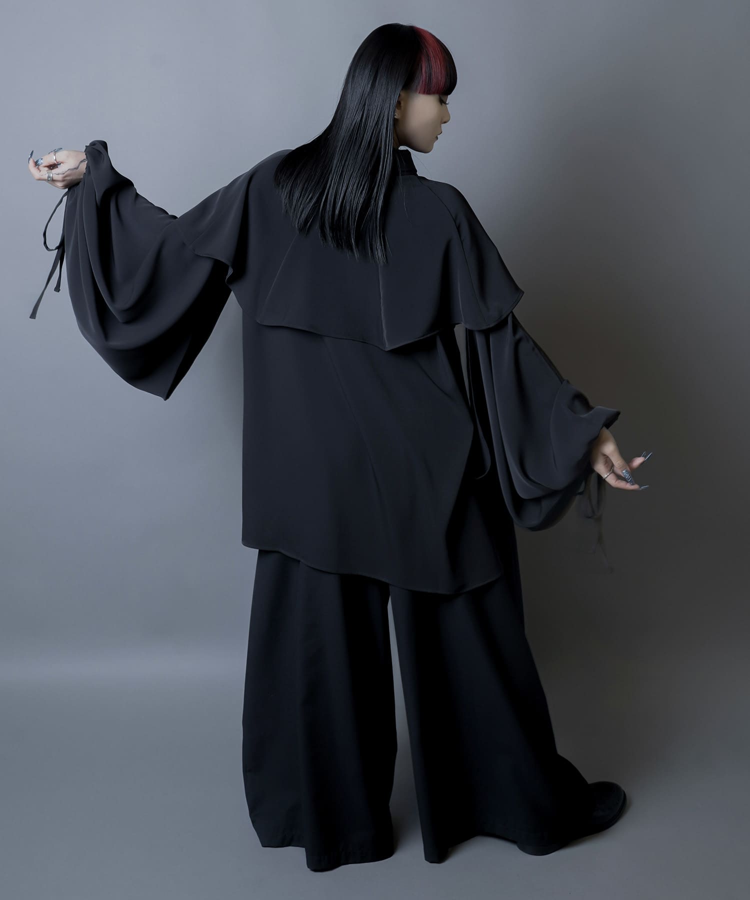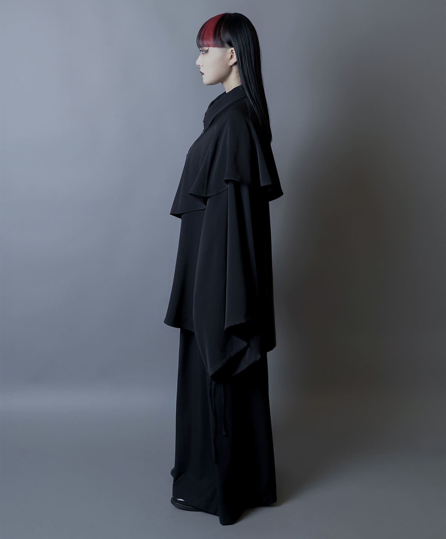 Umbrella cape kimono shirt made of NOT's original satin fabric. It is made of a thick satin fabric that is pleasant to the touch and has a sheen and drape. This season, it has been updated with a detachable cape, transforming it into a kimono shirt unlike any other. The cape is designed to resemble an umbrella, and while it is made of a symbiotic fabric with the body, it has a different appearance depending on the angle. This is a unisex item. The cuffs can be transformed by threading a string through the cuffs, and this piece allows you to enjoy both the straight lines of a kimono and the round baroon silhouette.