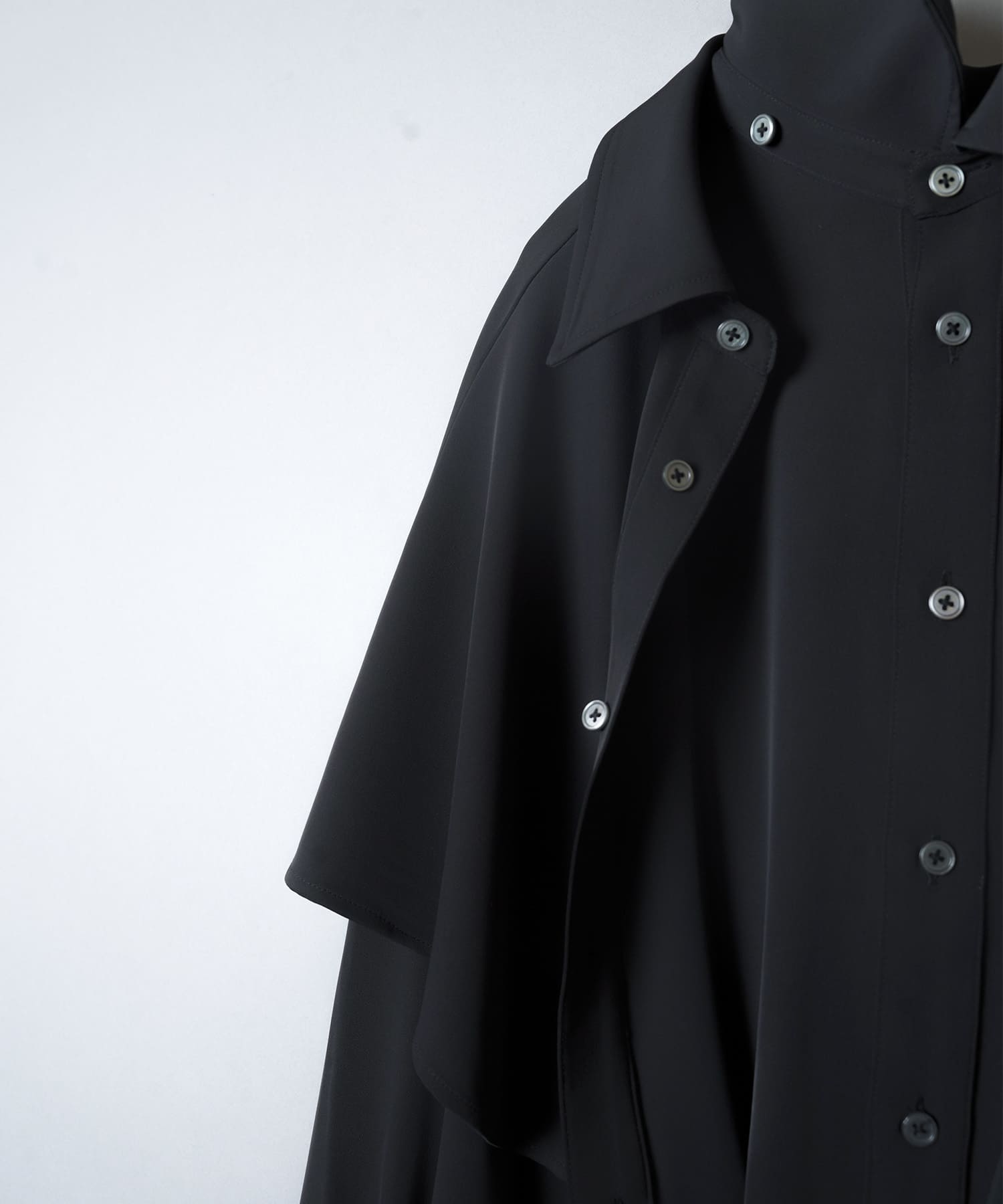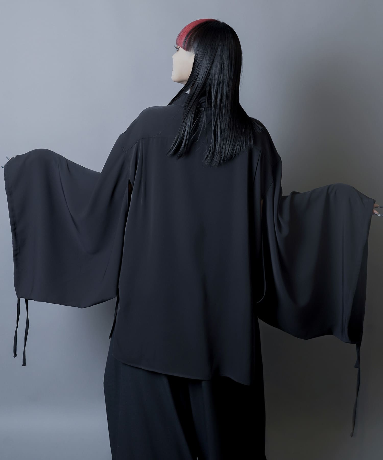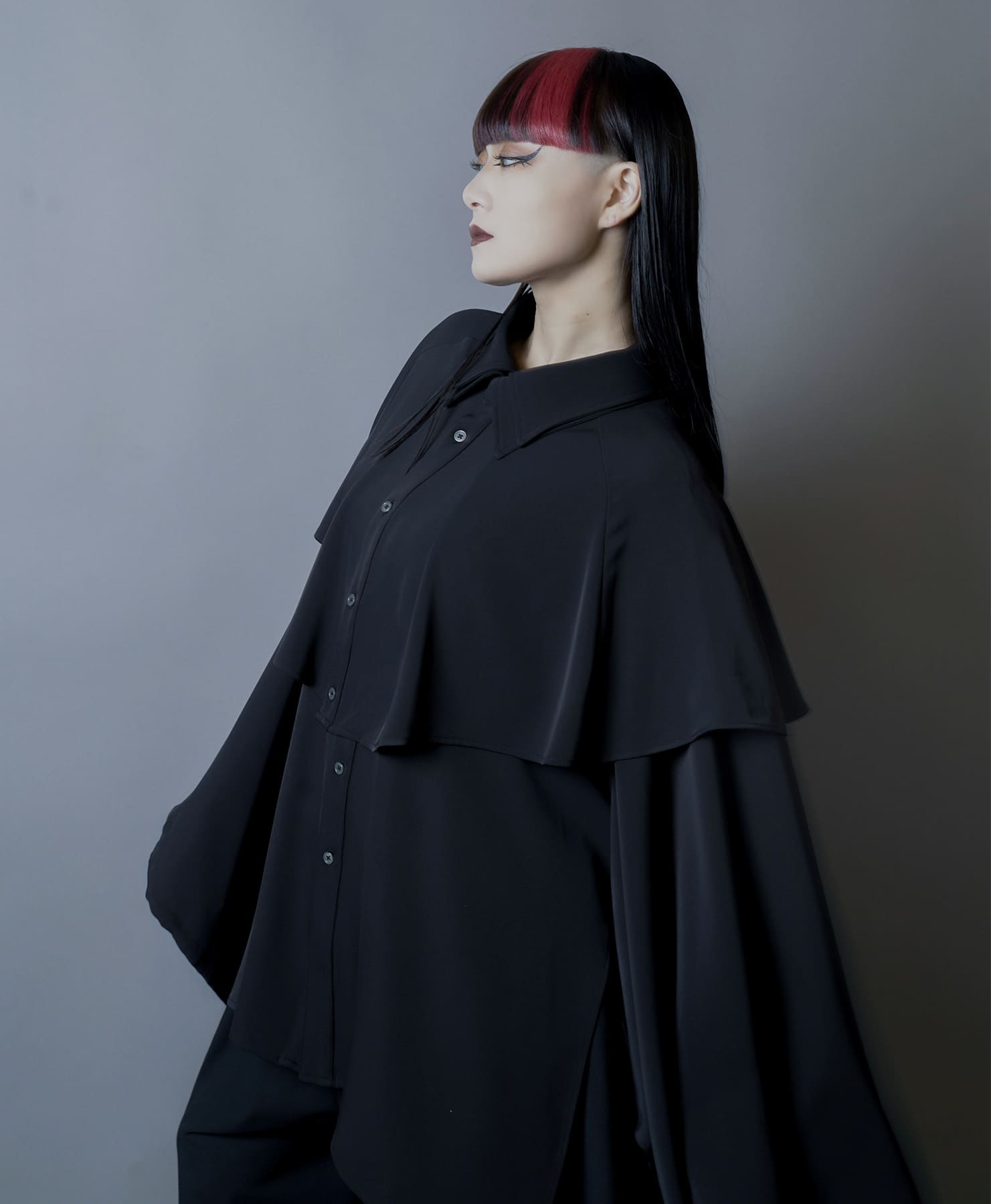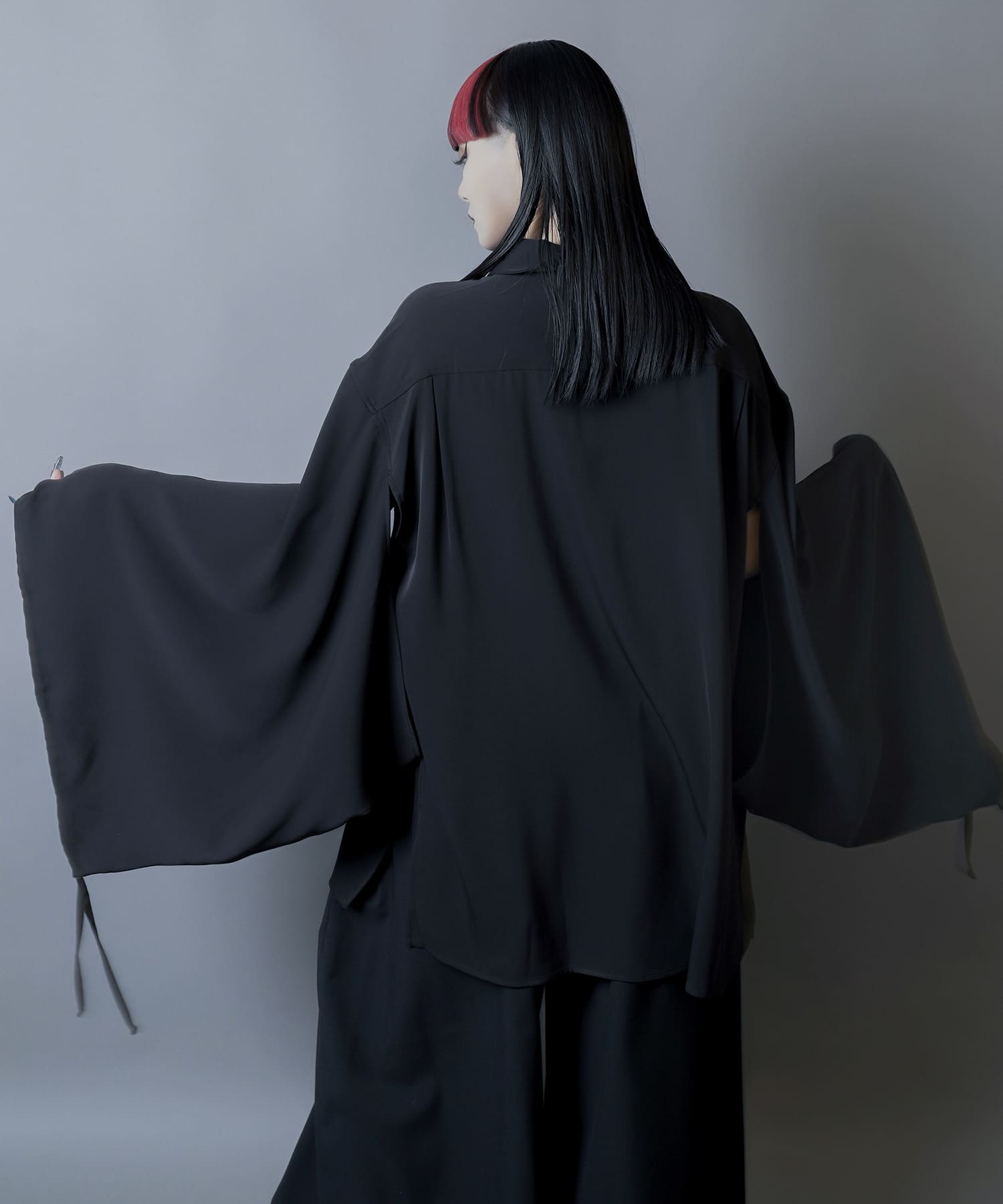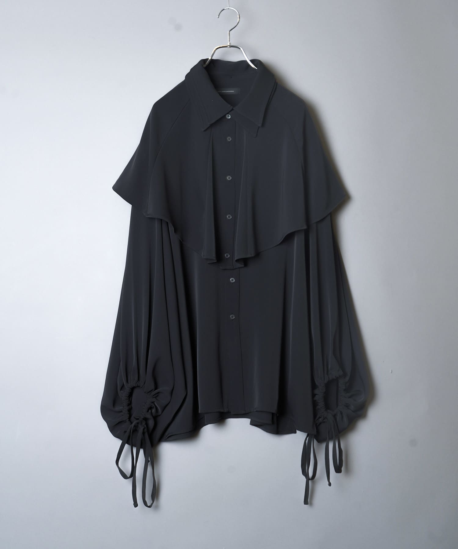 Umbrella cape kimono shirt made of NOT's original satin fabric. It is made of a thick satin fabric that is pleasant to the touch and has a sheen and drape. This season, it has been updated with a detachable cape, transforming it into a kimono shirt unlike any other. The cape is designed to resemble an umbrella, and while it is made of a symbiotic fabric with the body, it has a different appearance depending on the angle. This is a unisex item. The cuffs can be transformed by threading a string through the cuffs, and this piece allows you to enjoy both the straight lines of a kimono and the round baroon silhouette.