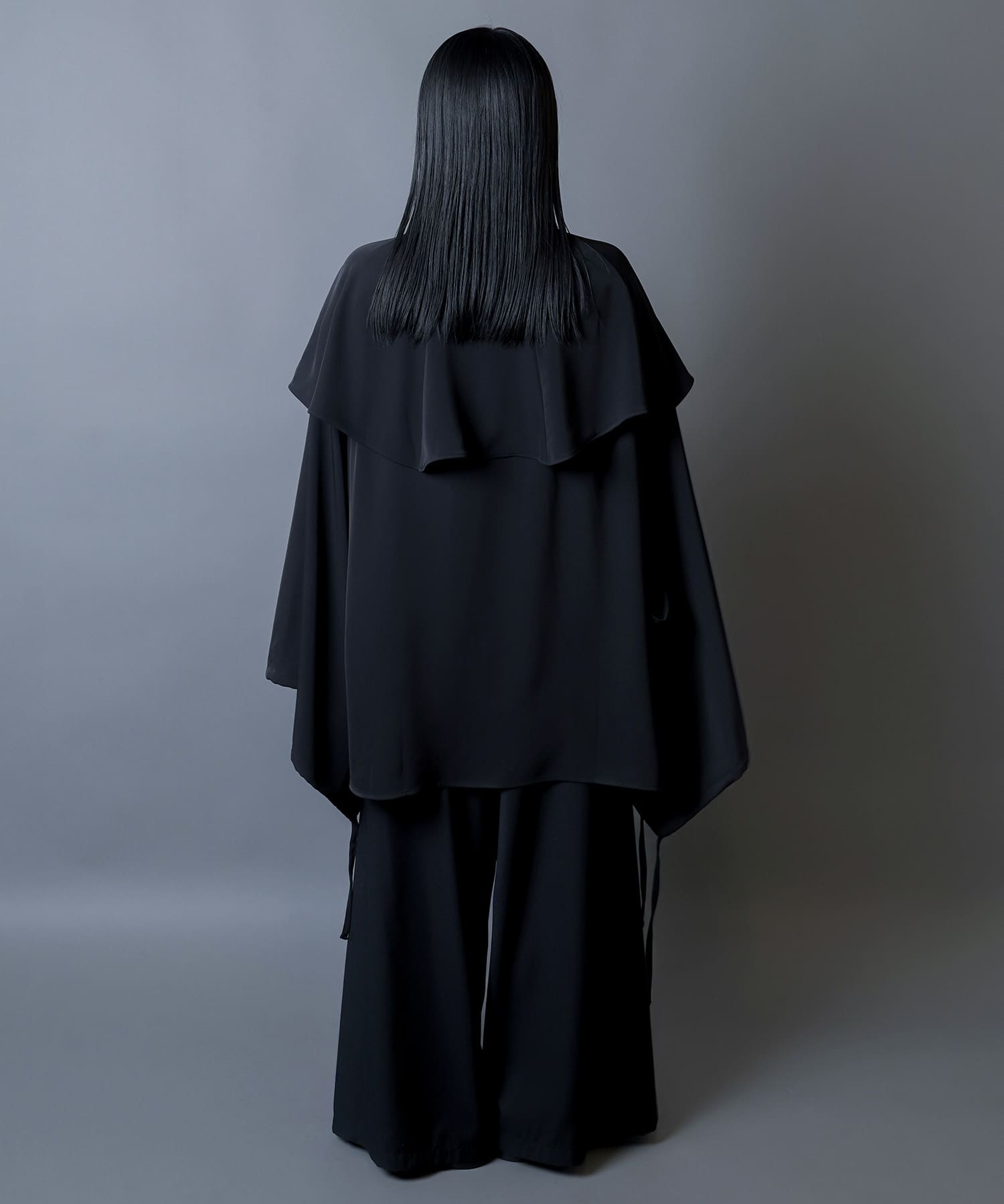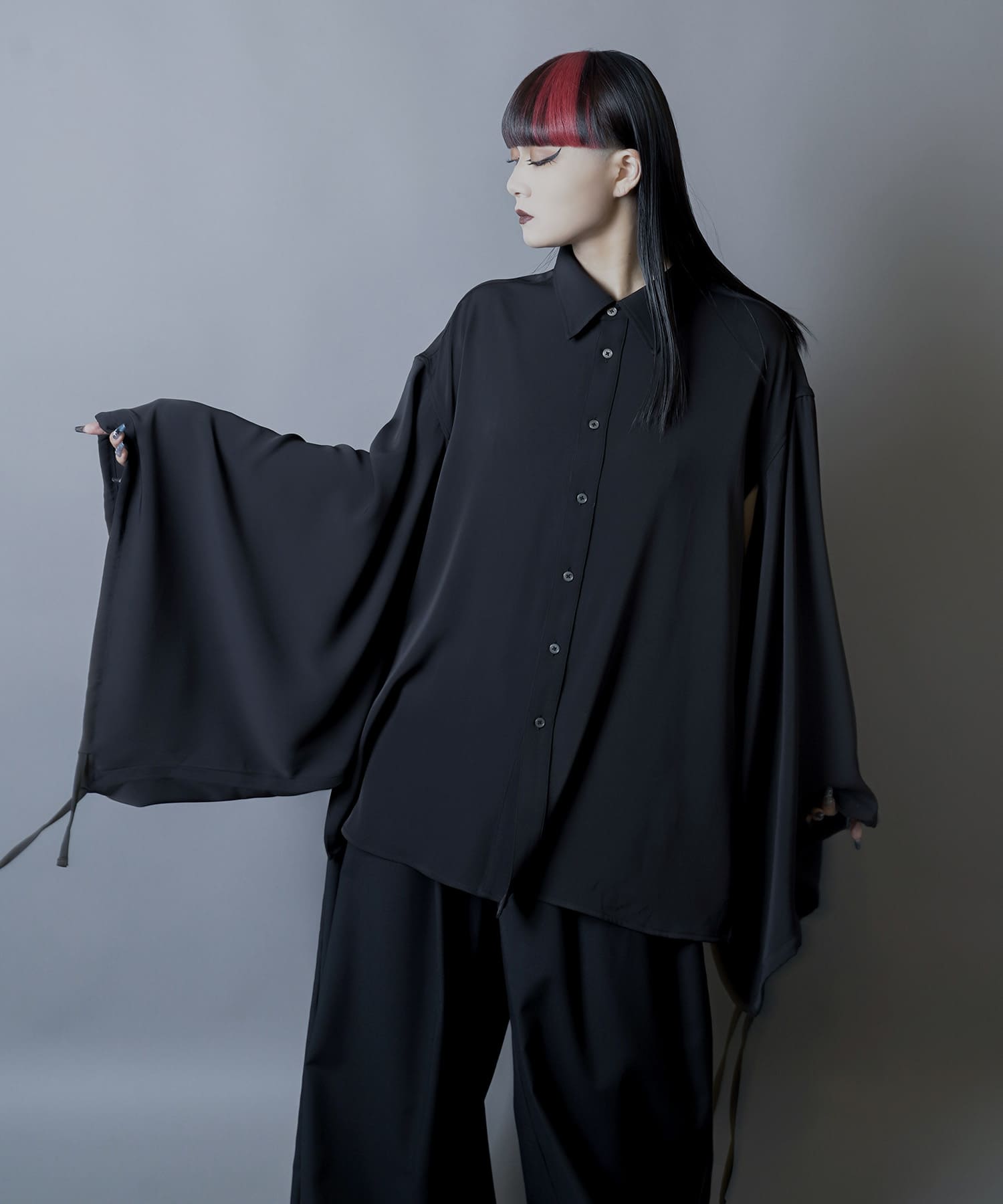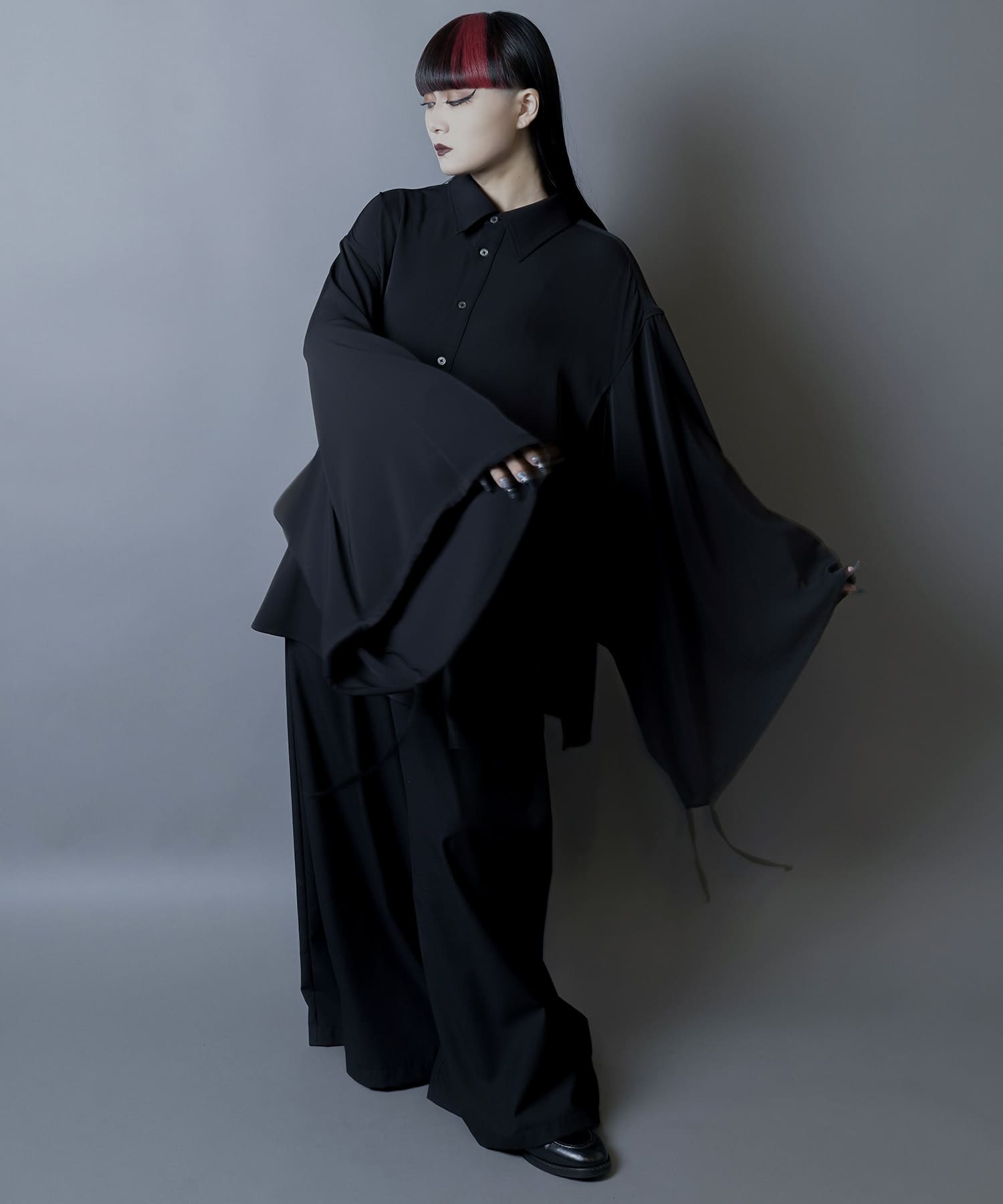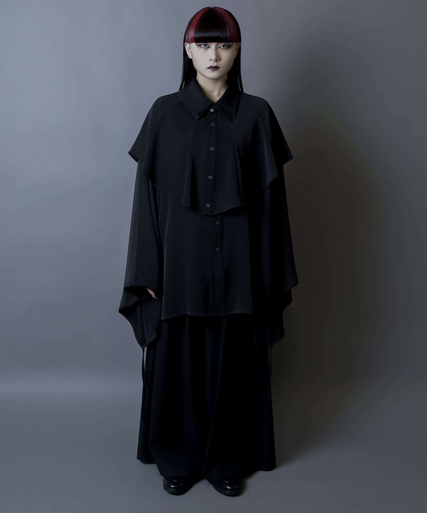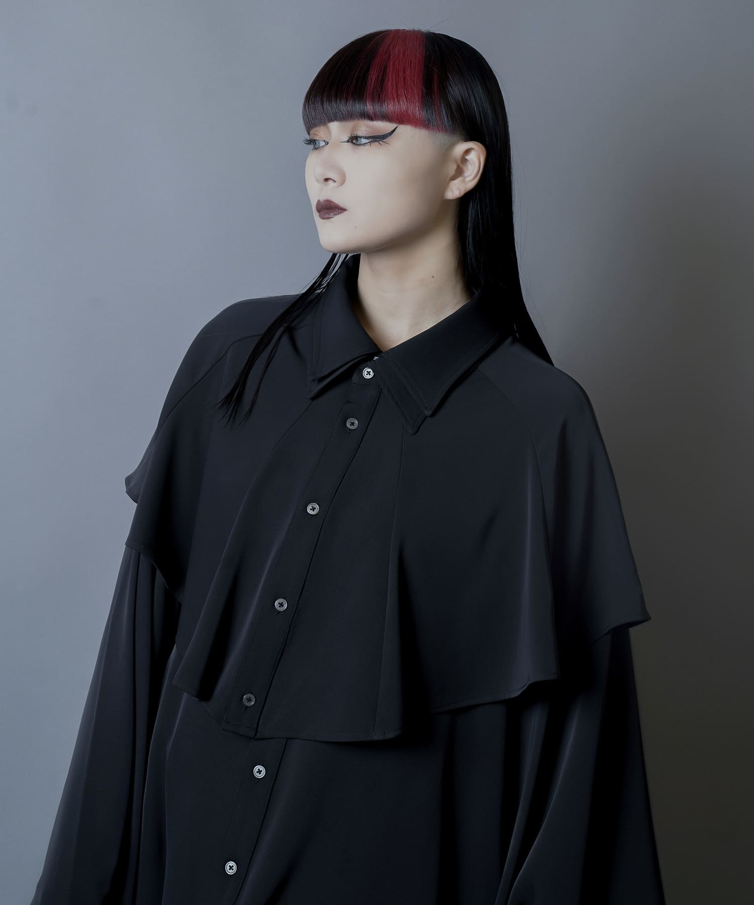 Umbrella cape kimono shirt made of NOT's original satin fabric. It is made of a thick satin fabric that is pleasant to the touch and has a sheen and drape. This season, it has been updated with a detachable cape, transforming it into a kimono shirt unlike any other. The cape is designed to resemble an umbrella, and while it is made of a symbiotic fabric with the body, it has a different appearance depending on the angle. This is a unisex item. The cuffs can be transformed by threading a string through the cuffs, and this piece allows you to enjoy both the straight lines of a kimono and the round baroon silhouette.