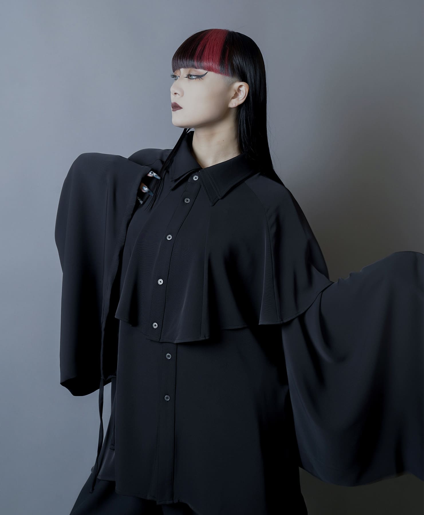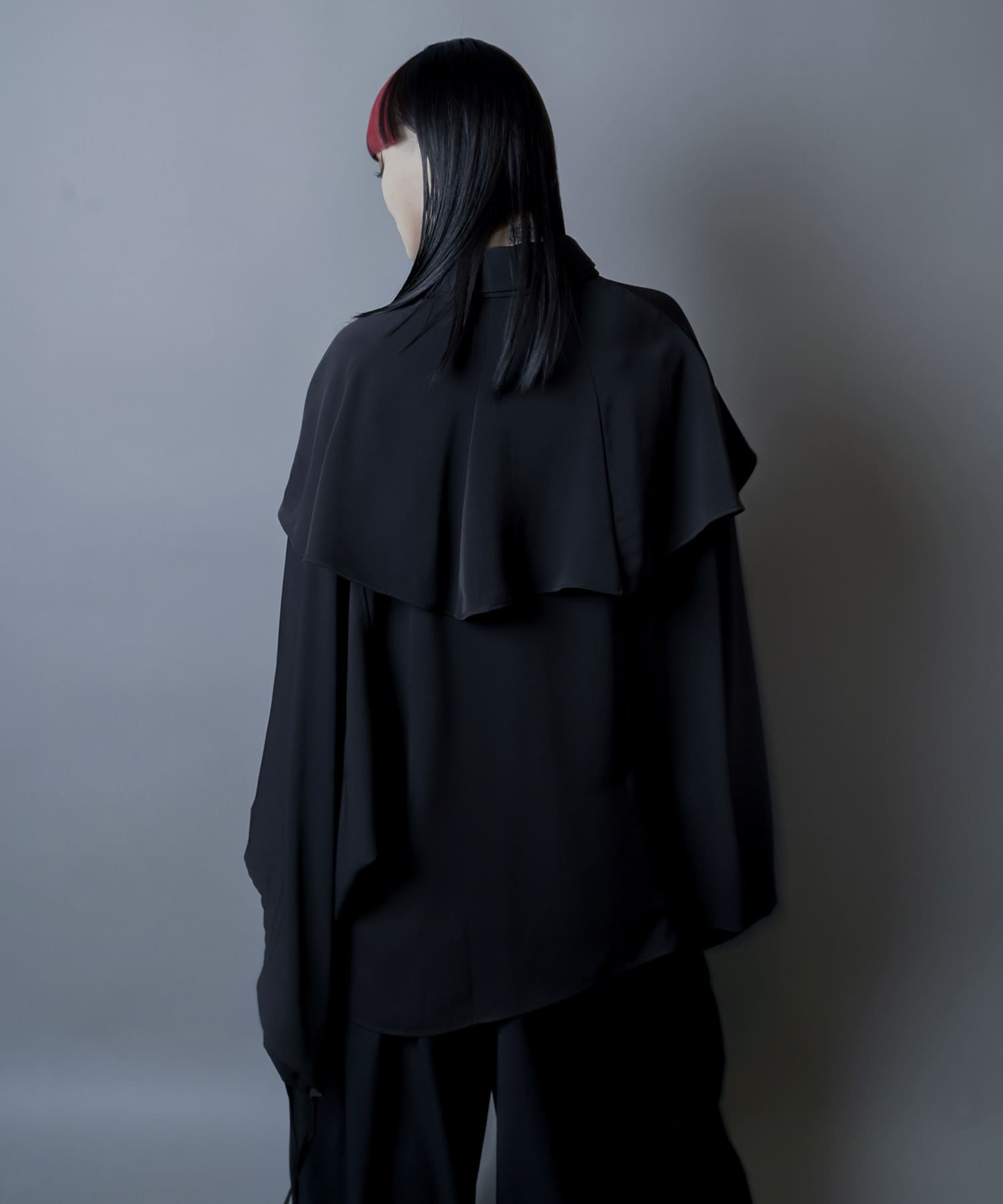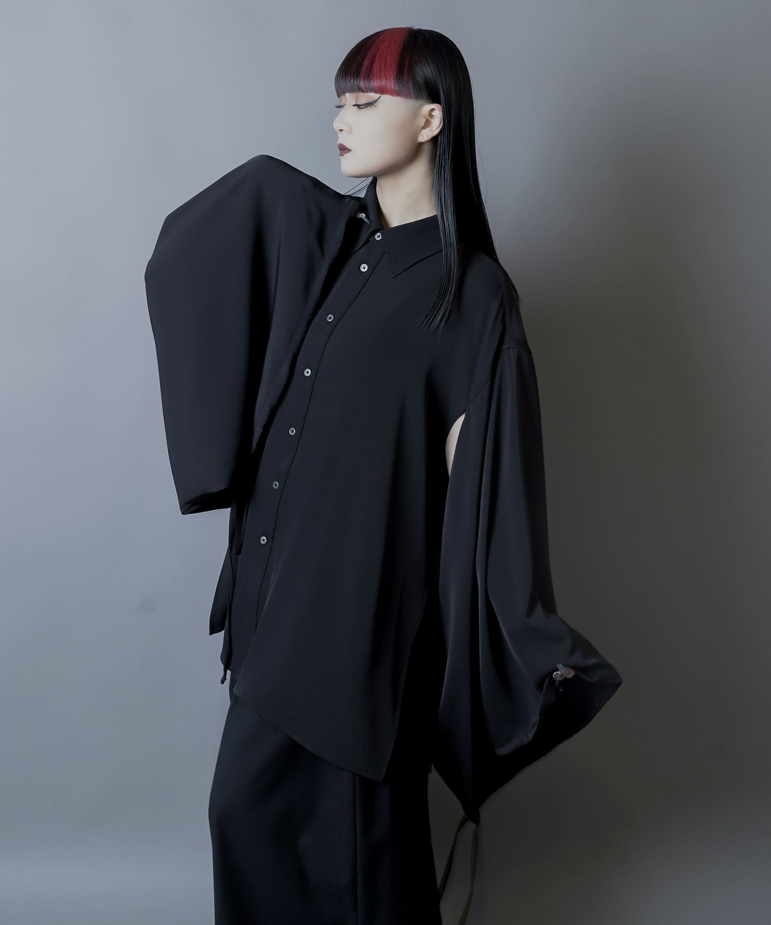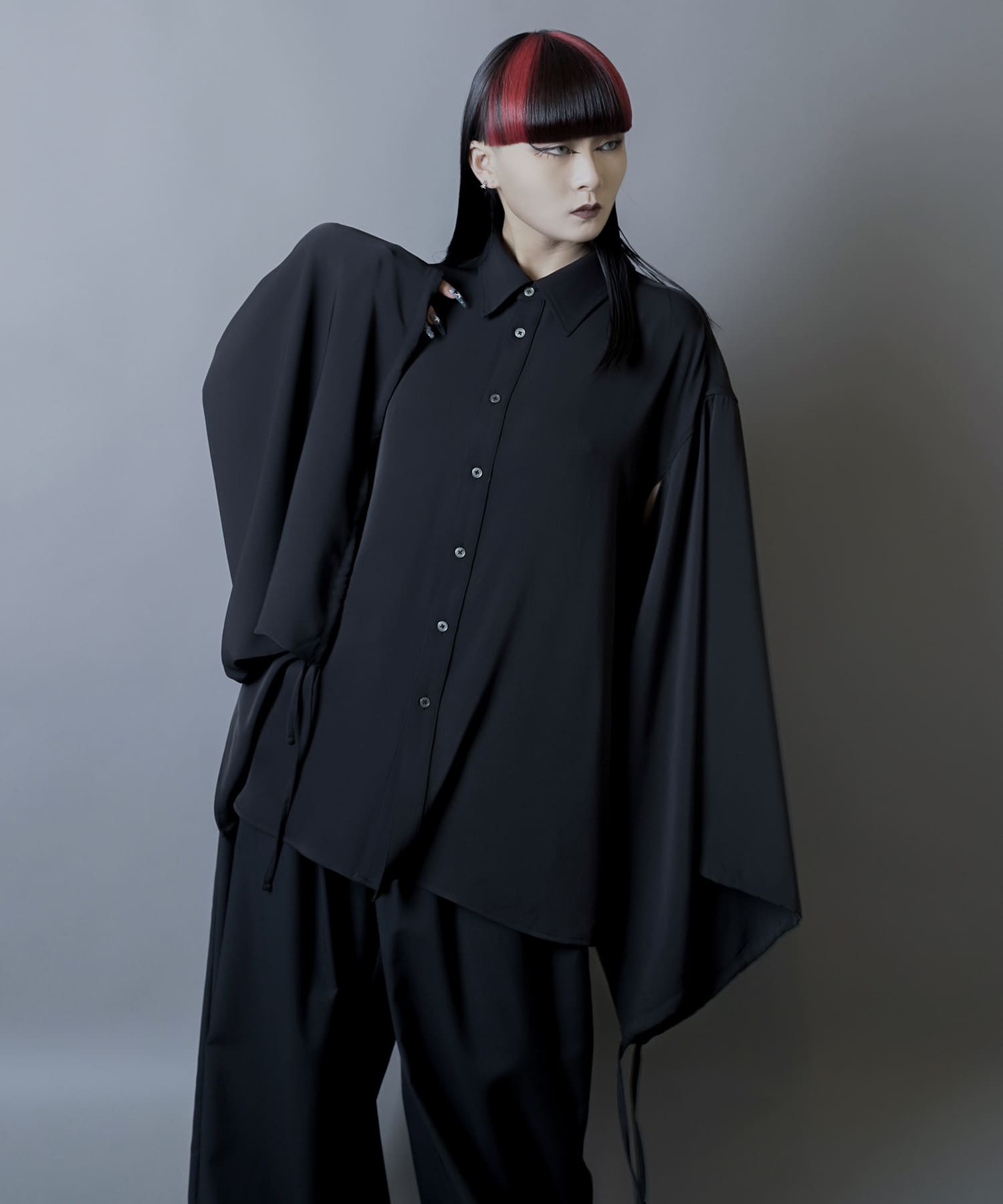Umbrella cape kimono shirt made of NOT's original satin fabric. It is made of a thick satin fabric that is pleasant to the touch and has a sheen and drape. This season, it has been updated with a detachable cape, transforming it into a kimono shirt unlike any other. The cape is designed to resemble an umbrella, and while it is made of a symbiotic fabric with the body, it has a different appearance depending on the angle. This is a unisex item. The cuffs can be transformed by threading a string through the cuffs, and this piece allows you to enjoy both the straight lines of a kimono and the round baroon silhouette.