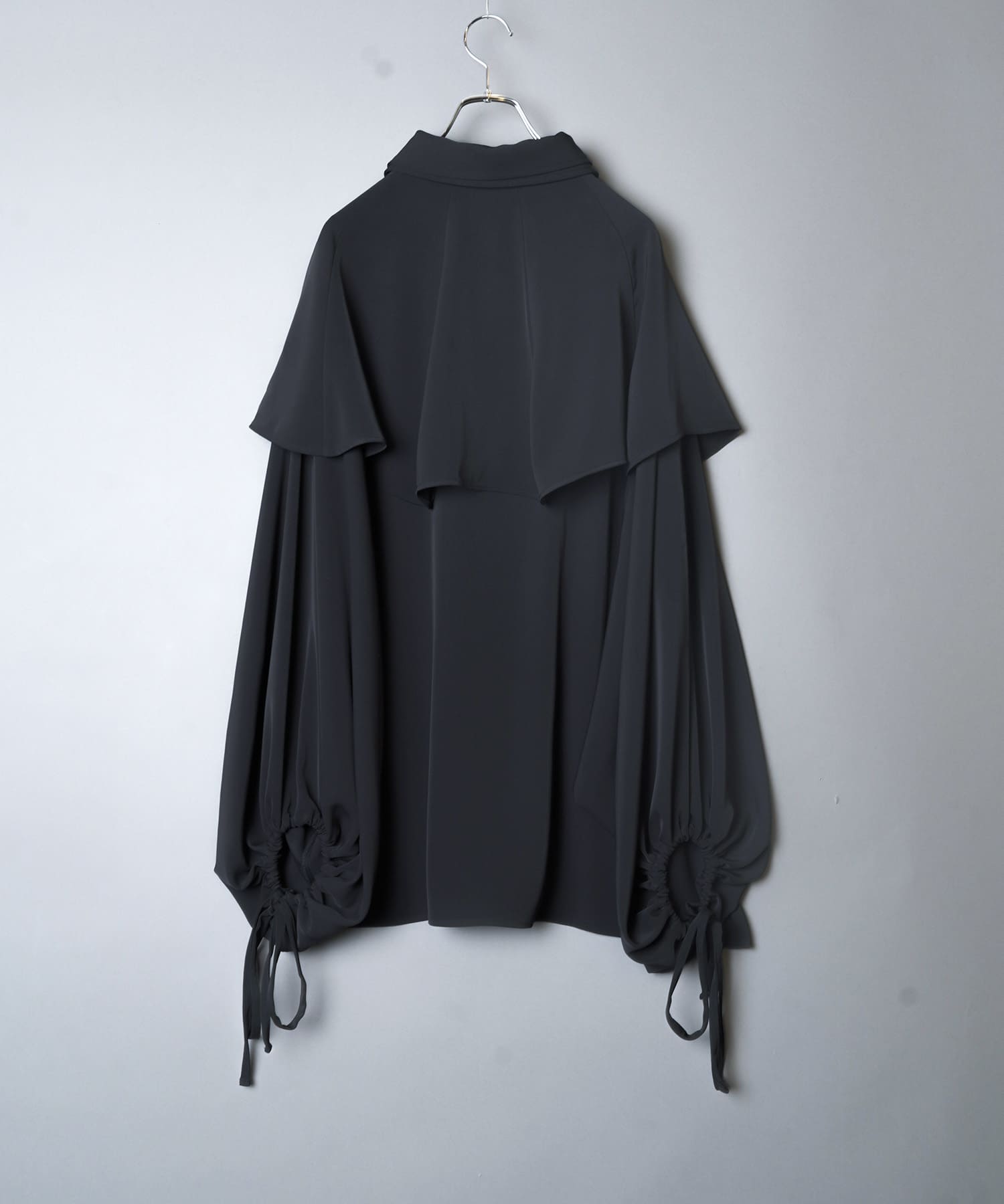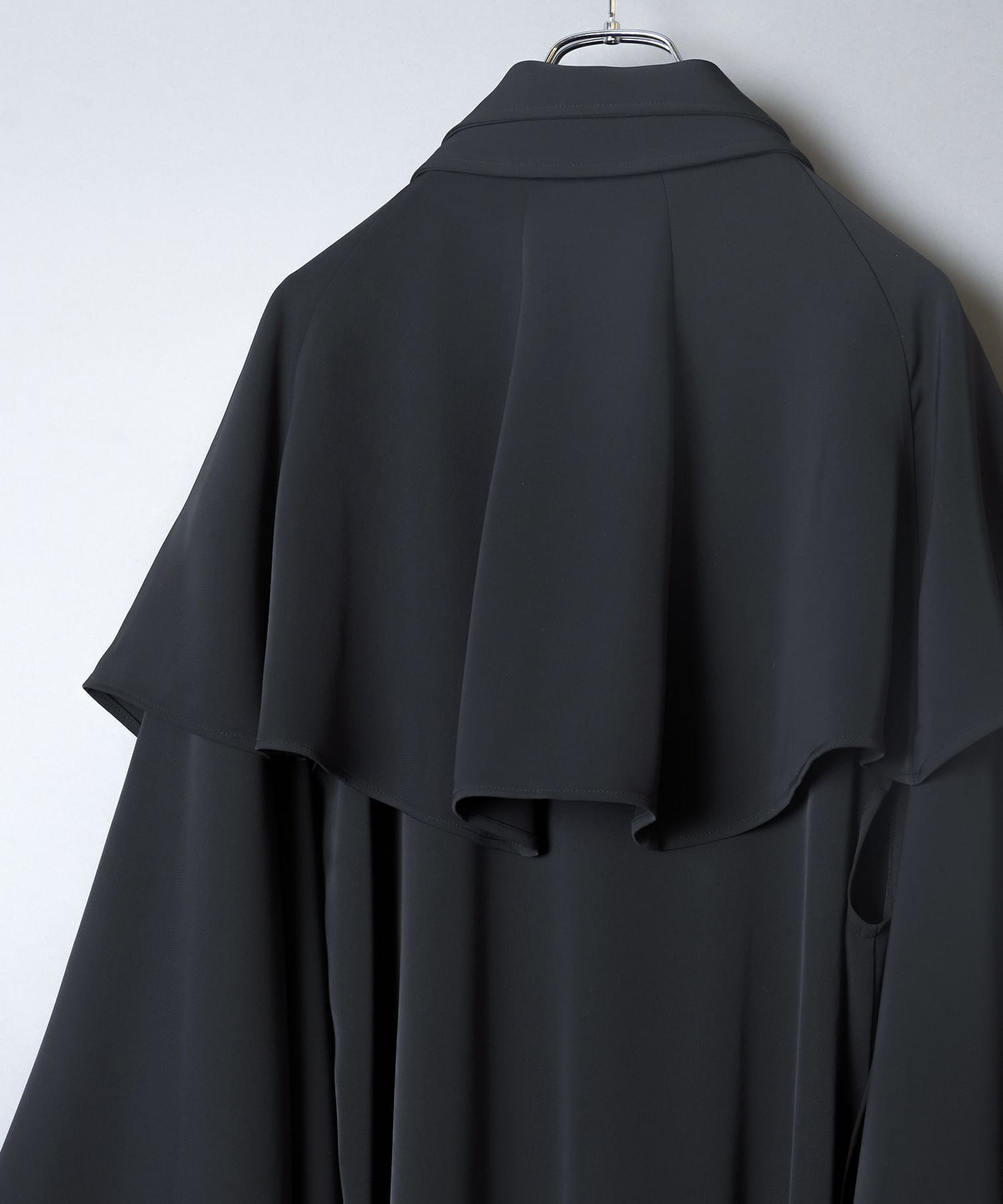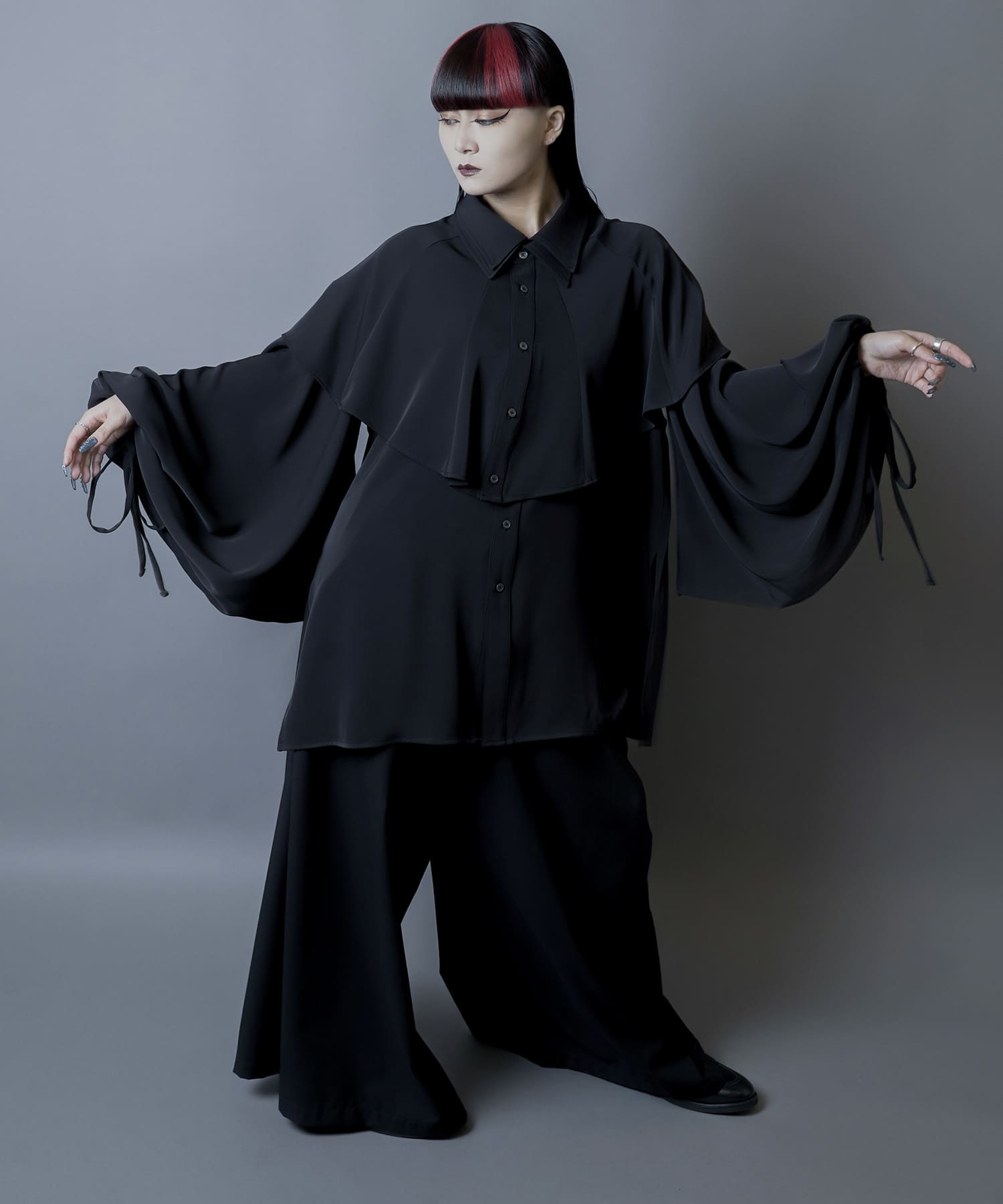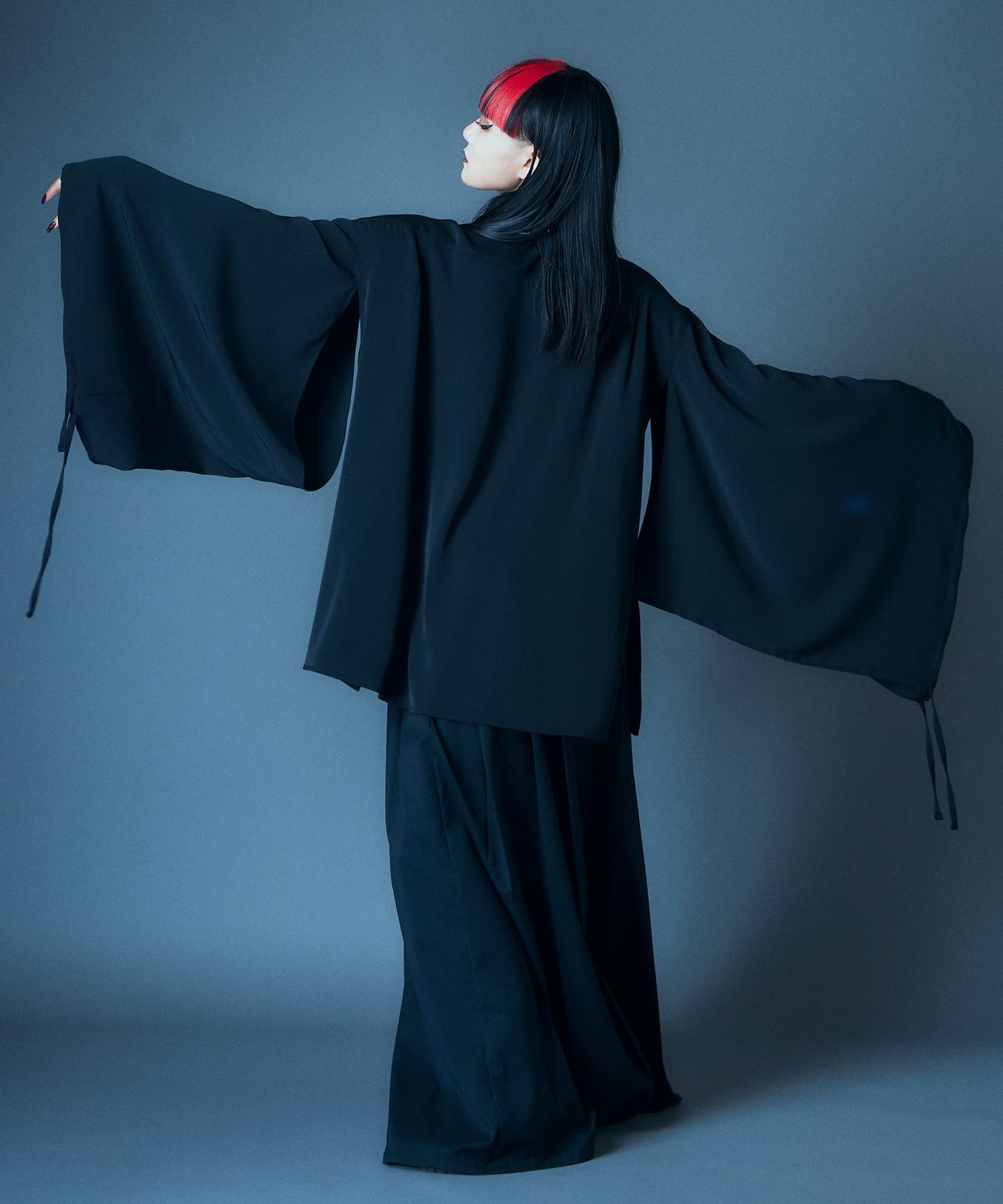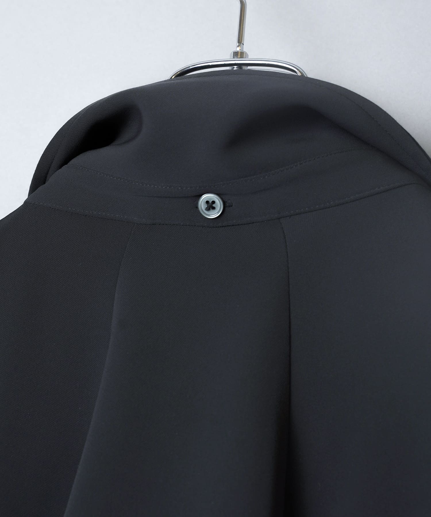 Umbrella cape kimono shirt made of NOT's original satin fabric. It is made of a thick satin fabric that is pleasant to the touch and has a sheen and drape. This season, it has been updated with a detachable cape, transforming it into a kimono shirt unlike any other. The cape is designed to resemble an umbrella, and while it is made of a symbiotic fabric with the body, it has a different appearance depending on the angle. This is a unisex item. The cuffs can be transformed by threading a string through the cuffs, and this piece allows you to enjoy both the straight lines of a kimono and the round baroon silhouette.