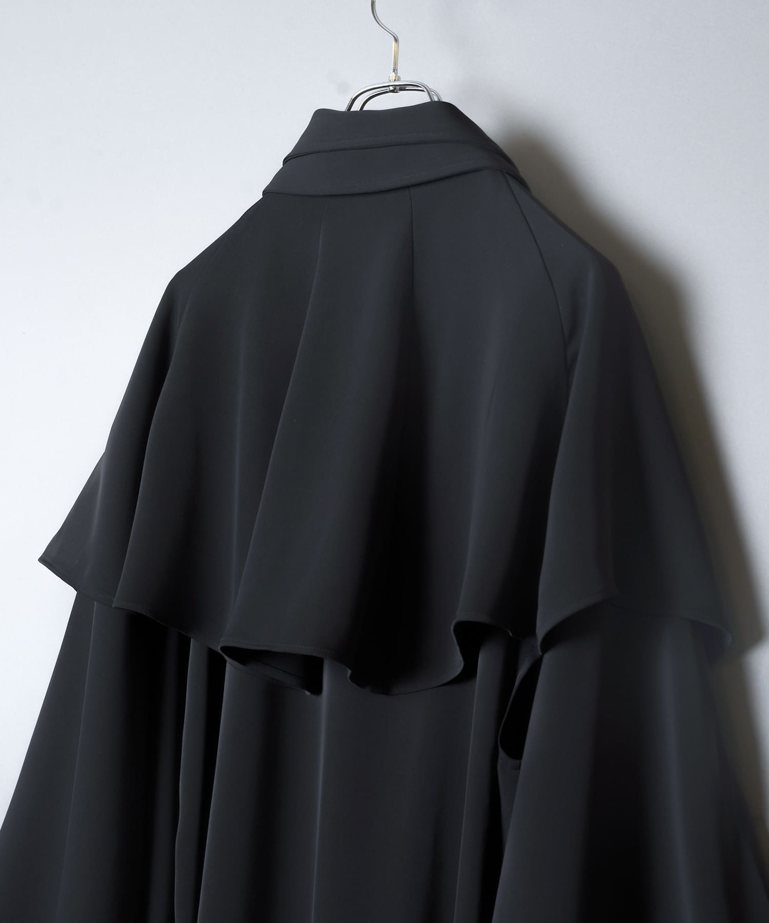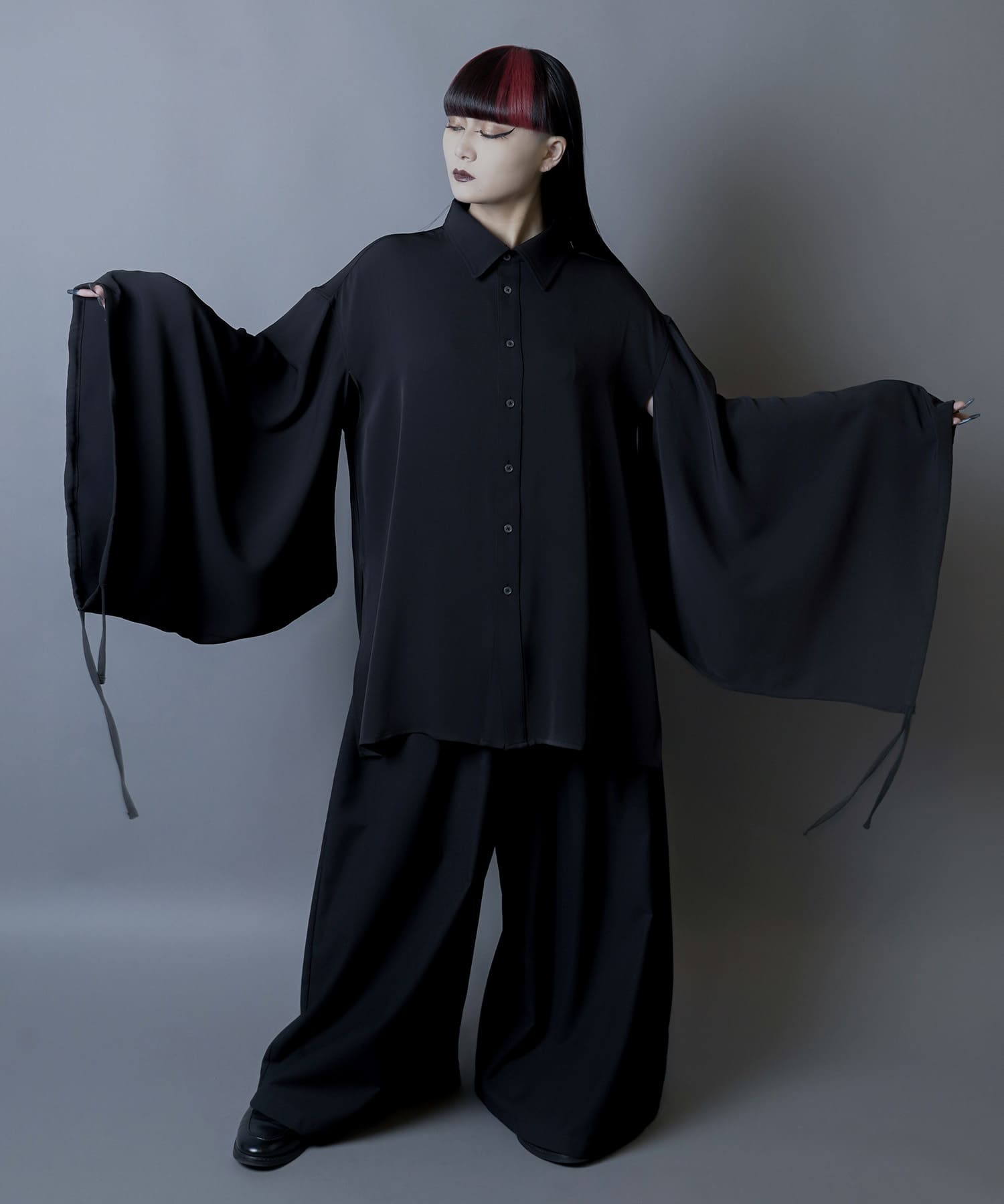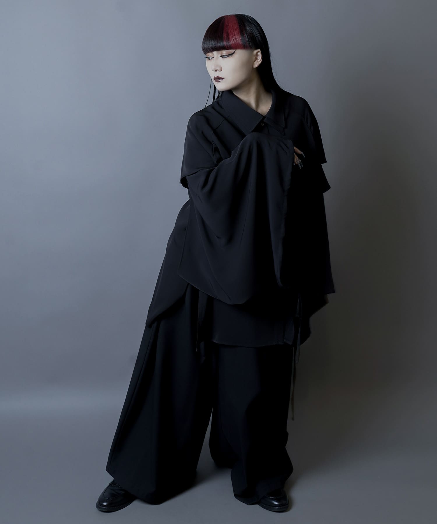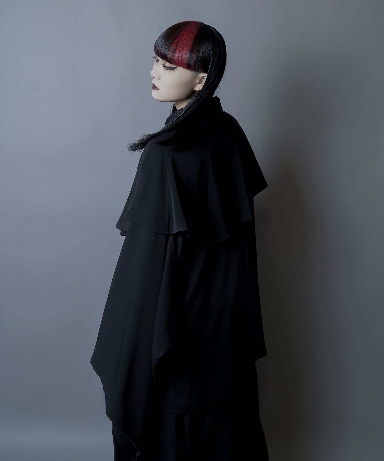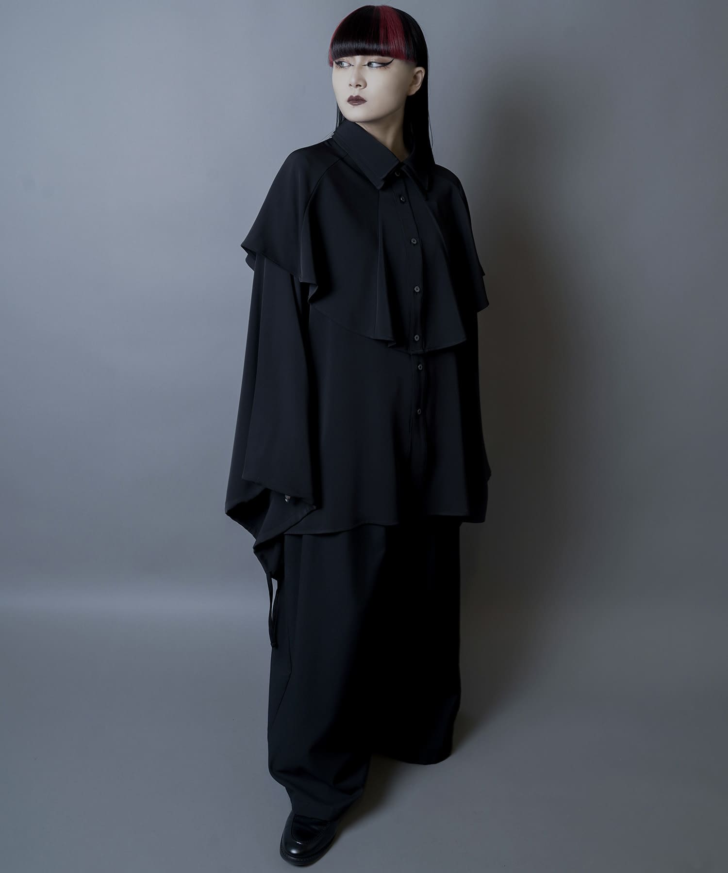 Umbrella cape kimono shirt made of NOT's original satin fabric. It is made of a thick satin fabric that is pleasant to the touch and has a sheen and drape. This season, it has been updated with a detachable cape, transforming it into a kimono shirt unlike any other. The cape is designed to resemble an umbrella, and while it is made of a symbiotic fabric with the body, it has a different appearance depending on the angle. This is a unisex item. The cuffs can be transformed by threading a string through the cuffs, and this piece allows you to enjoy both the straight lines of a kimono and the round baroon silhouette.