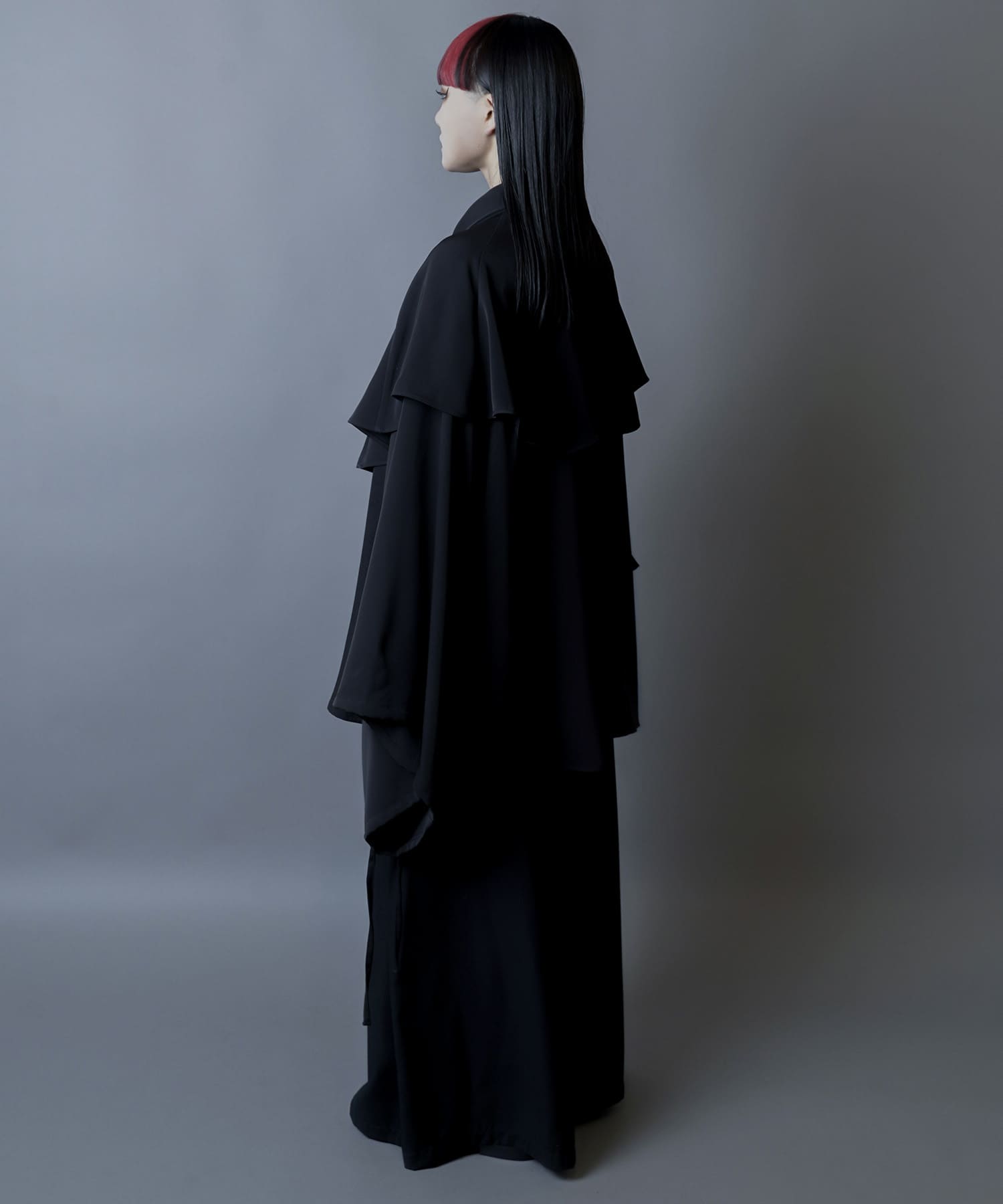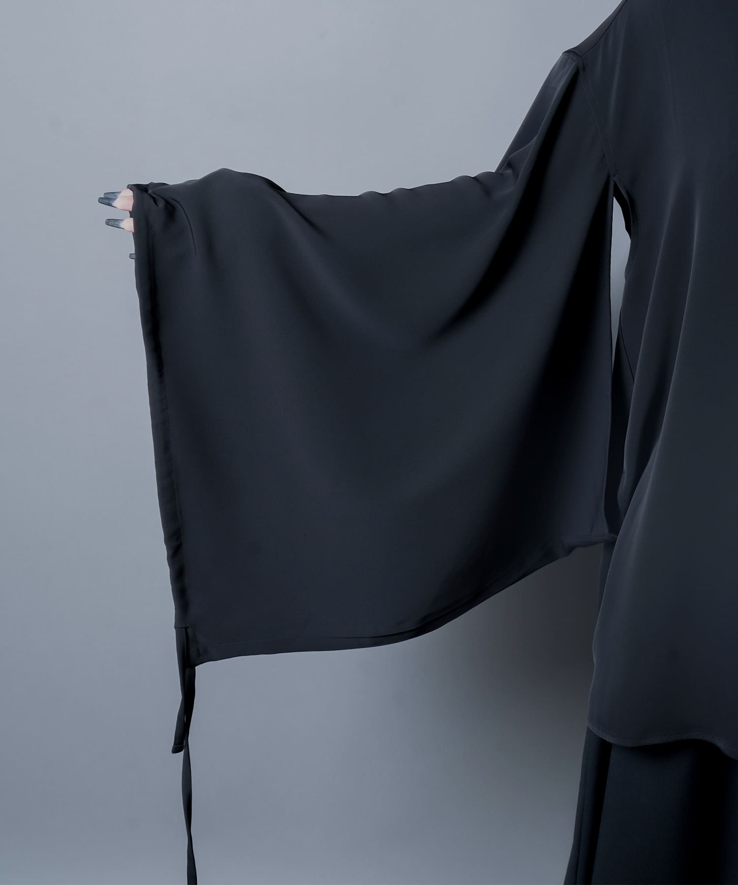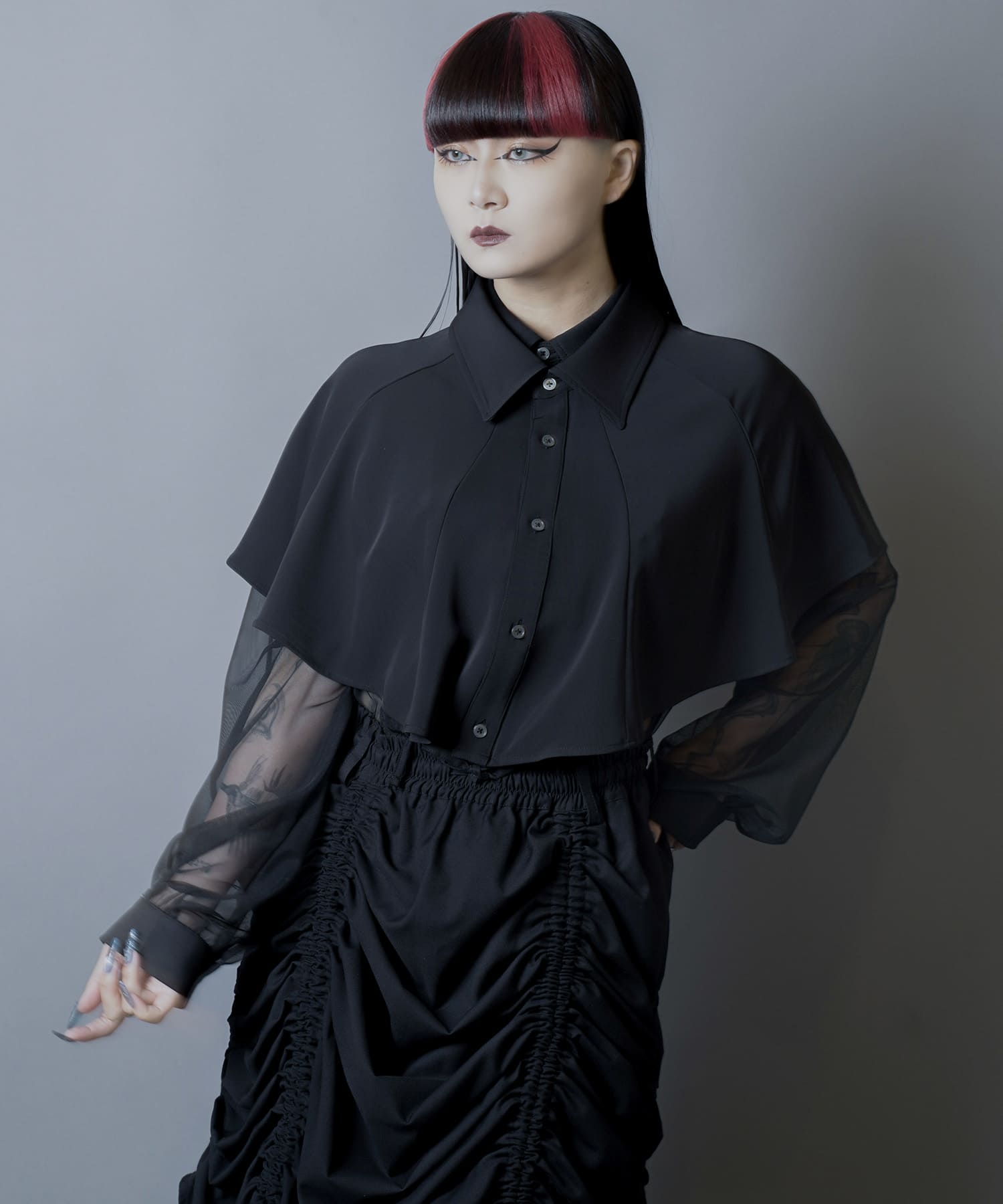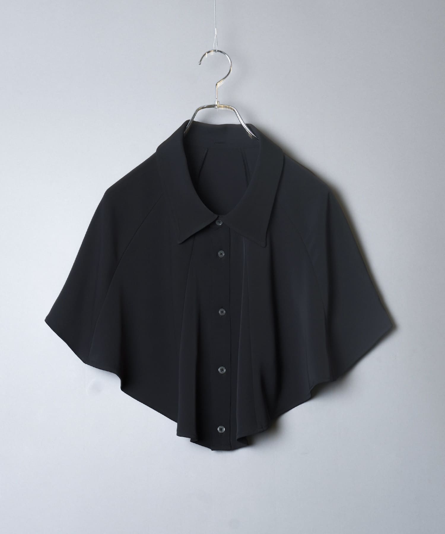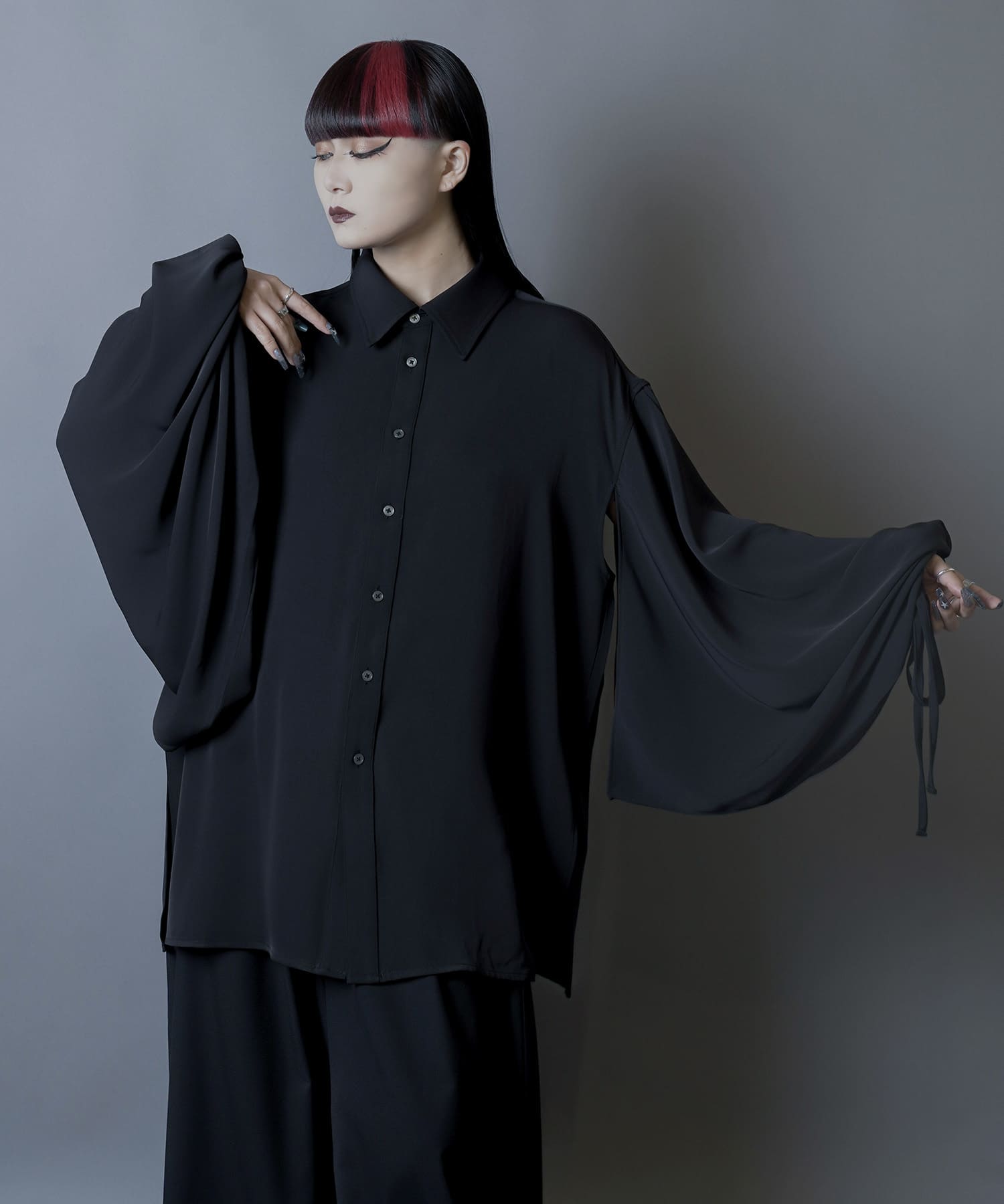 Umbrella cape kimono shirt made of NOT's original satin fabric. It is made of a thick satin fabric that is pleasant to the touch and has a sheen and drape. This season, it has been updated with a detachable cape, transforming it into a kimono shirt unlike any other. The cape is designed to resemble an umbrella, and while it is made of a symbiotic fabric with the body, it has a different appearance depending on the angle. This is a unisex item. The cuffs can be transformed by threading a string through the cuffs, and this piece allows you to enjoy both the straight lines of a kimono and the round baroon silhouette.