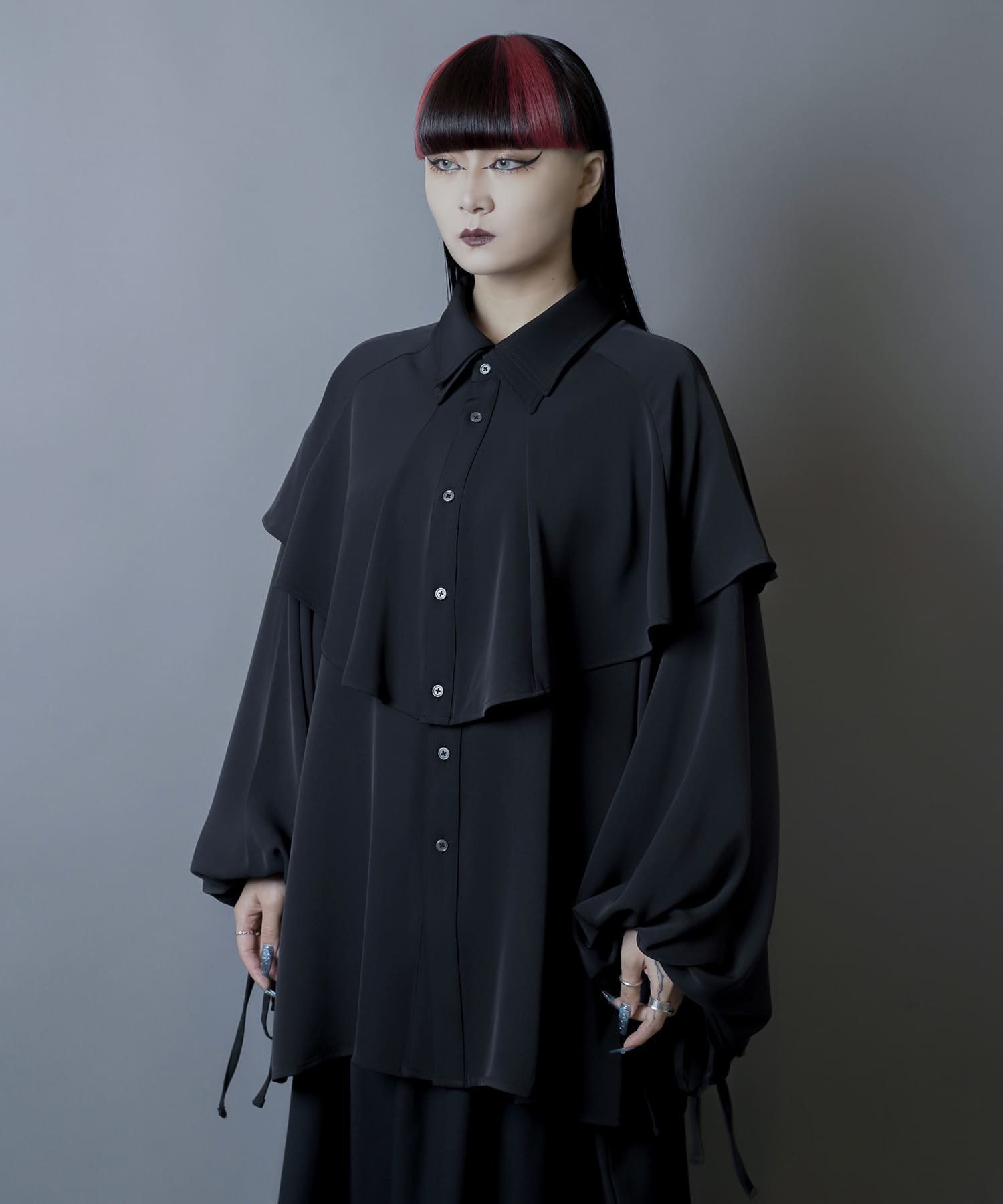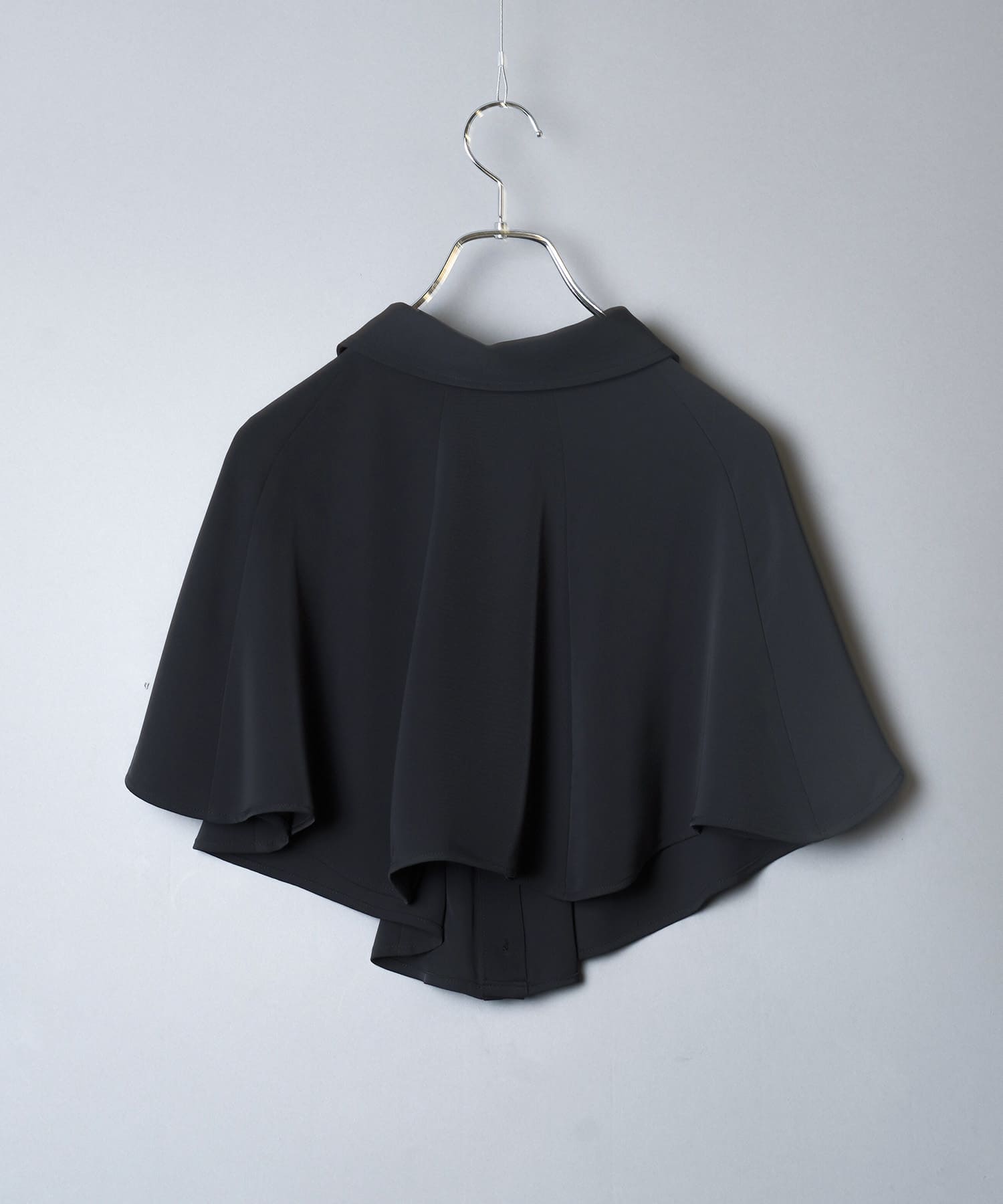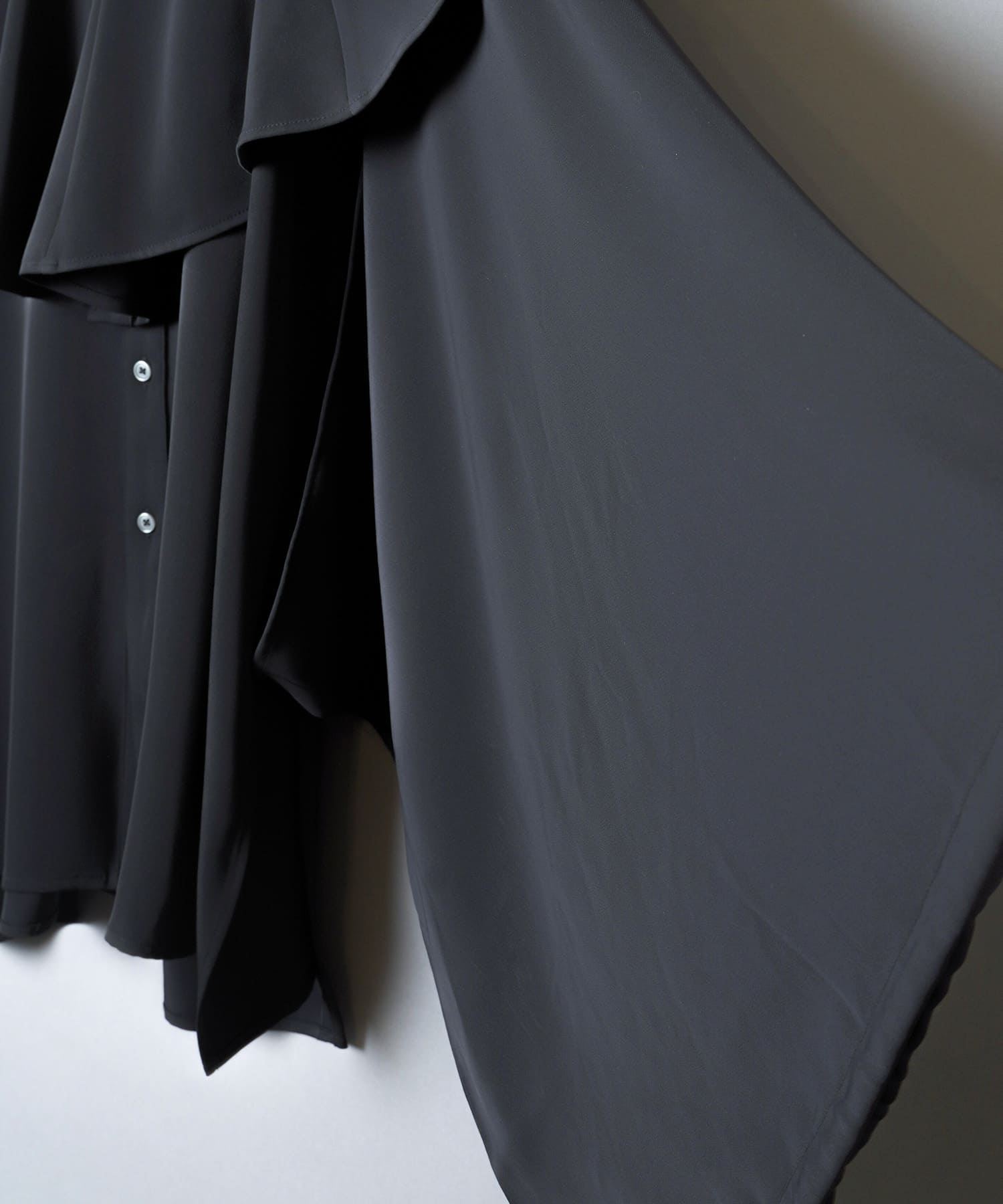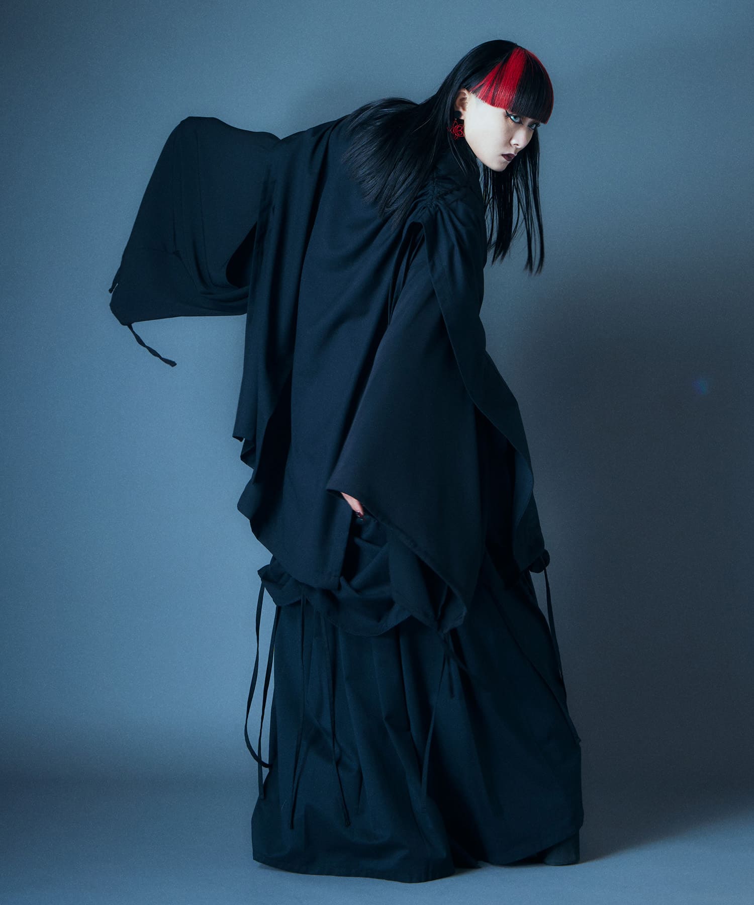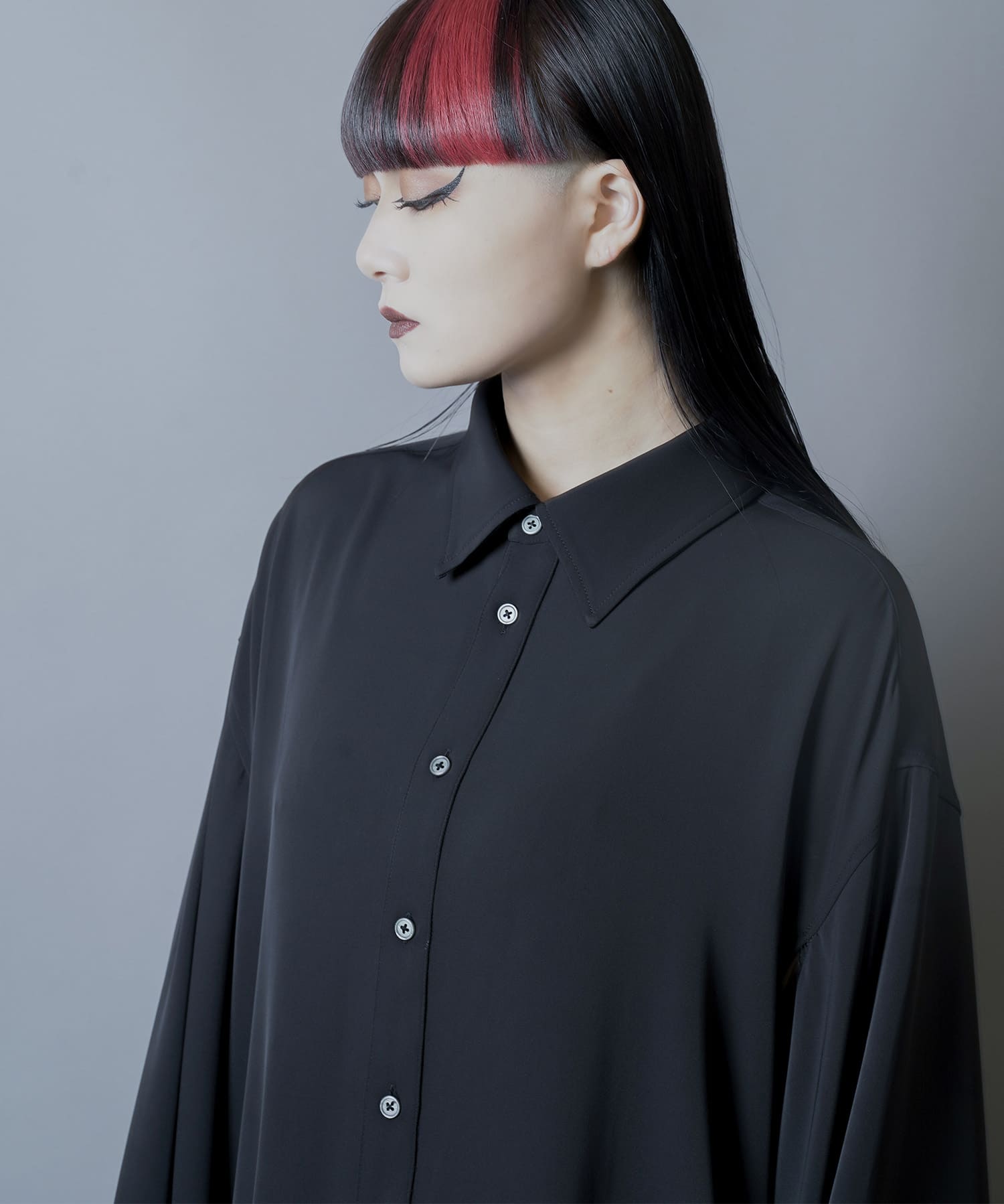 Umbrella cape kimono shirt made of NOT's original satin fabric. It is made of a thick satin fabric that is pleasant to the touch and has a sheen and drape. This season, it has been updated with a detachable cape, transforming it into a kimono shirt unlike any other. The cape is designed to resemble an umbrella, and while it is made of a symbiotic fabric with the body, it has a different appearance depending on the angle. This is a unisex item. The cuffs can be transformed by threading a string through the cuffs, and this piece allows you to enjoy both the straight lines of a kimono and the round baroon silhouette.