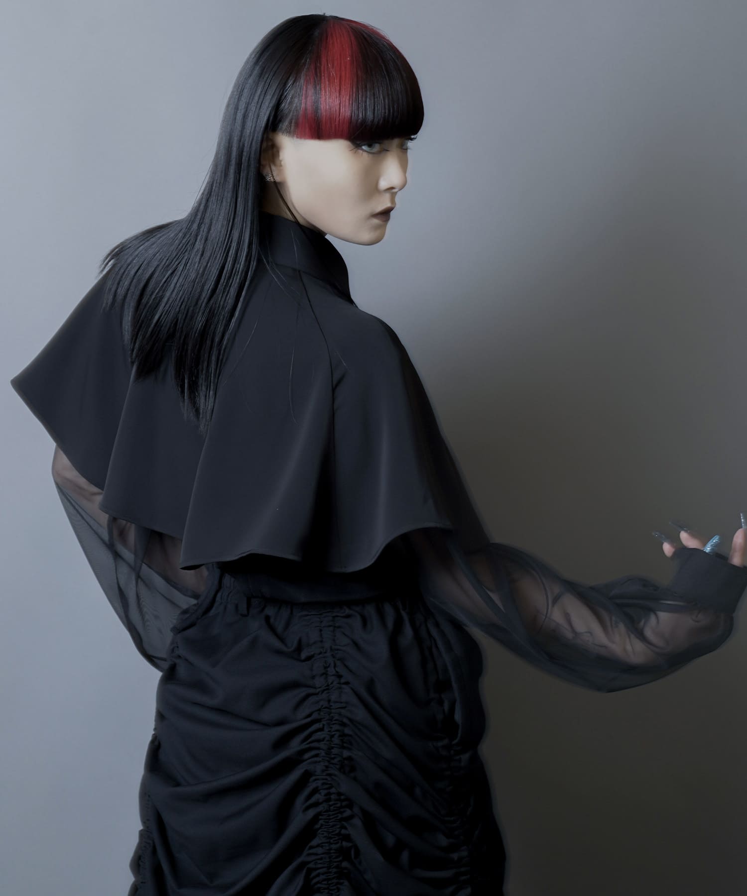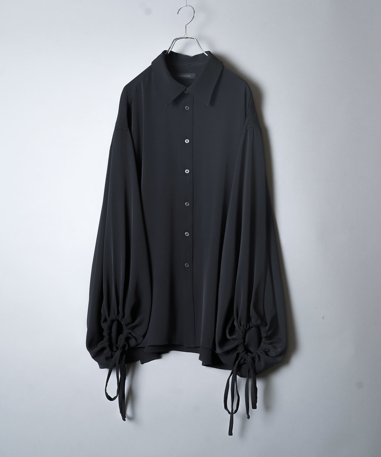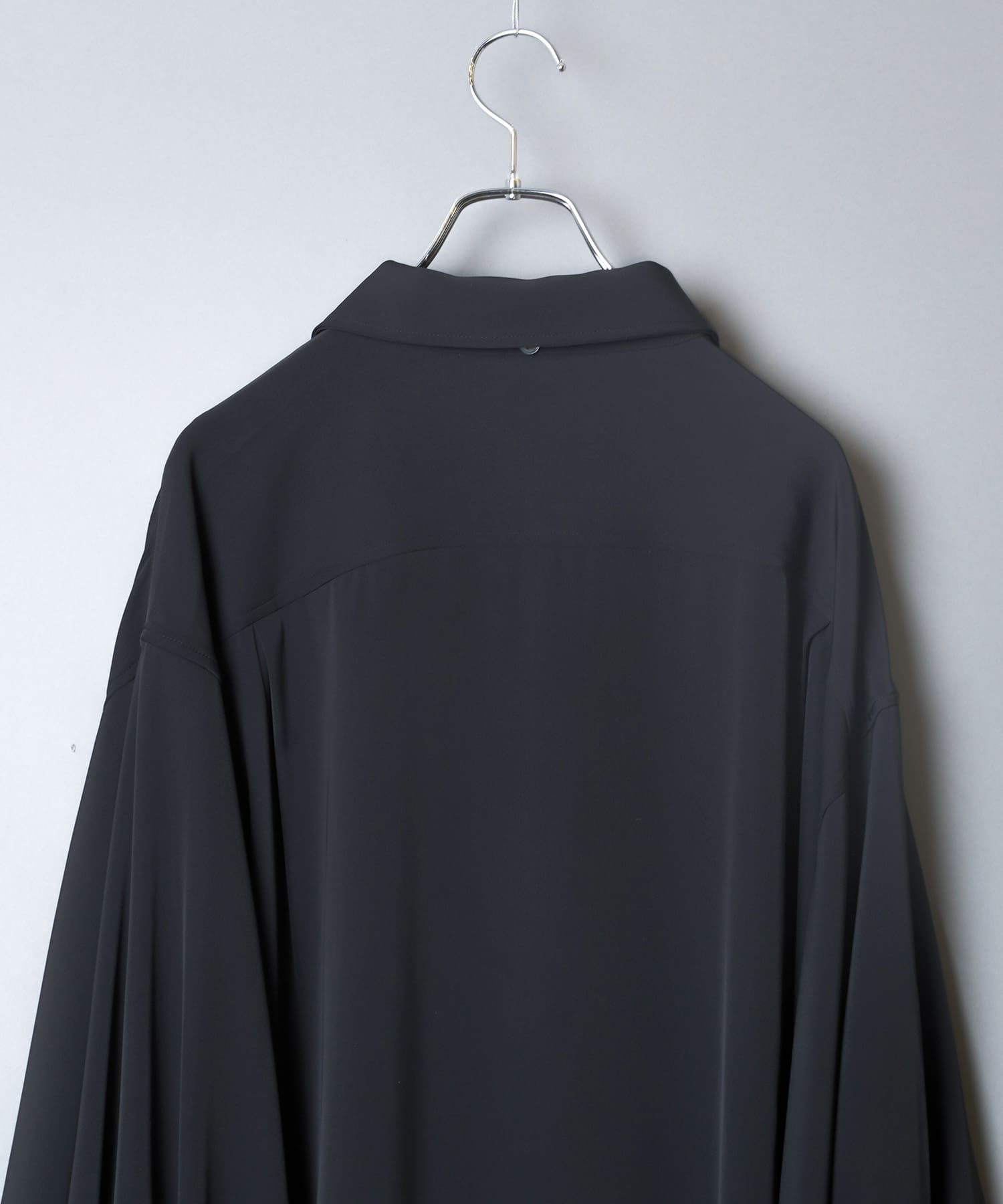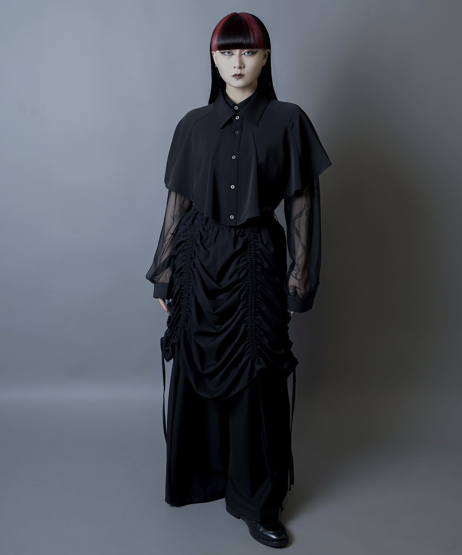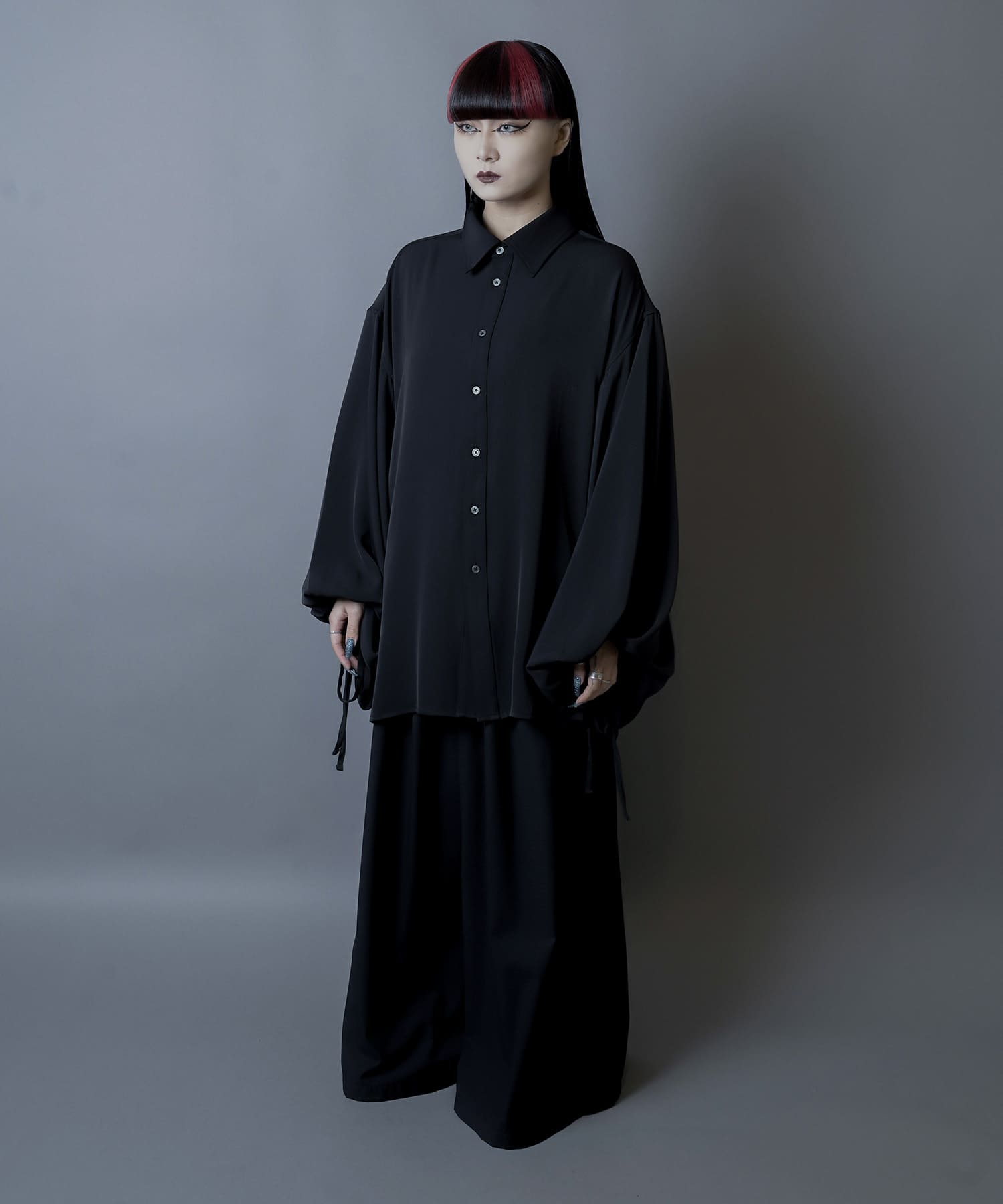 Umbrella cape kimono shirt made of NOT's original satin fabric. It is made of a thick satin fabric that is pleasant to the touch and has a sheen and drape. This season, it has been updated with a detachable cape, transforming it into a kimono shirt unlike any other. The cape is designed to resemble an umbrella, and while it is made of a symbiotic fabric with the body, it has a different appearance depending on the angle. This is a unisex item. The cuffs can be transformed by threading a string through the cuffs, and this piece allows you to enjoy both the straight lines of a kimono and the round baroon silhouette.