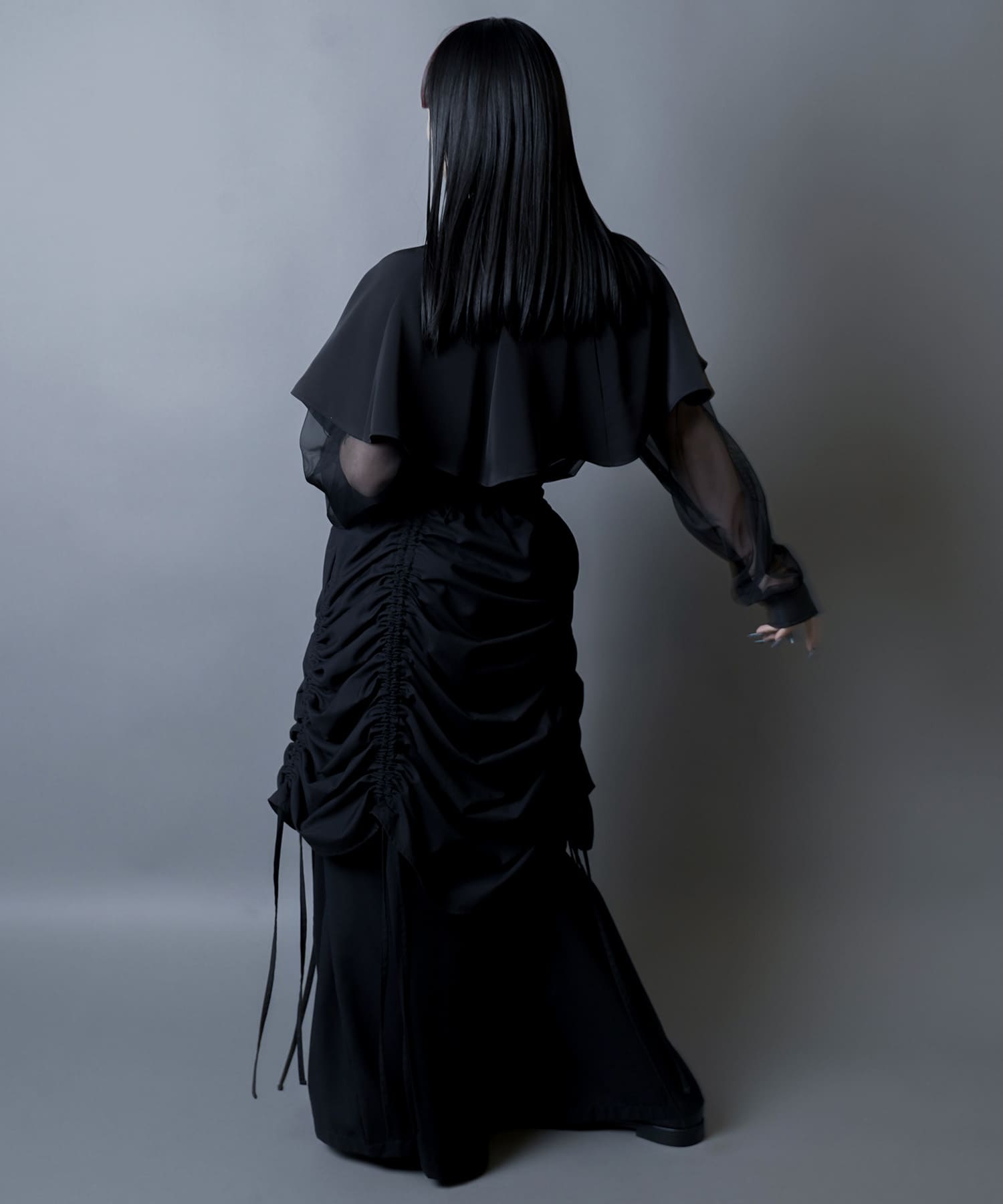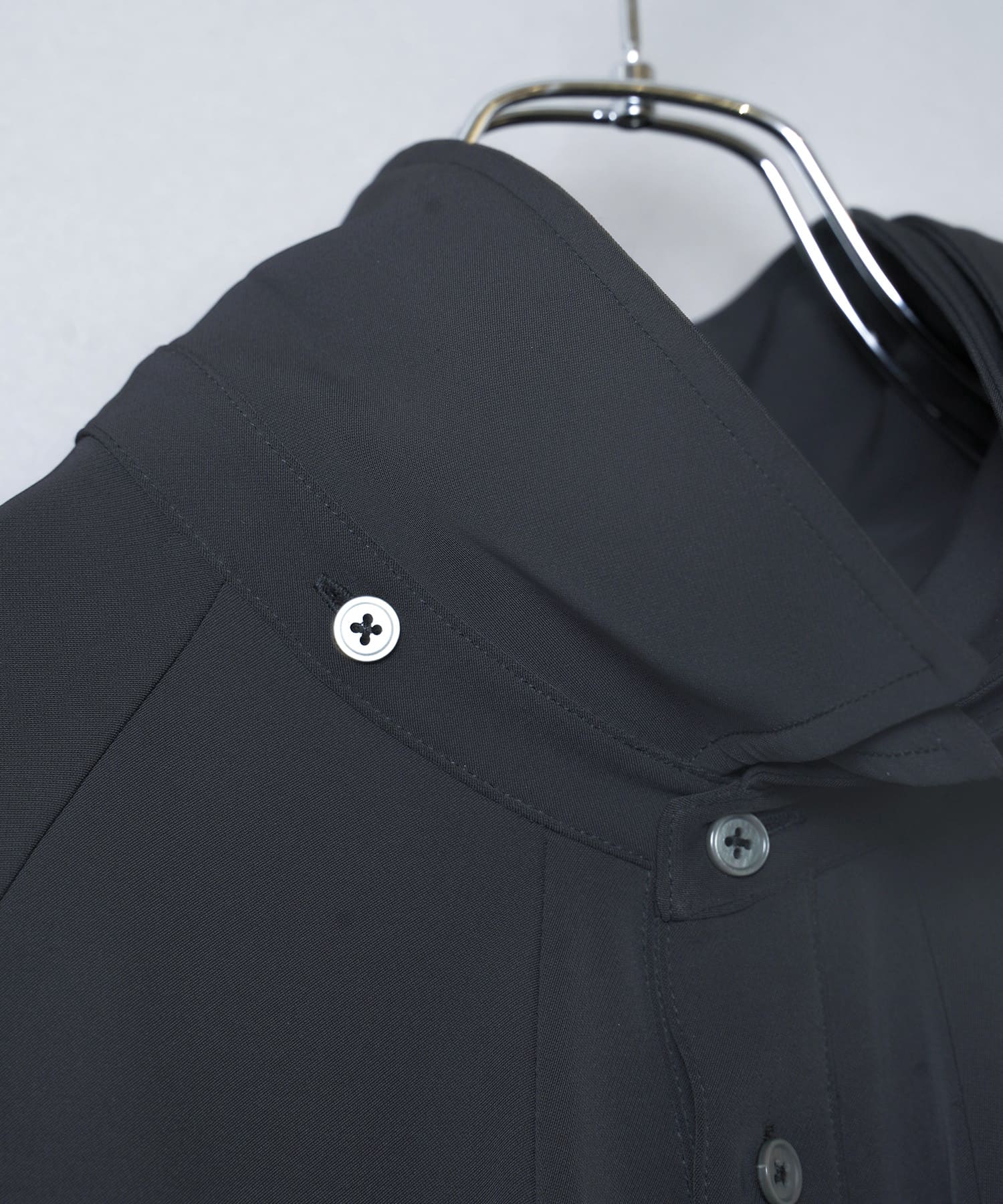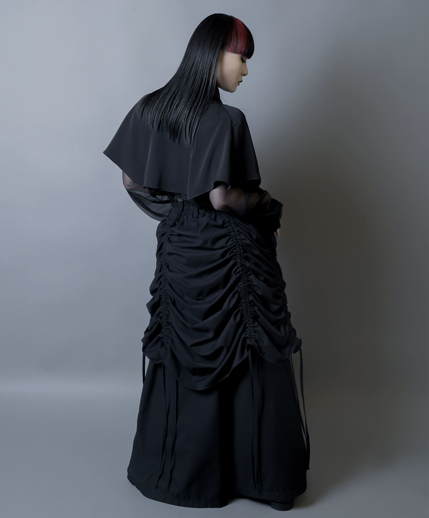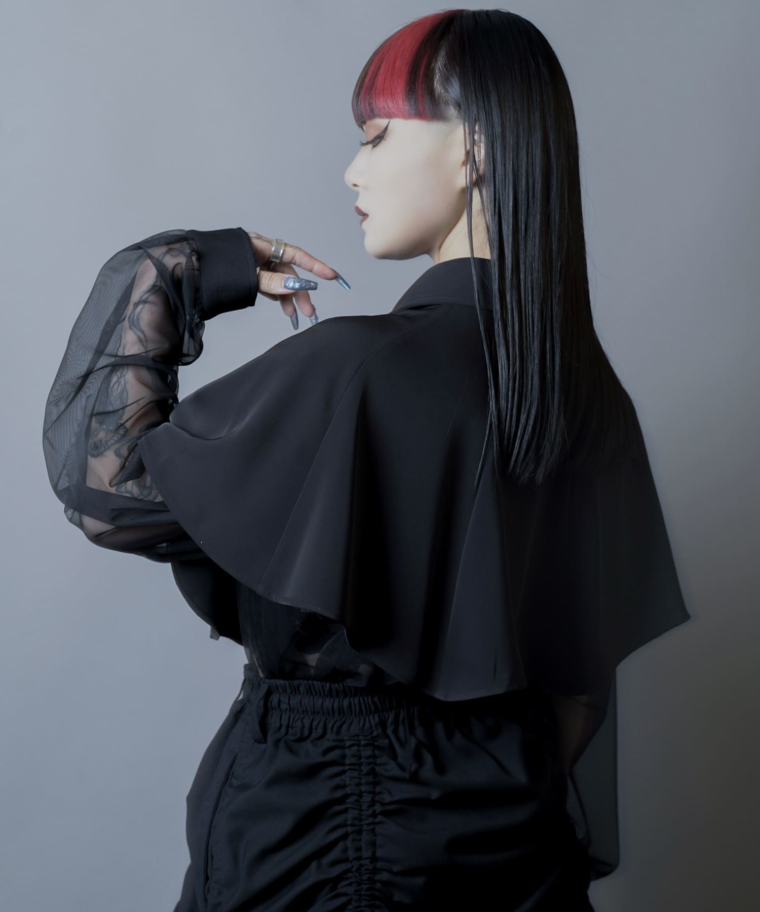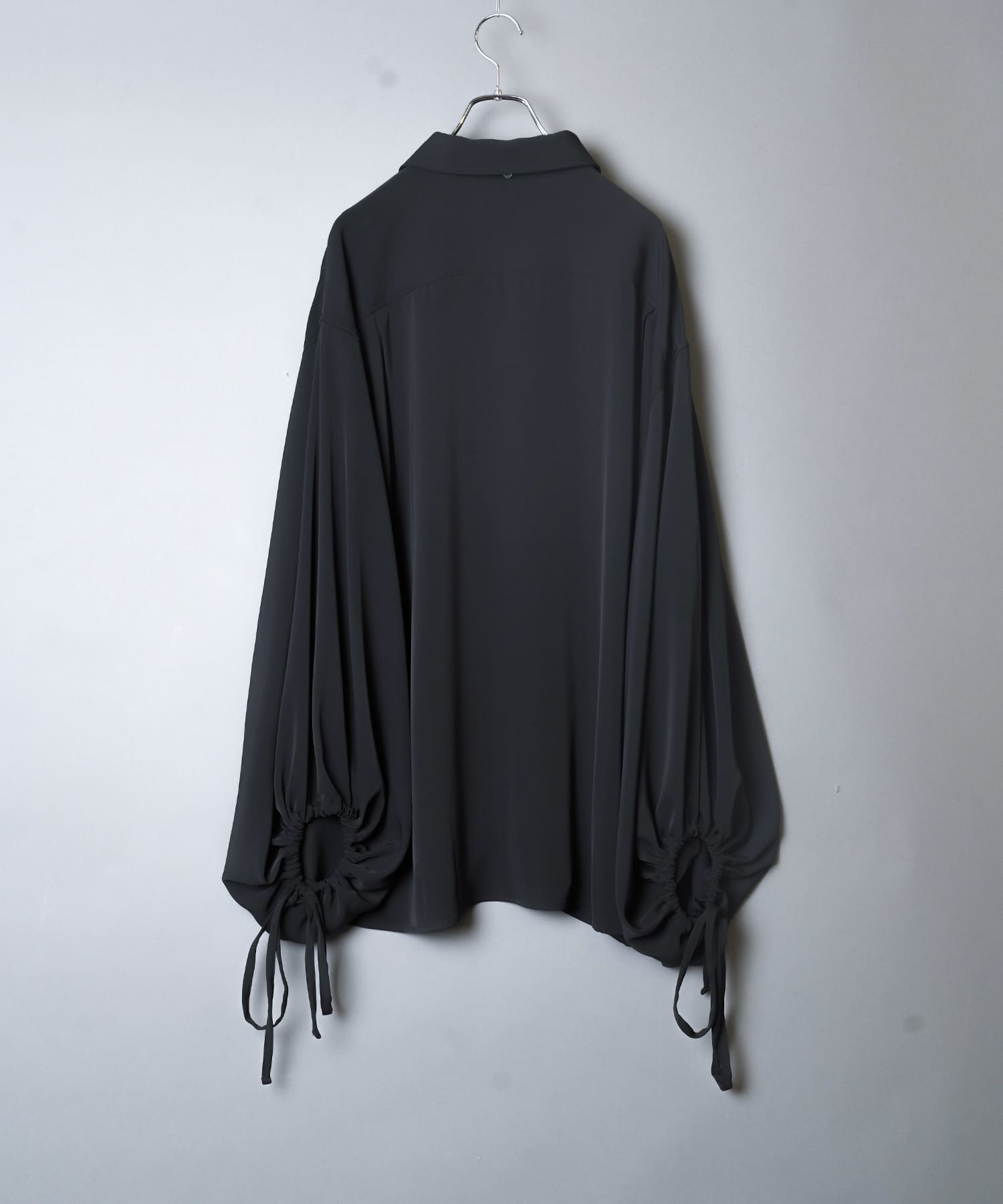 Umbrella cape kimono shirt made of NOT's original satin fabric. It is made of a thick satin fabric that is pleasant to the touch and has a sheen and drape. This season, it has been updated with a detachable cape, transforming it into a kimono shirt unlike any other. The cape is designed to resemble an umbrella, and while it is made of a symbiotic fabric with the body, it has a different appearance depending on the angle. This is a unisex item. The cuffs can be transformed by threading a string through the cuffs, and this piece allows you to enjoy both the straight lines of a kimono and the round baroon silhouette.