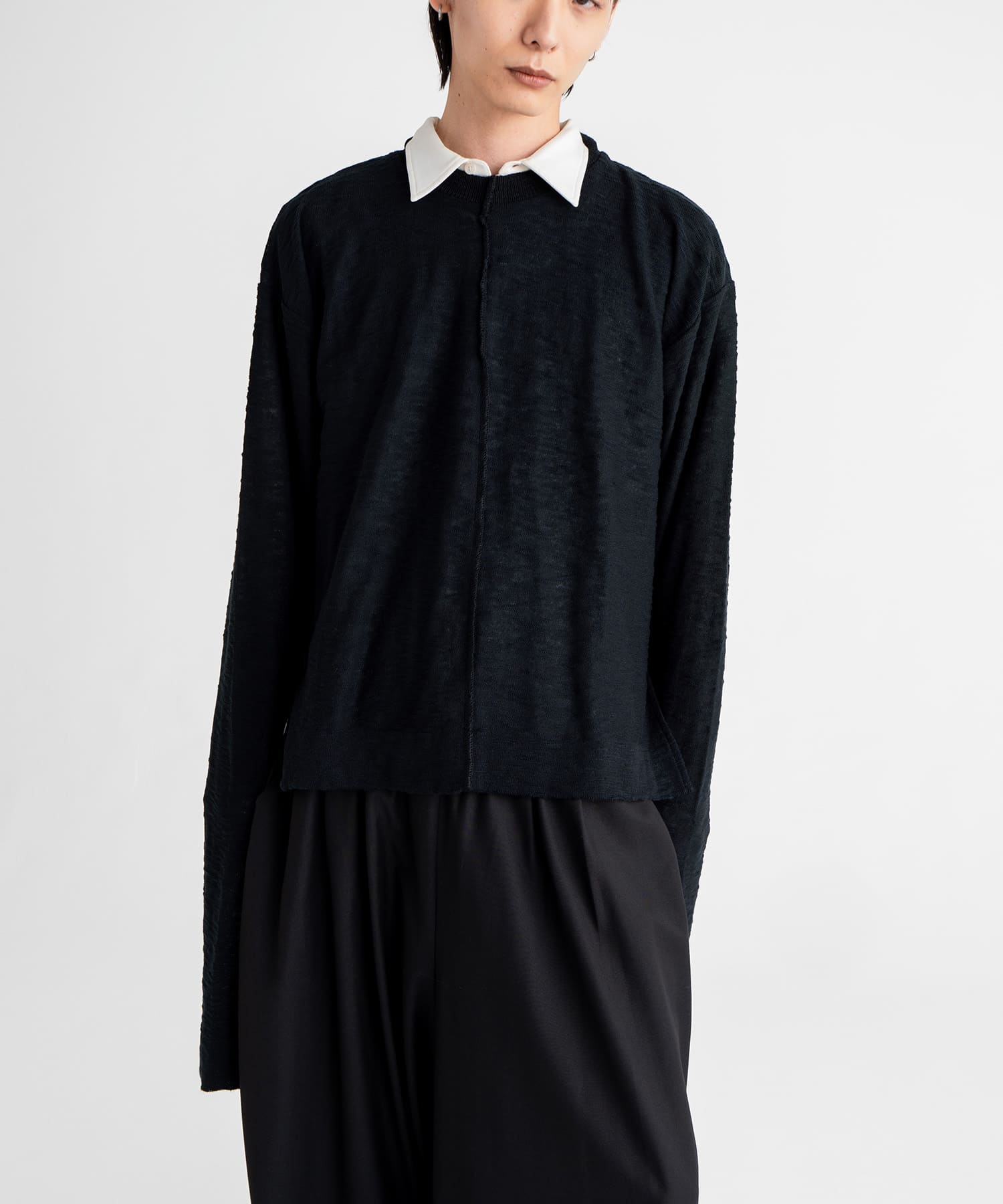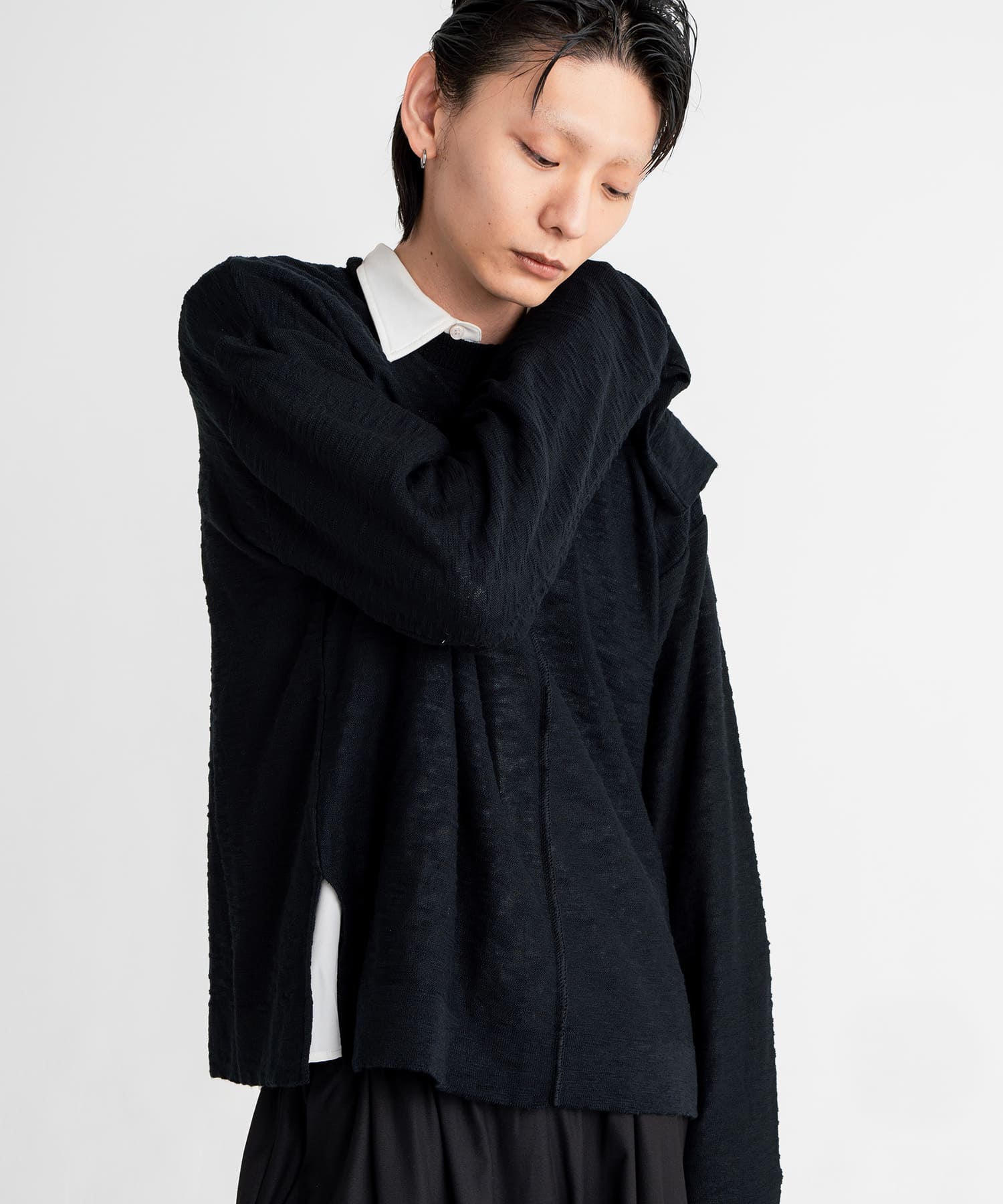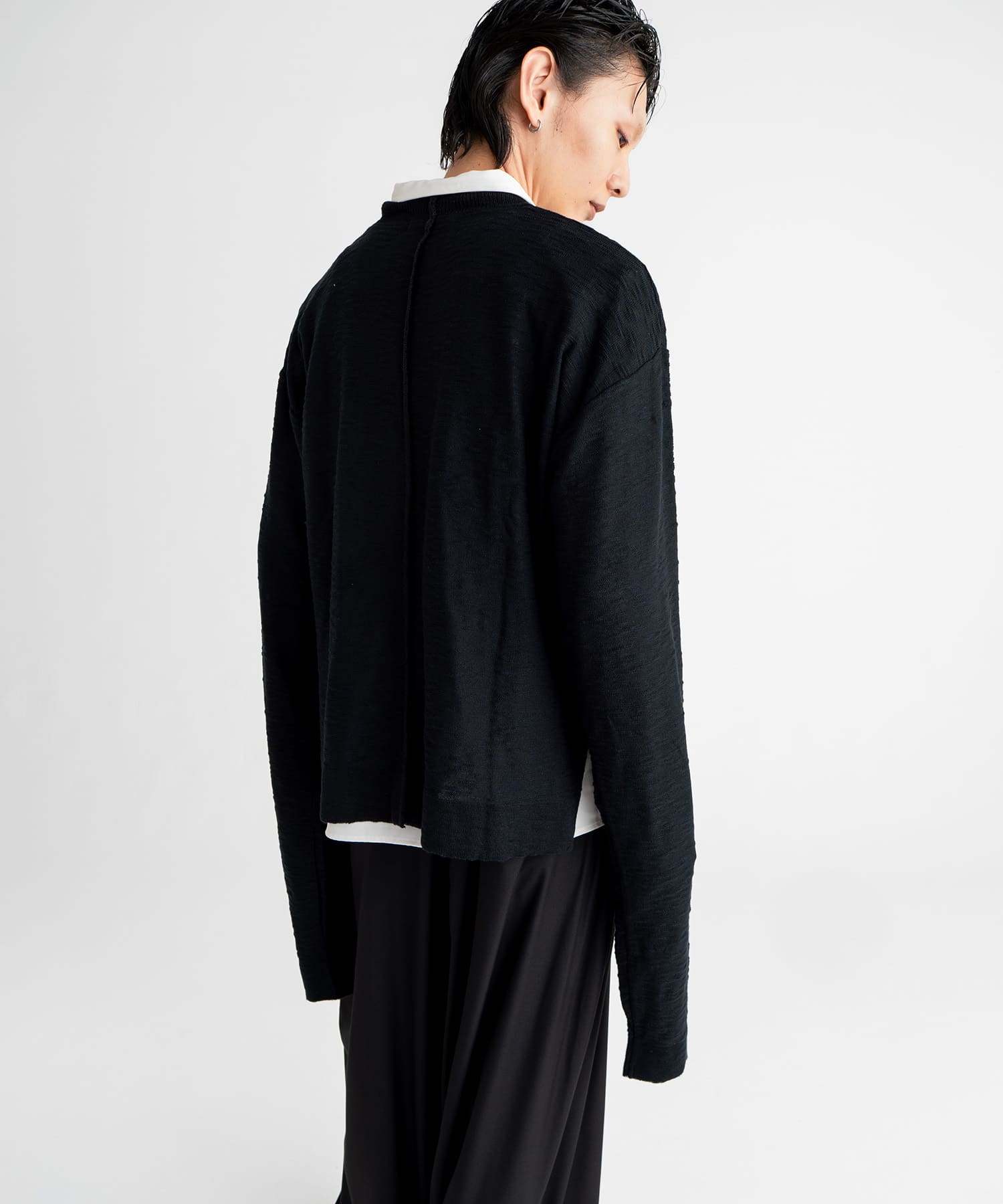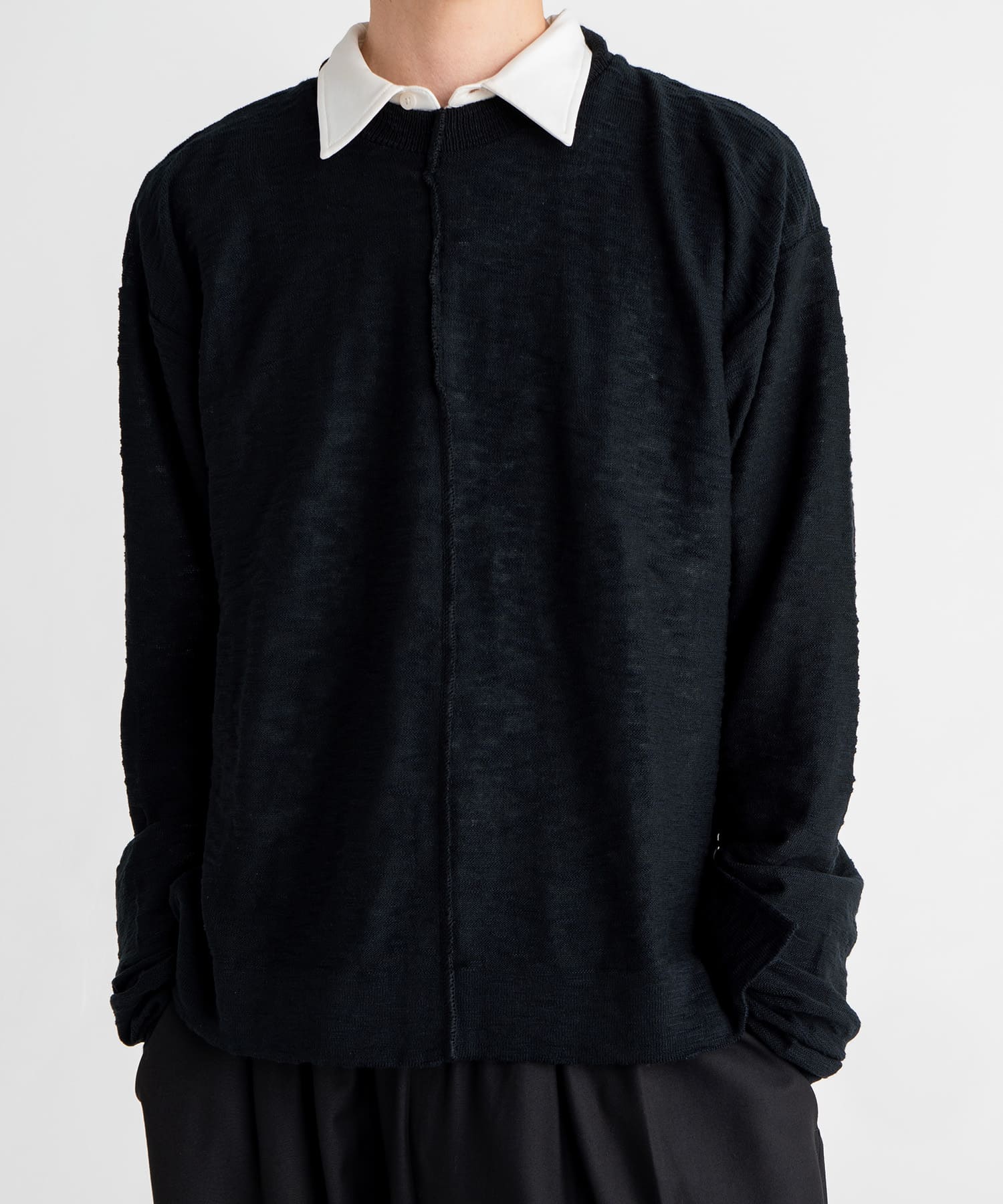 スラブ糸特有の糸の太さのムラを活かし凹凸のある独特な表情のあるニットとなっております。柔らかくストレッチ性のある素材で、ストレスフリーな着用感に仕上げました。袖丈を長くとっており、手元に生地を溜めて着用していただくとこなれた印象に仕上がります。
