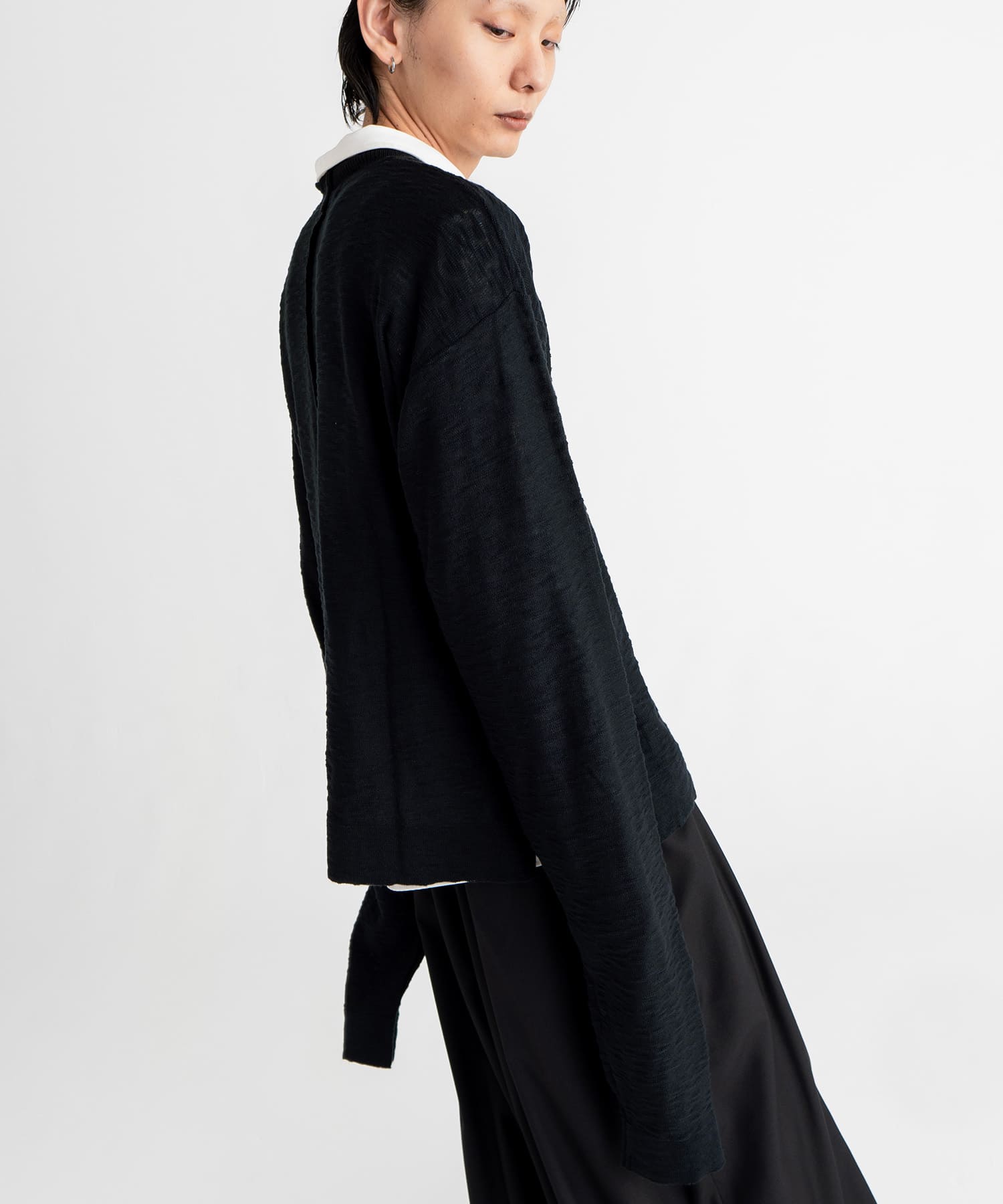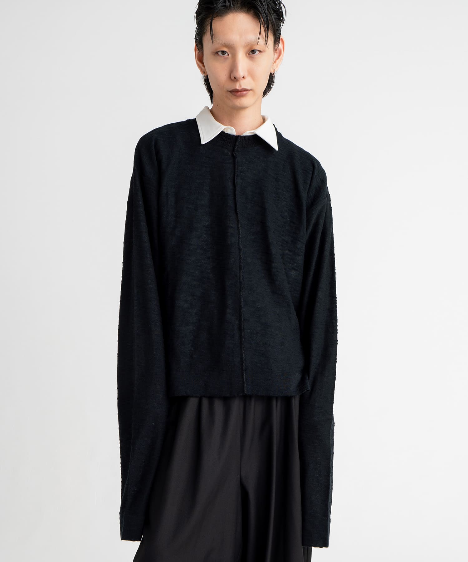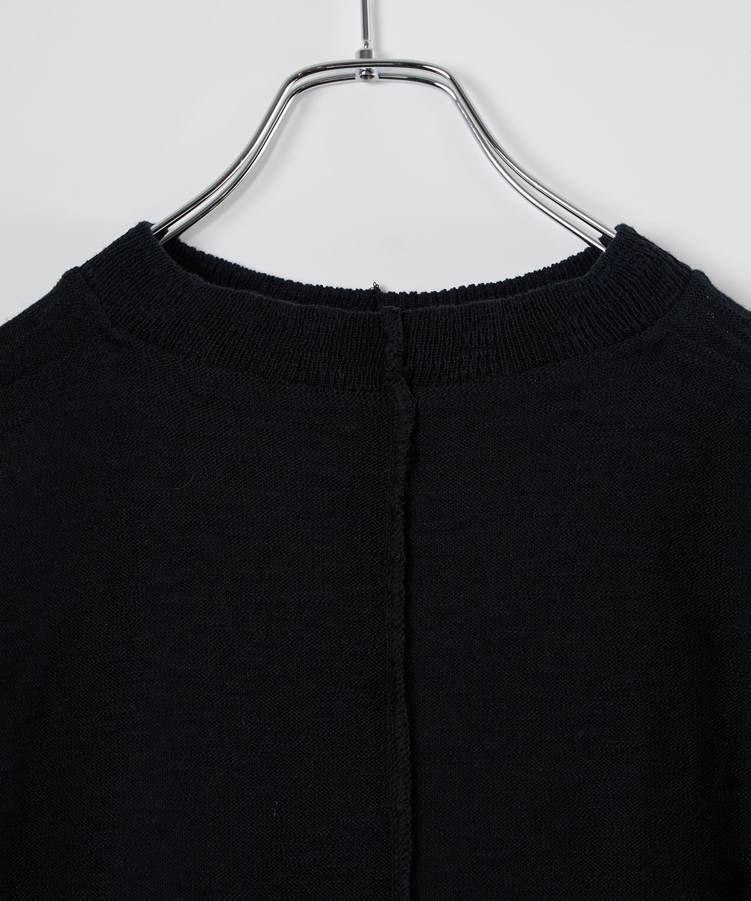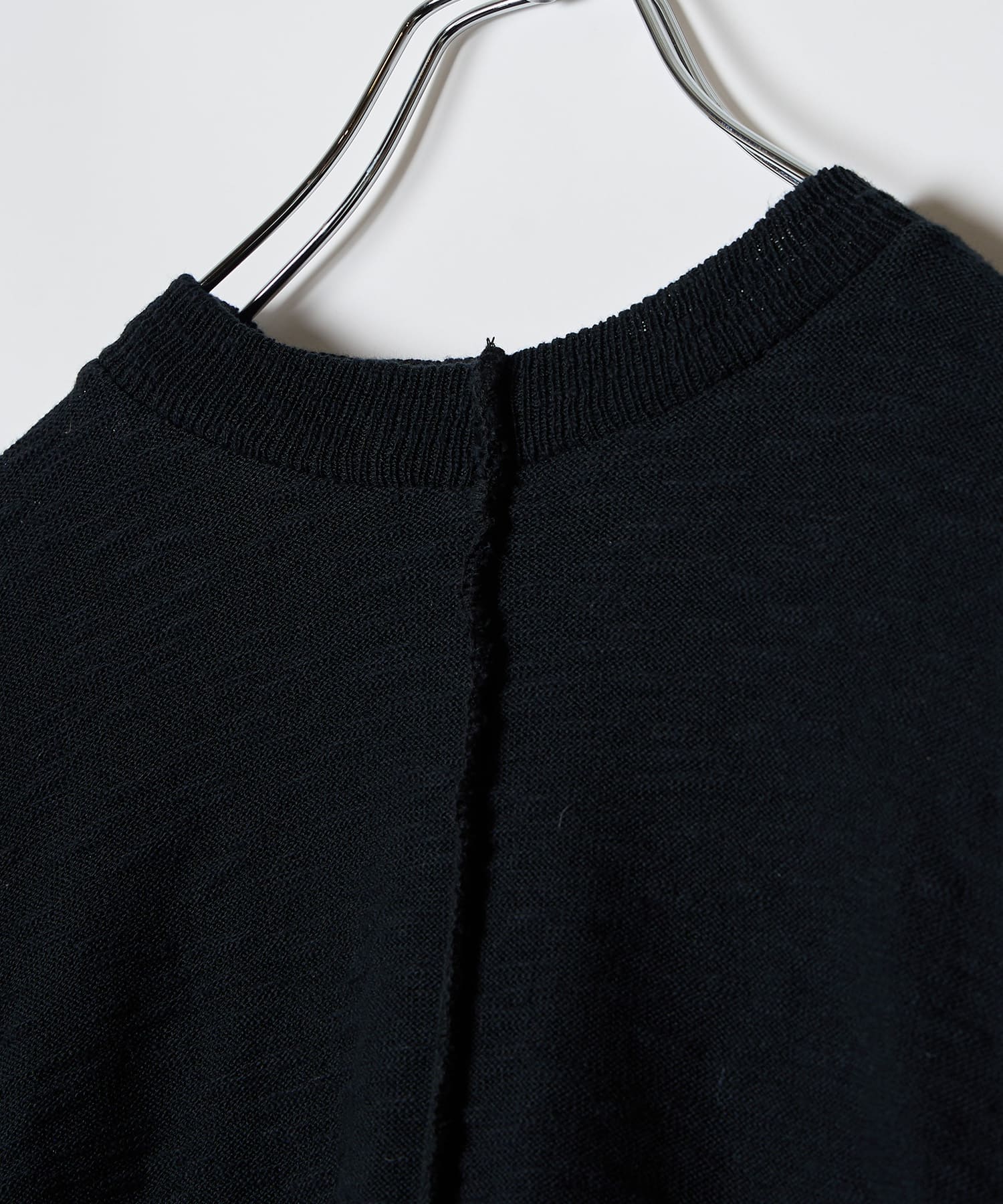 スラブ糸特有の糸の太さのムラを活かし凹凸のある独特な表情のあるニットとなっております。柔らかくストレッチ性のある素材で、ストレスフリーな着用感に仕上げました。袖丈を長くとっており、手元に生地を溜めて着用していただくとこなれた印象に仕上がります。