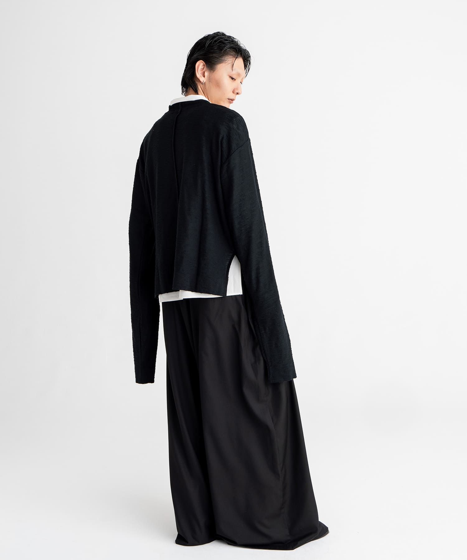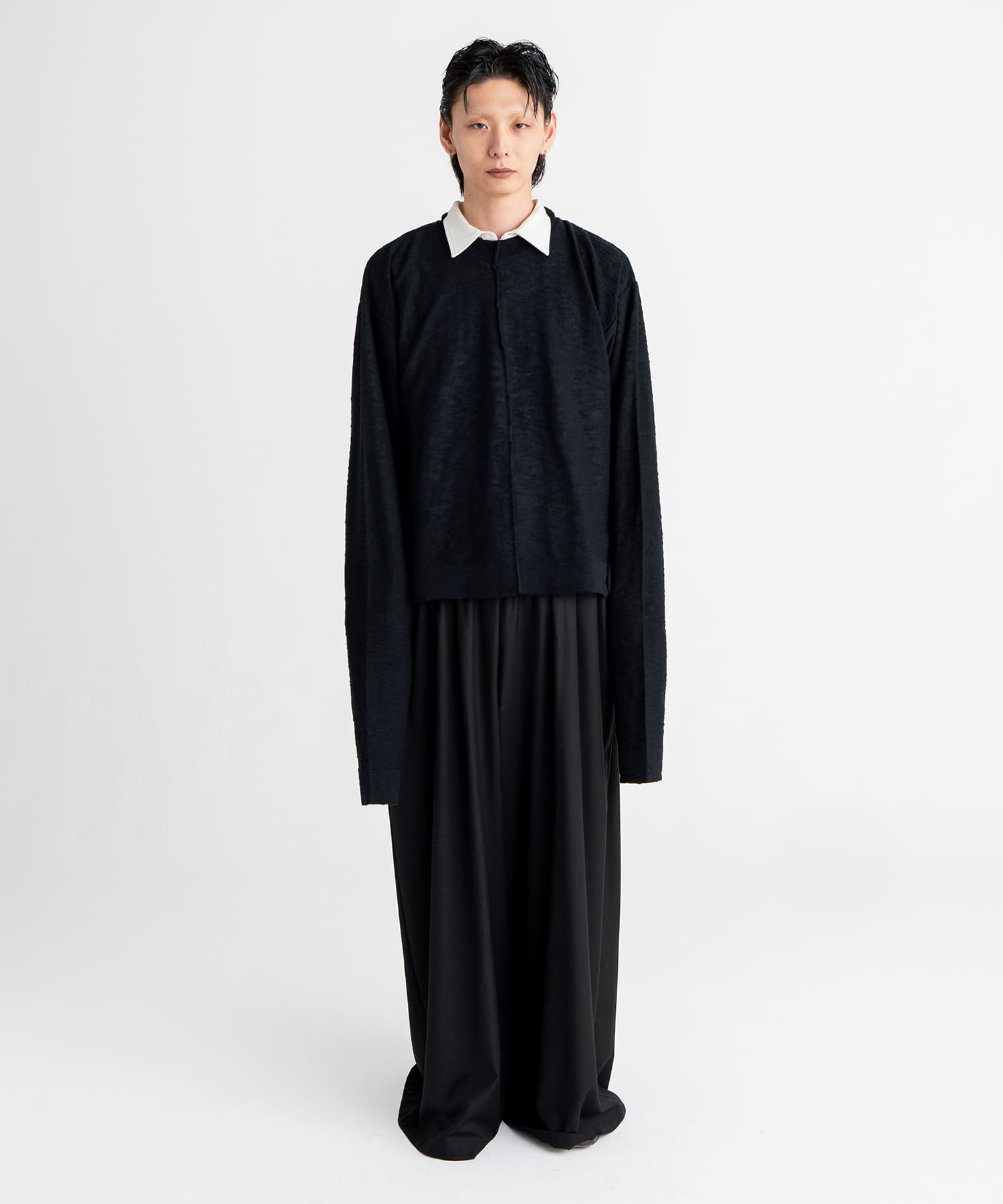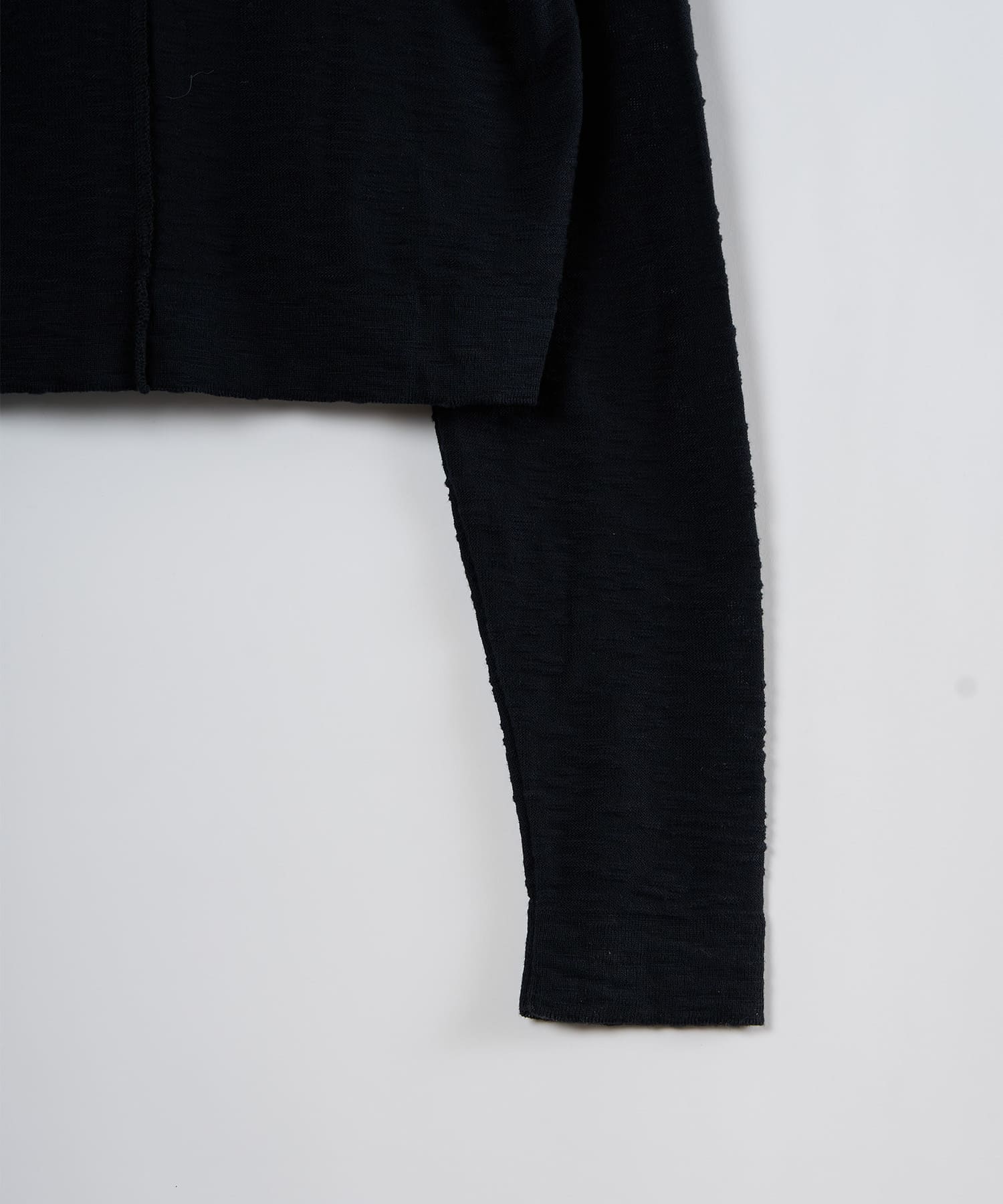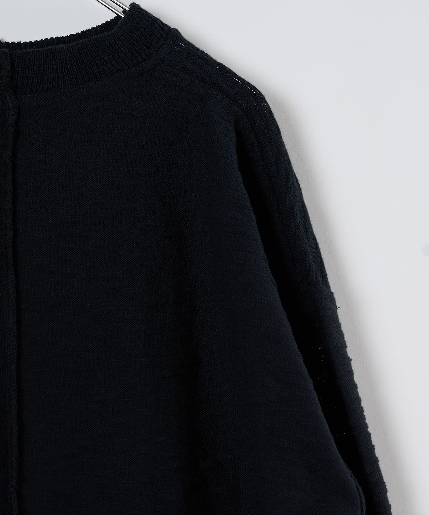 スラブ糸特有の糸の太さのムラを活かし凹凸のある独特な表情のあるニットとなっております。柔らかくストレッチ性のある素材で、ストレスフリーな着用感に仕上げました。袖丈を長くとっており、手元に生地を溜めて着用していただくとこなれた印象に仕上がります。