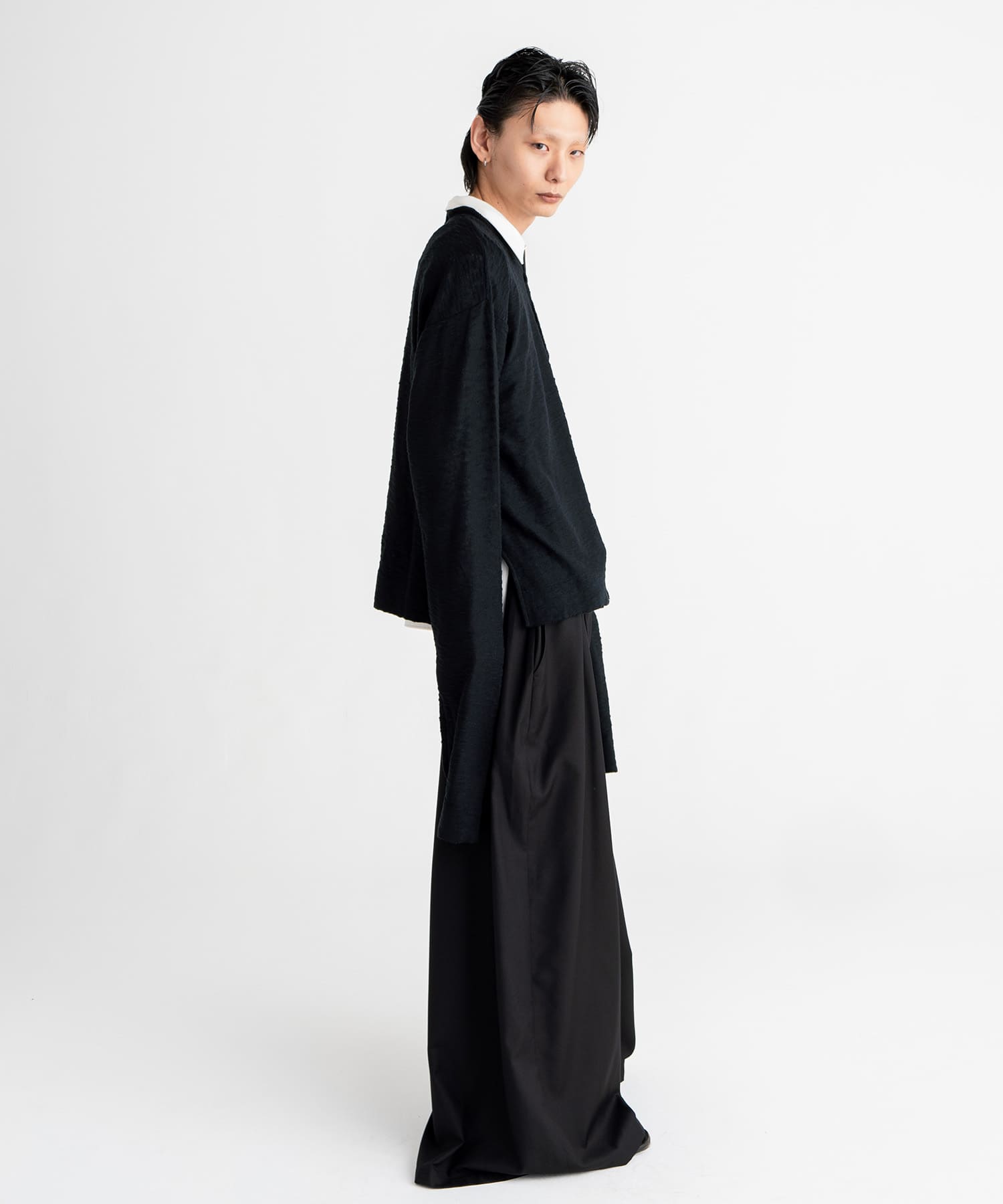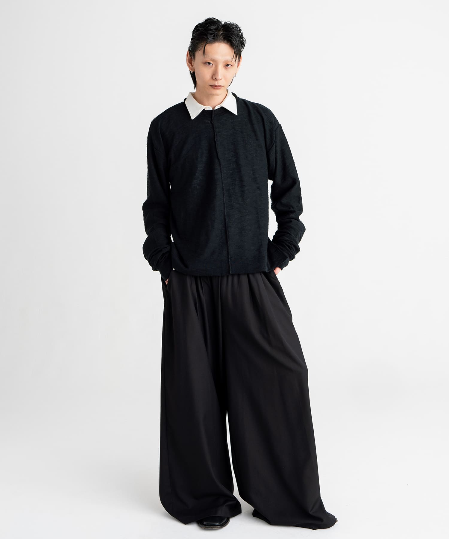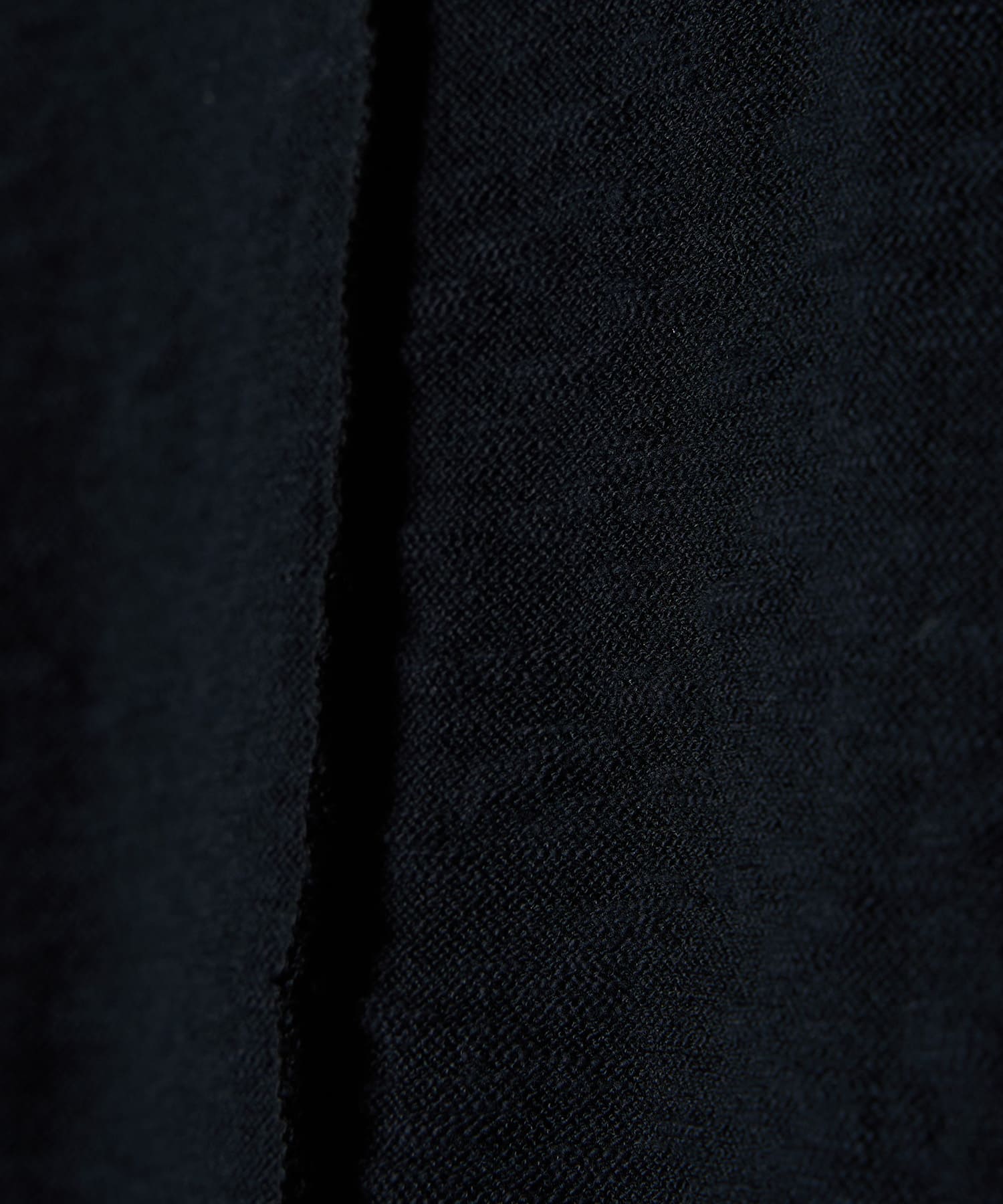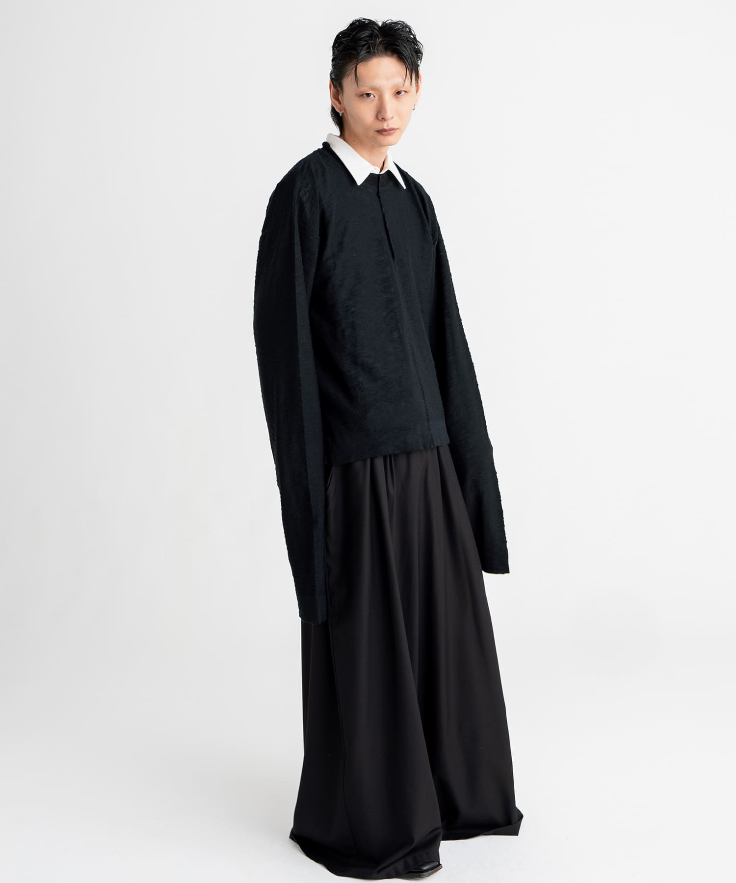 スラブ糸特有の糸の太さのムラを活かし凹凸のある独特な表情のあるニットとなっております。柔らかくストレッチ性のある素材で、ストレスフリーな着用感に仕上げました。袖丈を長くとっており、手元に生地を溜めて着用していただくとこなれた印象に仕上がります。