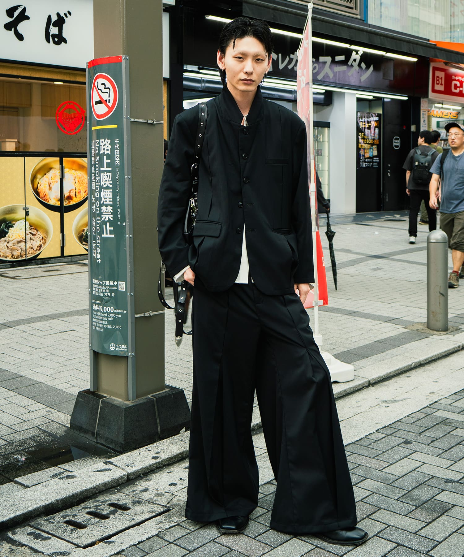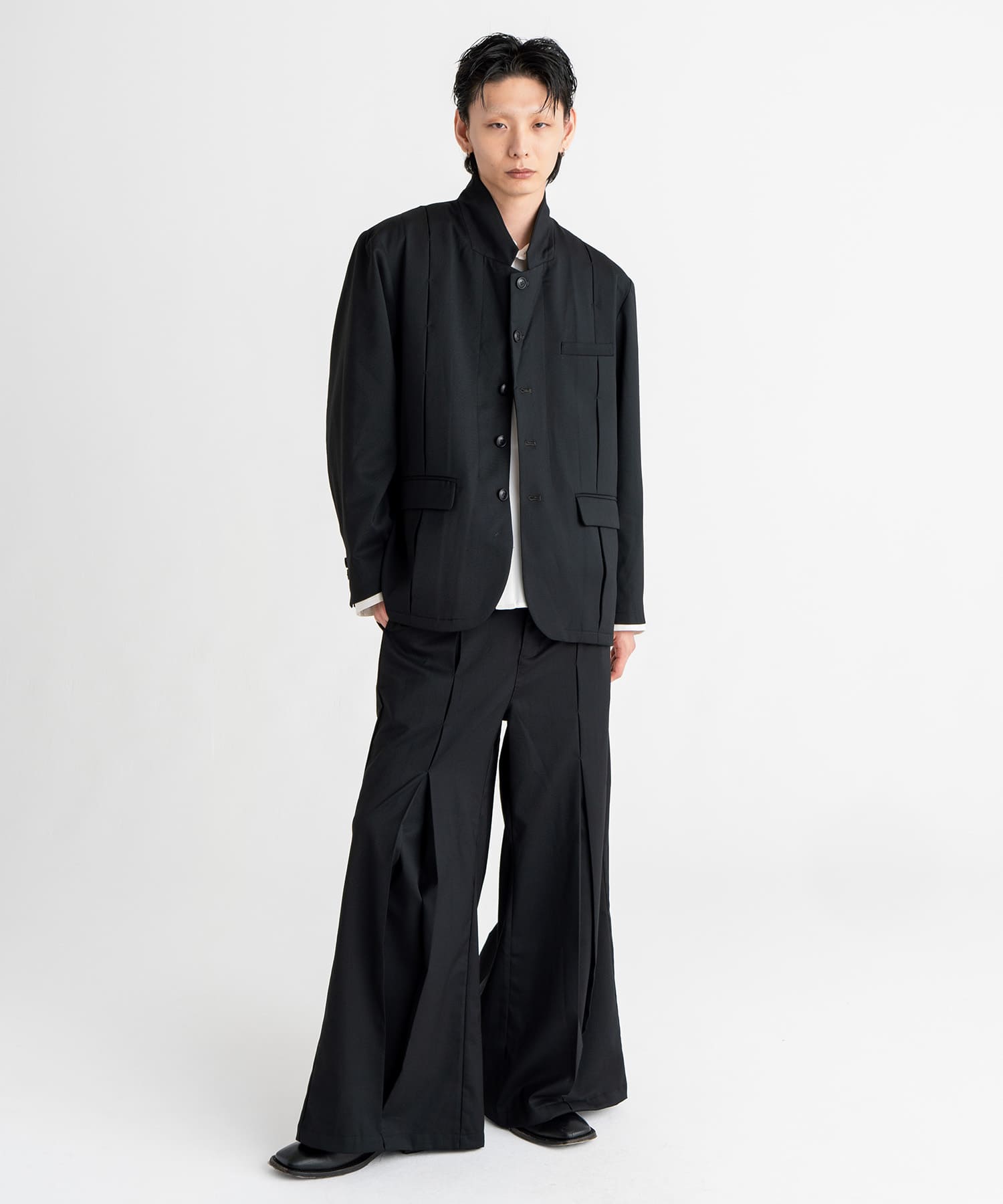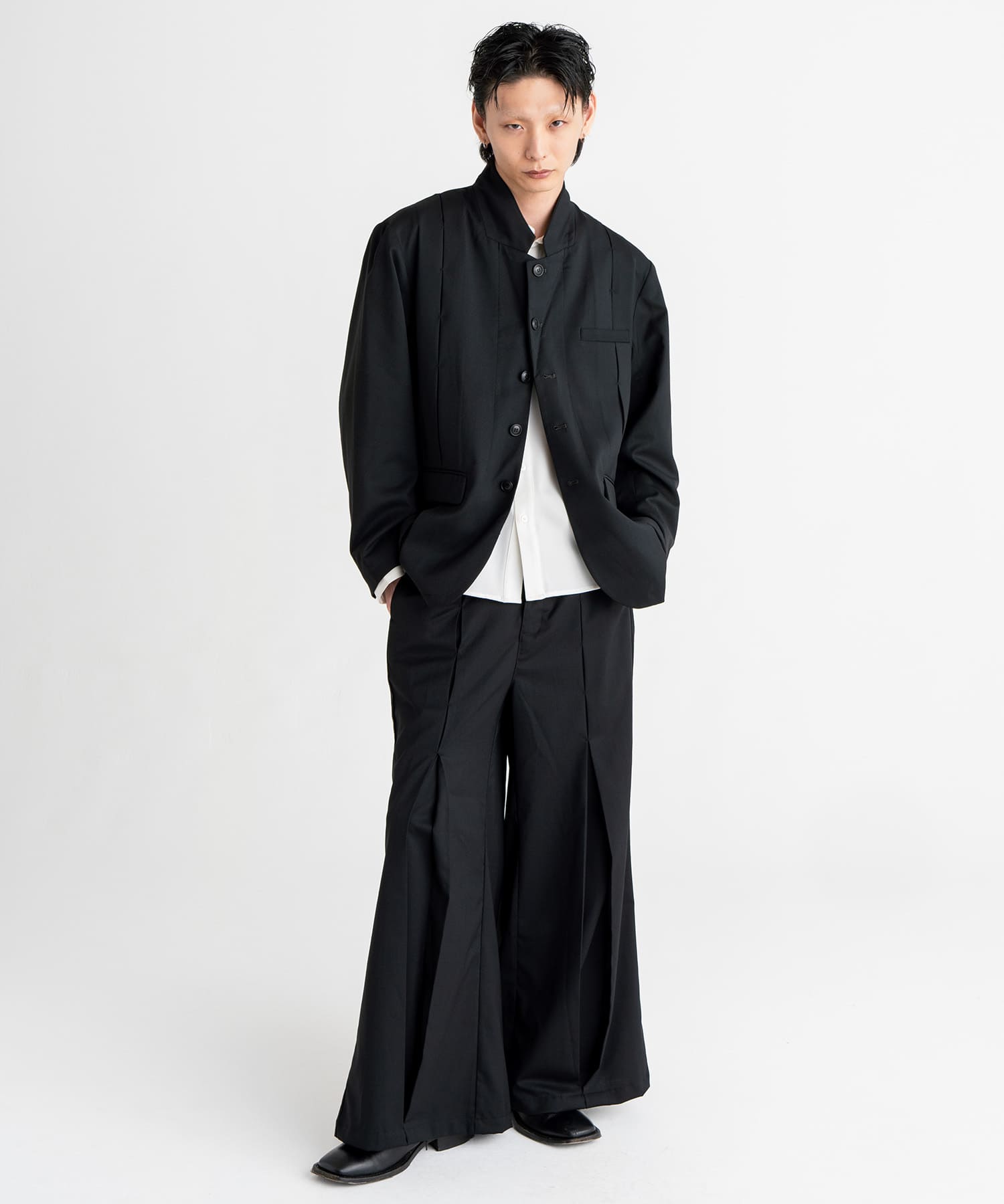 フロントとバックの中心に大きく入れたタックを閂止めで留め、着用者の動きに合わせてシルエットが変化する仕様となっております。