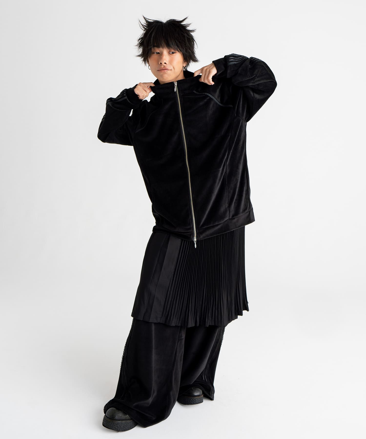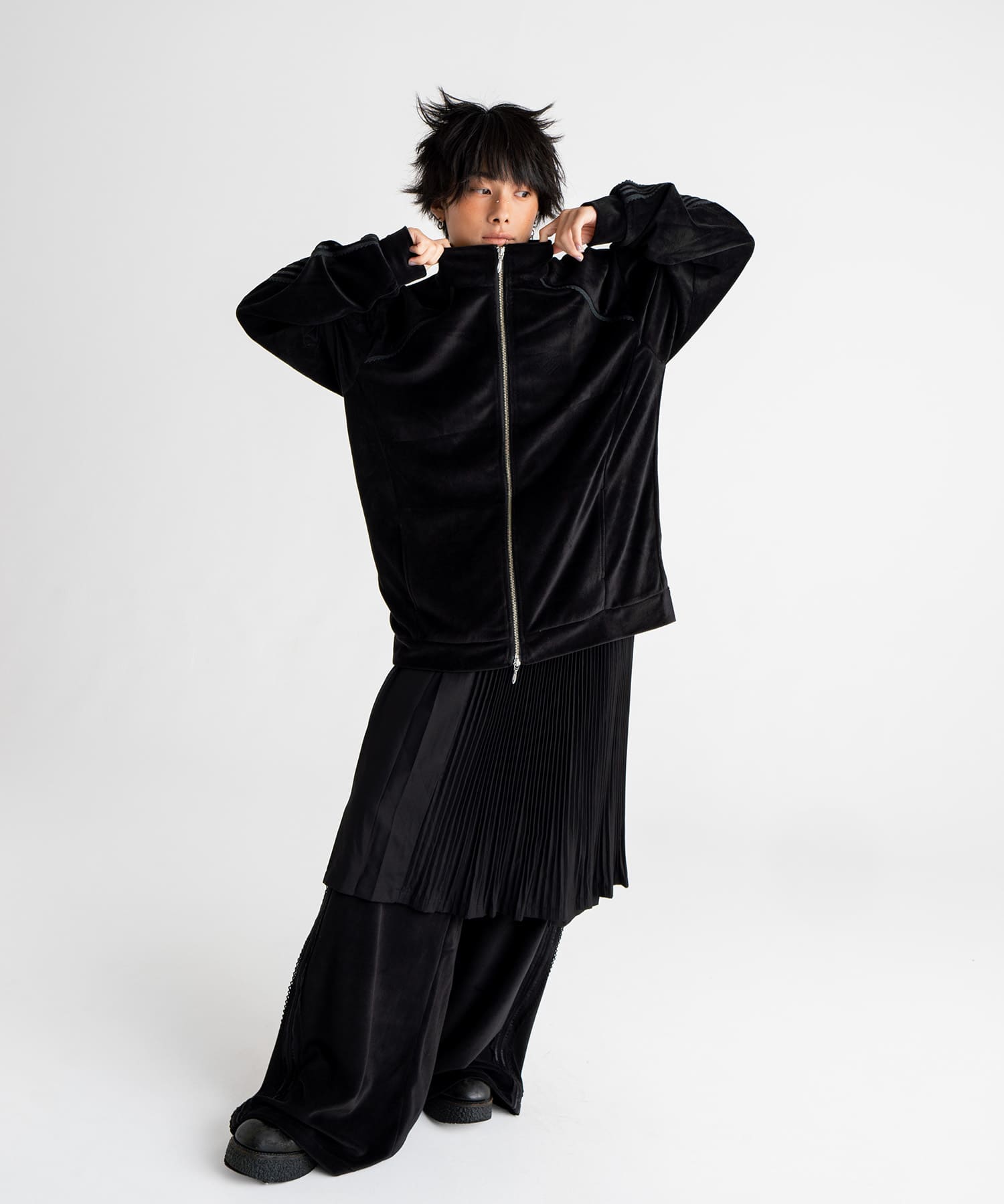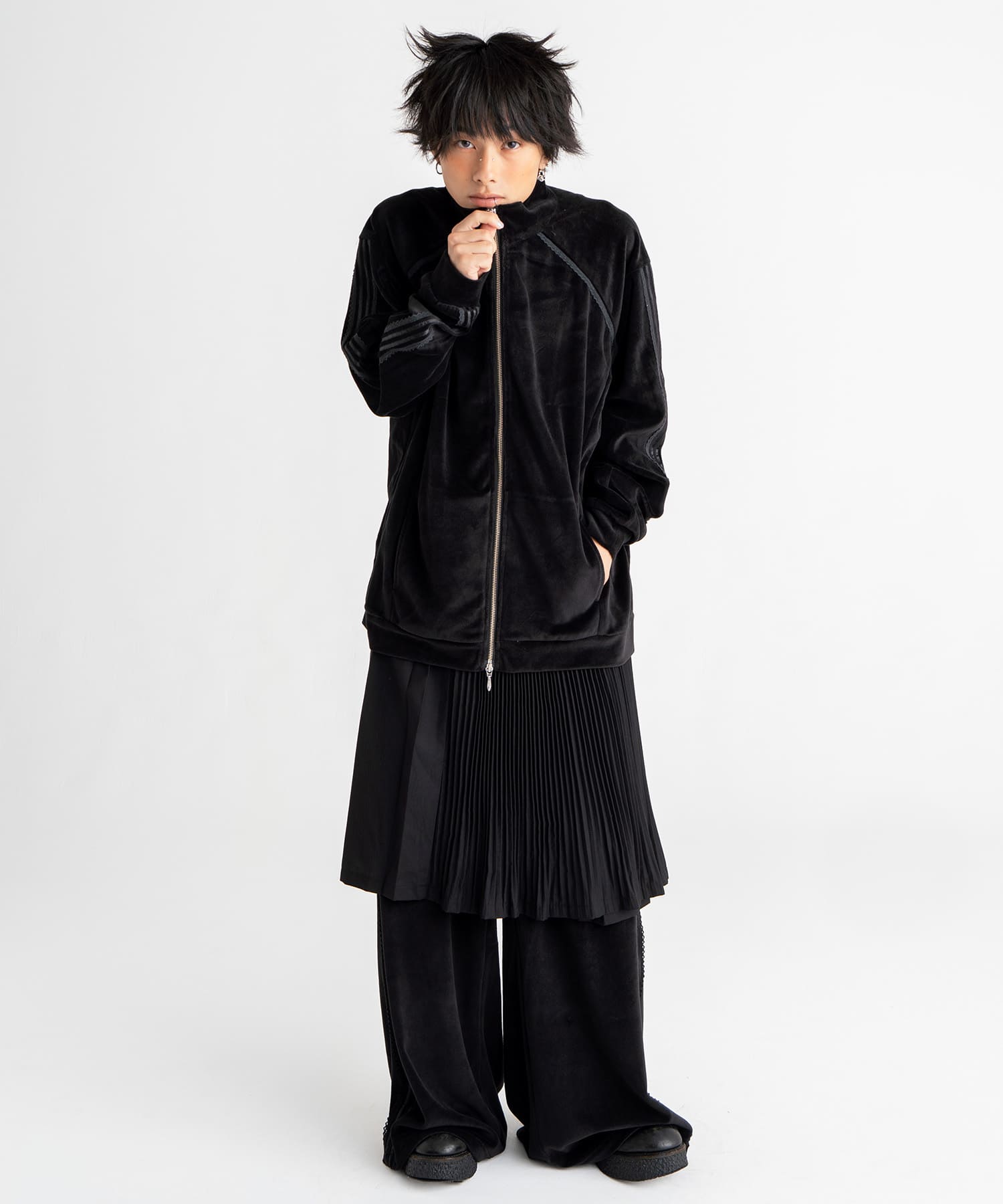 シーズンコンセプトのスクールテイストをなぞり、学生の体育のジャージをイメージして製作したこのアイテムはシックな印象のベロアをあえてスポーツスタイルに落とし込みモードに仕上げました。