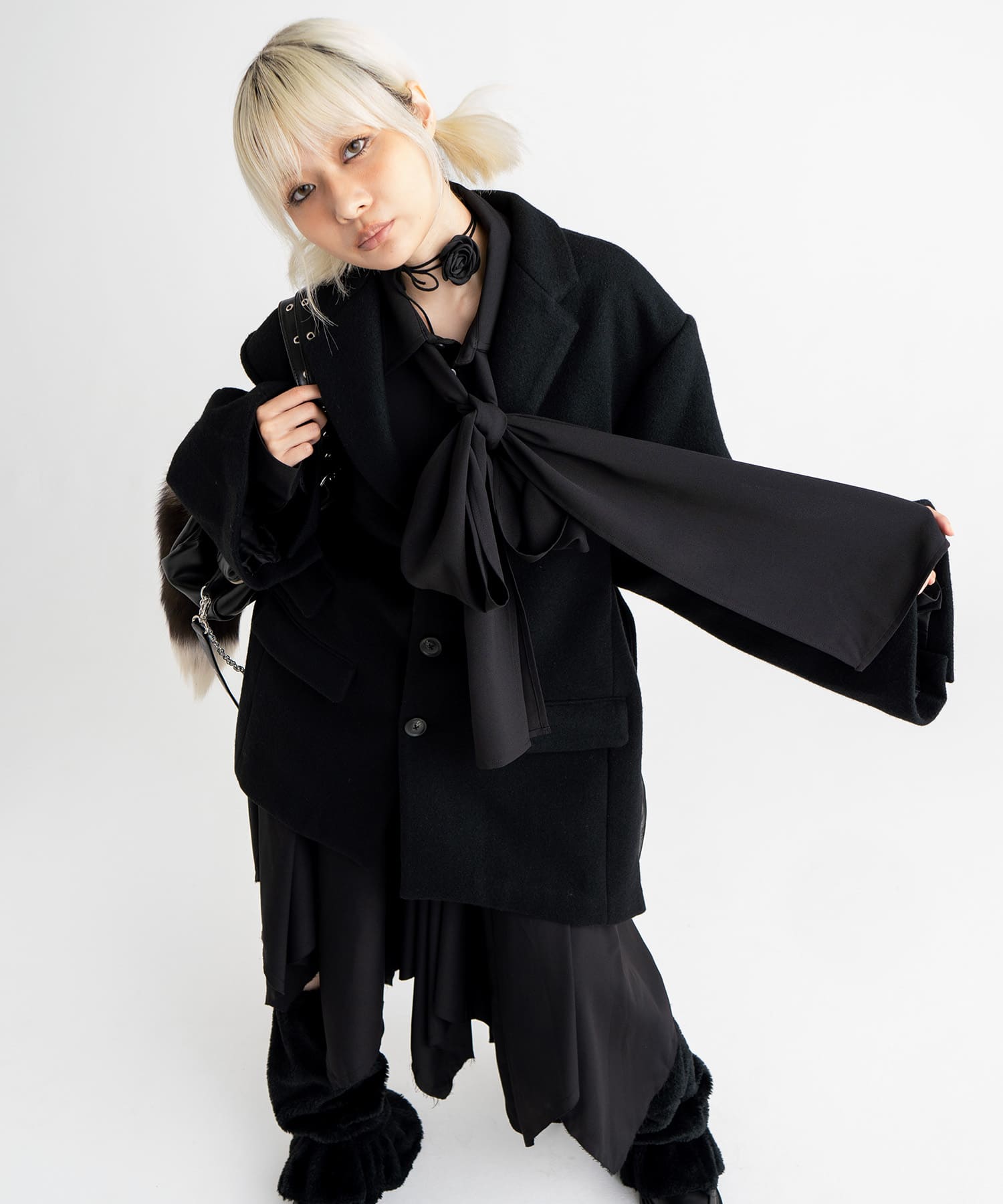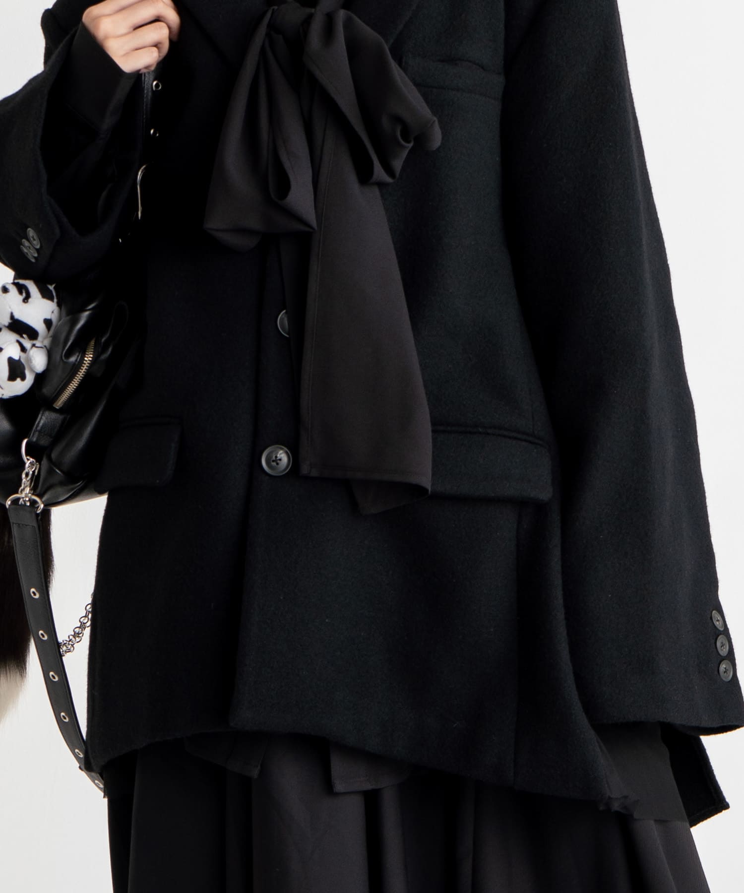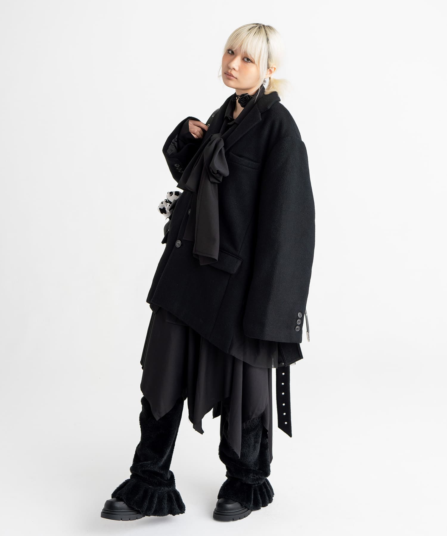 リサイクルウールとチュールの異素材を組み合わせたウール×シアー オーバージャケット。