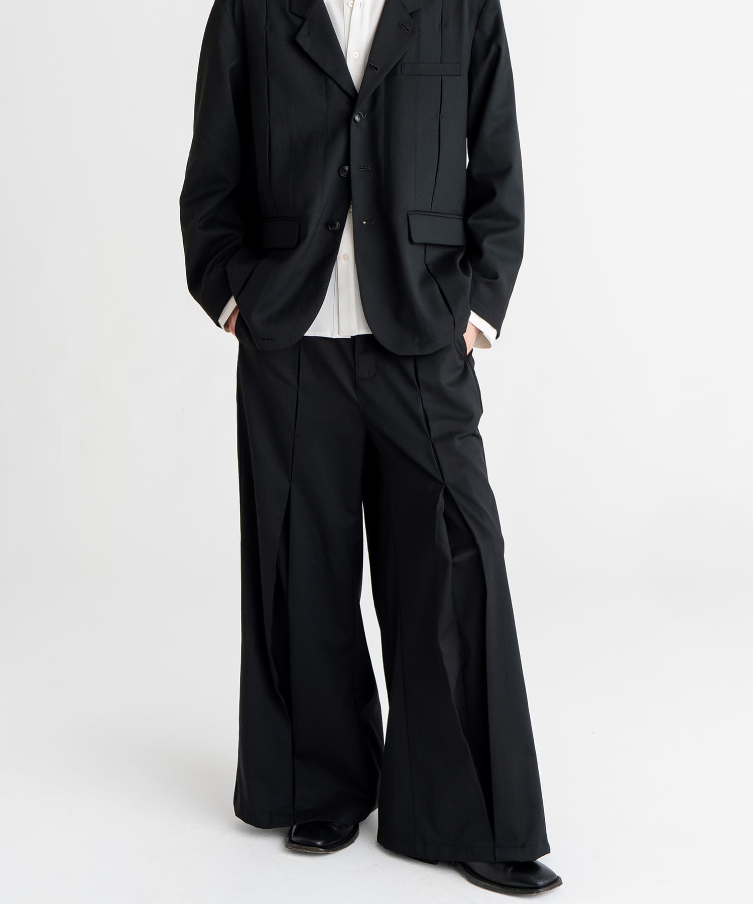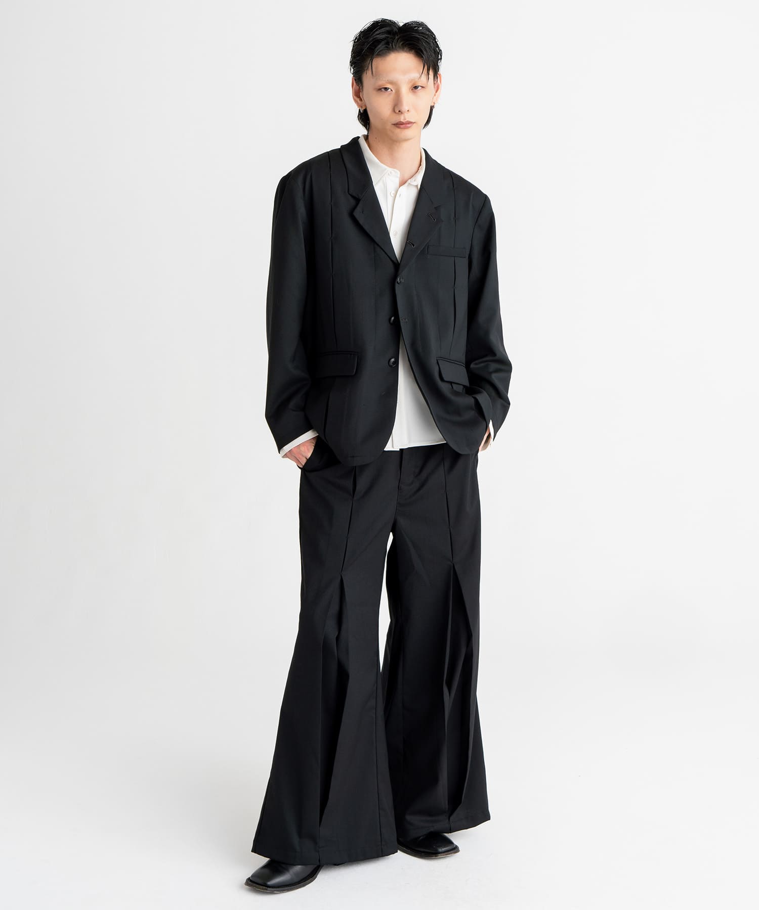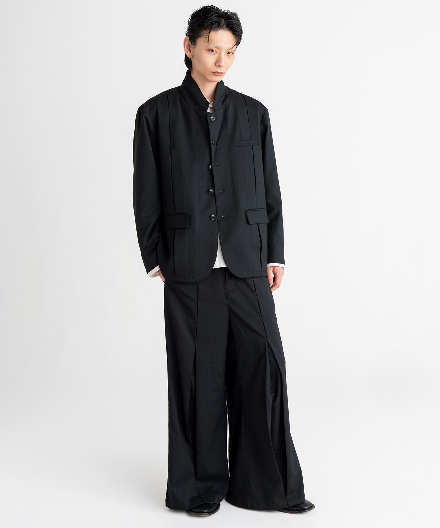 The large tucks in the center of the front and back are fastened with bartacking clasps, and the silhouette changes with the wearer's movements.